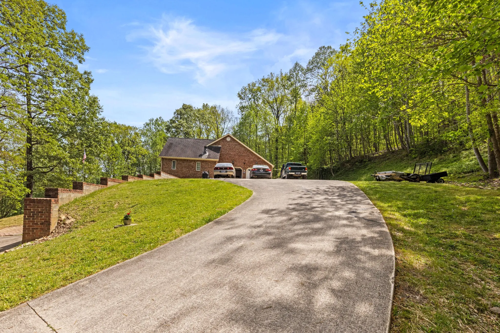 A scenic 6-degree elevation concrete driveway welcomes you home, leading to an oversized 2.5-car garage featuring a drain, water access, and its own half bath.