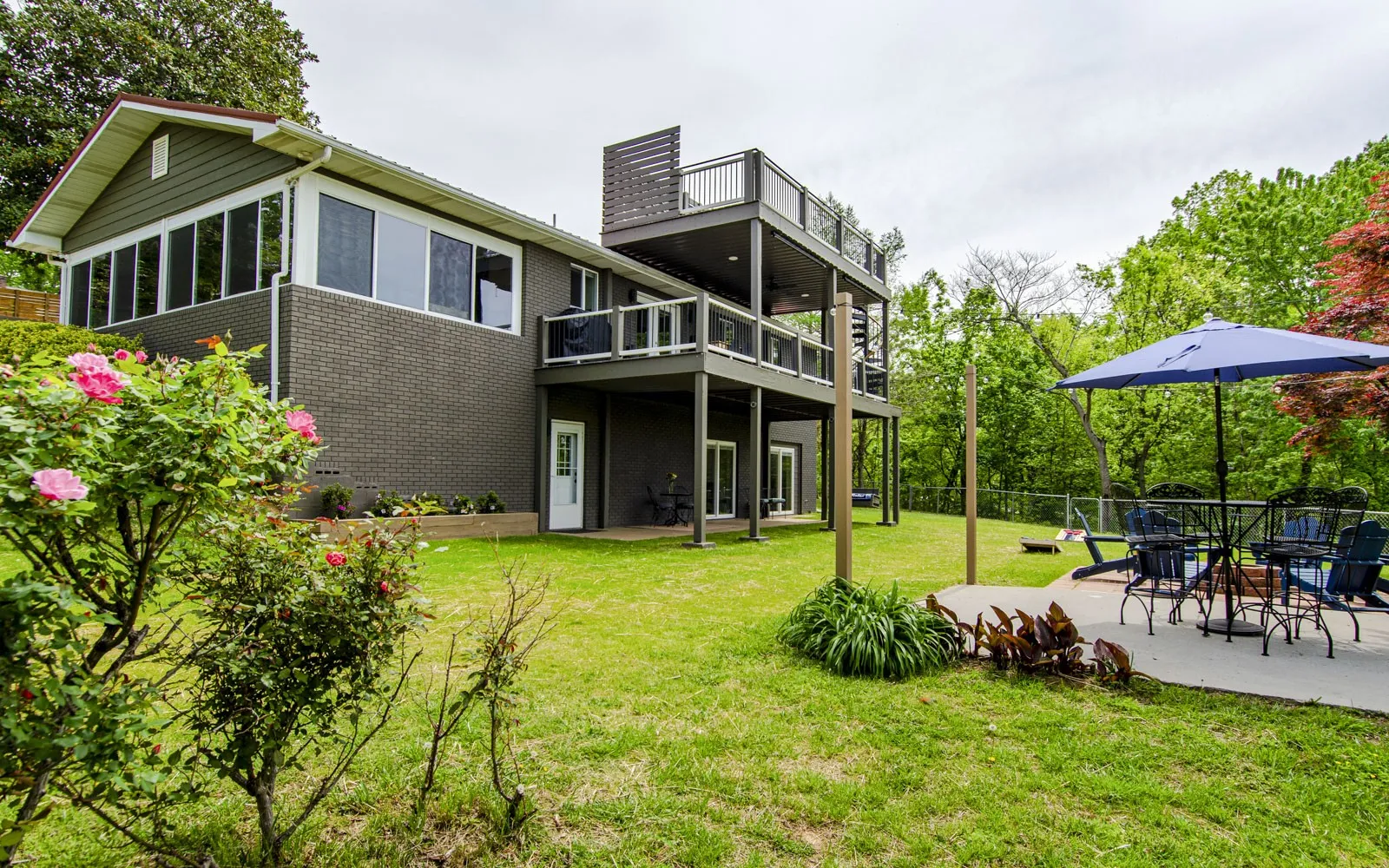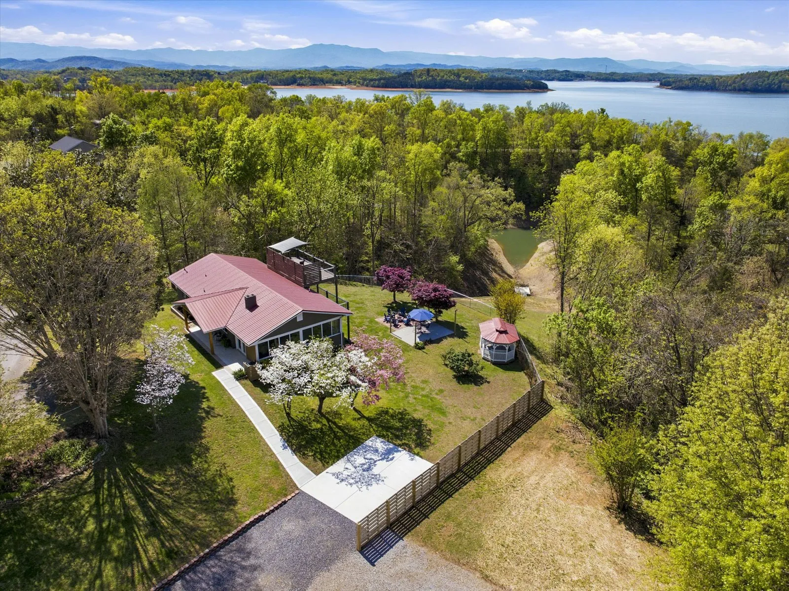 Spacious and inspiring lakefront home located at 1845 Bouldercrest Dr. in Dandridge, Tennessee, offering breathtaking views of Douglas Lake and Great Smoky Mountains from the new main level or rooftop decks.