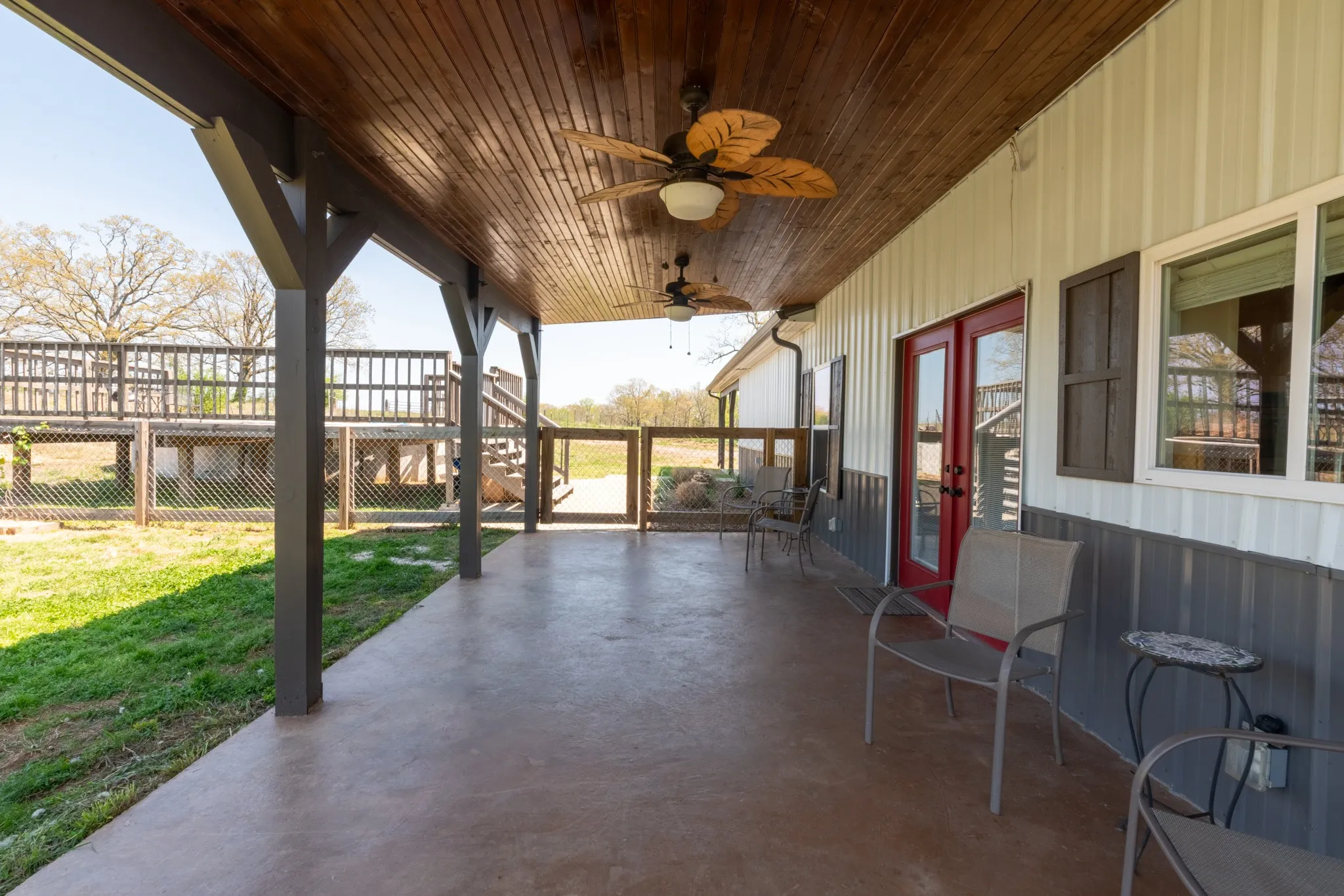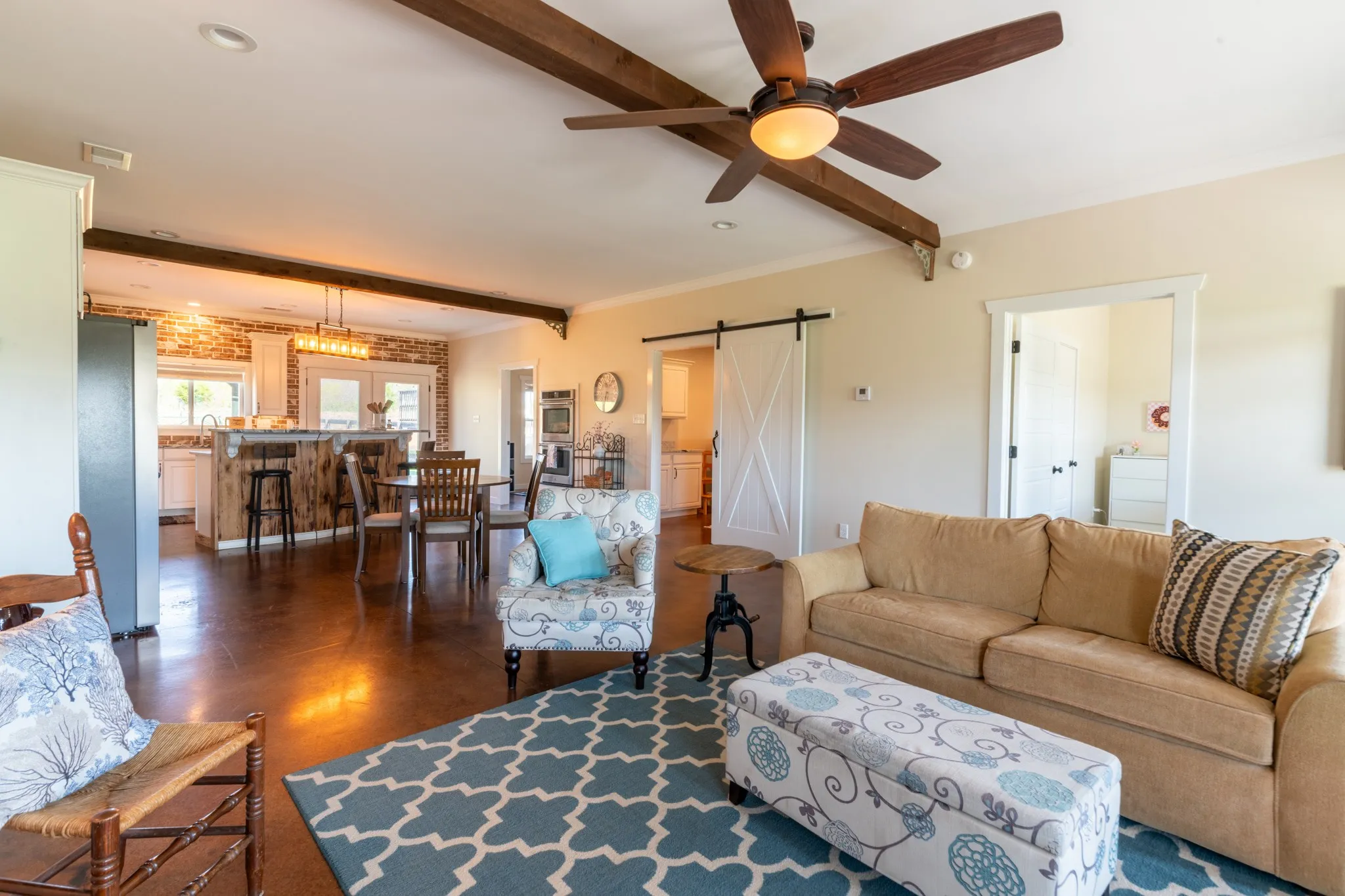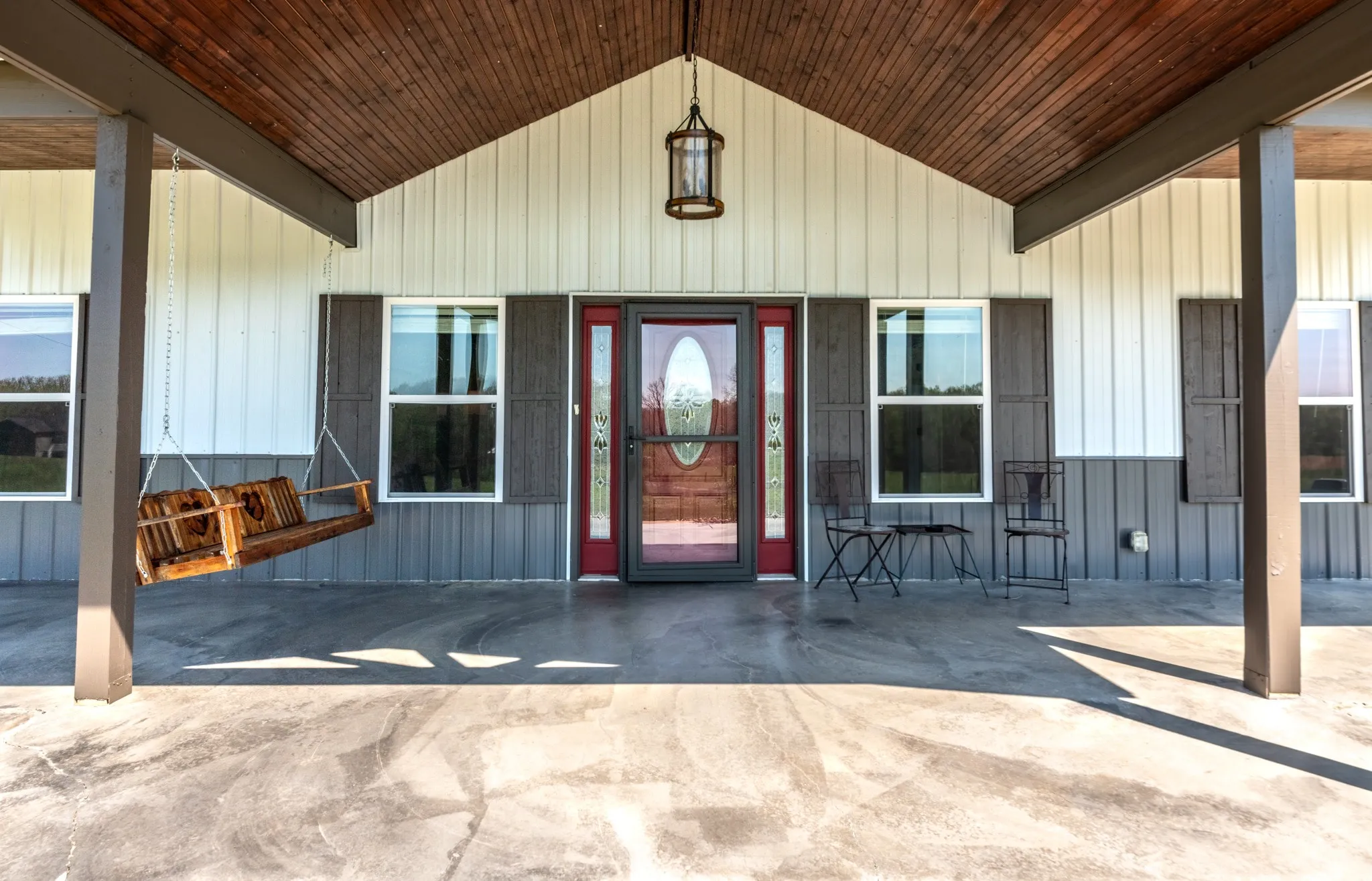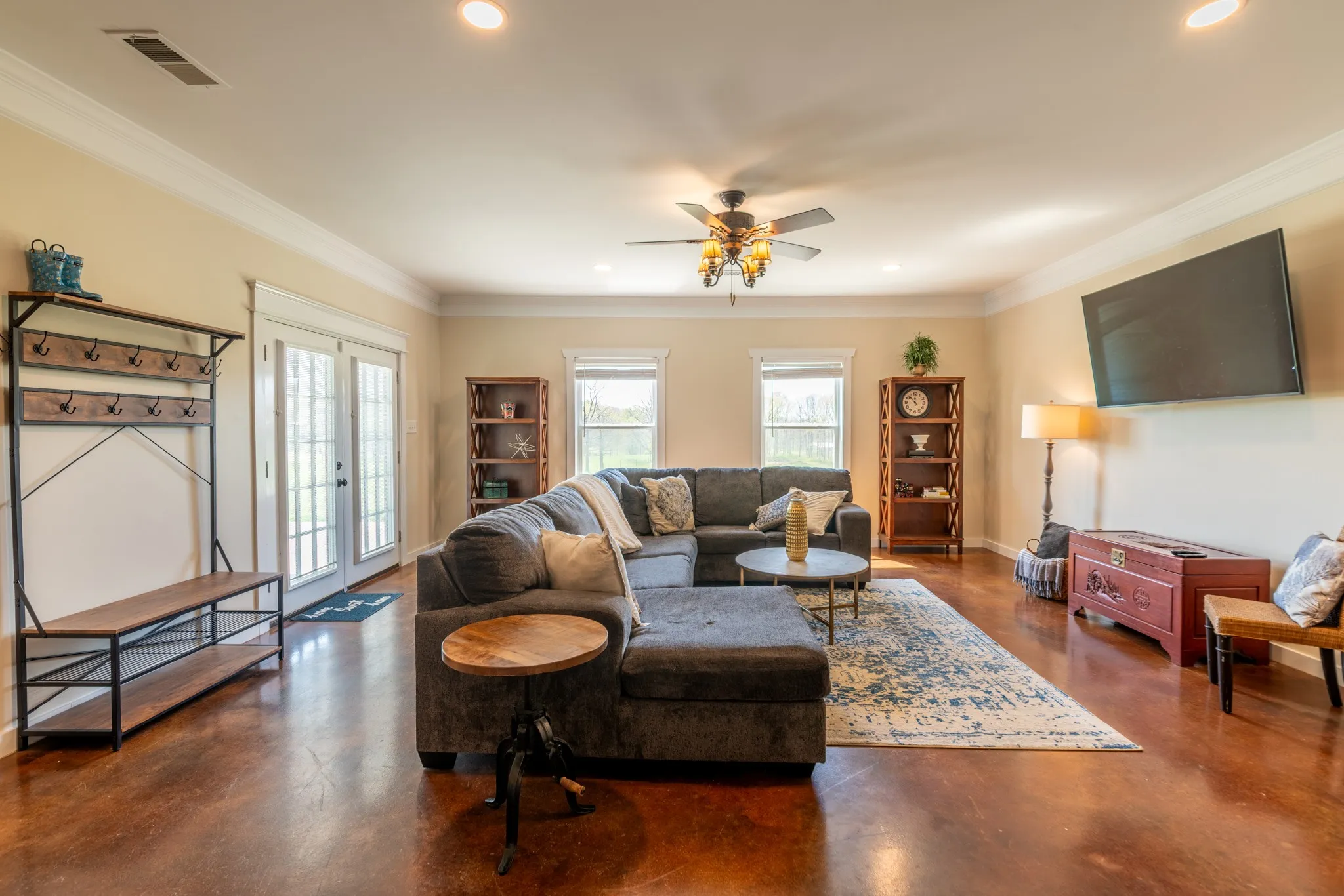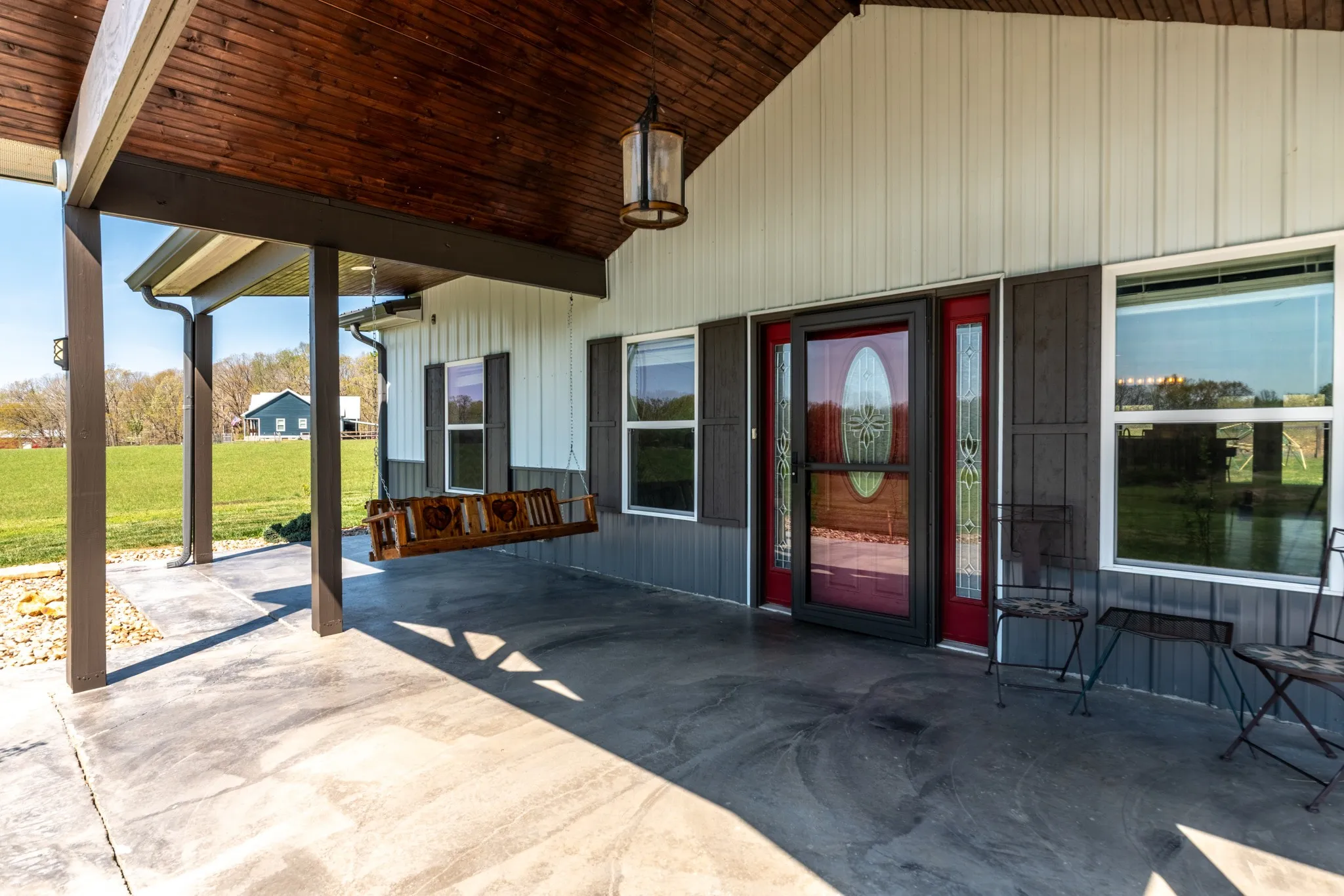 Inside, the home is warm and inviting, featuring stained concrete floors throughout—offering a clean, durable, and low-maintenance finish with timeless farmhouse appeal. The thoughtfully designed layout includes three bedrooms, two full baths, and a spacious bonus/media room ideal for entertaining, movie nights, a game room, or additional living space.