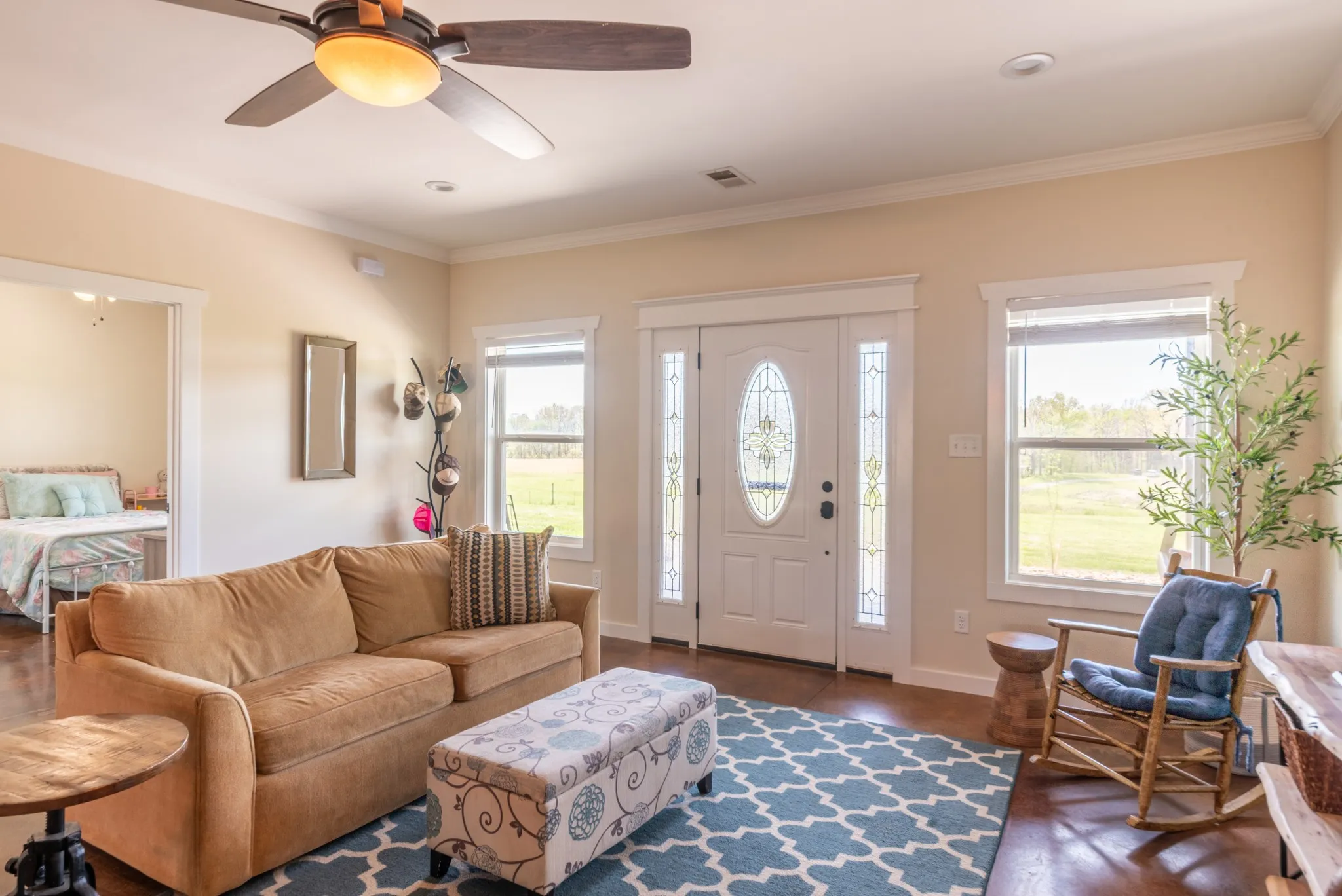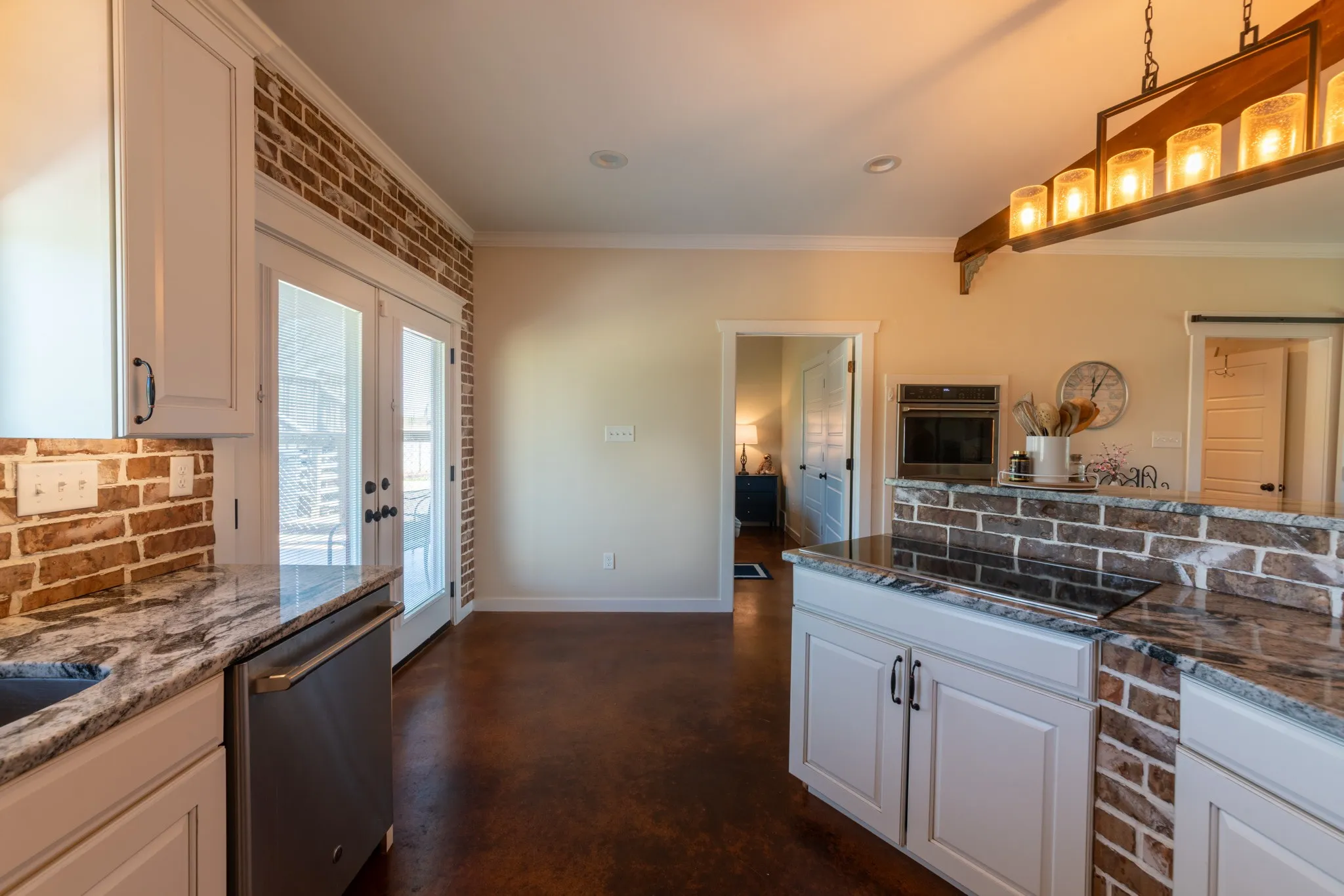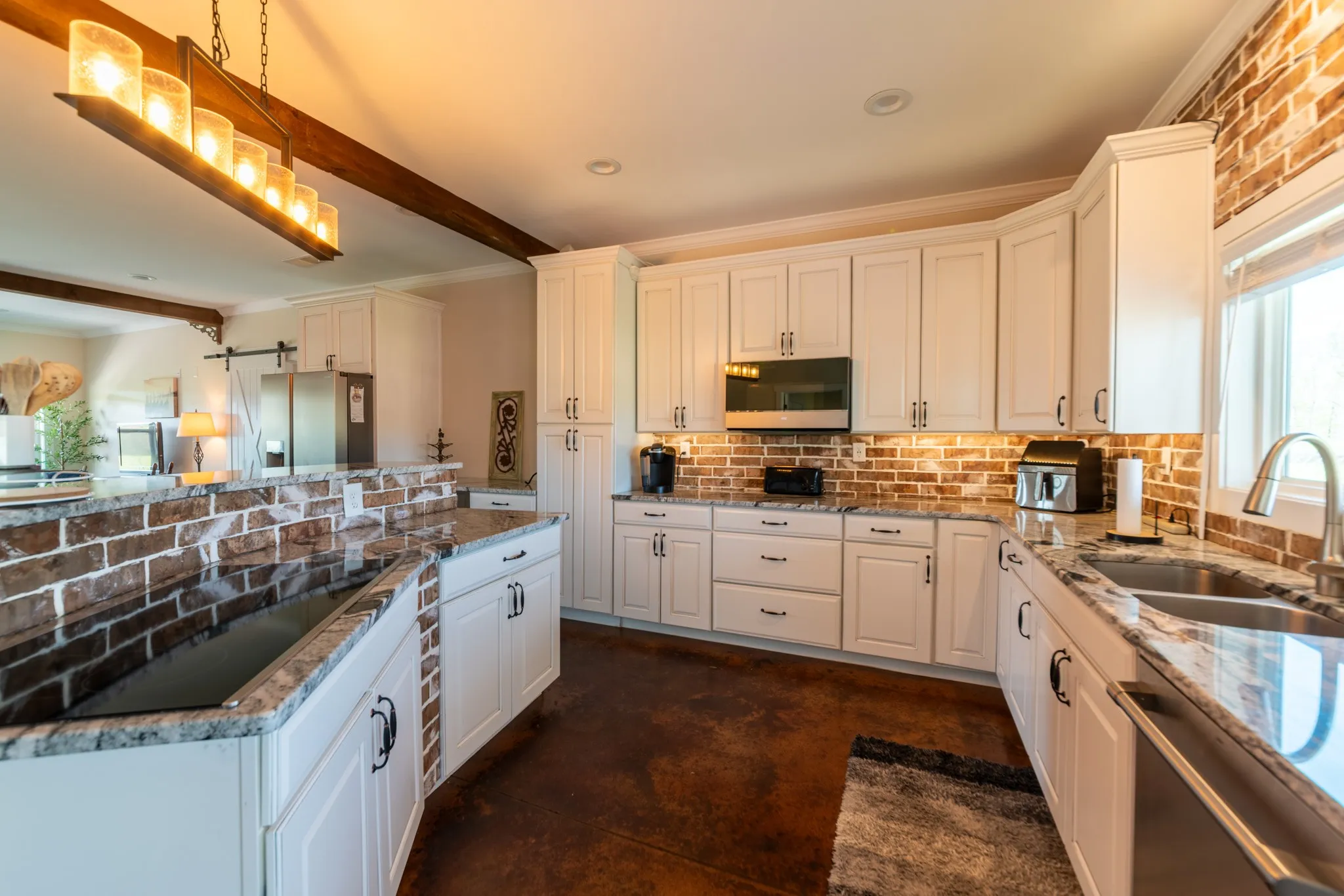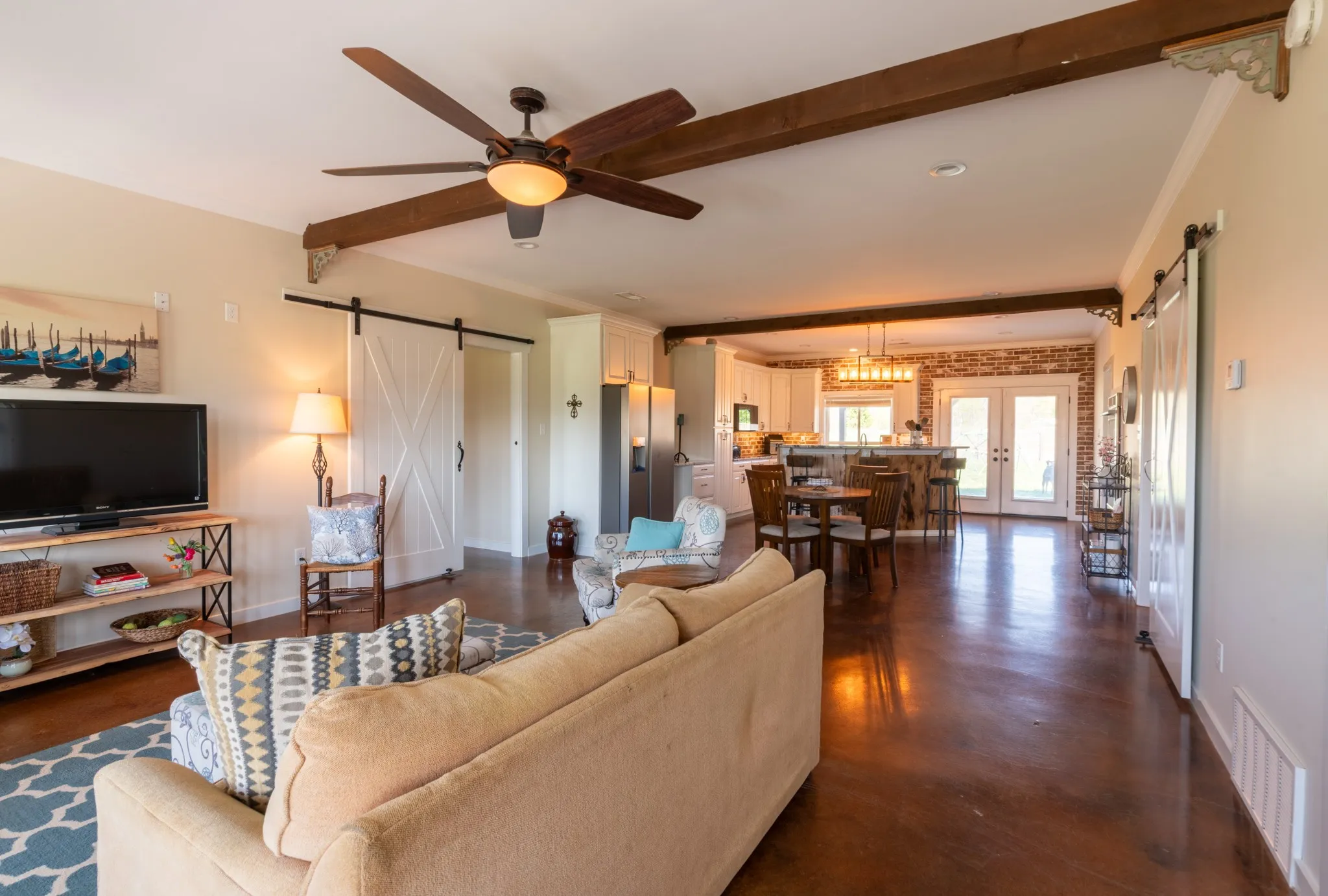 Inside, the home is warm and inviting, featuring stained concrete floors throughout—offering a clean, durable, and low-maintenance finish with timeless farmhouse appeal. The thoughtfully designed layout includes three bedrooms, two full baths, and a spacious bonus/media room ideal for entertaining, movie nights, a game room, or additional living space.