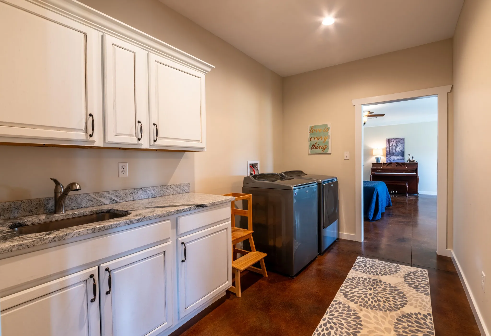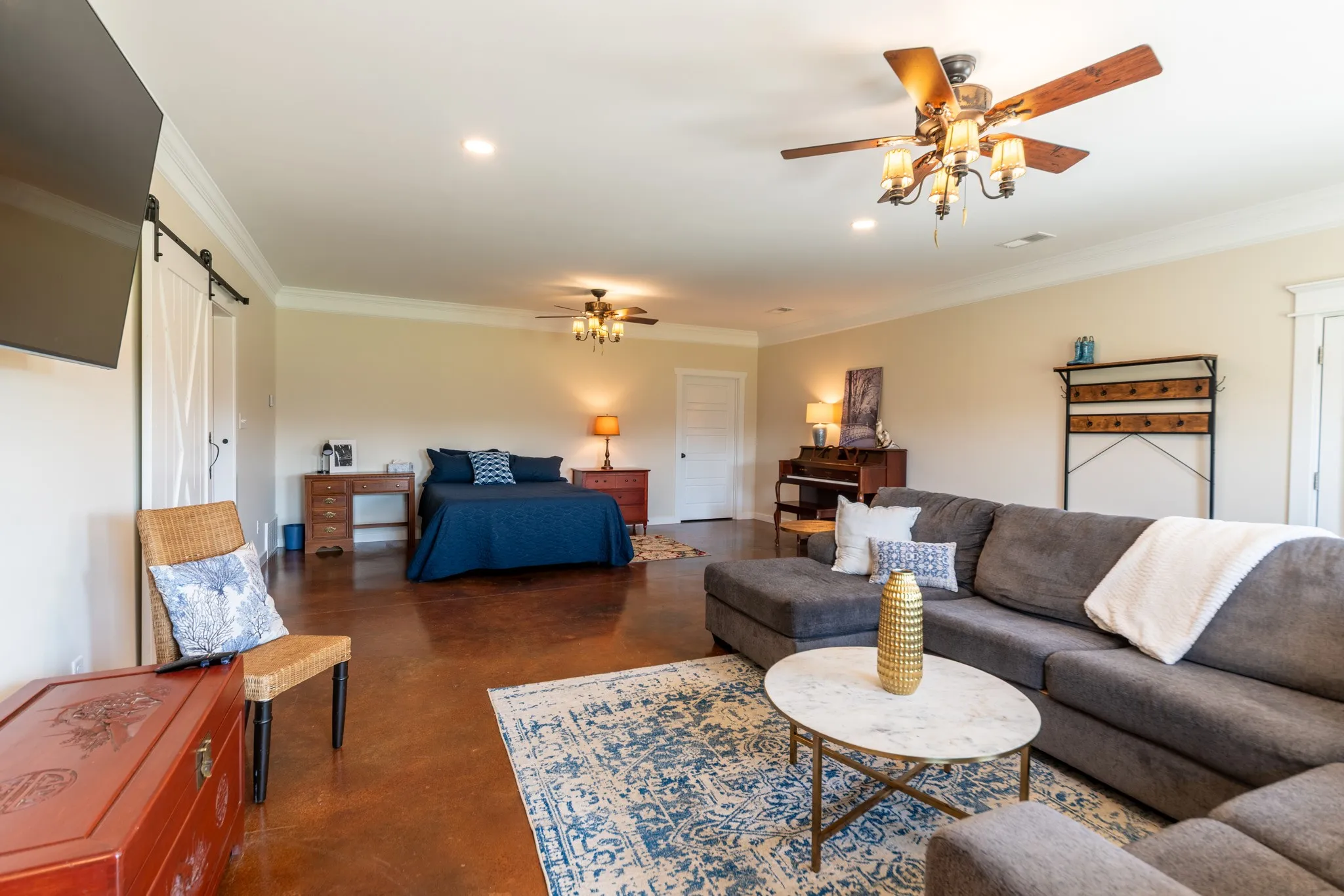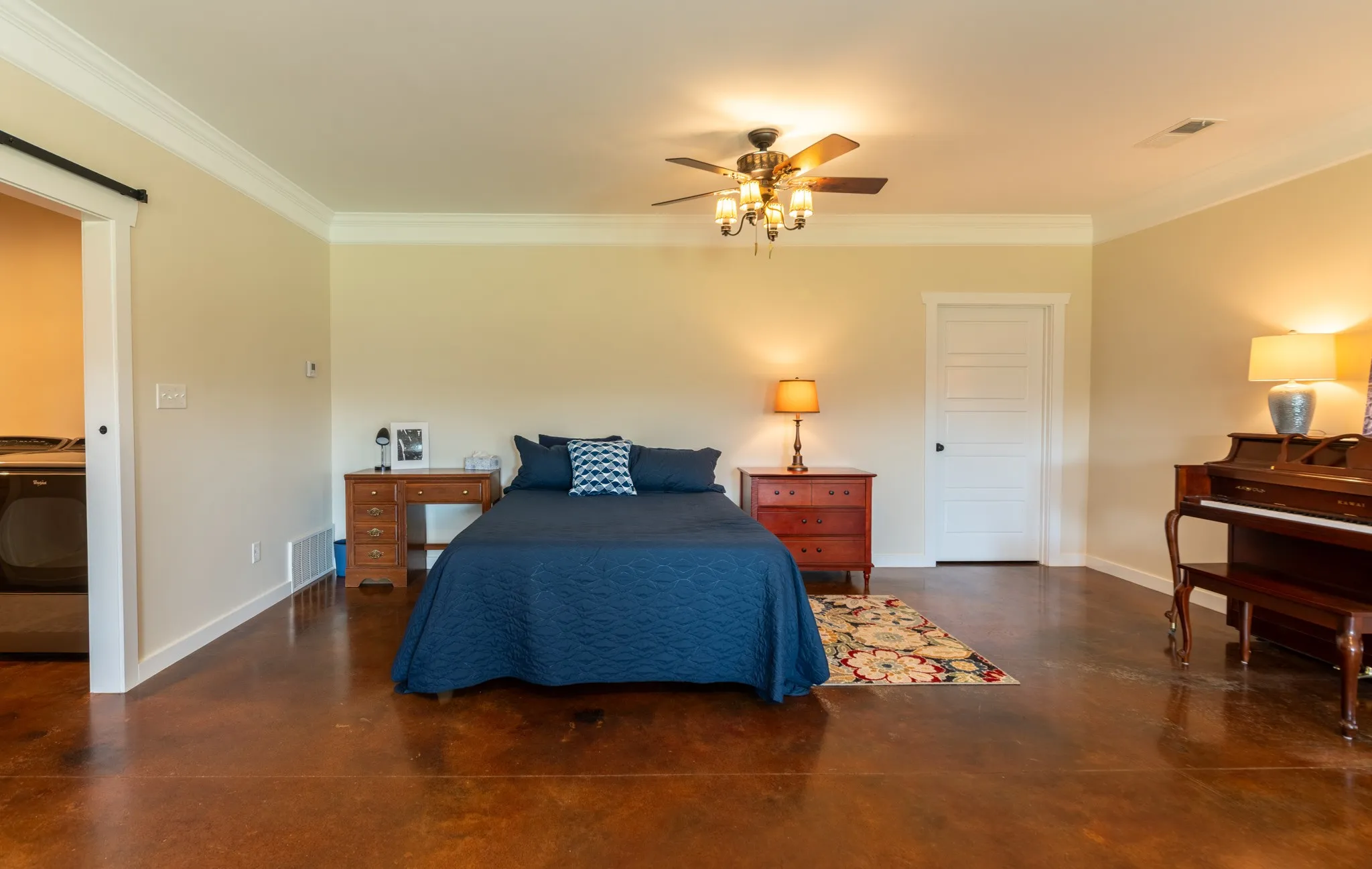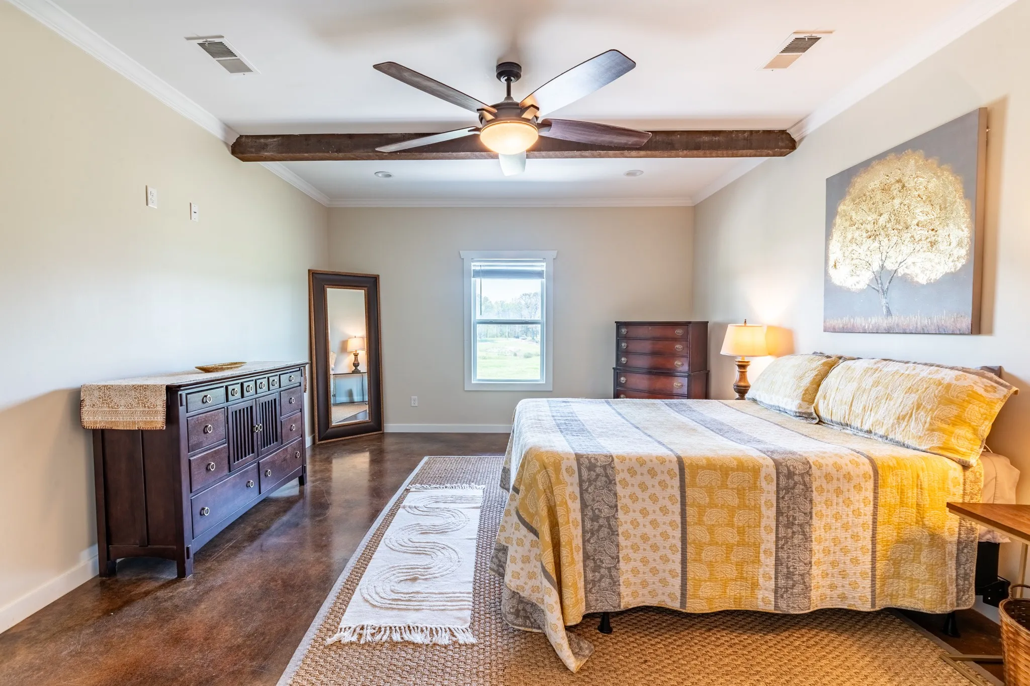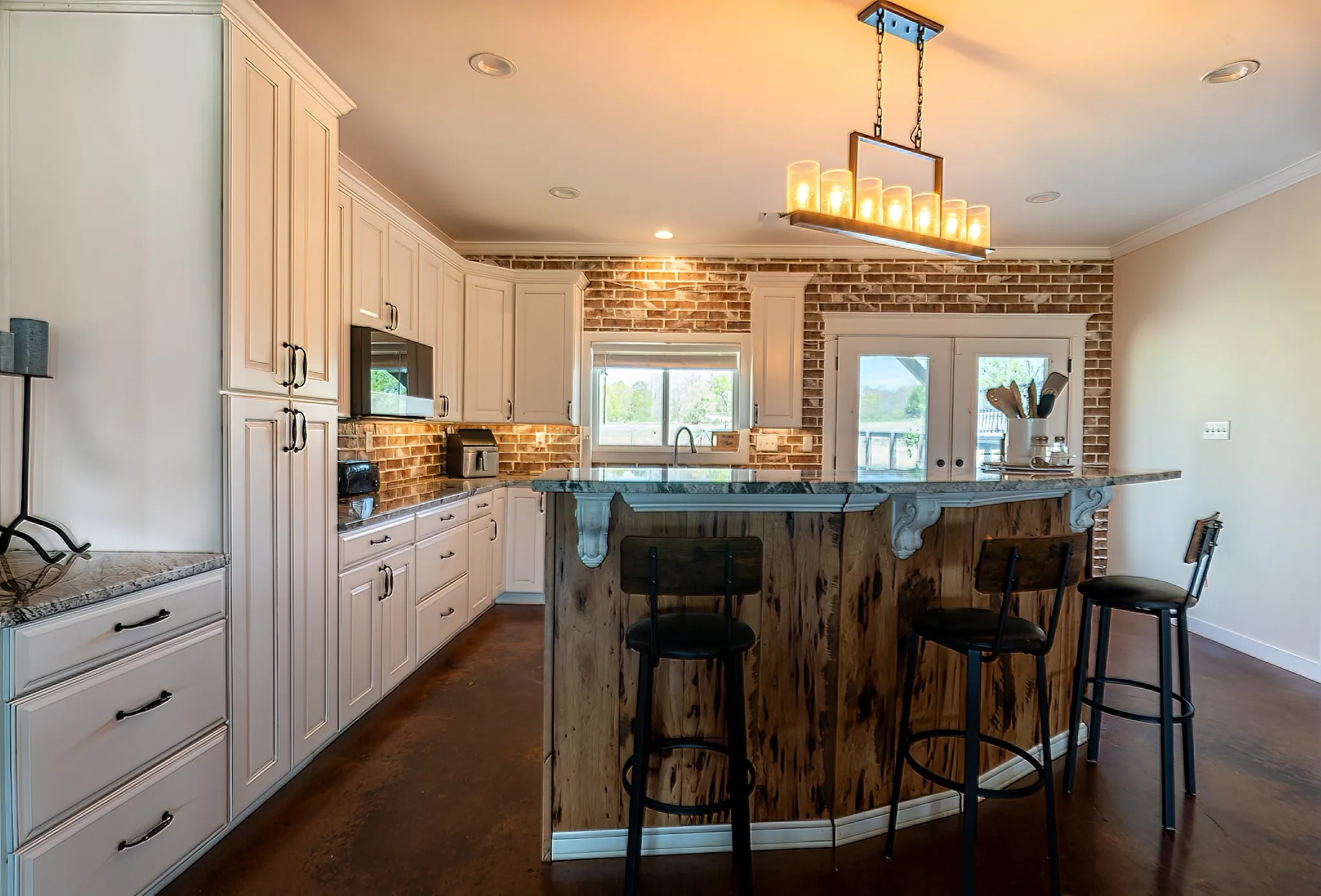 Inside, the home is warm and inviting, featuring stained concrete floors throughout—offering a clean, durable, and low-maintenance finish with timeless farmhouse appeal. The thoughtfully designed layout includes three bedrooms, two full baths, and a spacious bonus/media room ideal for entertaining, movie nights, a game room, or additional living space.