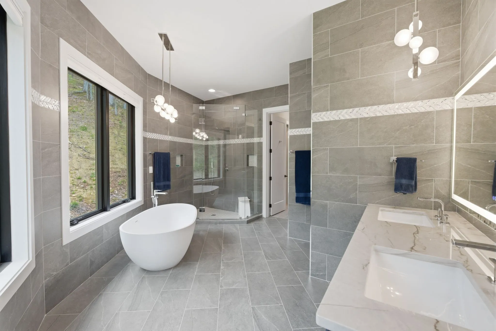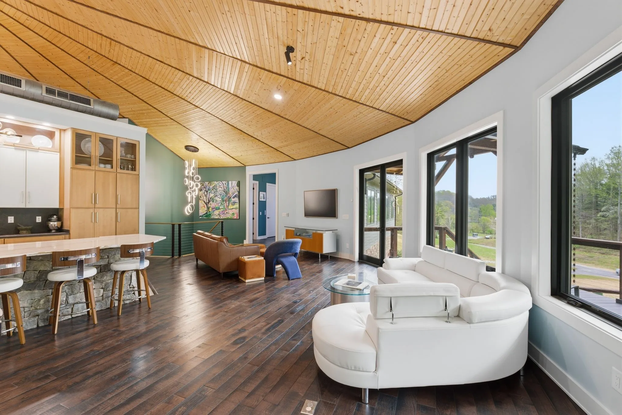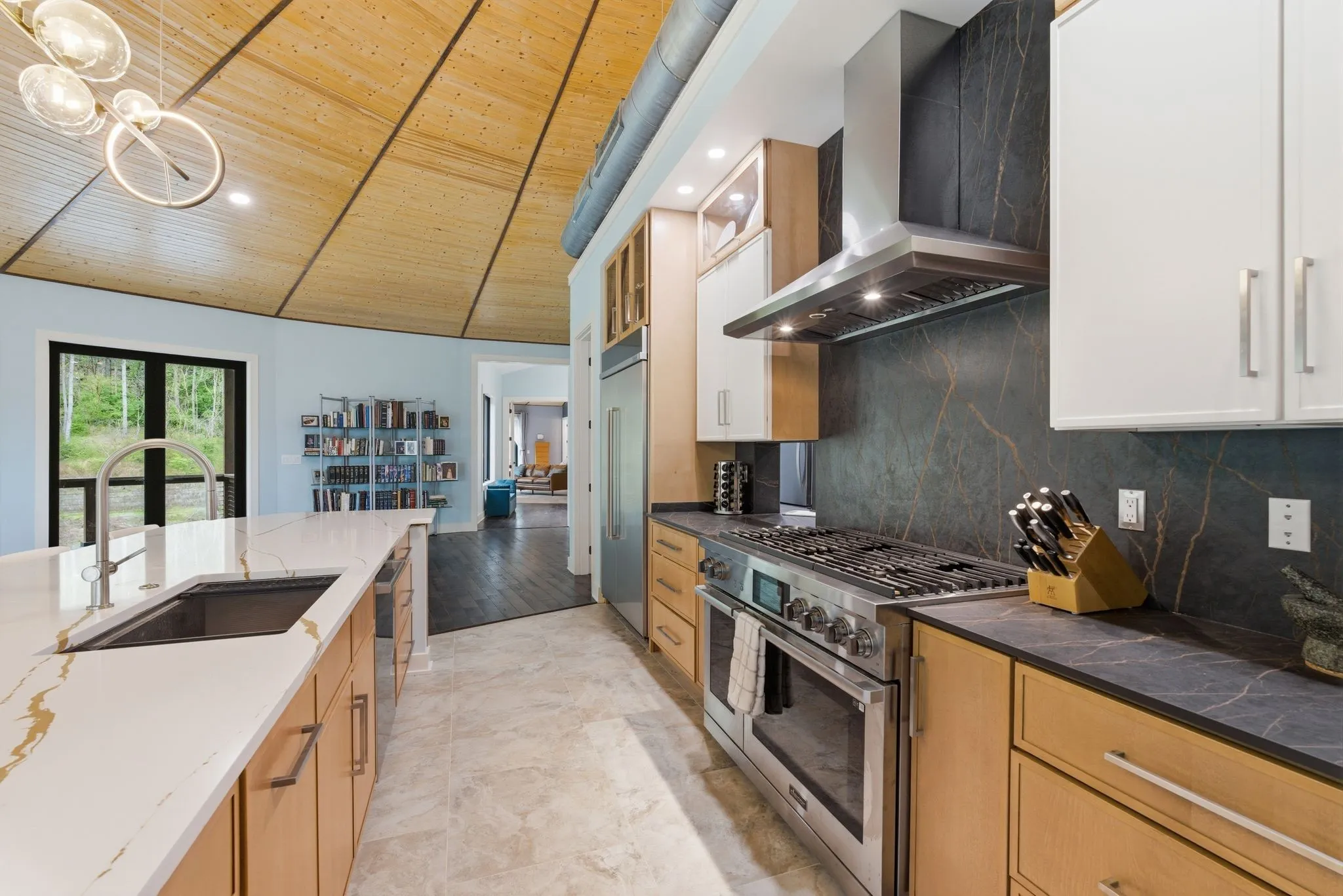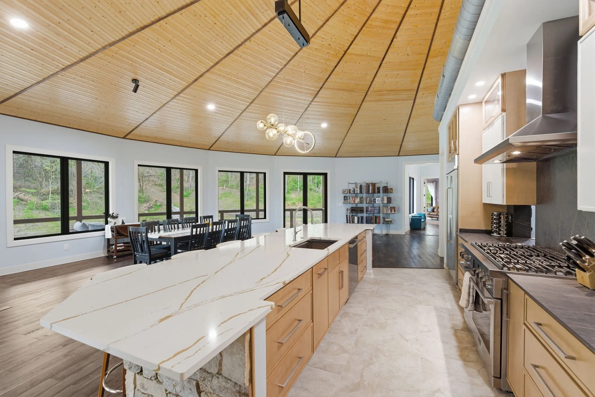 Designed with both scale and intention, the residence features multiple kitchens, offering flexibility for entertaining, multi-generational living, or seamless hosting at any level. Expansive windows line the home, filling each space with natural light and framing uninterrupted views of the surrounding land and water.