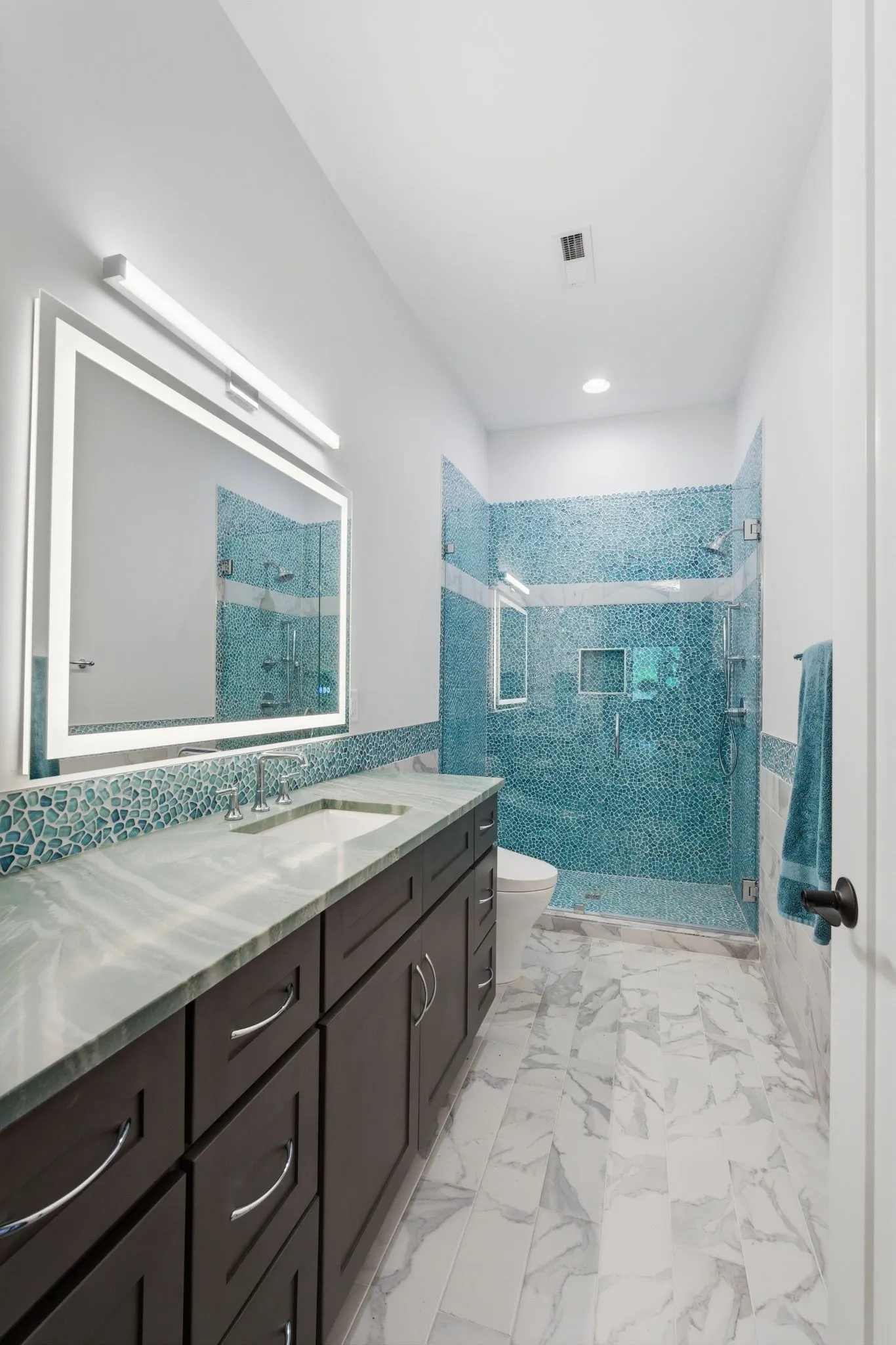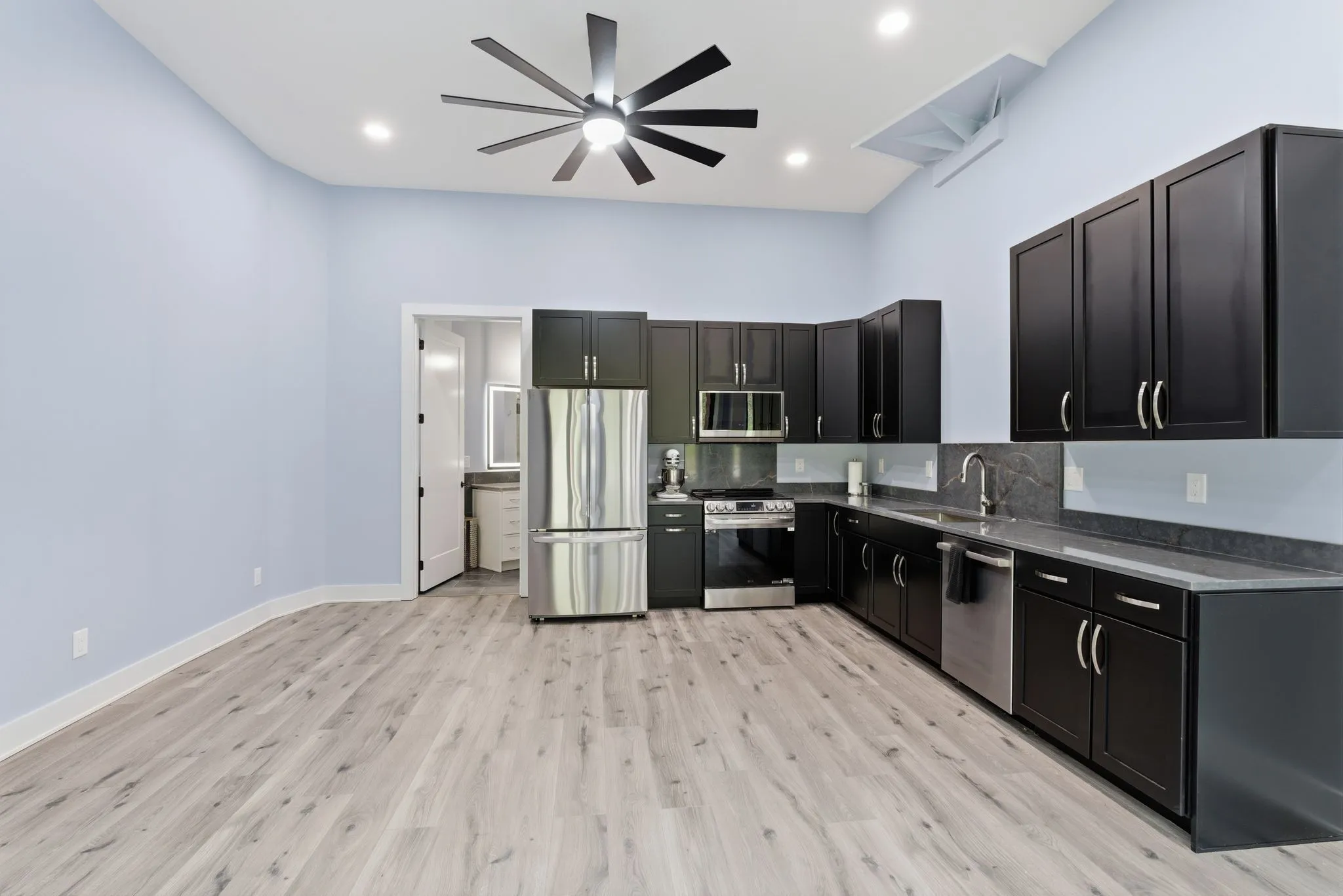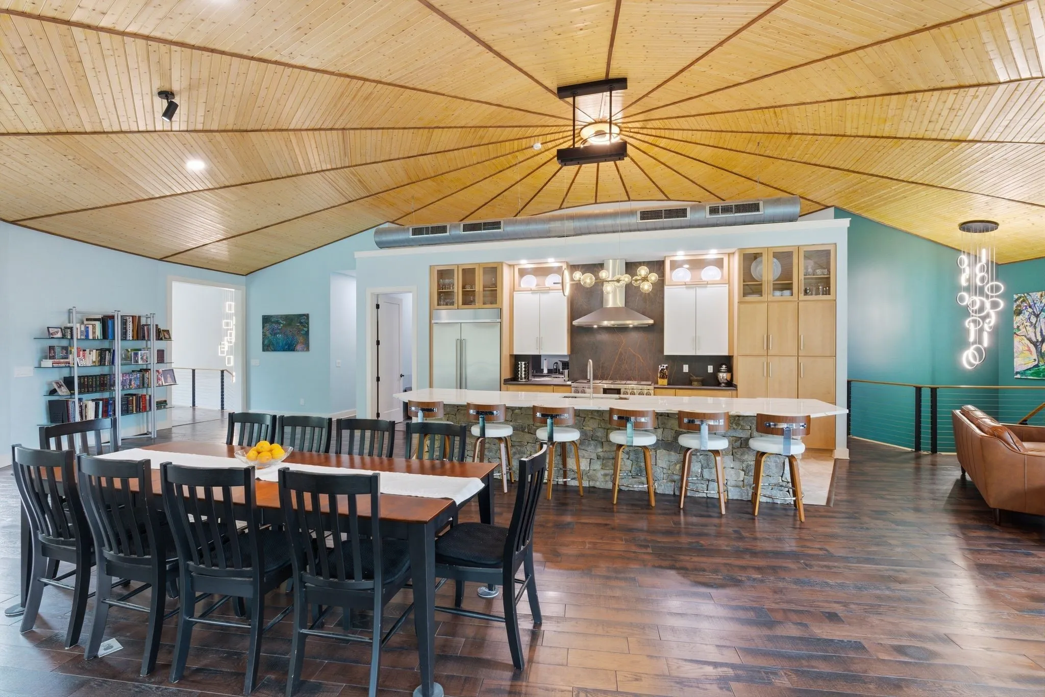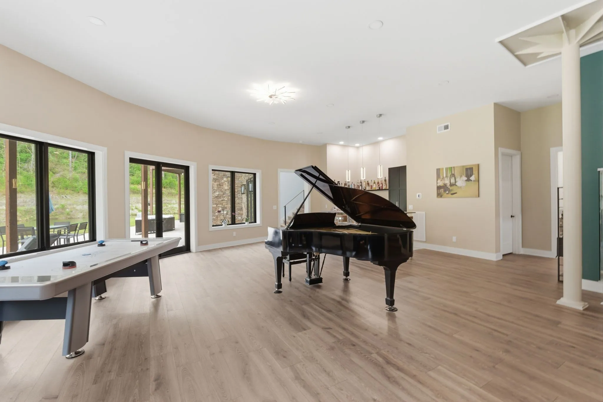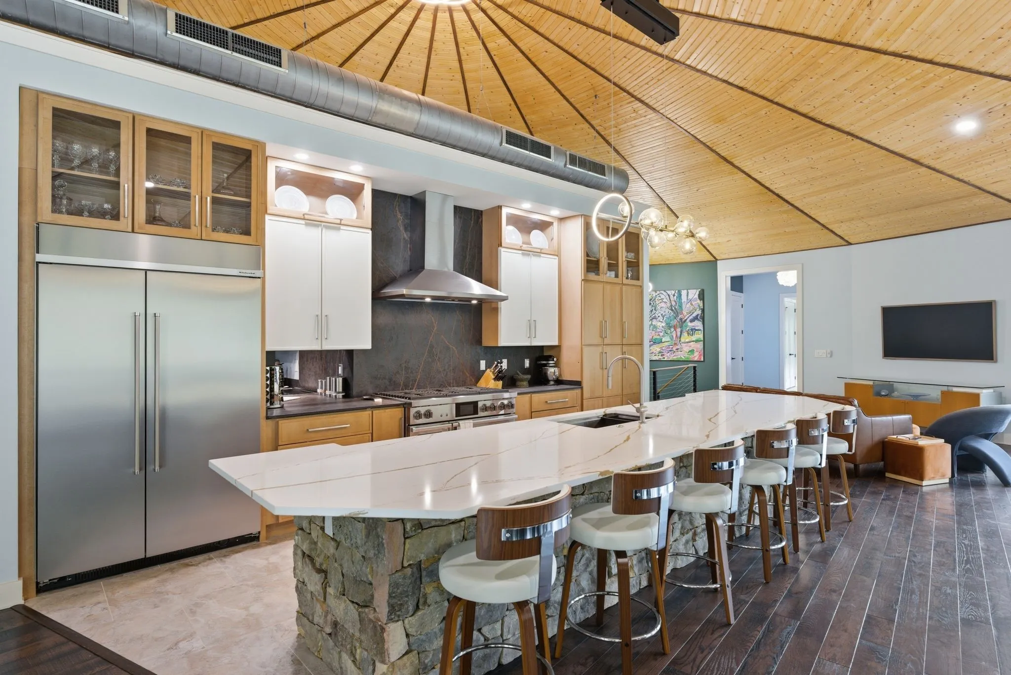 Designed with both scale and intention, the residence features multiple kitchens, offering flexibility for entertaining, multi-generational living, or seamless hosting at any level. Expansive windows line the home, filling each space with natural light and framing uninterrupted views of the surrounding land and water.