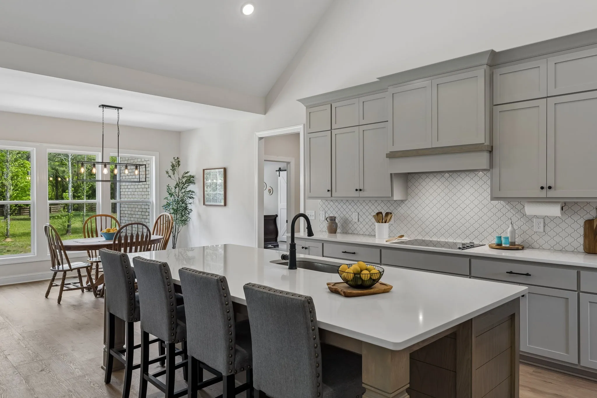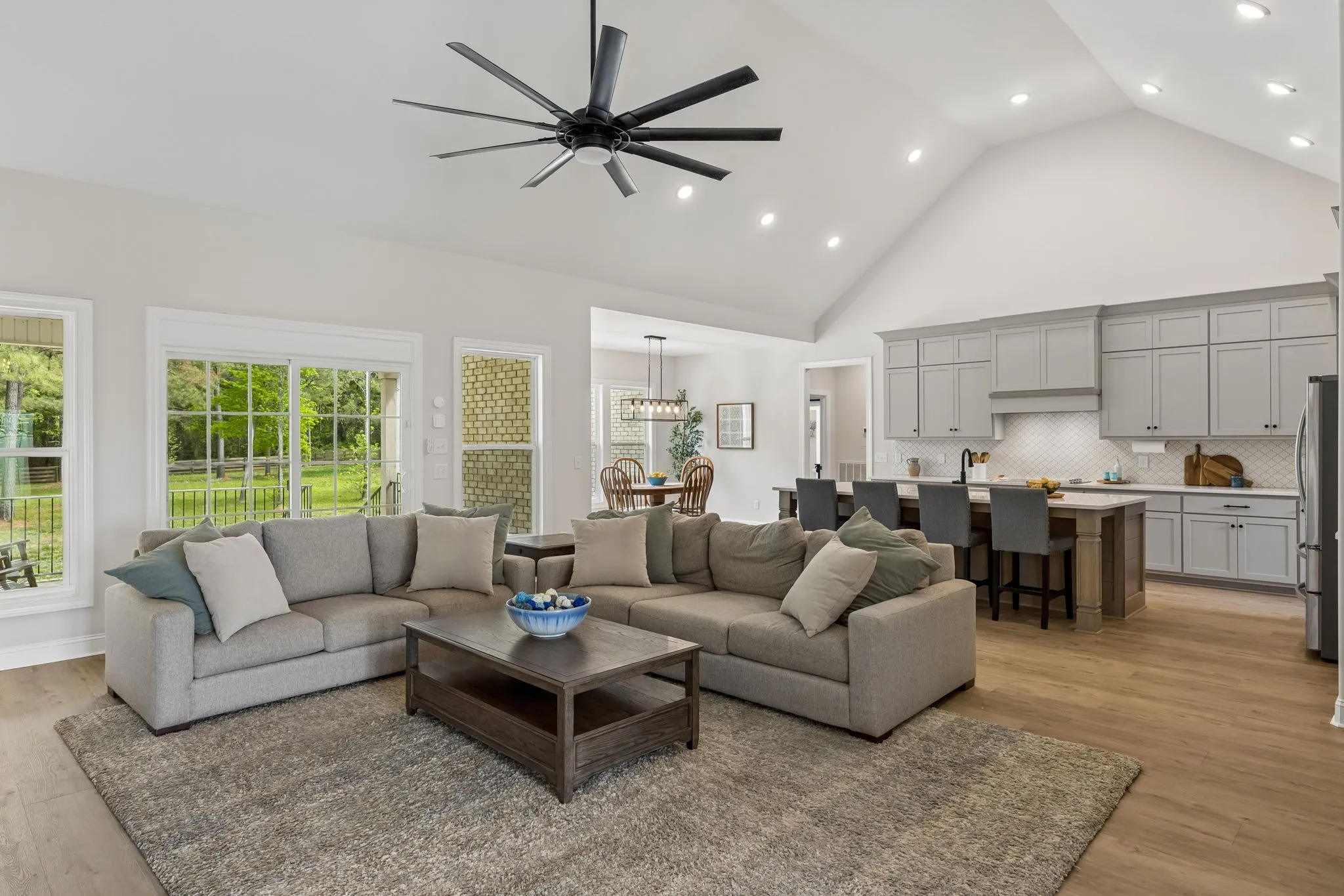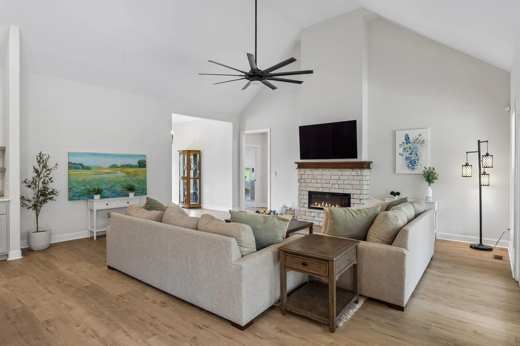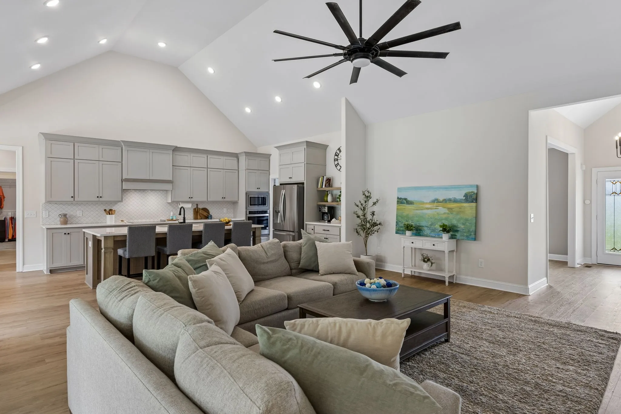 The home is impressive from the moment you drive up, and the interior is stunning. The vaulted ceilings and open floorplan create a grand, welcoming living space. The chef’s kitchen is exceptional, featuring a large island, high-end appliances, beautiful finishes, and a bright walk-in pantry complete with a refrigerator and extensive cabinetry.