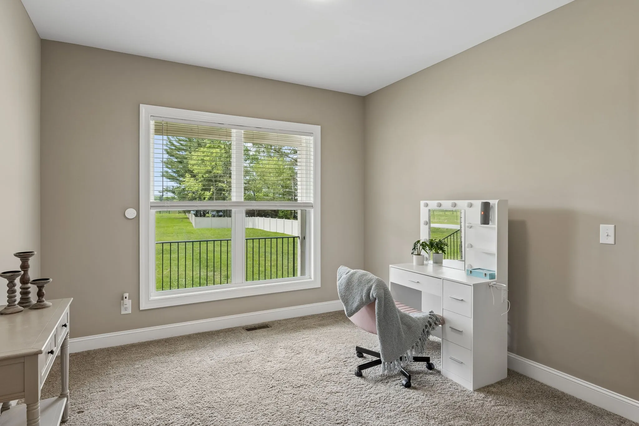 The primary suite is a true retreat, with a luxurious bathroom offering separate vanities, a soaking tub, and an upscale tiled shower. The bath connects to an oversized walk-in closet, comparable in size to a bedroom, with convenient access to a well-appointed laundry room featuring custom cabinetry and designer touches. With four bedrooms and a dedicated office, the home offers both flexibility and function. Outdoor living is just as inviting, with spacious patios, a fireplace, and a large fenced backyard. Beyond the fence, the acreage extends into dense woods, perfect for hiking or ATV adventures.