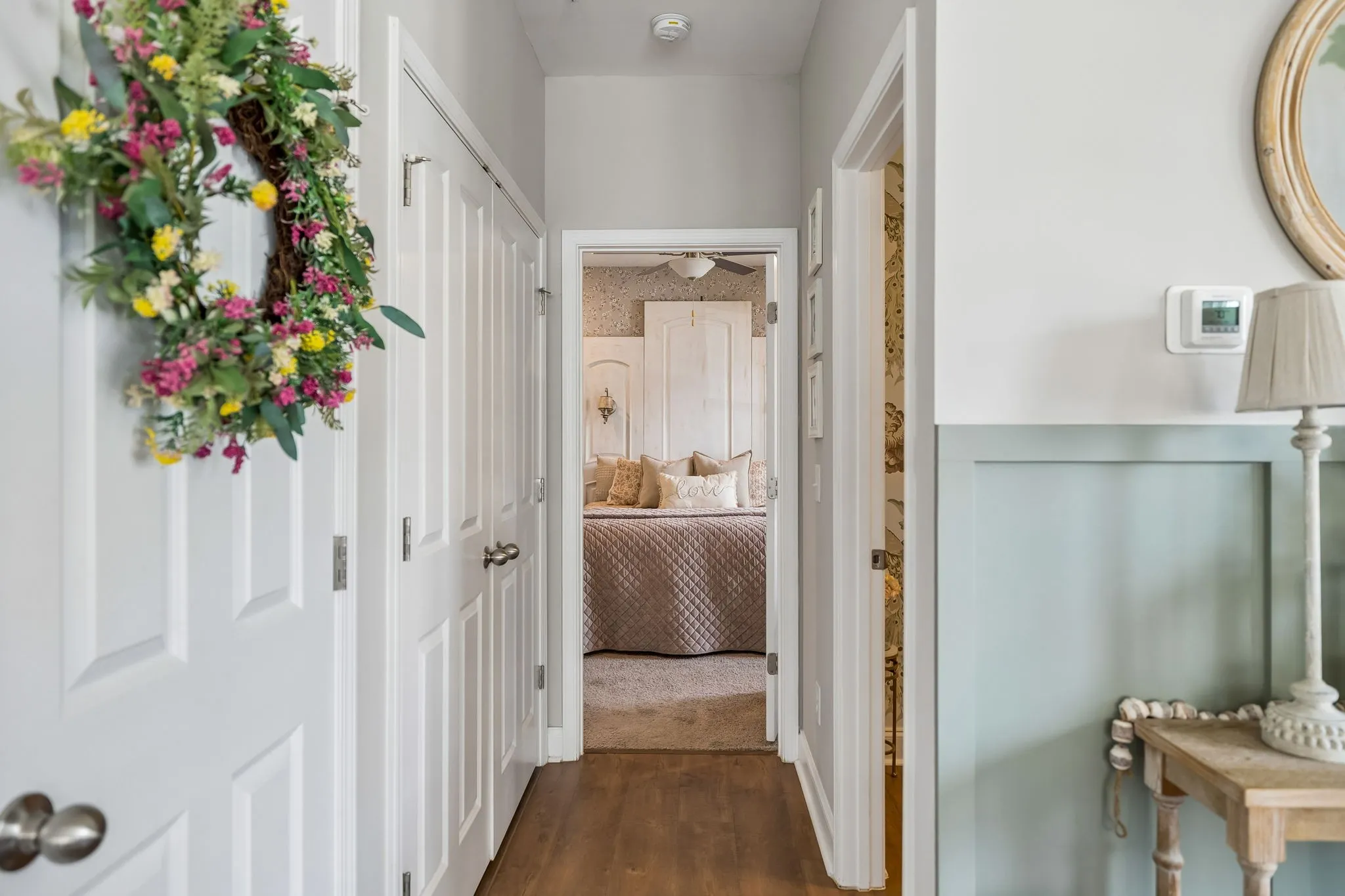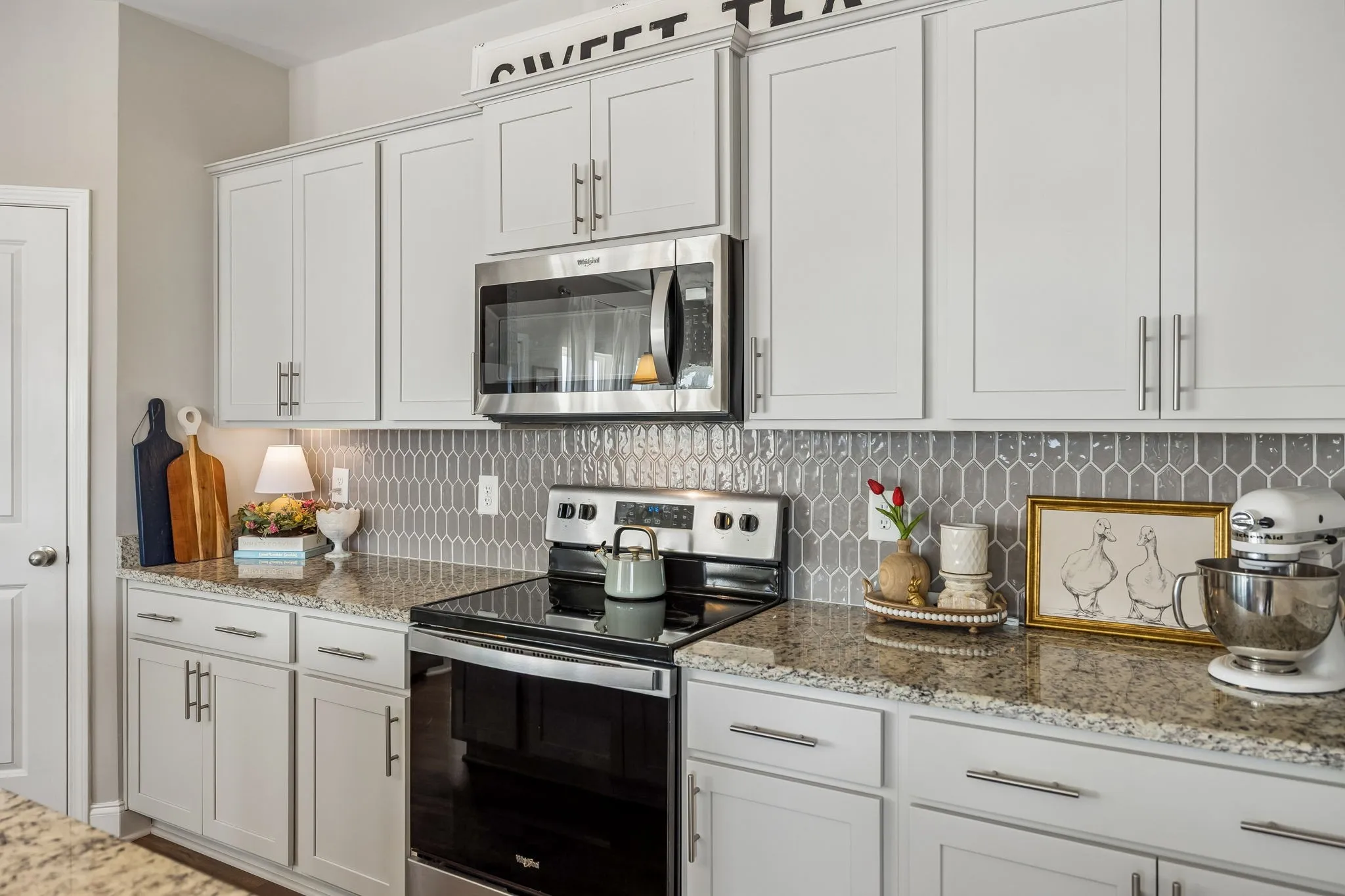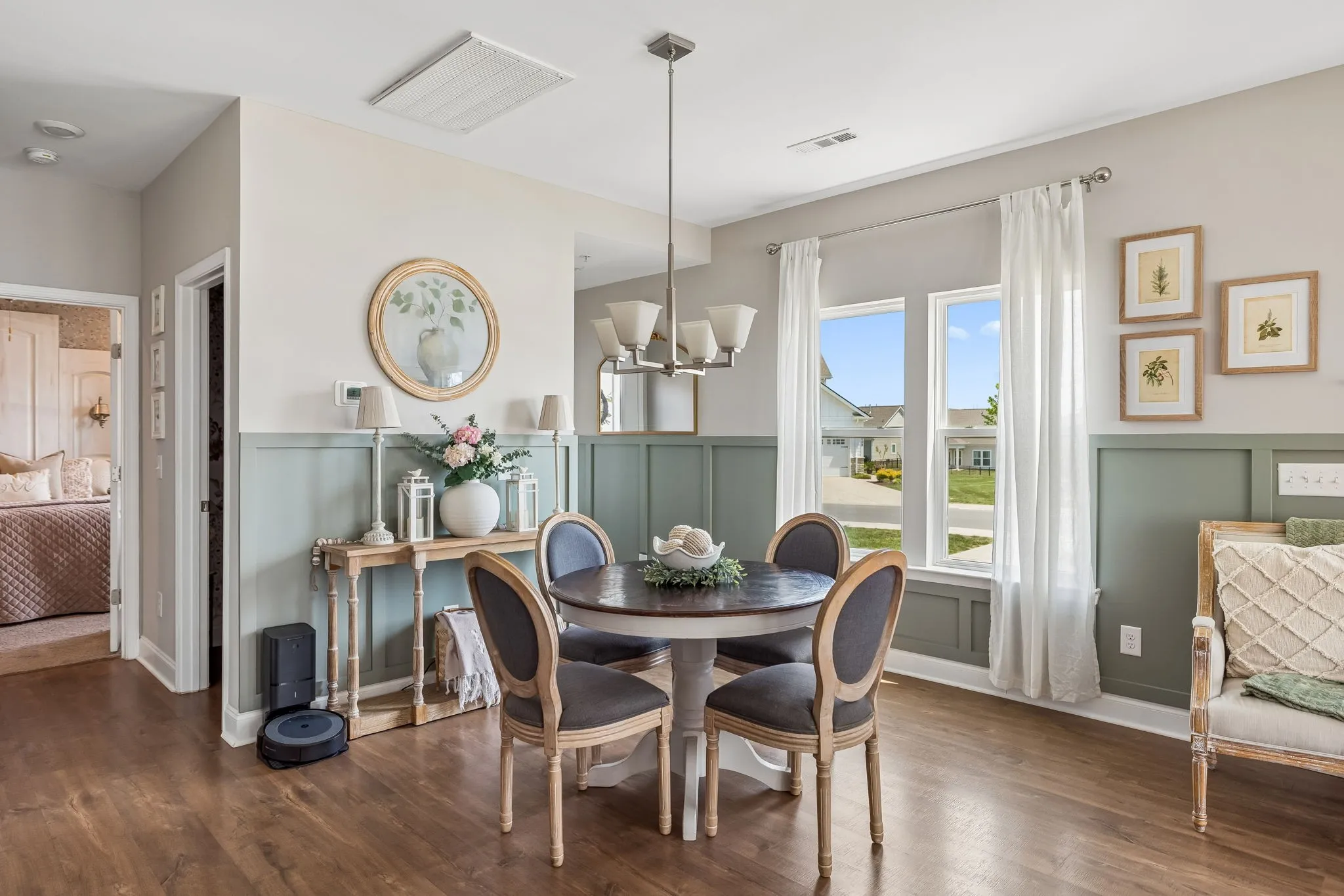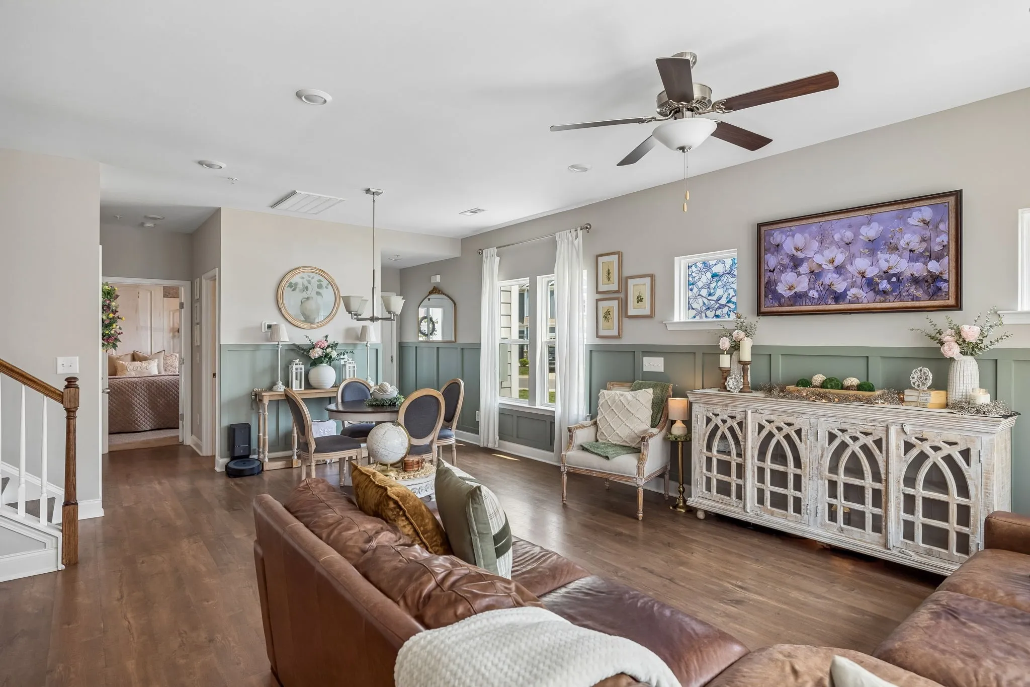 The thoughtfully designed kitchen is both stylish and functional, featuring a stunning backsplash that adds a custom touch while seamlessly connecting to the main living spaces. Elegant wainscoting in the main living area adds charm and character, creating a warm yet sophisticated setting for relaxing or entertaining.