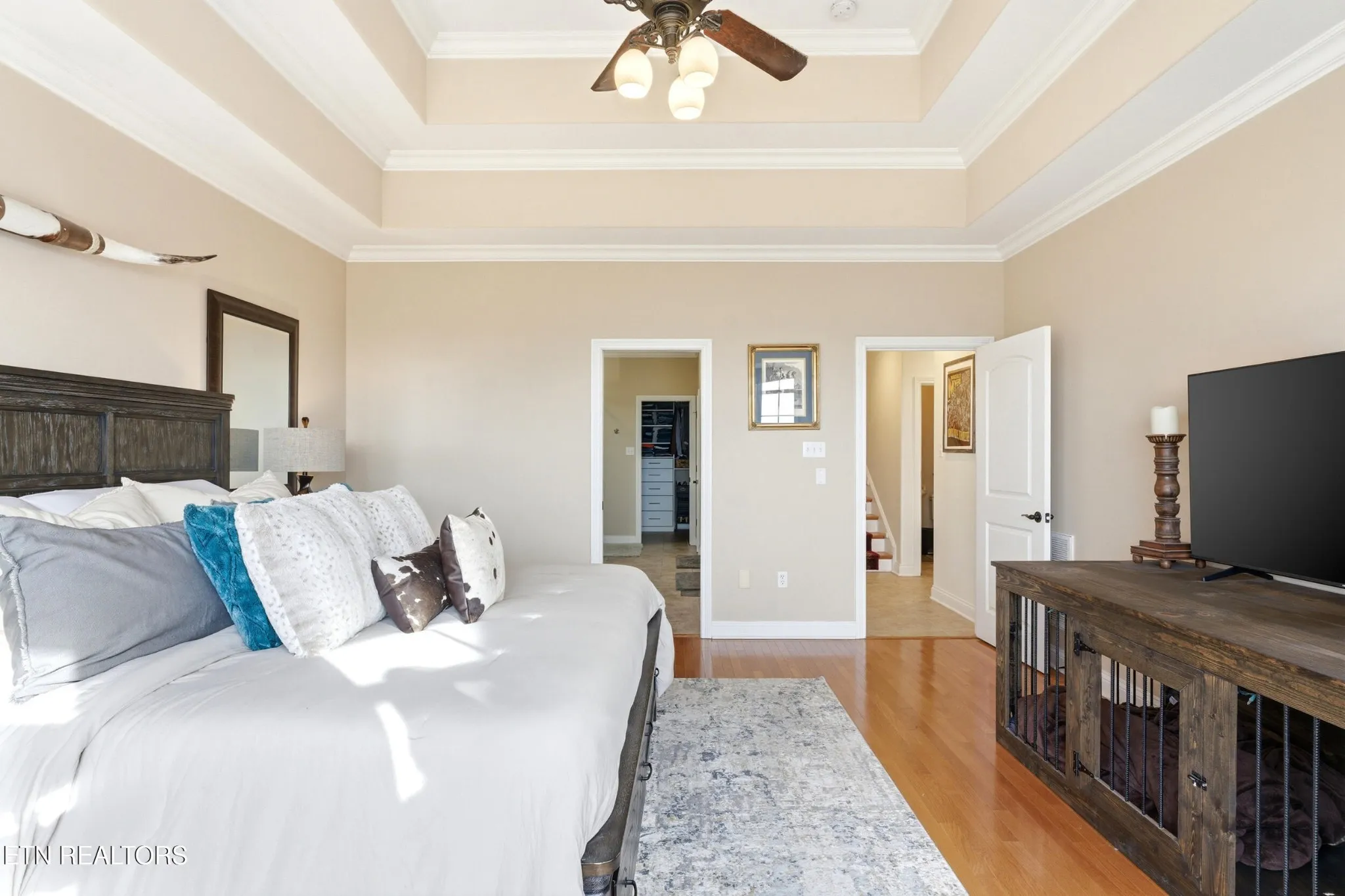 The main-level owner’s suite is a private sanctuary, designed to maximize both comfort and scenery. Wake up to mountain views and unwind in a spa-like ensuite featuring a soaking tub, walk-in shower, and expansive custom closet system.