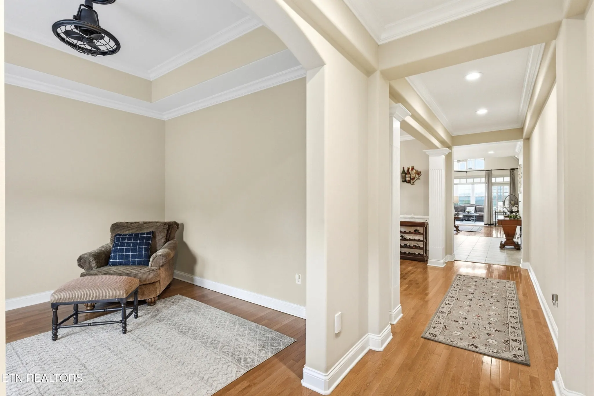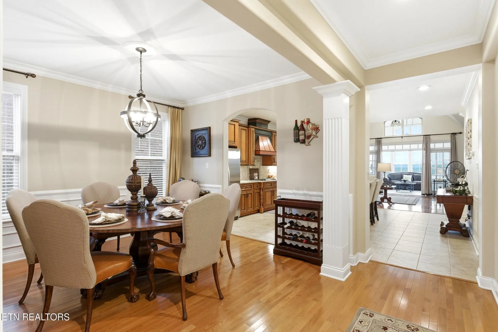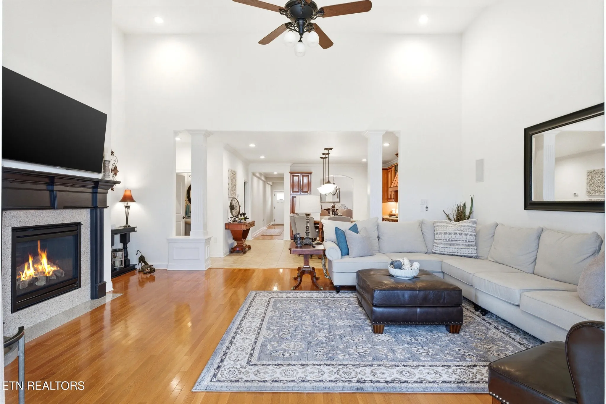 Inside, the home unfolds with an elegant, open-concept design highlighted by soaring ceilings, rich hardwood flooring, and an abundance of natural light. A formal dining space sets the tone for elevated entertaining, while the chef’s kitchen–complete with custom cabinetry, granite surfaces, stainless appliances, and an oversized island–anchors the heart of the home.