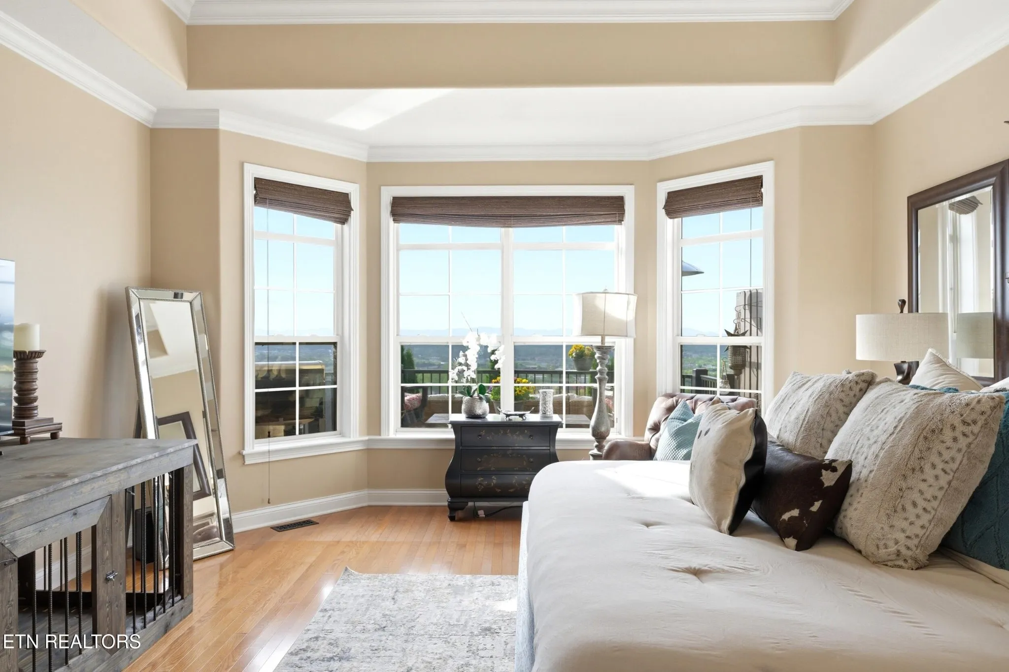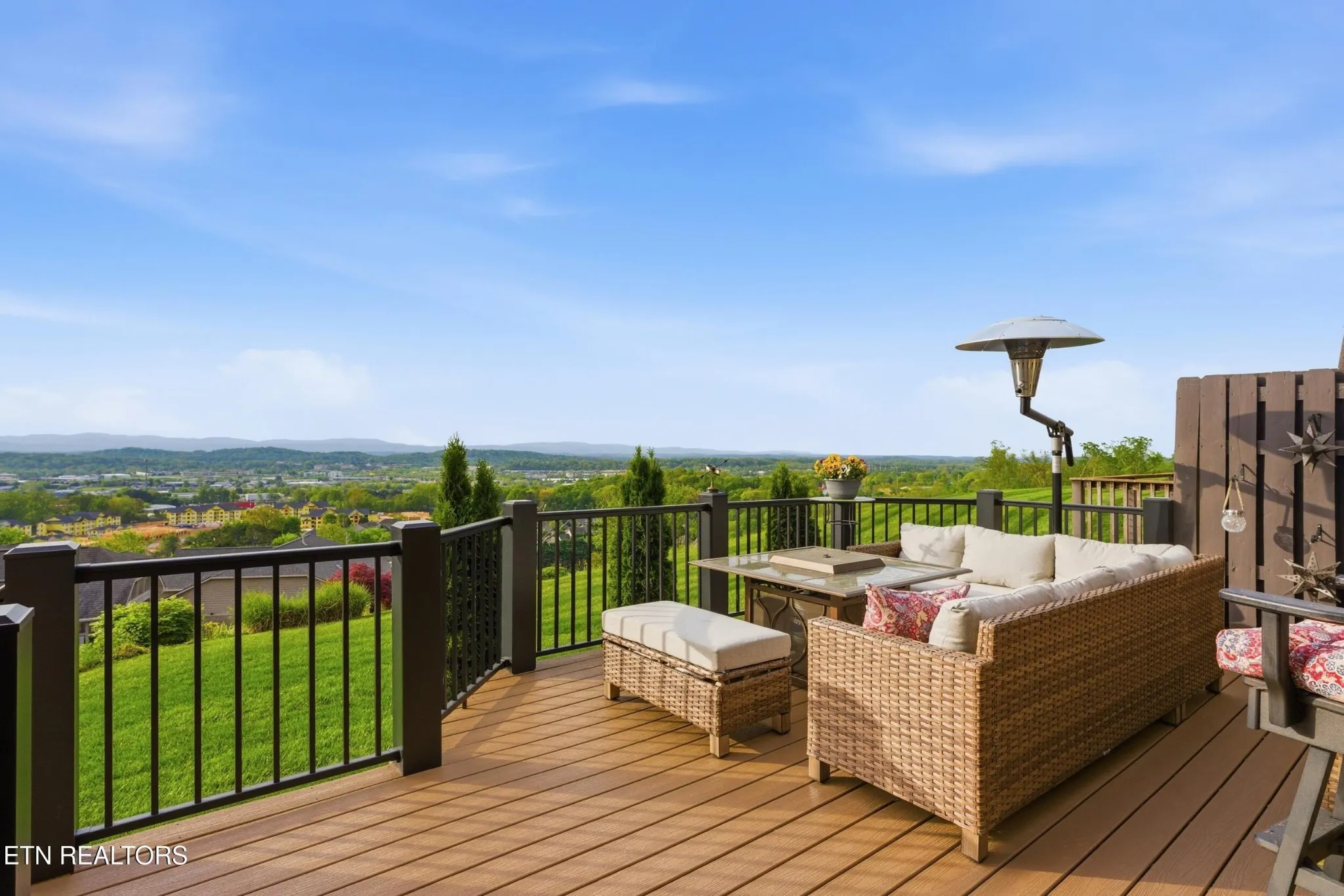 The living area is both warm and sophisticated, centered around a gas fireplace and seamlessly extending into a stunning sunroom wrapped in windows, where the views take center stage. Just beyond, the premium Trex deck offers a low-maintenance outdoor retreat–perfect for morning coffee above the city or evenings watching the mountains fade into dusk.