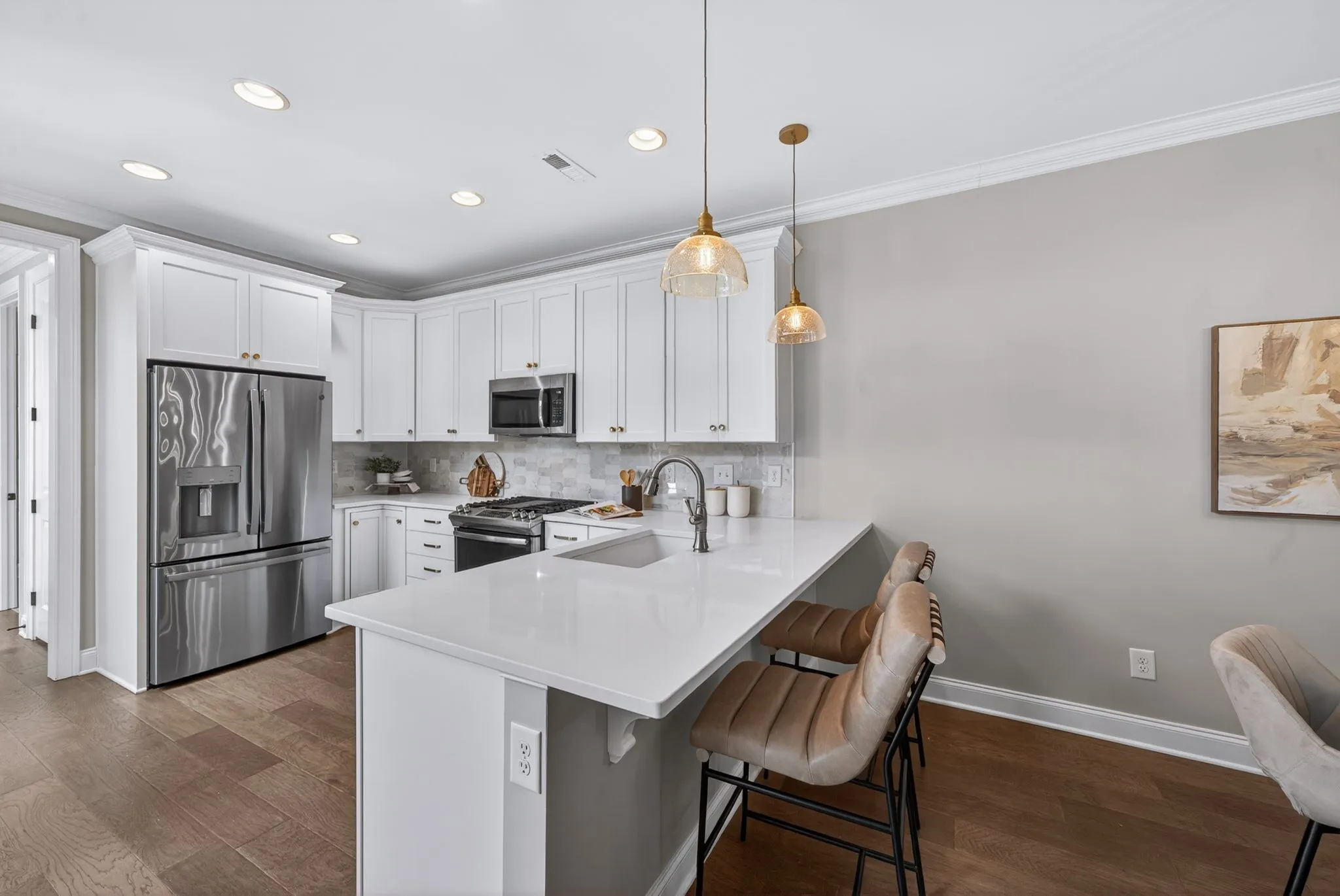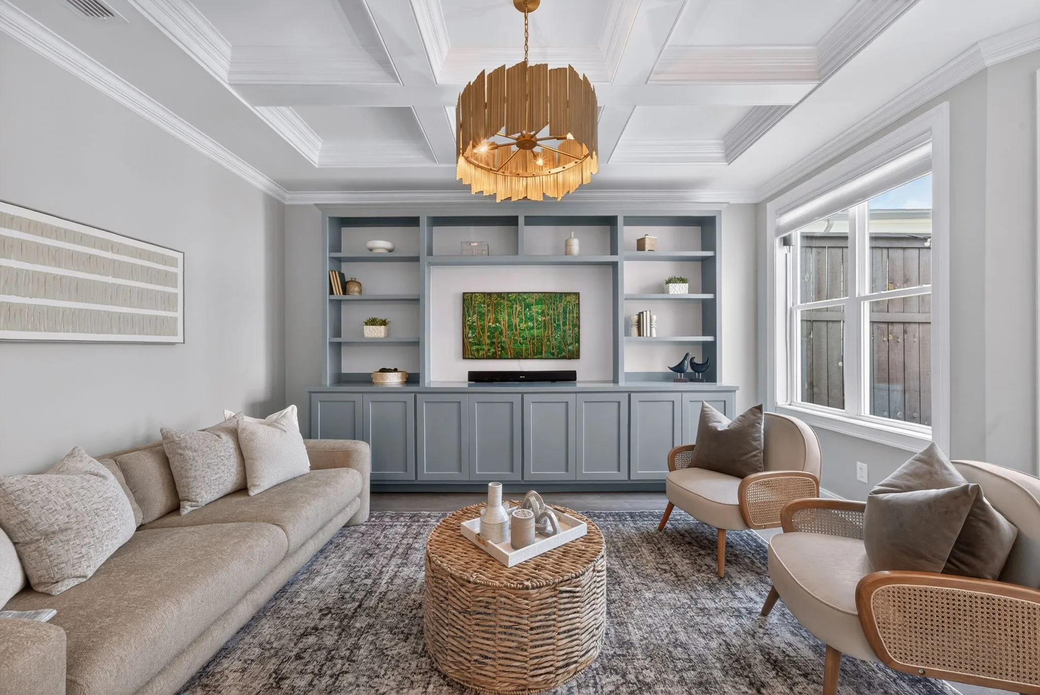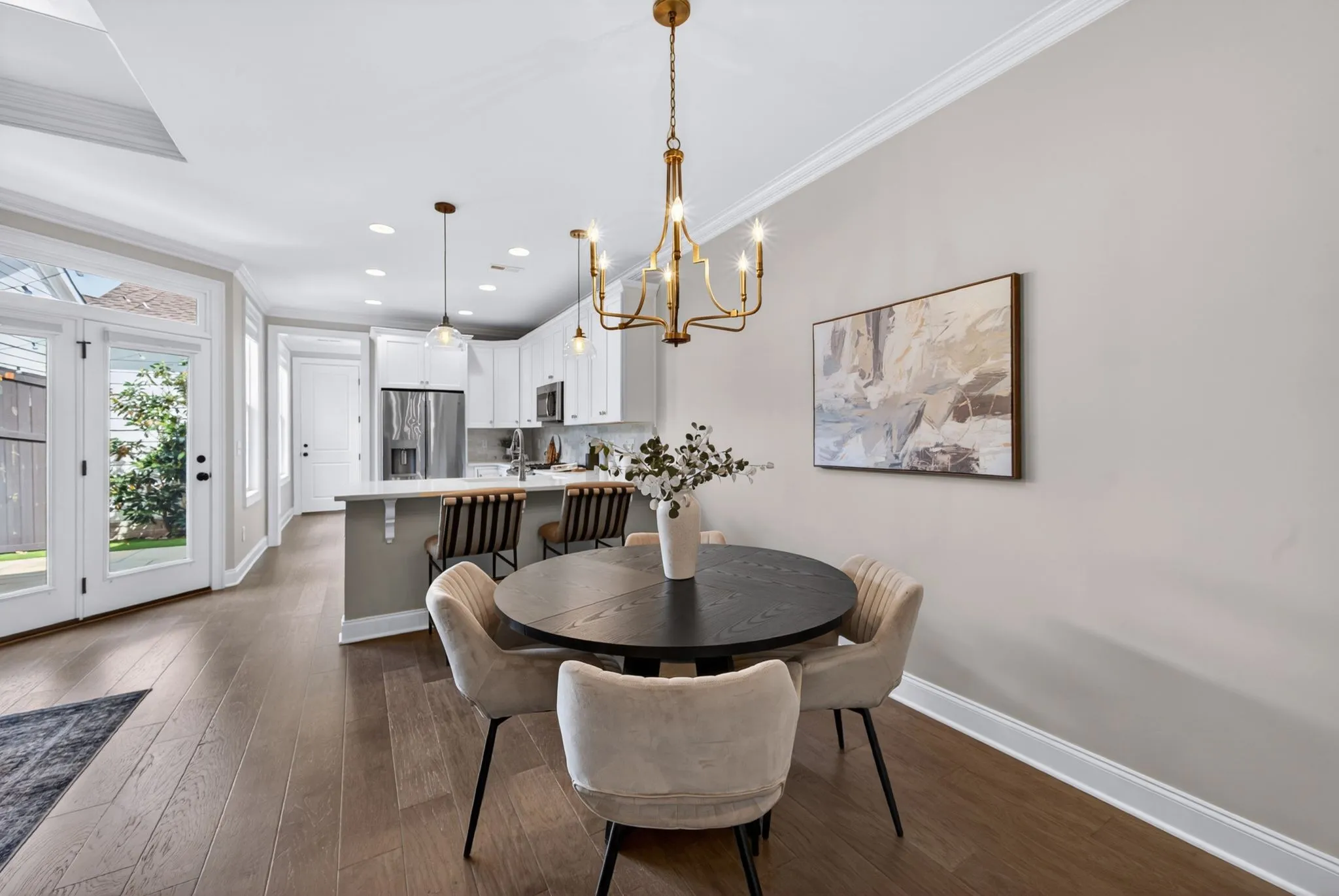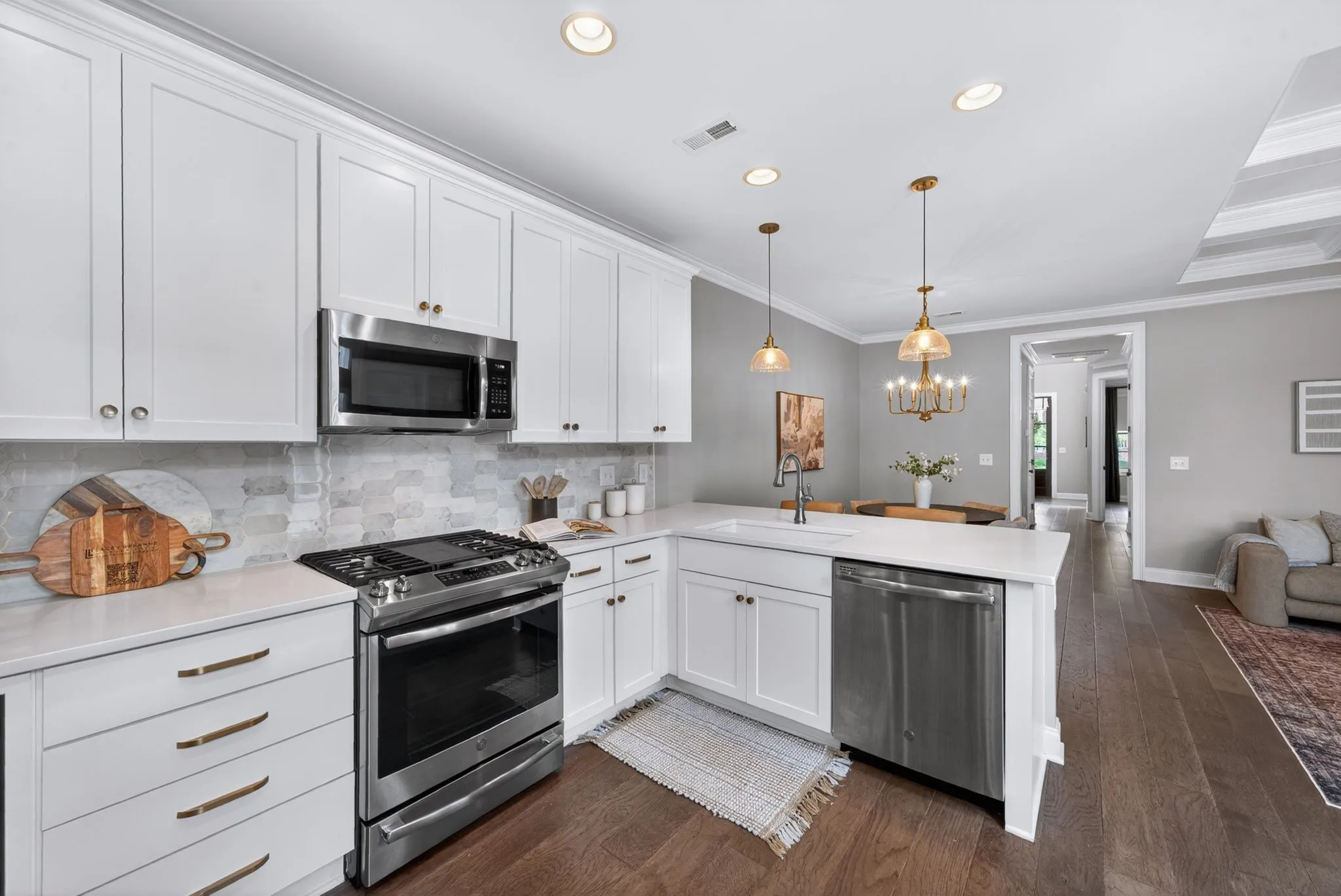 The main living space is where this home truly shines. A wall of windows fills the kitchen, dining, and living areas with natural light, creating a bright, connected space that feels both elevated and easy to live in. A custom built-in adds character, while the kitchen peninsula offers the perfect spot for casual mornings or gathering with friends.