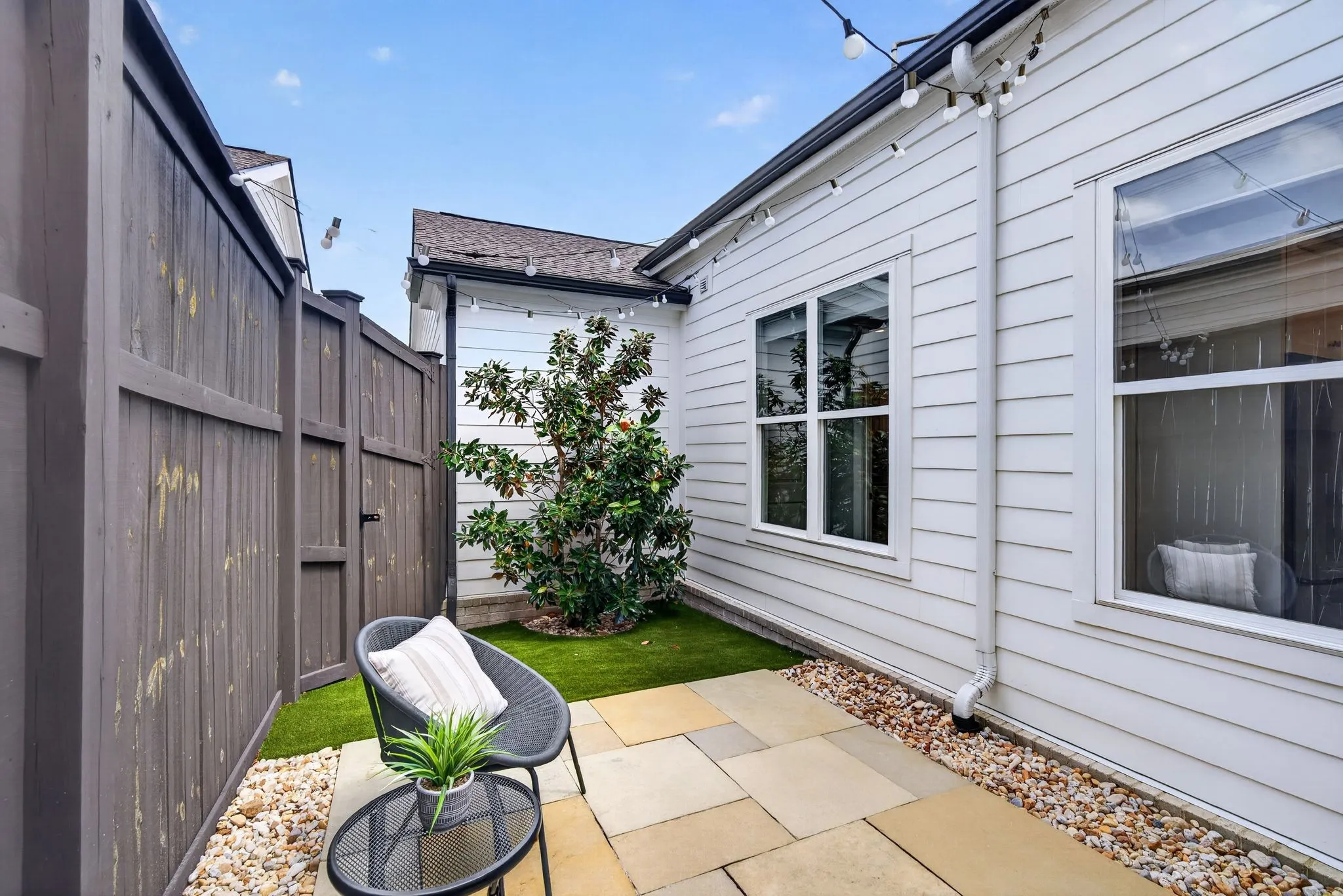 Step outside to a private, peaceful patio where low-maintenance turf and a vibrant magnolia create a quiet retreat that feels intentionally designed and surprisingly serene.