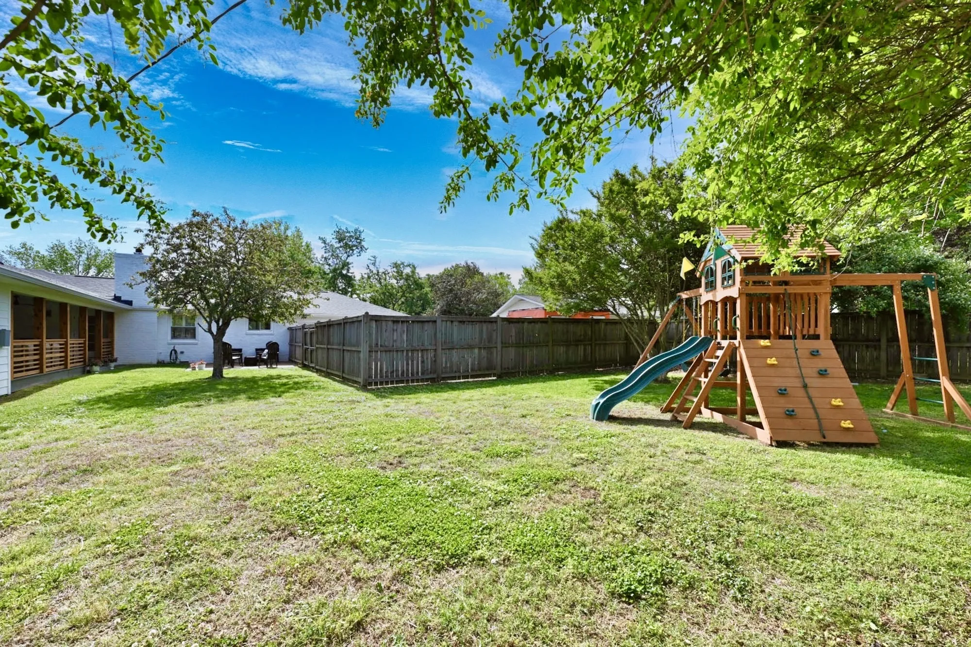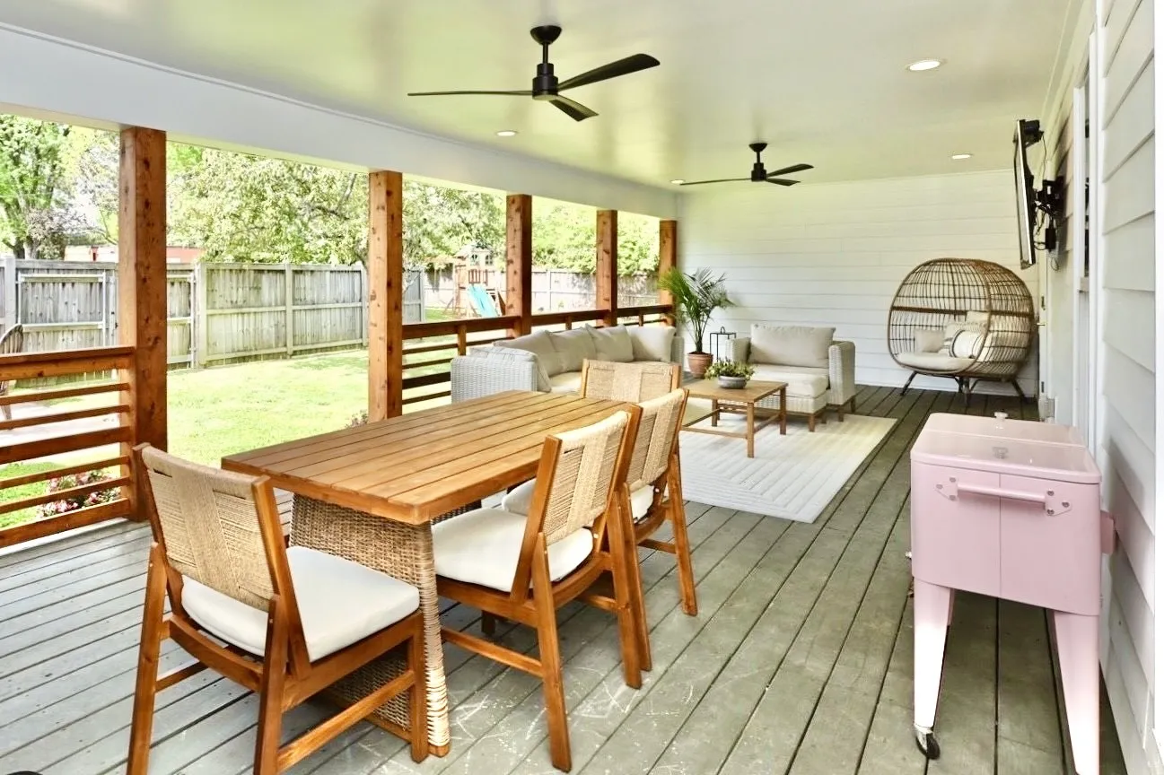 The crown jewel is the 455-sqft covered back porch w/ cedar columns & railings, an outdoor living room overlooking a private, fully fenced oasis. Backing up to a lush tree line with no neighbors behind, the yard includes a secondary concrete patio w/ a fire pit.