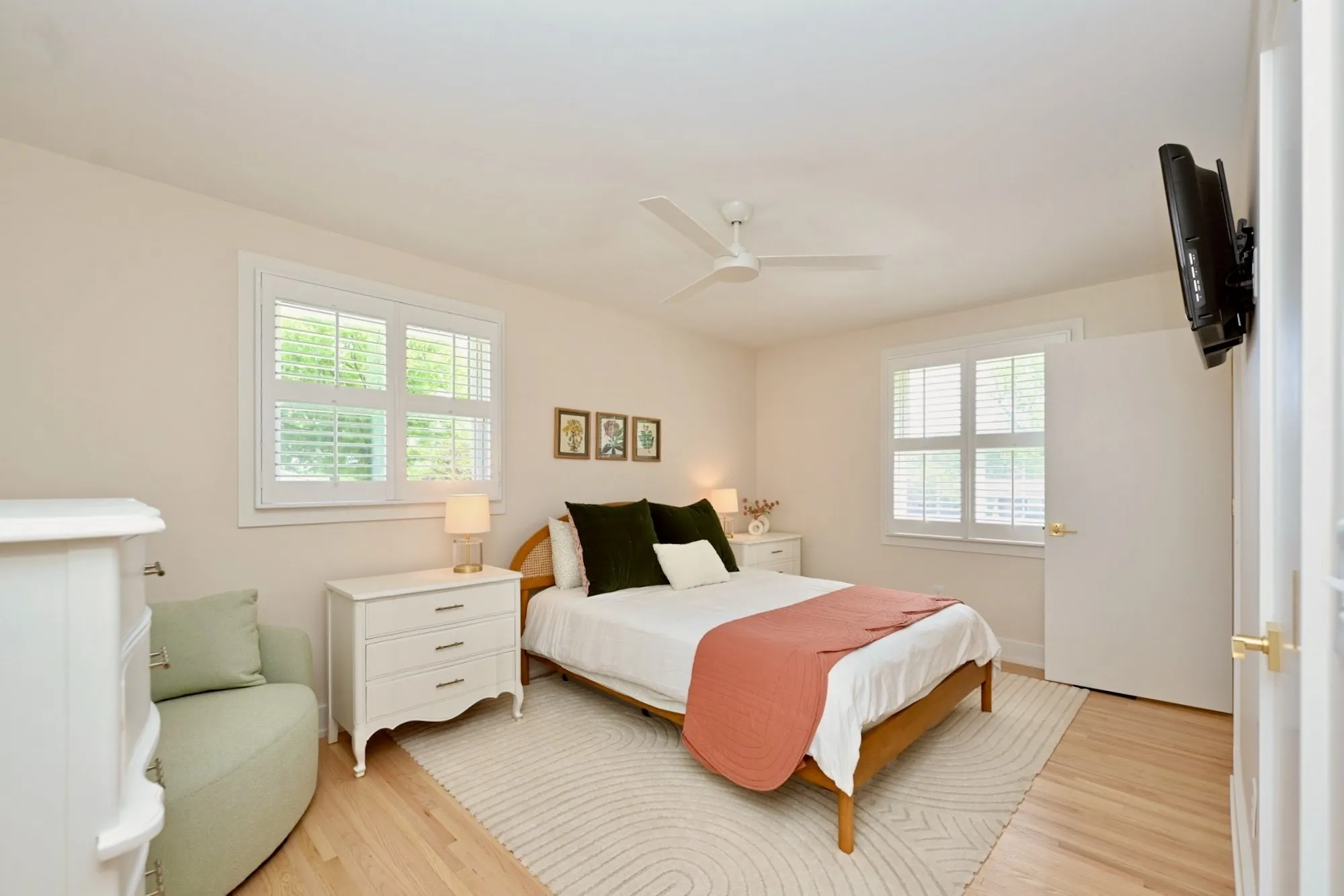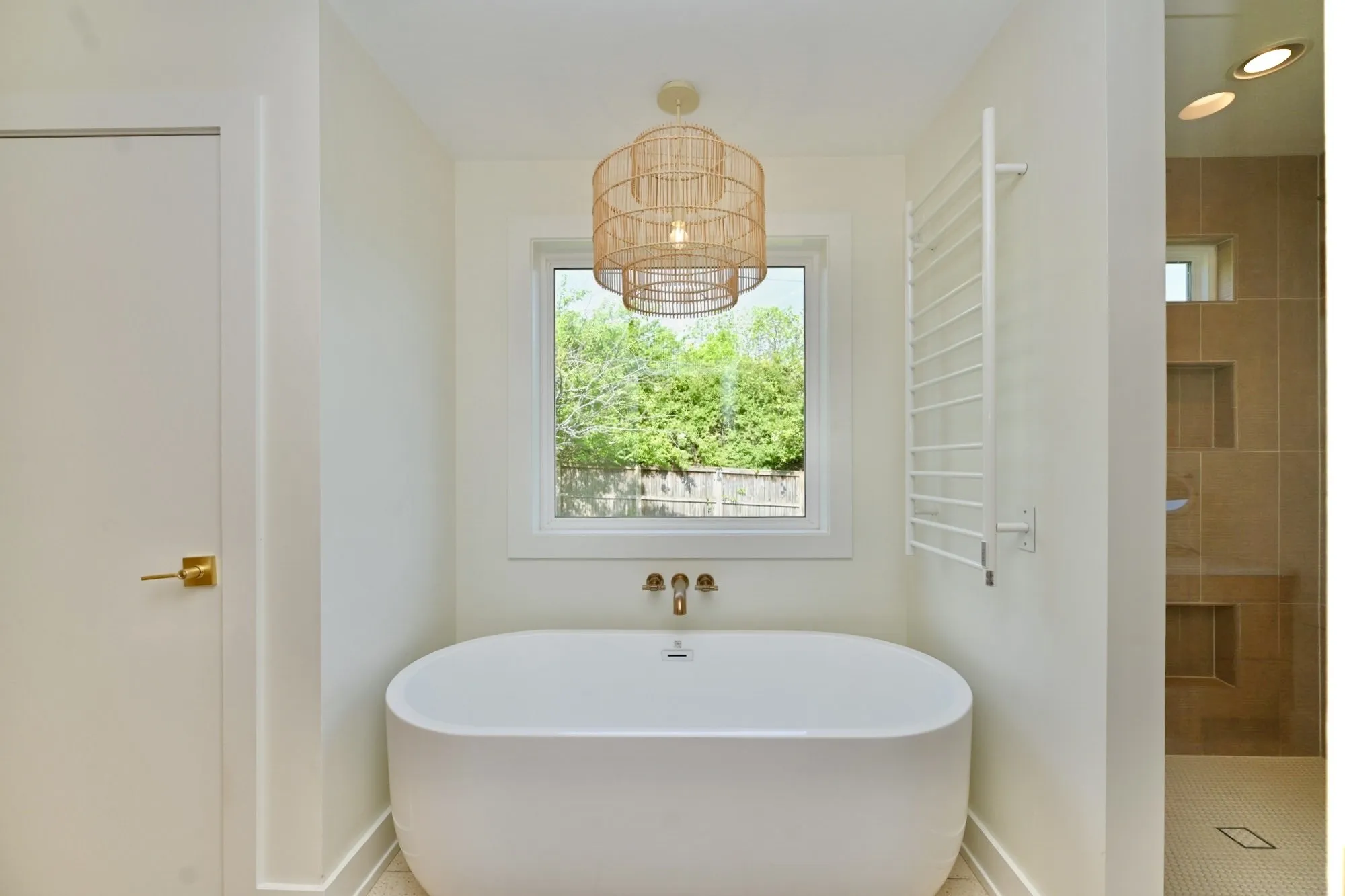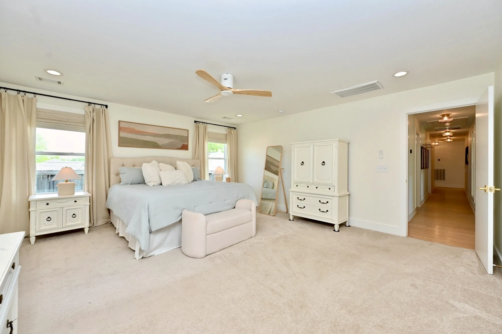 The oversized primary suite is a true escape w/ private French door access to the porch. The spa-inspired bathroom rivals a five-star hotel, boasting a freestanding soaking tub, a frameless glass shower w/ dual rain heads, a heated towel rack, & quintessential MCM Terrazzo tile flooring. The massive walk-in closet features a custom organization system. Guest baths are equally impressive w/ stacked artisan tile and floating vanities.