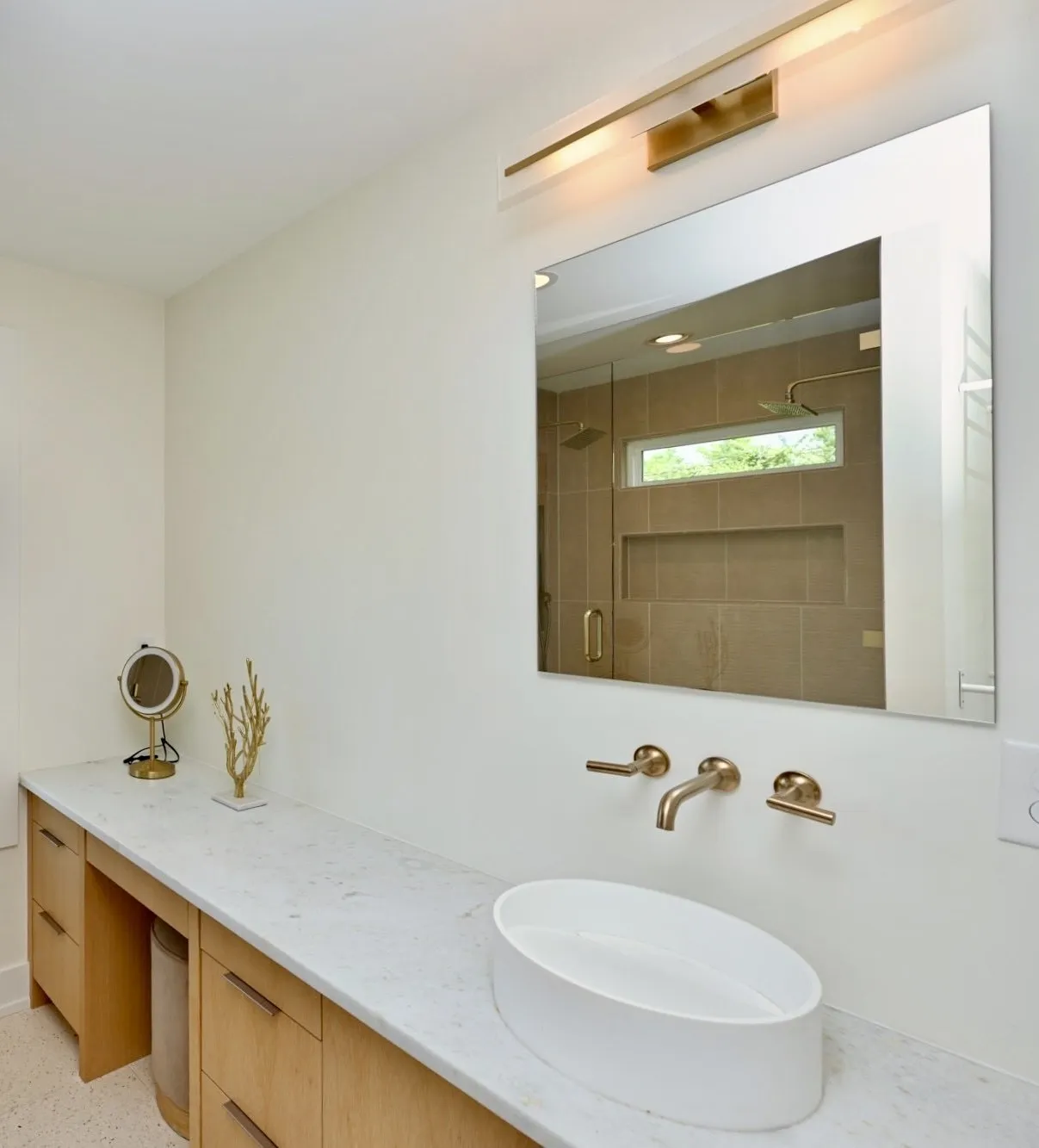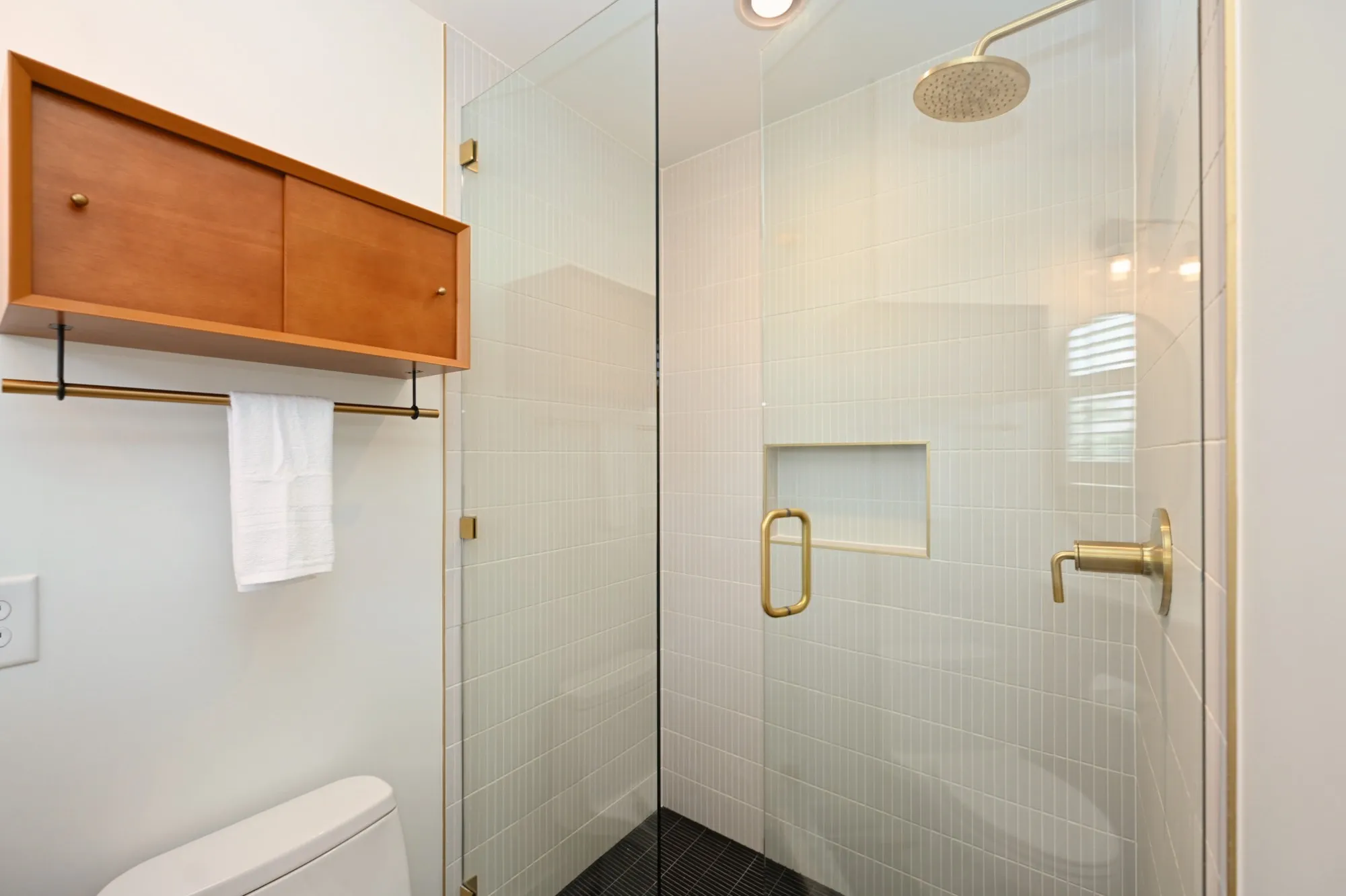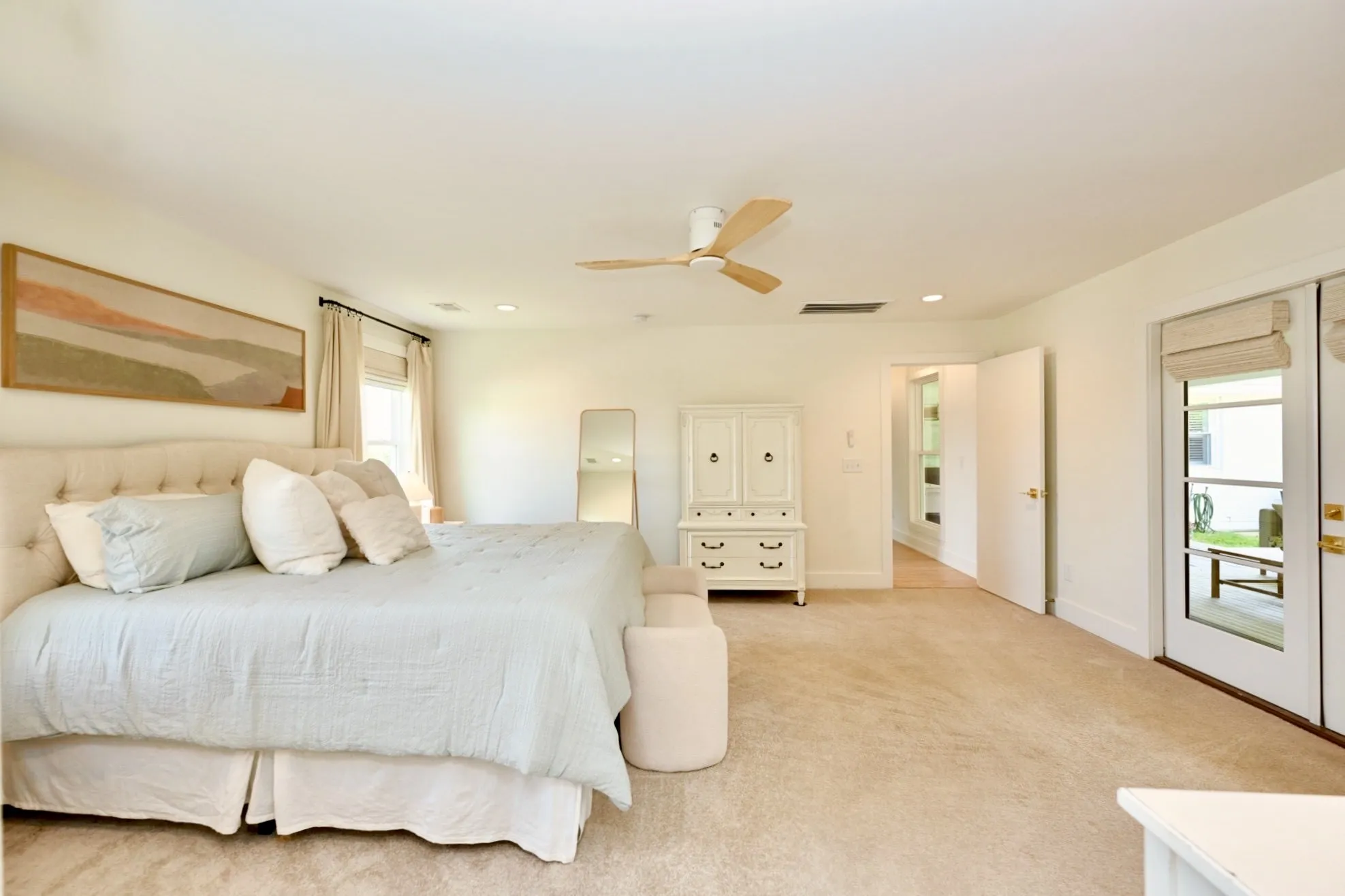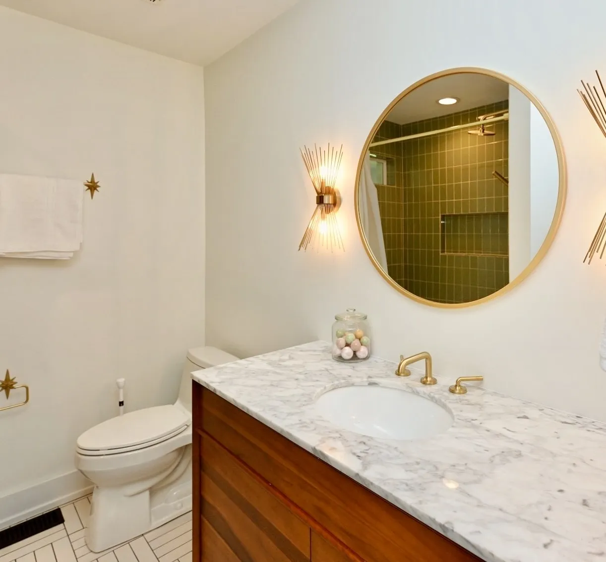 The oversized primary suite is a true escape w/ private French door access to the porch. The spa-inspired bathroom rivals a five-star hotel, boasting a freestanding soaking tub, a frameless glass shower w/ dual rain heads, a heated towel rack, & quintessential MCM Terrazzo tile flooring. The massive walk-in closet features a custom organization system. Guest baths are equally impressive w/ stacked artisan tile and floating vanities.