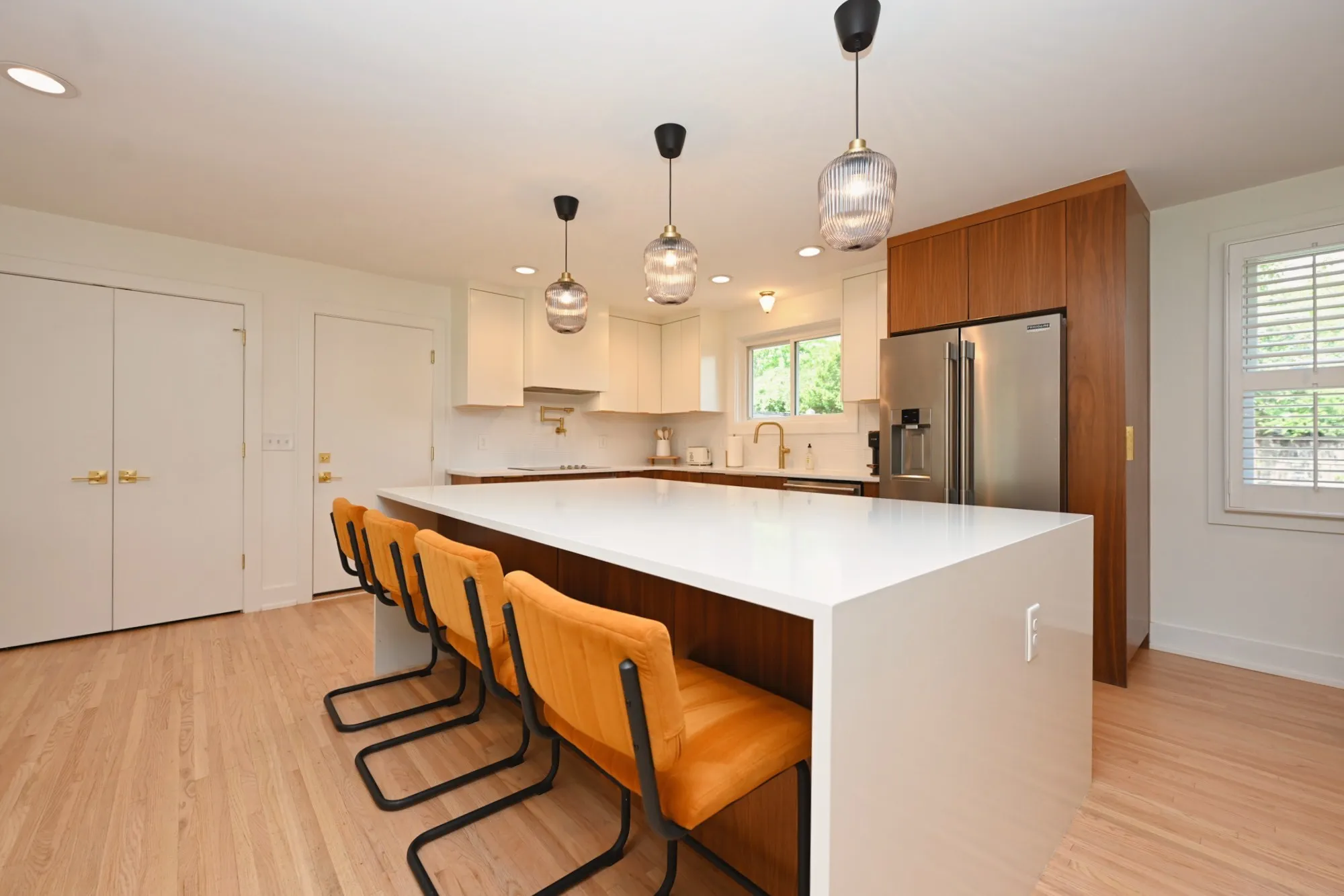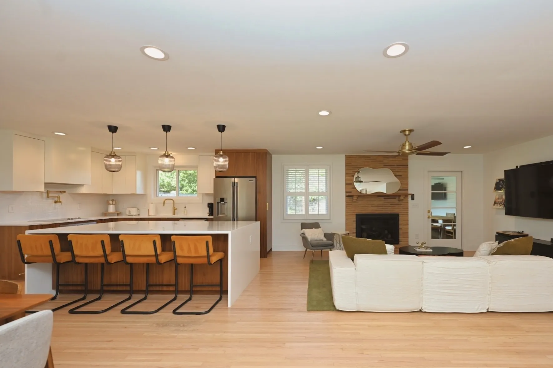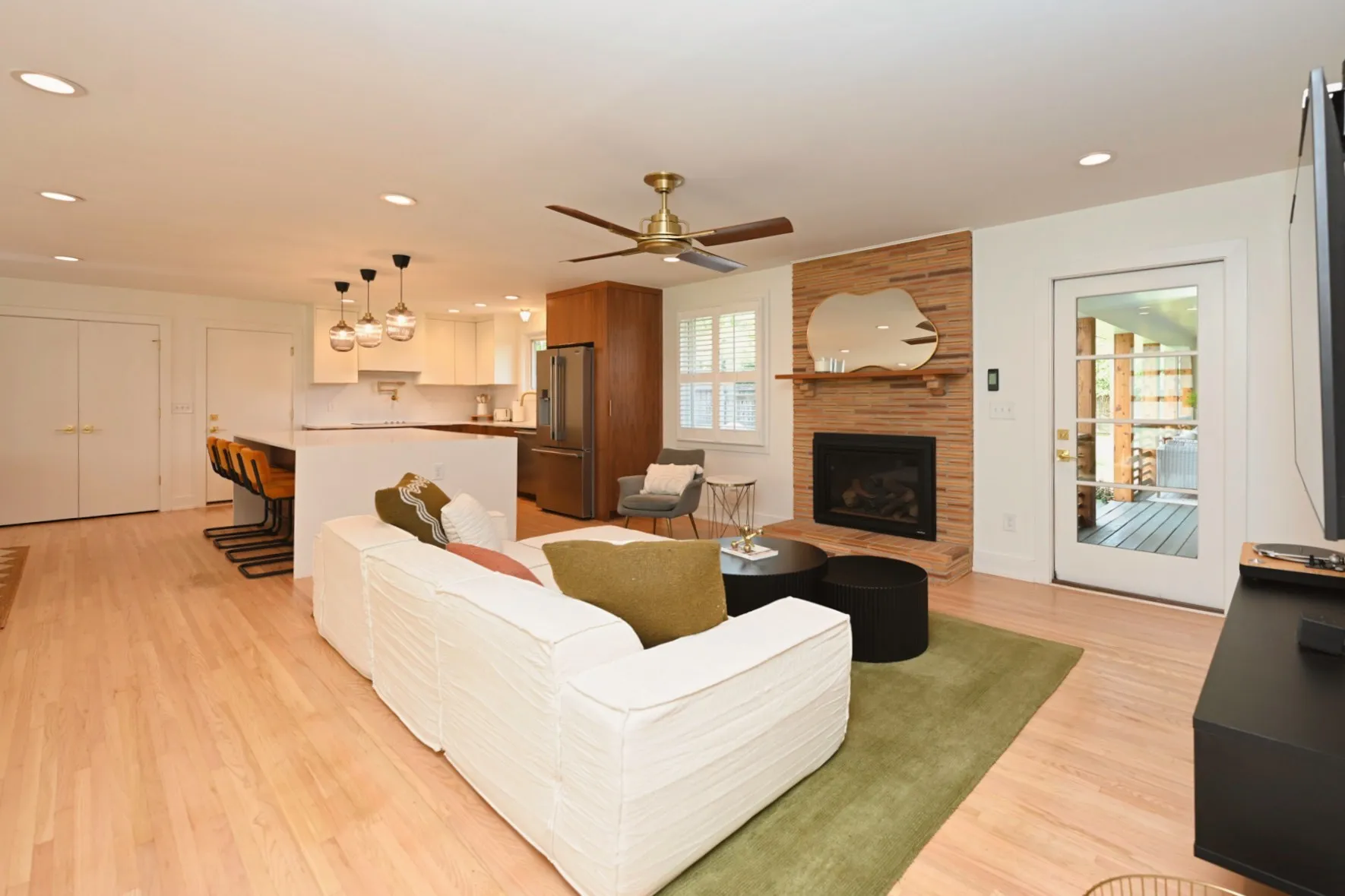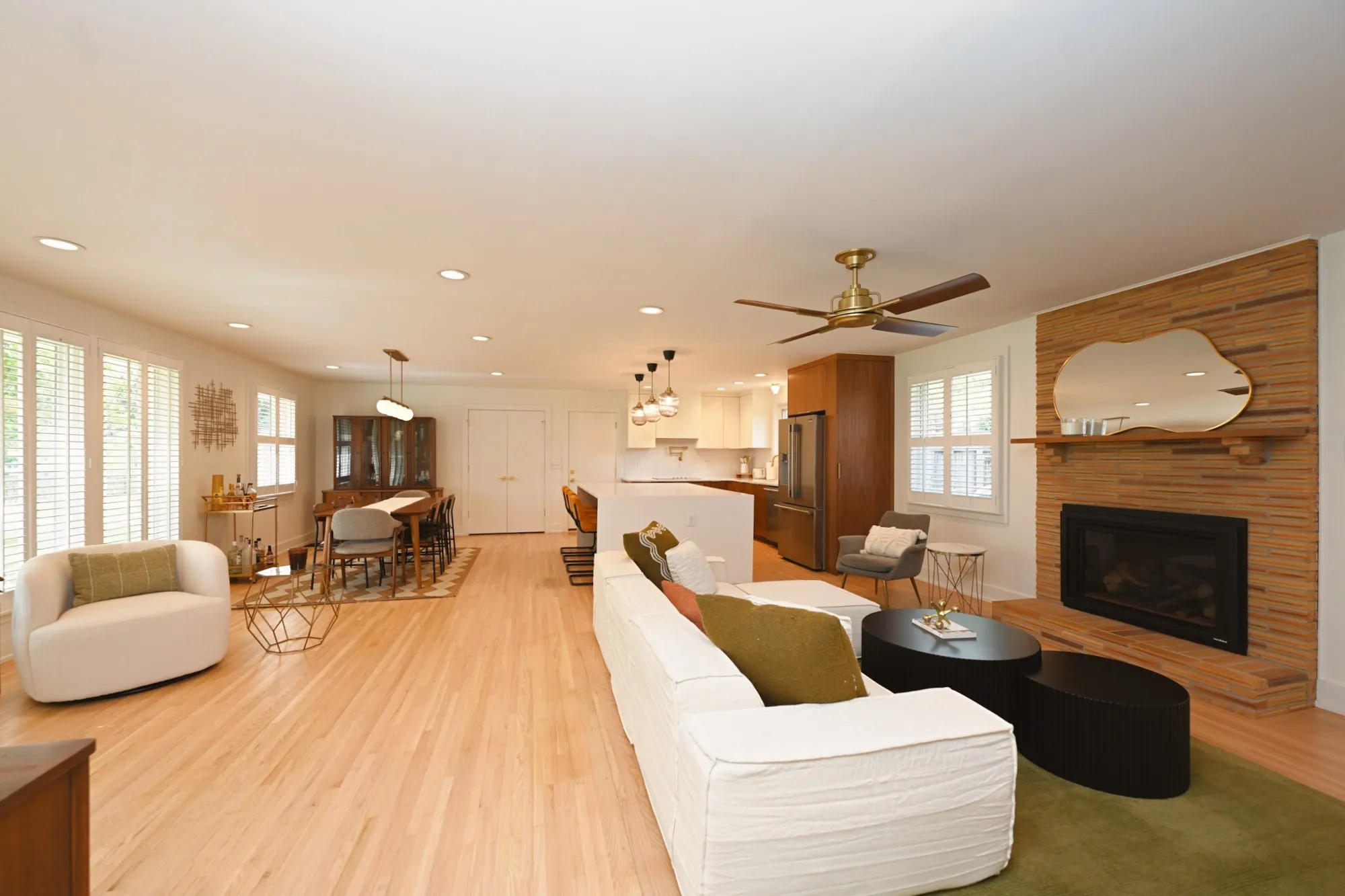 Step through the 4-lite door into a light-filled open-concept sanctuary. Stunning white oak flooring flows throughout, leading you to a show-stopping Roman brick fireplace. The chef’s kitchen is a masterpiece featuring custom, European style vertical-grain walnut lowers, sleek white uppers, & a massive waterfall island w/ a built-in microwave drawer & dual-beverage fridge/ wine cooler. Professional-grade Frigidaire appliances, pot filler, sleek hood, & designer-inspired lighting complete this culinary hub.
