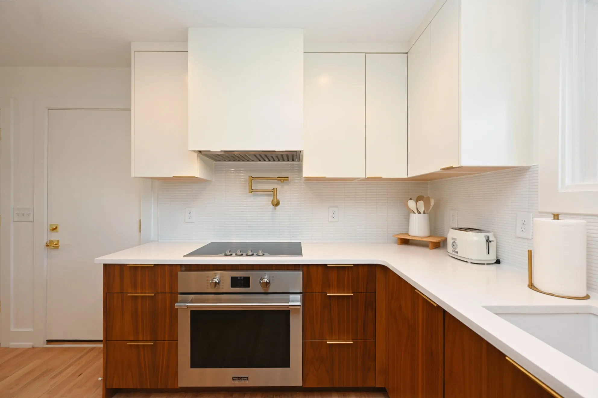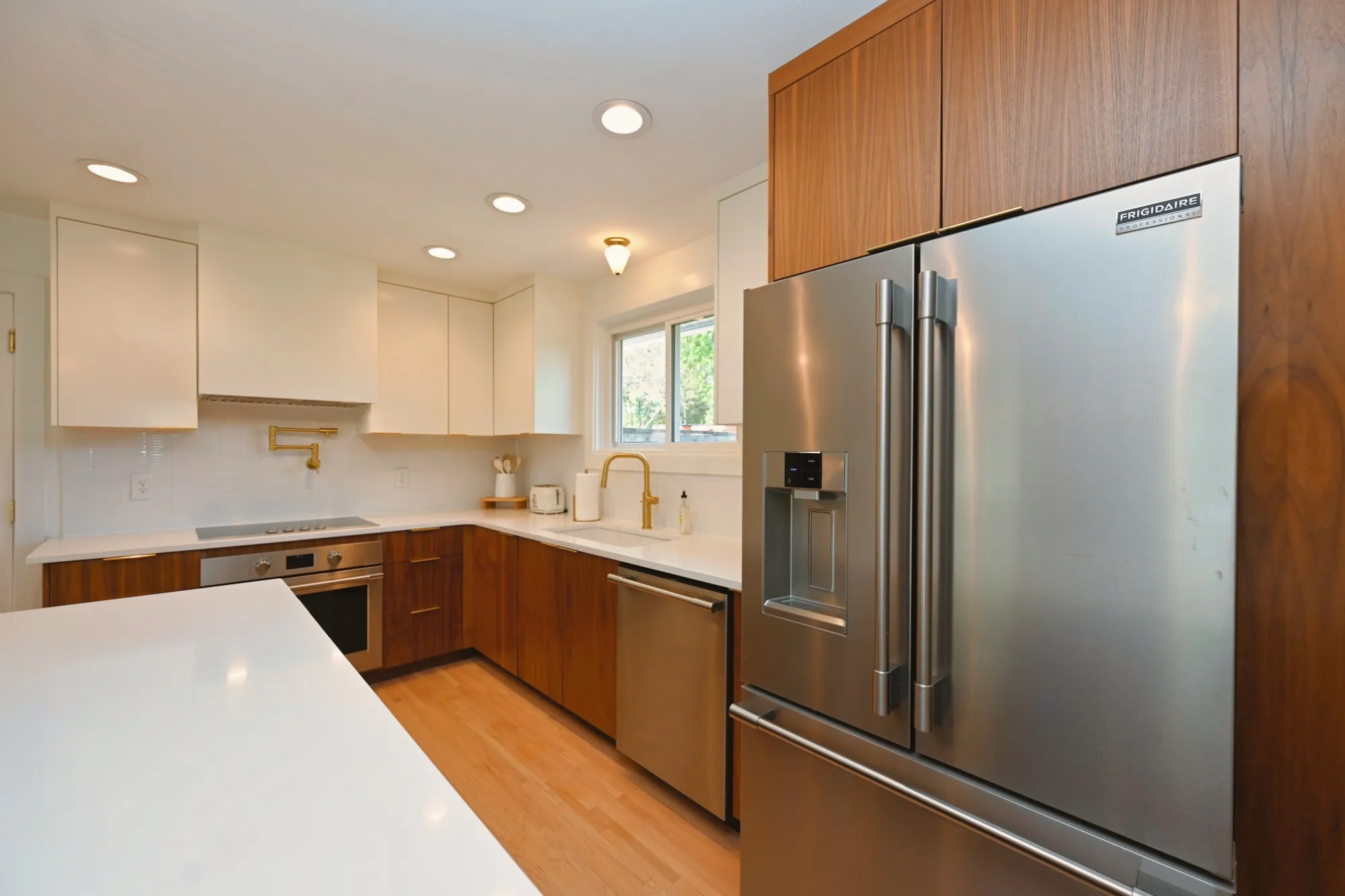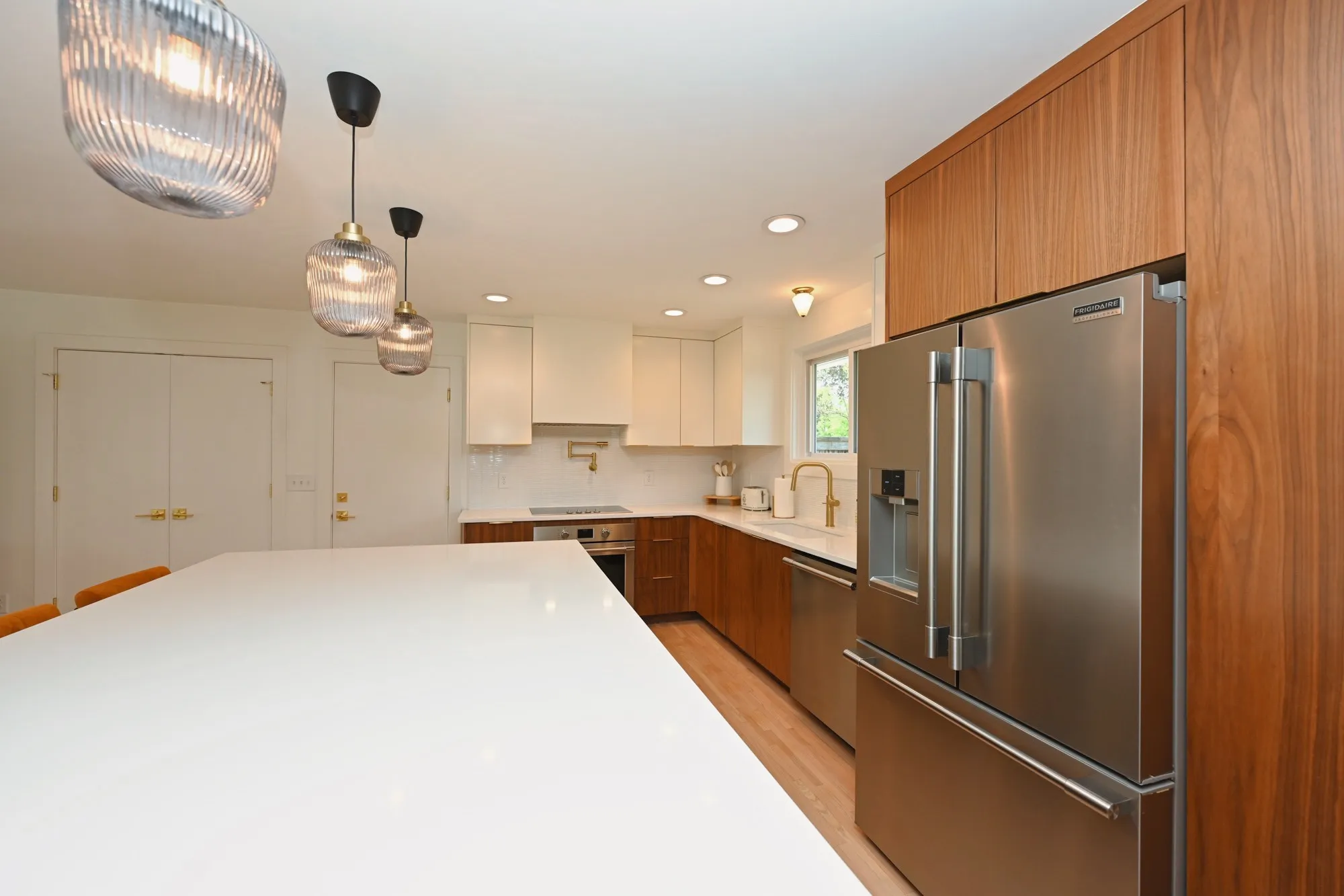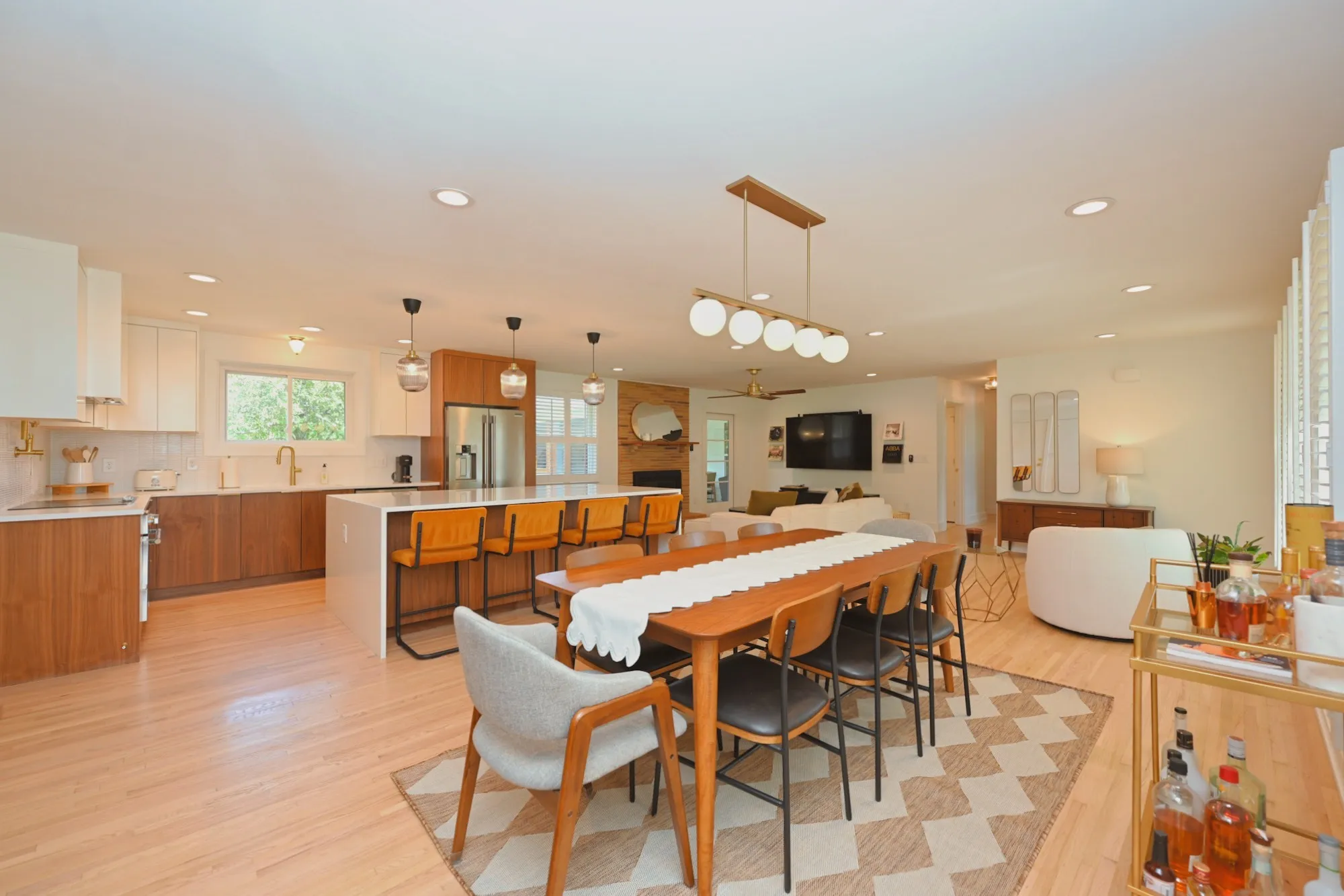 Step through the 4-lite door into a light-filled open-concept sanctuary. Stunning white oak flooring flows throughout, leading you to a show-stopping Roman brick fireplace. The chef’s kitchen is a masterpiece featuring custom, European style vertical-grain walnut lowers, sleek white uppers, & a massive waterfall island w/ a built-in microwave drawer & dual-beverage fridge/ wine cooler. Professional-grade Frigidaire appliances, pot filler, sleek hood, & designer-inspired lighting complete this culinary hub.