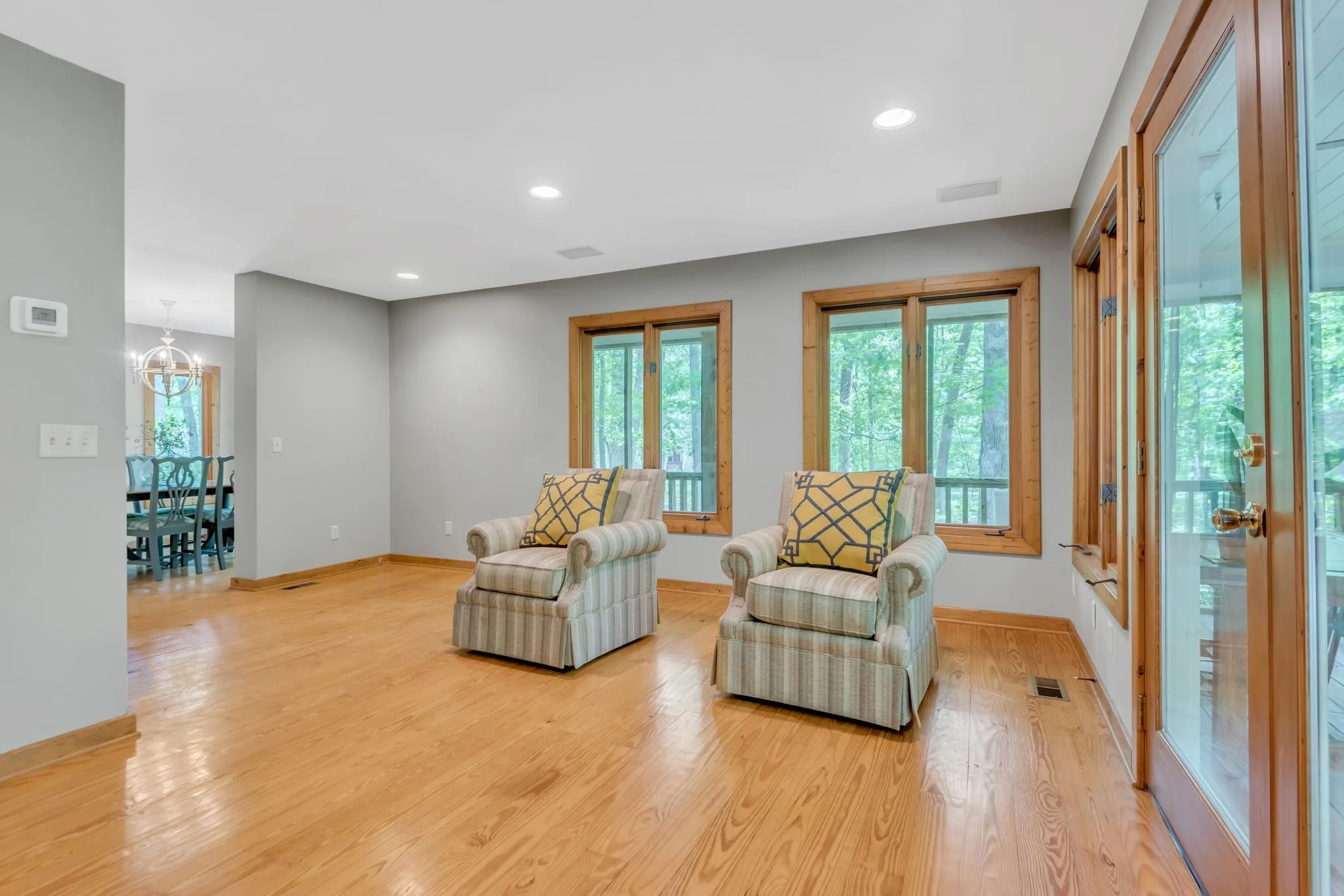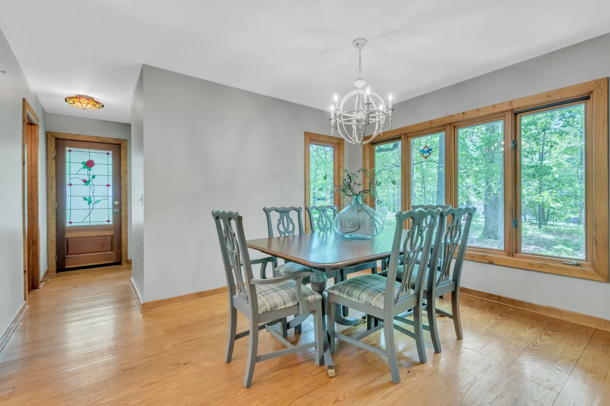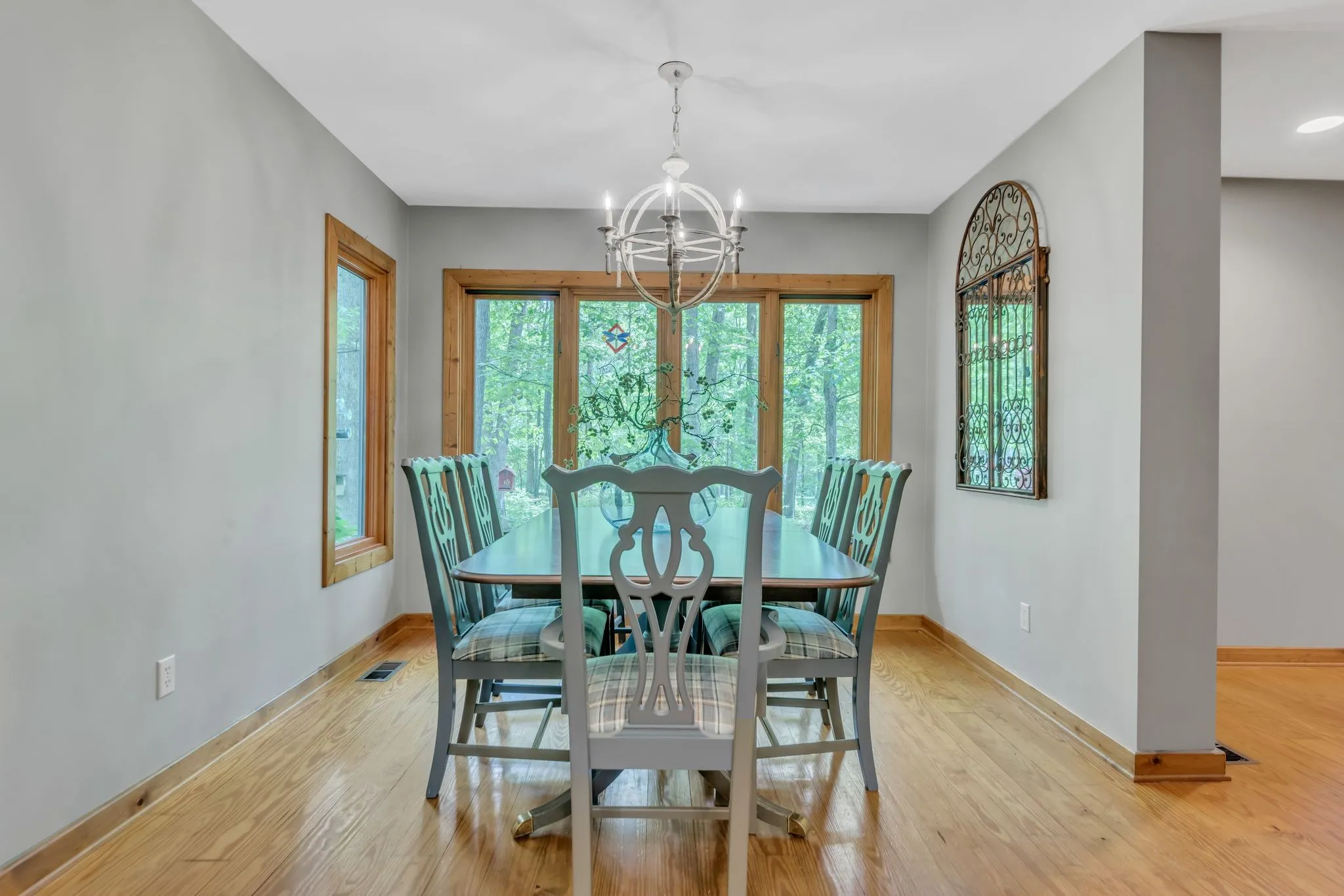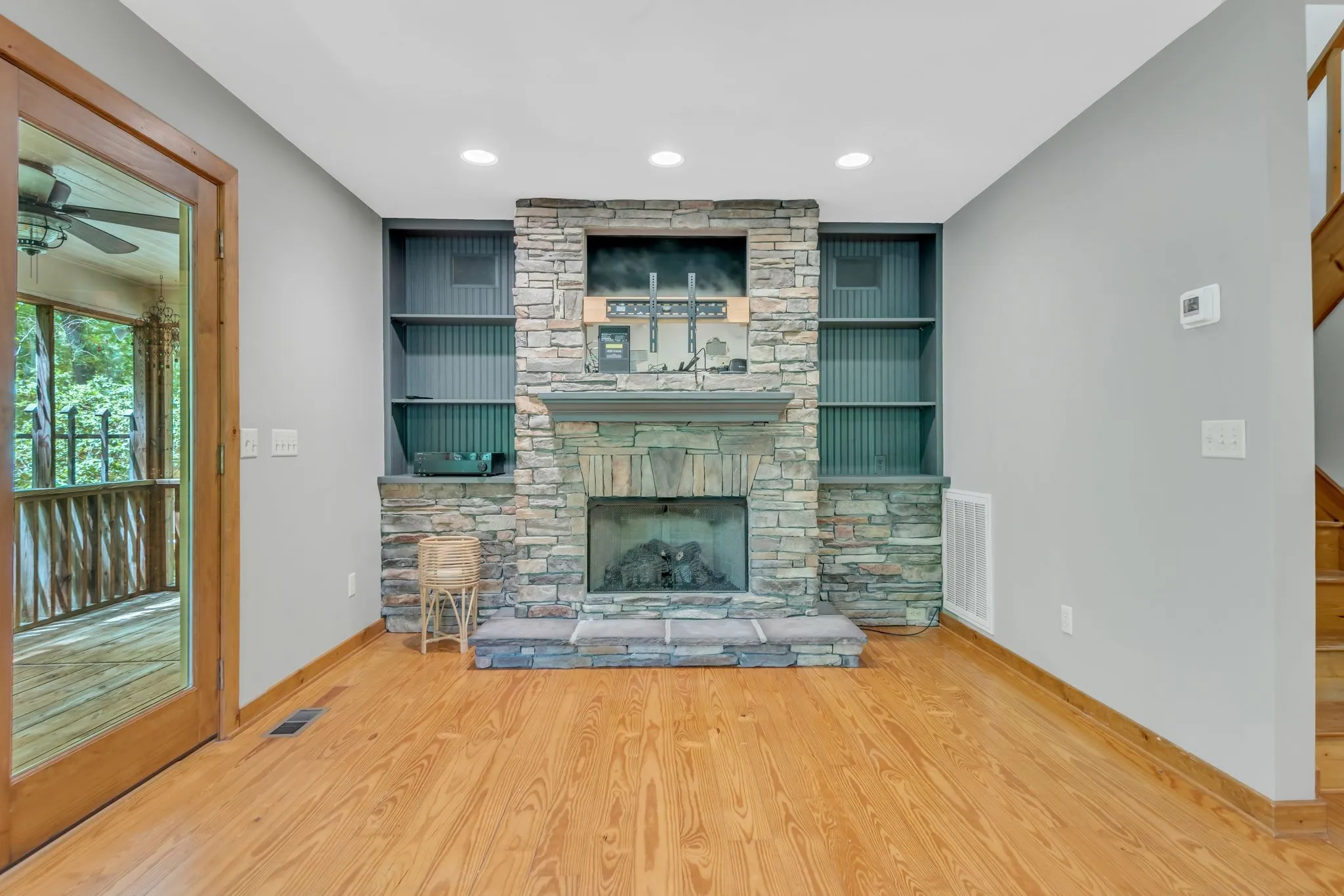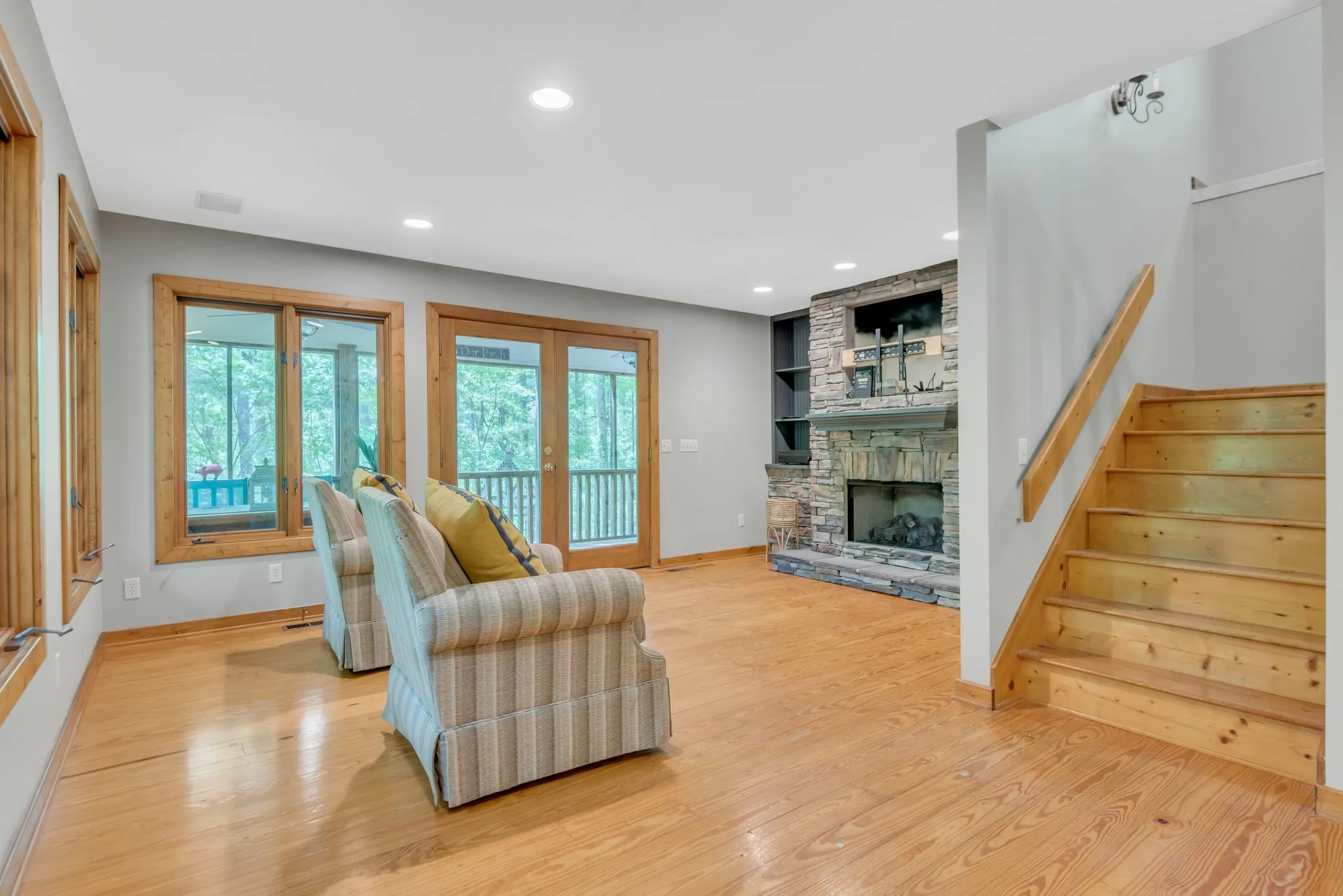 Step inside to warm hardwood floors that flow throughout the living spaces, complemented by abundant large windows that flood the home with natural light. A striking stone fireplace serves as the heart of the living area, ideal for cozy evenings. The updated kitchen features stainless steel appliances and flows seamlessly into the living space, making everyday living effortless and enjoyable.