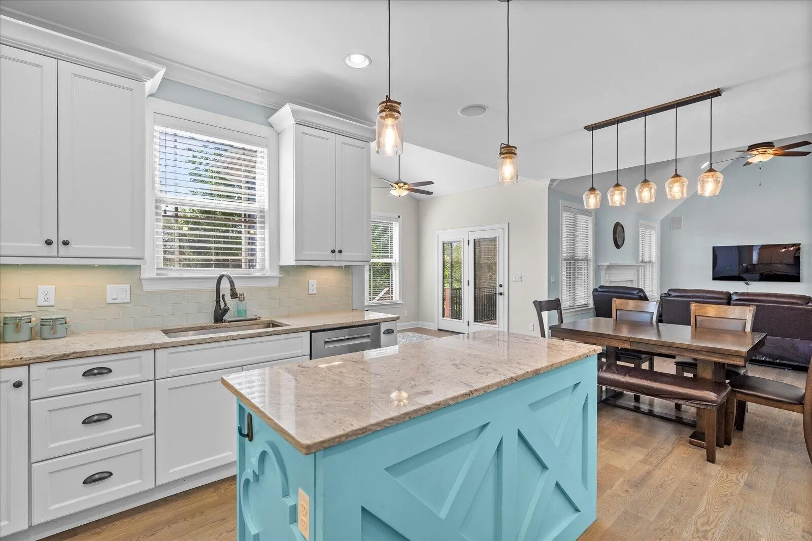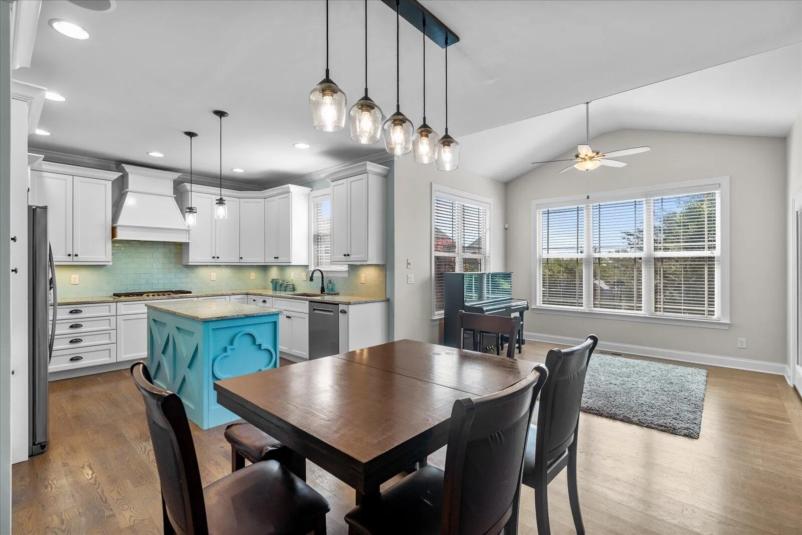 The kitchen is beautifully appointed with granite countertops, stainless appliances (all remain), tile backsplash, a large island, abundant cabinetry, and a bright eat-in area overlooking the backyard. Just off the kitchen, the sunroom with vaulted ceilings and access to the screened-in porch provides valuable additional living space.