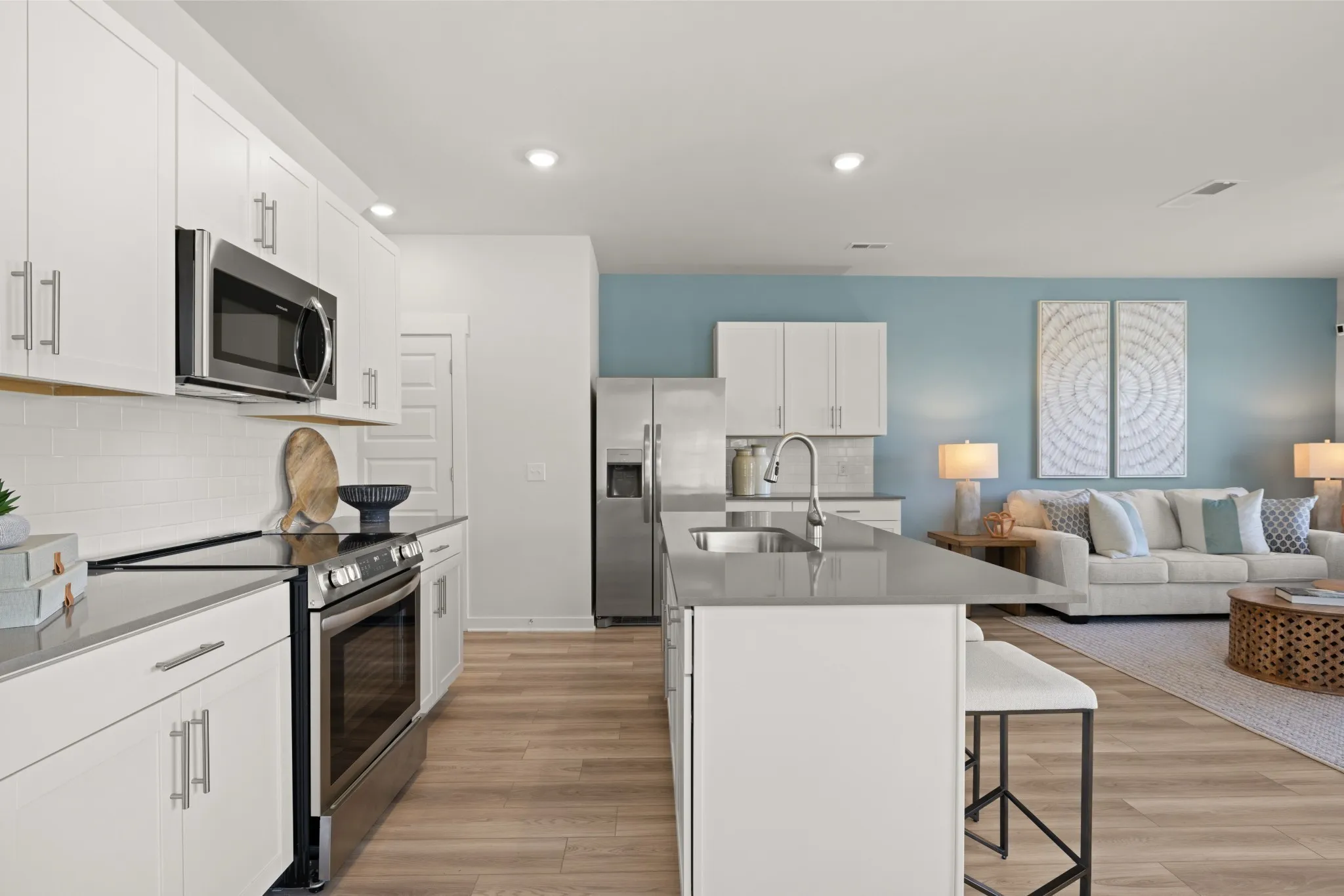 This new two-story townhome design combines comfort and style. The first floor features an open-concept layout connecting a living room for shared moments, a dining room for memorable meals and a kitchen for inspired cooks. Nearby sliding glass doors provide access to a covered patio for outdoor enjoyment. On the second floor, two secondary bedrooms and a spacious owner’s suite with a luxe bathroom and large walk-in closet provide restful retreats for family members and overnight guests. *Images from a furnished model of this home. Actual configuration and features may vary.