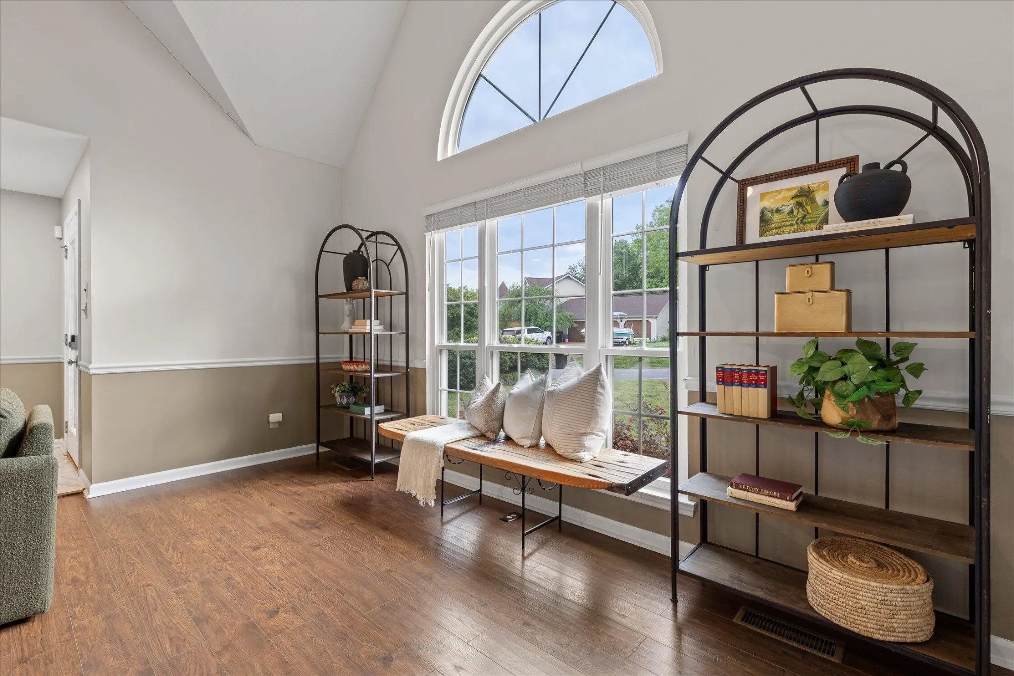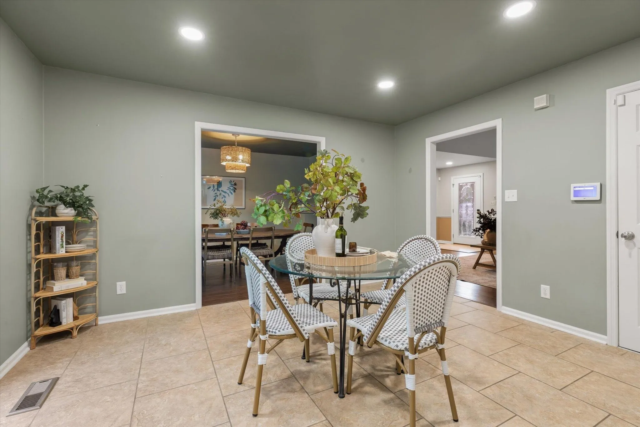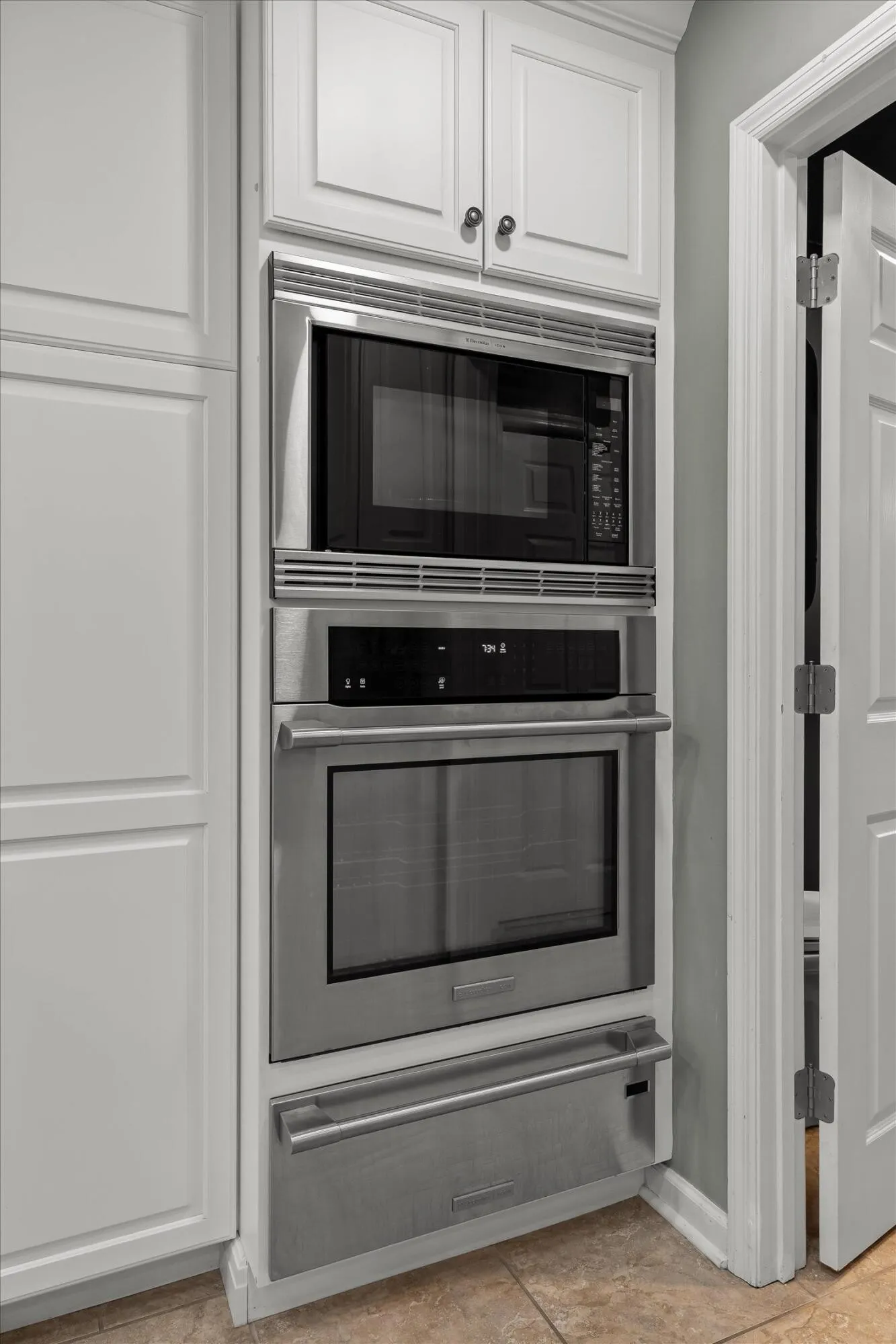 The kitchen is designed to perform, featuring granite countertops, custom cabinetry, porcelain flooring, double convection ovens, and a warming oven. It works well for everyday living and for hosting. Just off the kitchen is a flexible room that can serve as a dining space or home office.