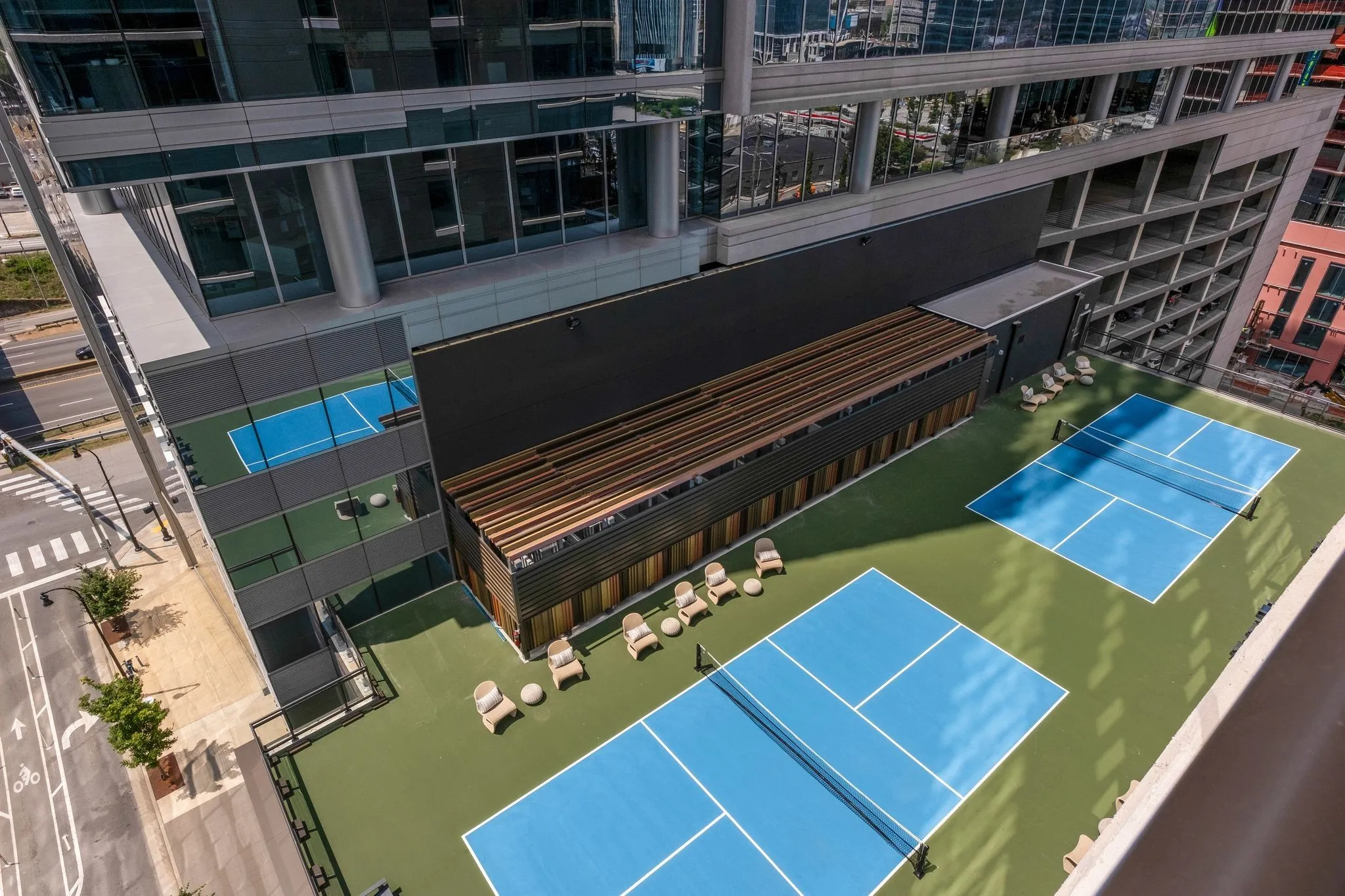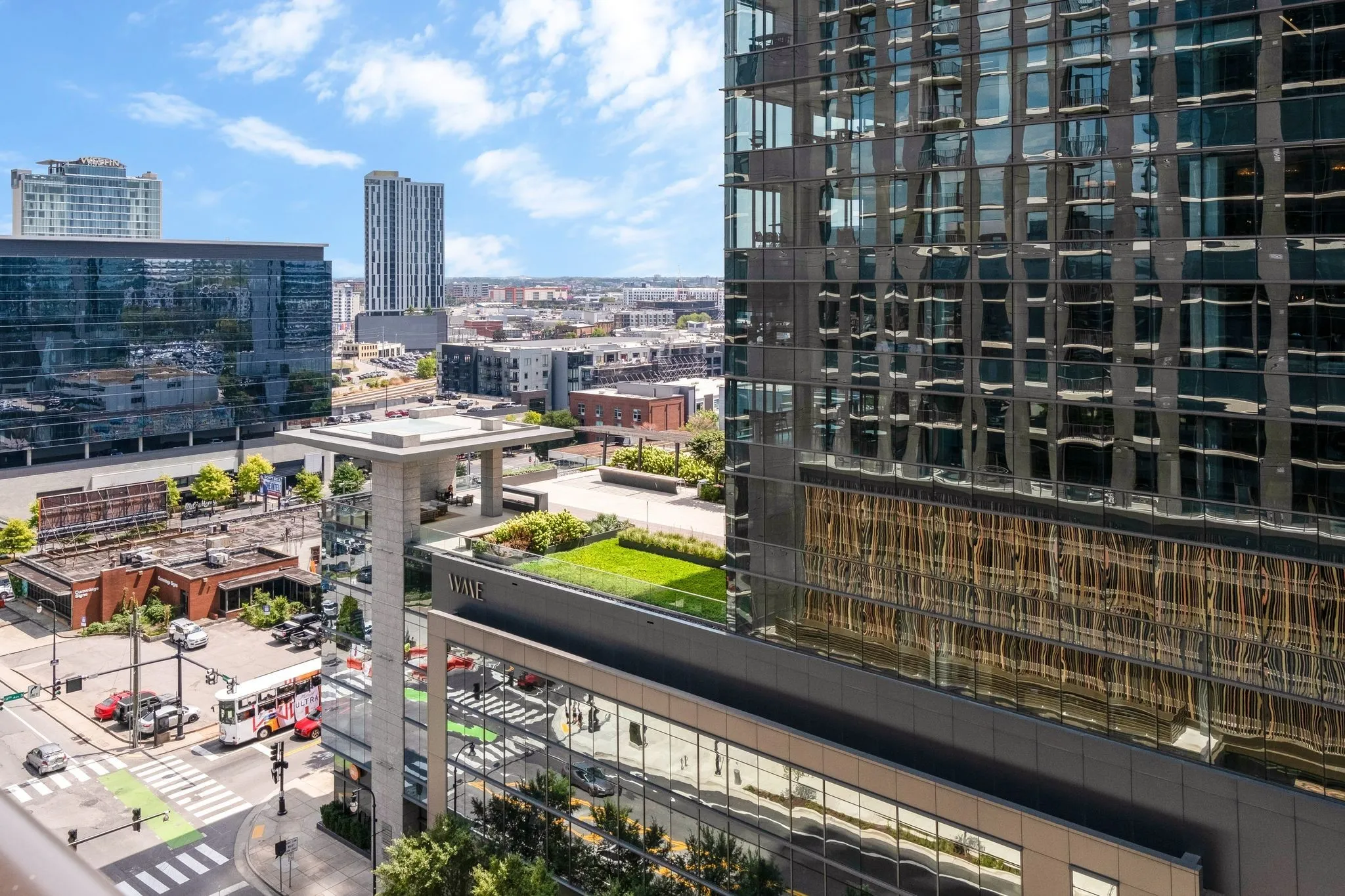 ROOFTOP SWIMMING POOL WITH PANORAMIC VIEWS OF NASHVILLE CITY.