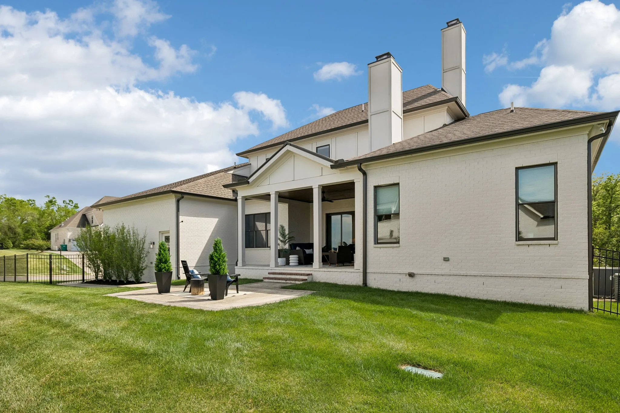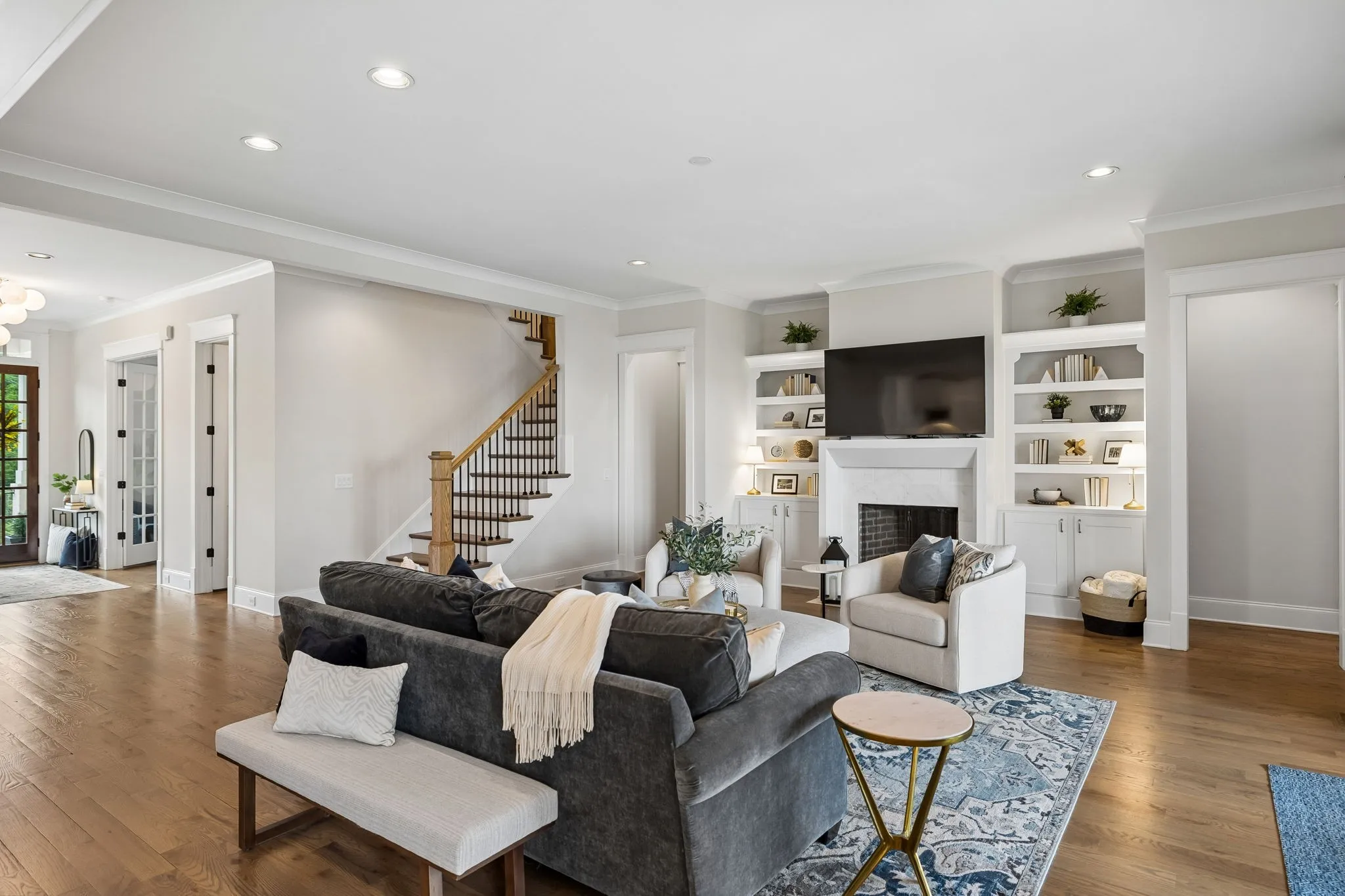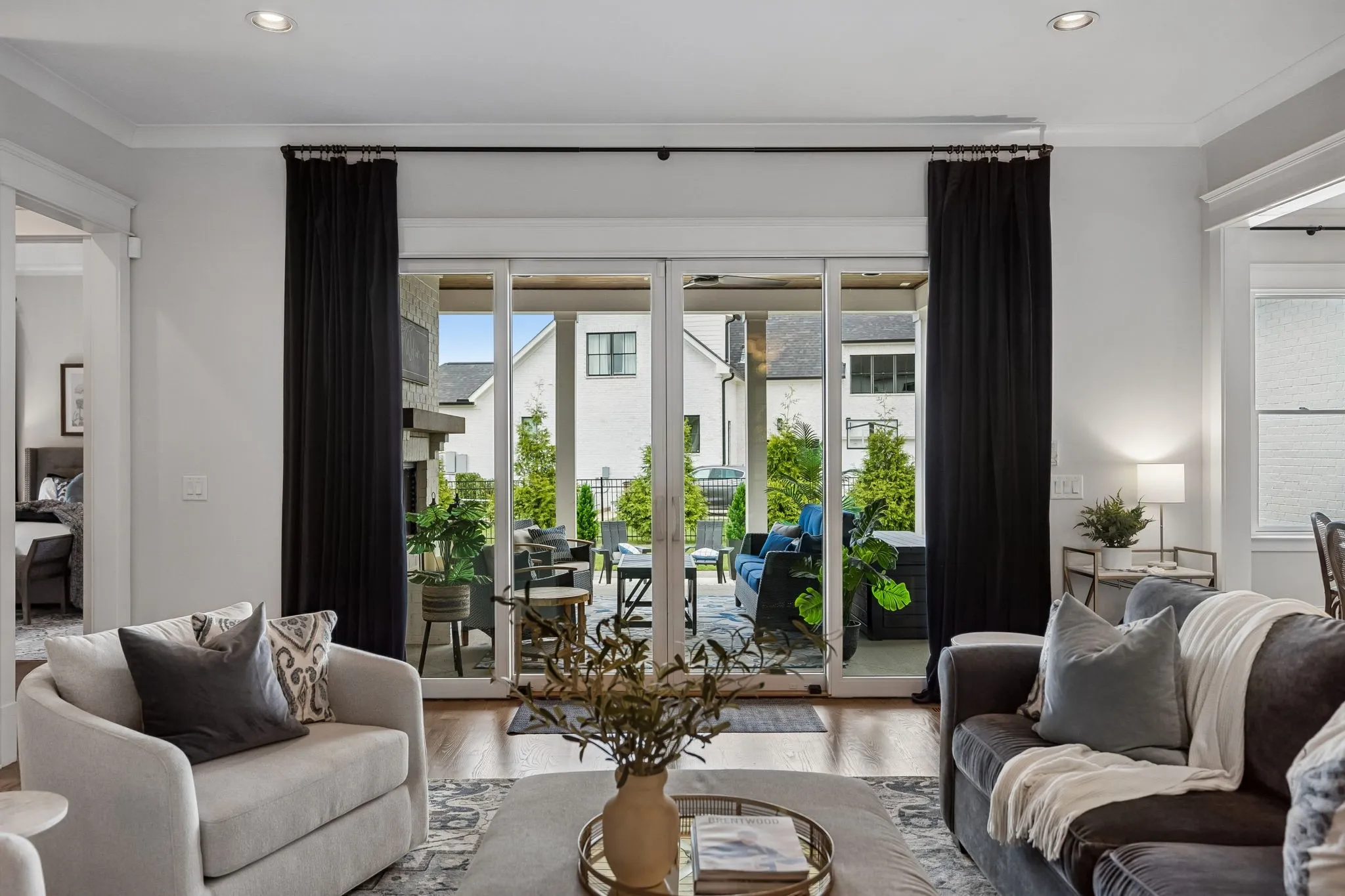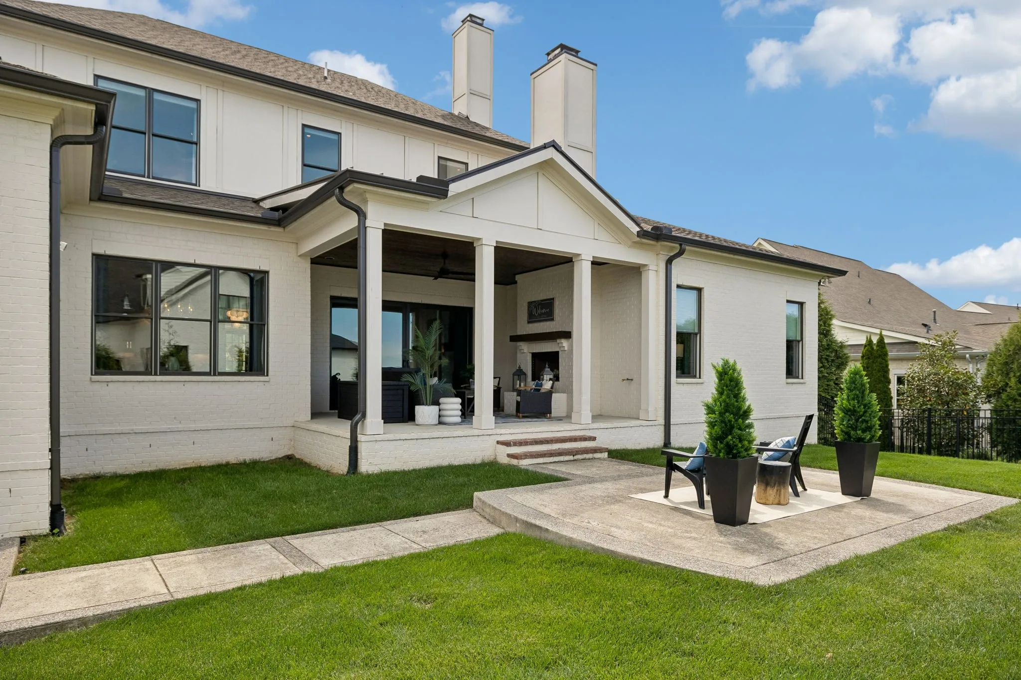 Beautiful 5 bed, 5.5 bath home on a corner lot in the desirable Traditions neighborhood. Built in 2020, this home offers an open, functional layout with great natural light, high ceilings, and hardwoods throughout. Main level includes a dedicated office with glass doors, formal dining, and two bedrooms including the primary suite. Kitchen features white cabinetry, quartz countertops, stainless appliances, a large island, and a walk-in pantry, opening directly to the living area with built-ins and fireplace. Upstairs offers a large bonus room and three additional bedrooms, each with its own en-suite bath. Covered back patio with wood ceiling and fireplace overlooks a fully fenced yard, providing a great space for entertaining or everyday use. Additional features include a 3 car garage, conditioned crawl space, irrigation system, and numerous upgrades throughout. Convenient Brentwood location with easy access to schools, shopping, and dining.