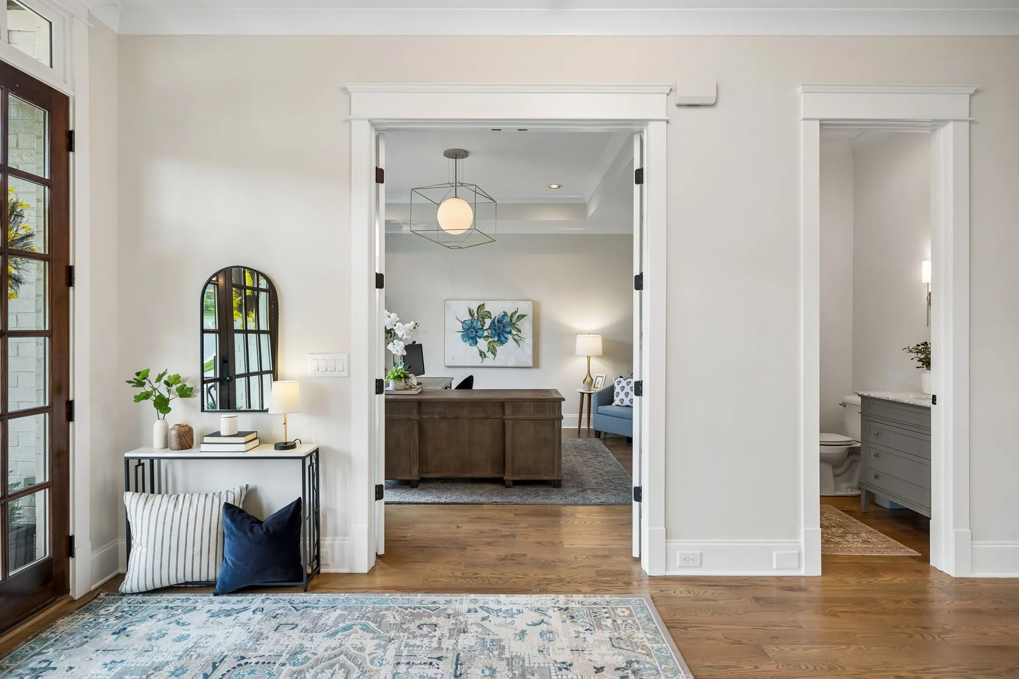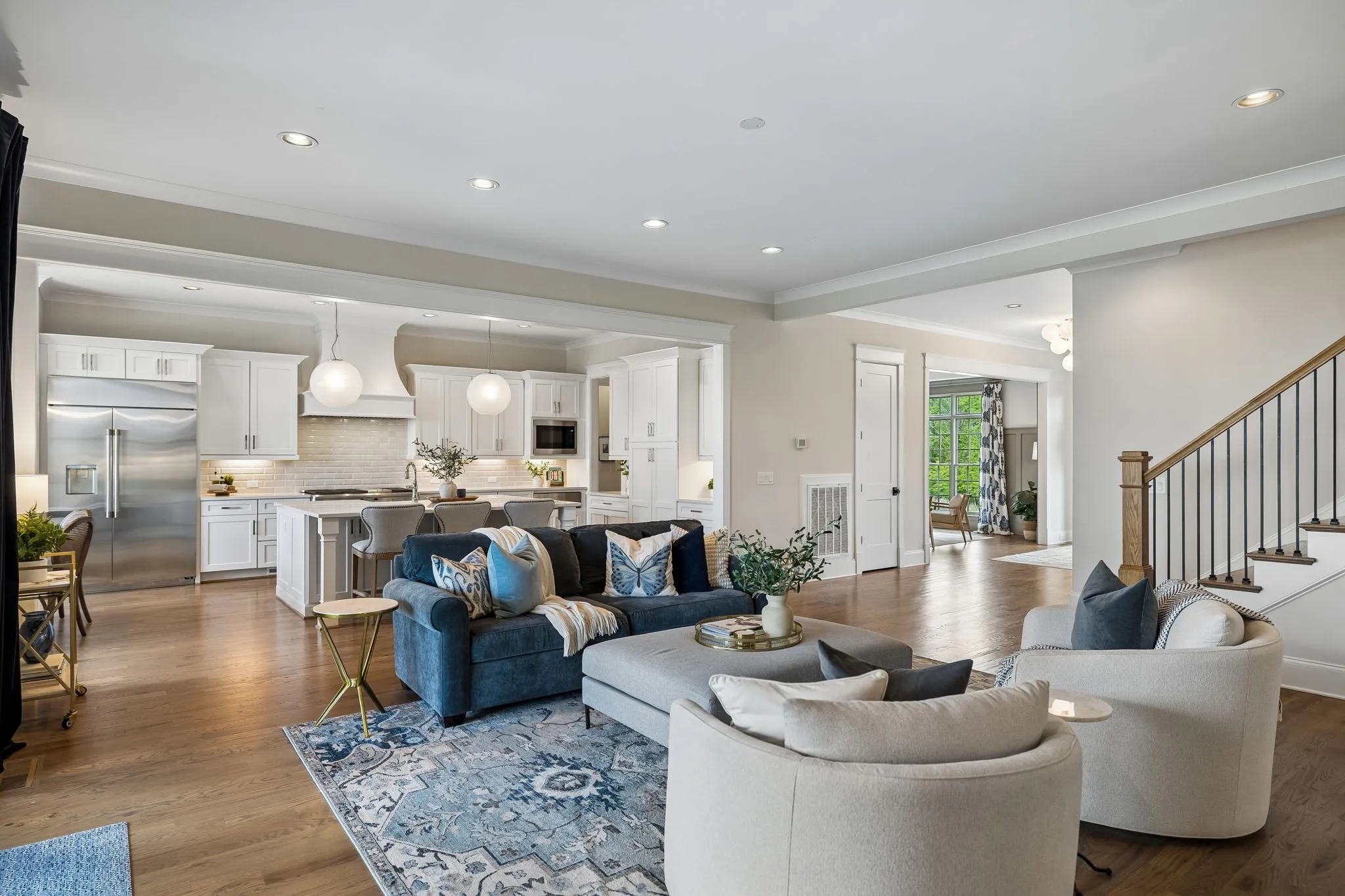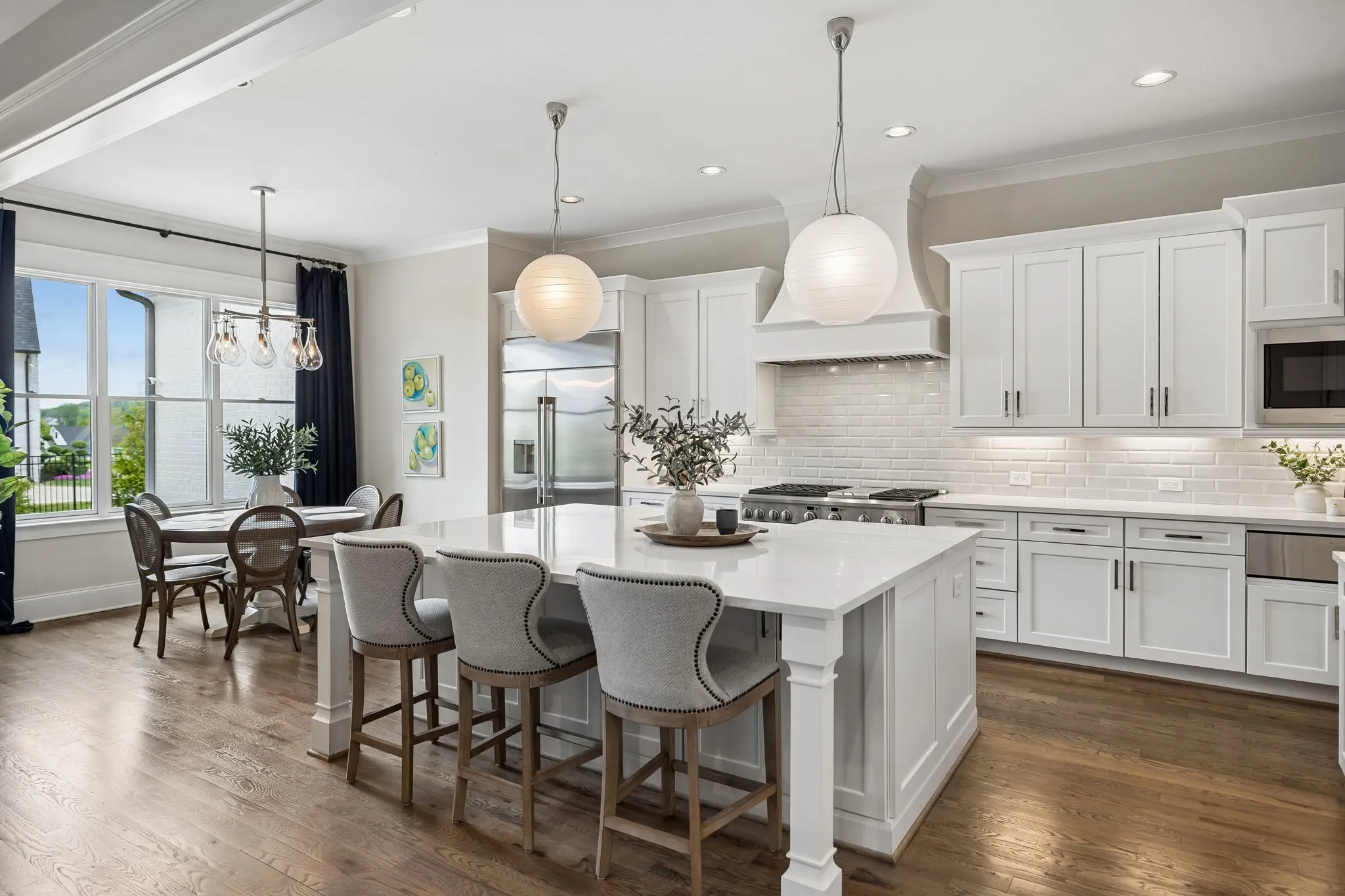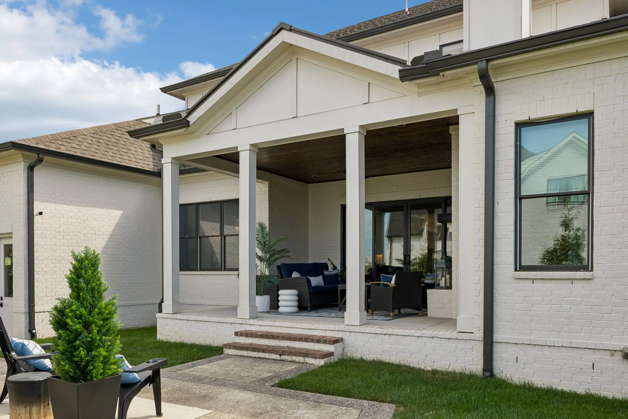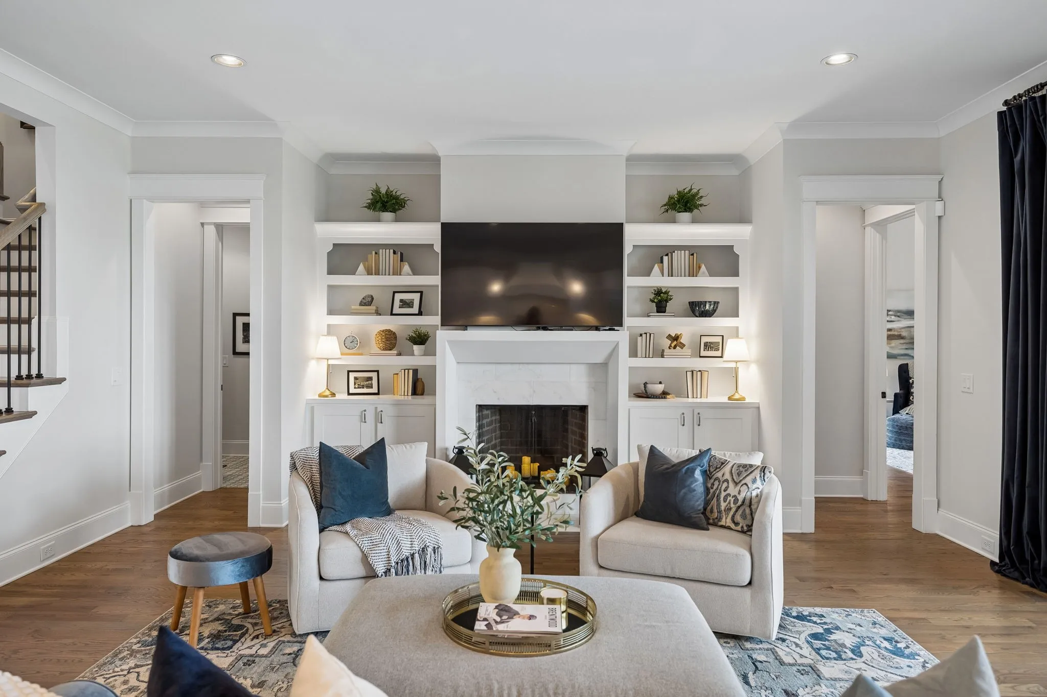 Beautiful 5 bed, 5.5 bath home on a corner lot in the desirable Traditions neighborhood. Built in 2020, this home offers an open, functional layout with great natural light, high ceilings, and hardwoods throughout. Main level includes a dedicated office with glass doors, formal dining, and two bedrooms including the primary suite. Kitchen features white cabinetry, quartz countertops, stainless appliances, a large island, and a walk-in pantry, opening directly to the living area with built-ins and fireplace. Upstairs offers a large bonus room and three additional bedrooms, each with its own en-suite bath. Covered back patio with wood ceiling and fireplace overlooks a fully fenced yard, providing a great space for entertaining or everyday use. Additional features include a 3 car garage, conditioned crawl space, irrigation system, and numerous upgrades throughout. Convenient Brentwood location with easy access to schools, shopping, and dining.