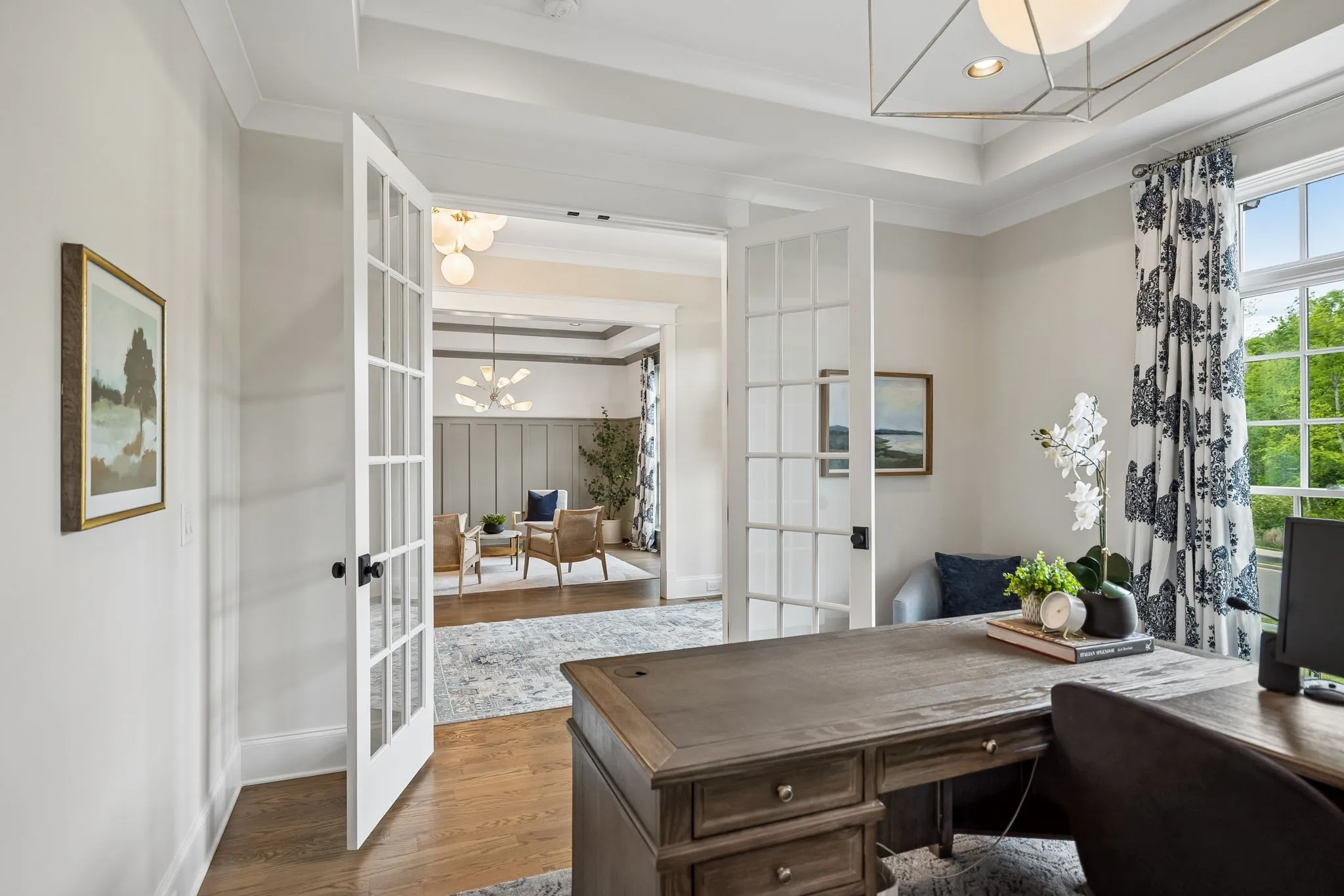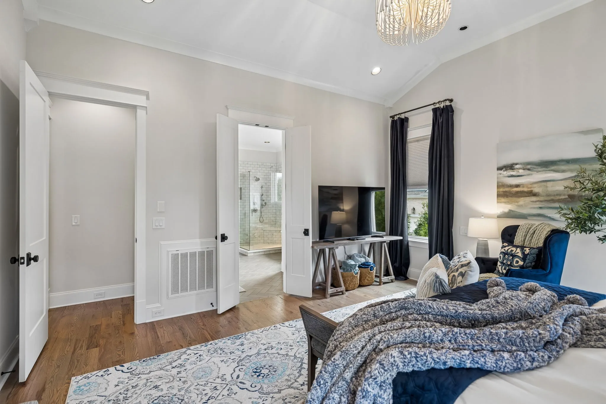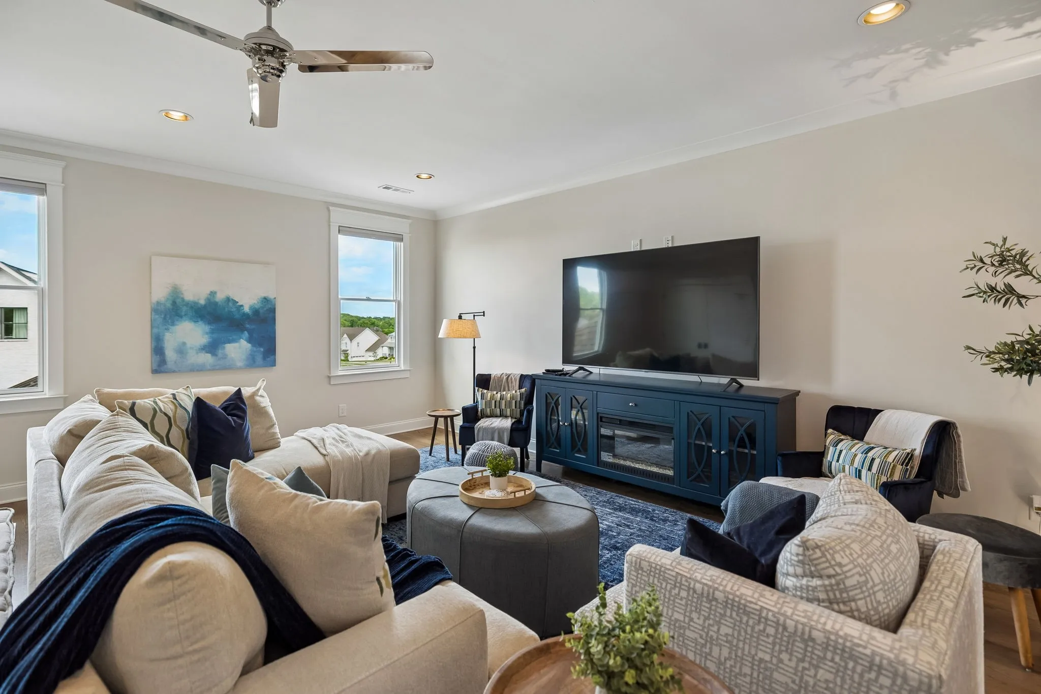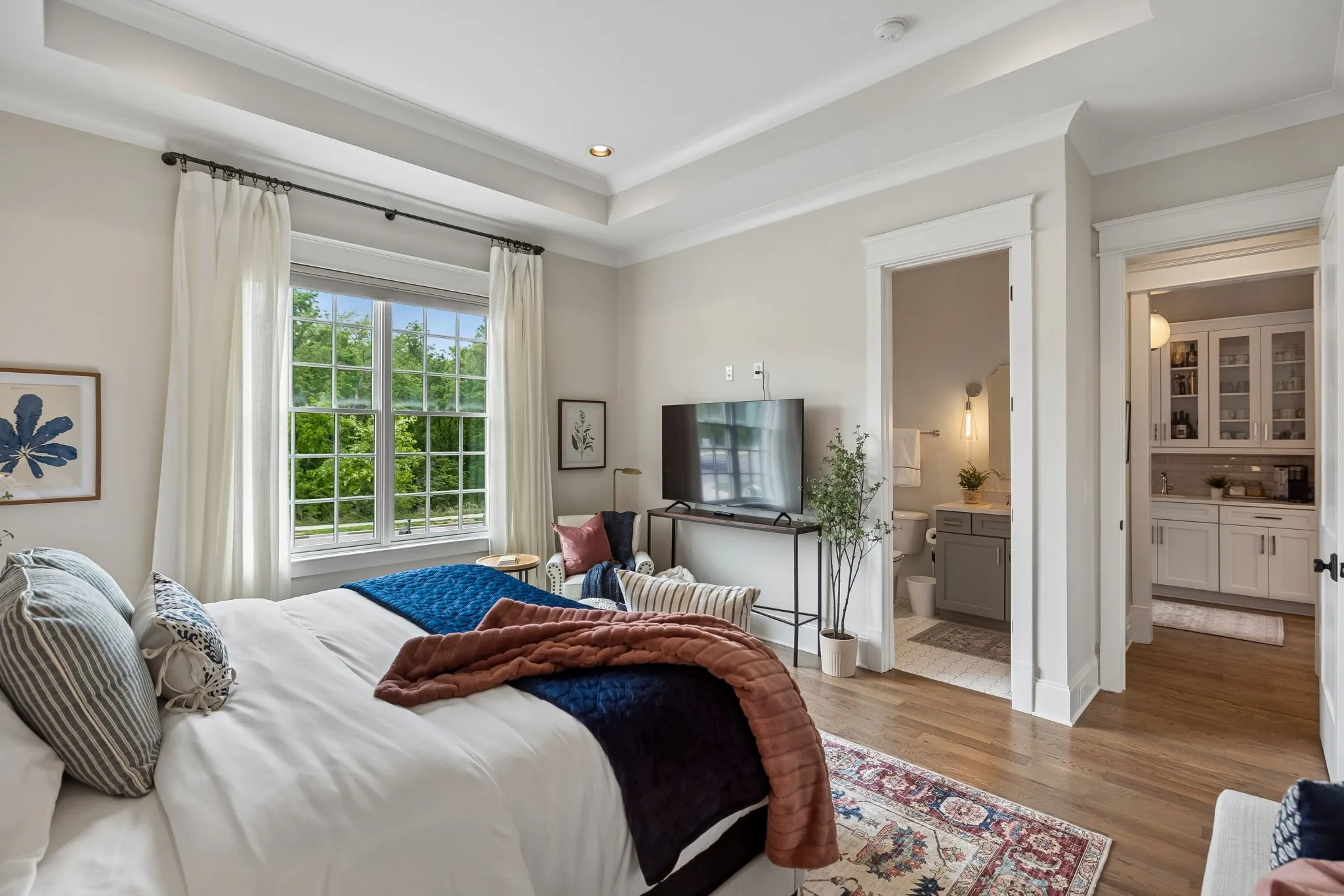 Beautiful 5 bed, 5.5 bath home on a corner lot in the desirable Traditions neighborhood. Built in 2020, this home offers an open, functional layout with great natural light, high ceilings, and hardwoods throughout. Main level includes a dedicated office with glass doors, formal dining, and two bedrooms including the primary suite. Kitchen features white cabinetry, quartz countertops, stainless appliances, a large island, and a walk-in pantry, opening directly to the living area with built-ins and fireplace. Upstairs offers a large bonus room and three additional bedrooms, each with its own en-suite bath. Covered back patio with wood ceiling and fireplace overlooks a fully fenced yard, providing a great space for entertaining or everyday use. Additional features include a 3 car garage, conditioned crawl space, irrigation system, and numerous upgrades throughout. Convenient Brentwood location with easy access to schools, shopping, and dining.
