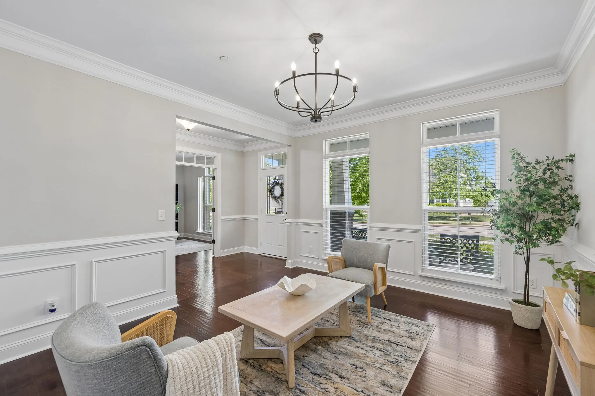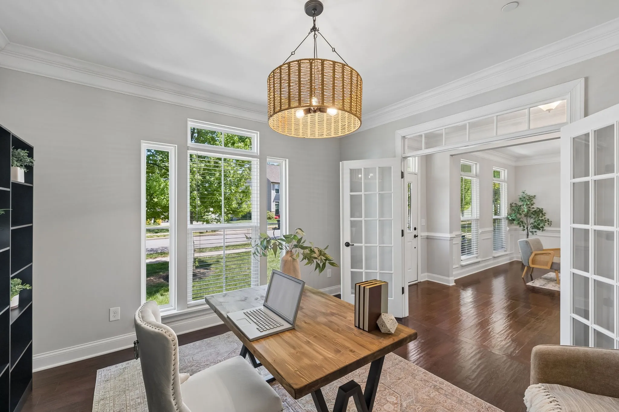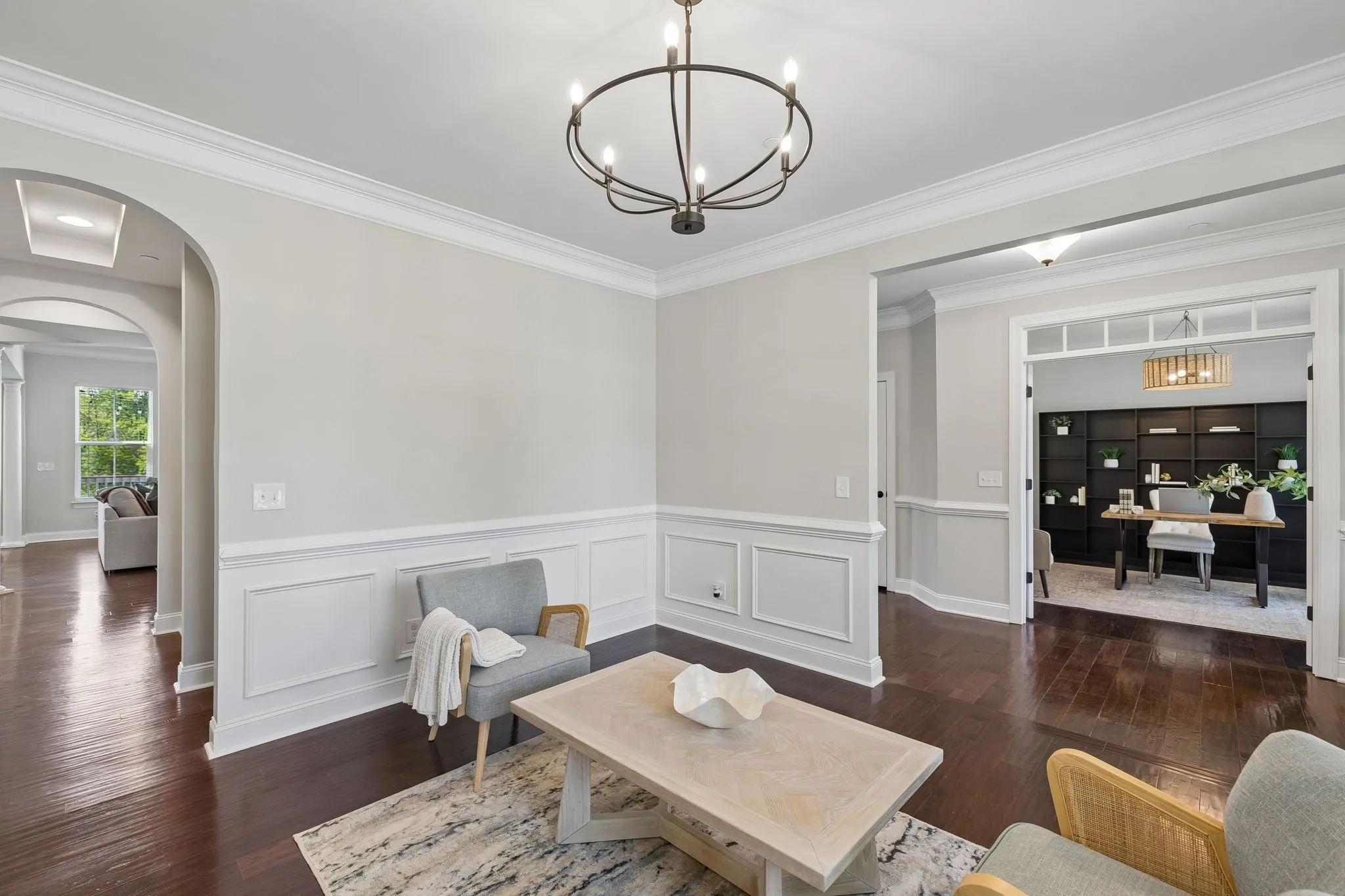 From the charming covered front porch, step inside to a welcoming foyer with hardwood floors and detailed trim. The main level is designed for everyday living and special gatherings, featuring a formal dining room (perfect for holidays or homework overflow), a private office with French doors for work-from-home days, and an open-concept family room that keeps everyone connected.