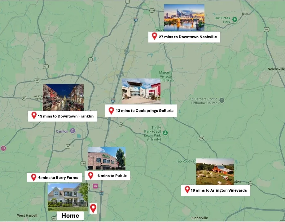 - Directions: From Nashville: I-65 S, Exit 61, Right on TN-248 S/Goose Creek Byp, Left on US-431 S/Lewisburg Pk, Left on Stream Valley Blvd, at the traffic circle, take the 2nd exit on Shallow Stream Ln, Left on Canyon Echo, Right on Rockport Ave, house is on the right