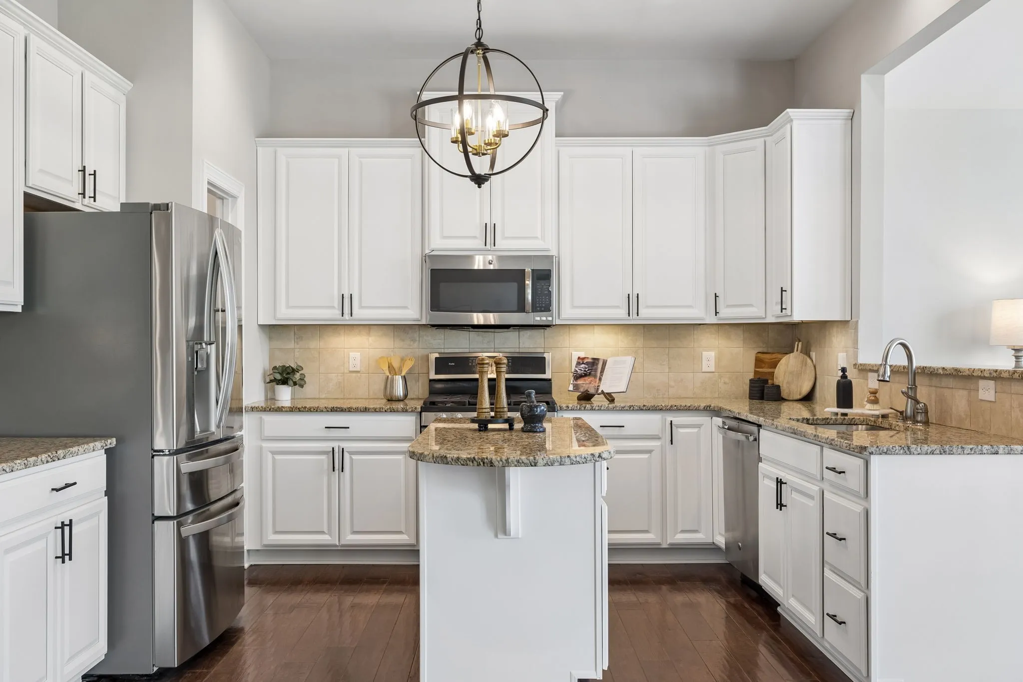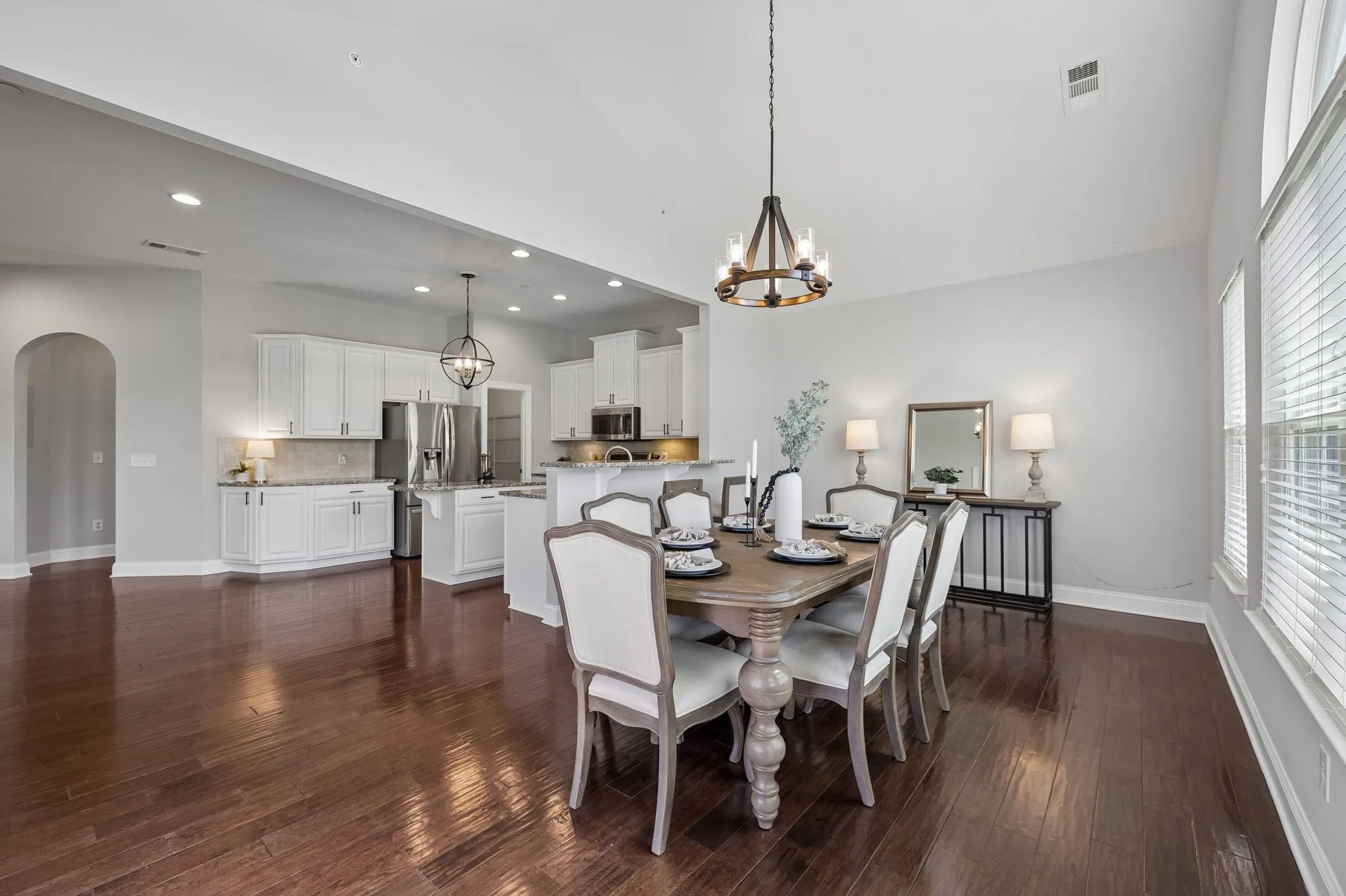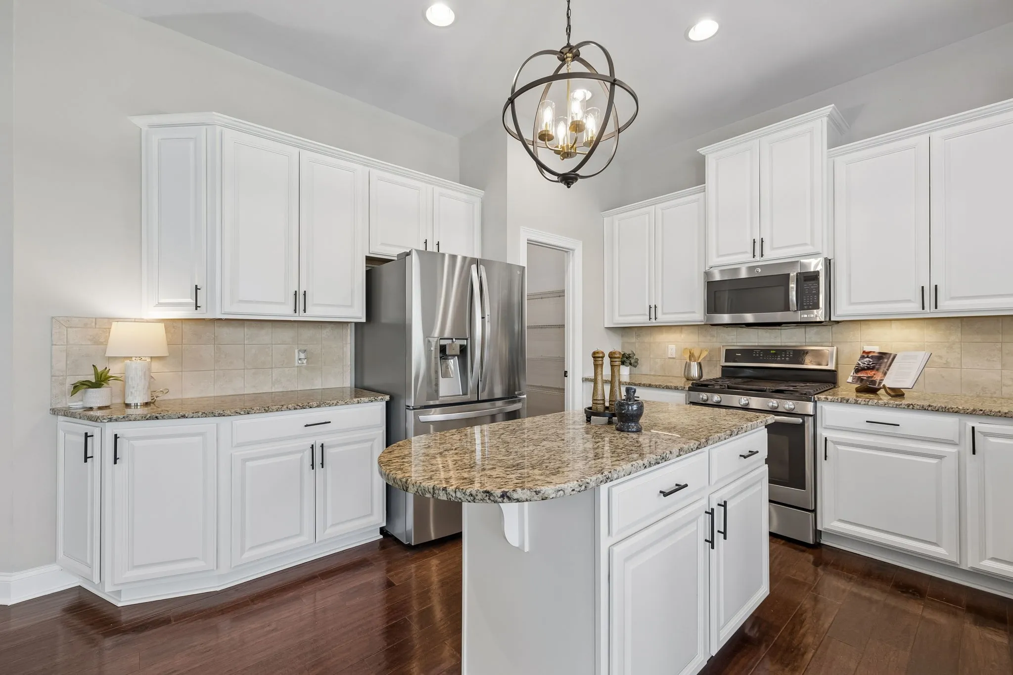 The heart of the home is the updated kitchen, featuring freshly painted cabinetry, new hardware and lighting, granite countertops, tile backsplash, under-cabinet lighting, a large island, walk-in pantry, and stainless steel appliances including a 5-burner gas range. The vaulted morning room just off the kitchen is filled with natural light—perfect for casual meals or morning coffee.