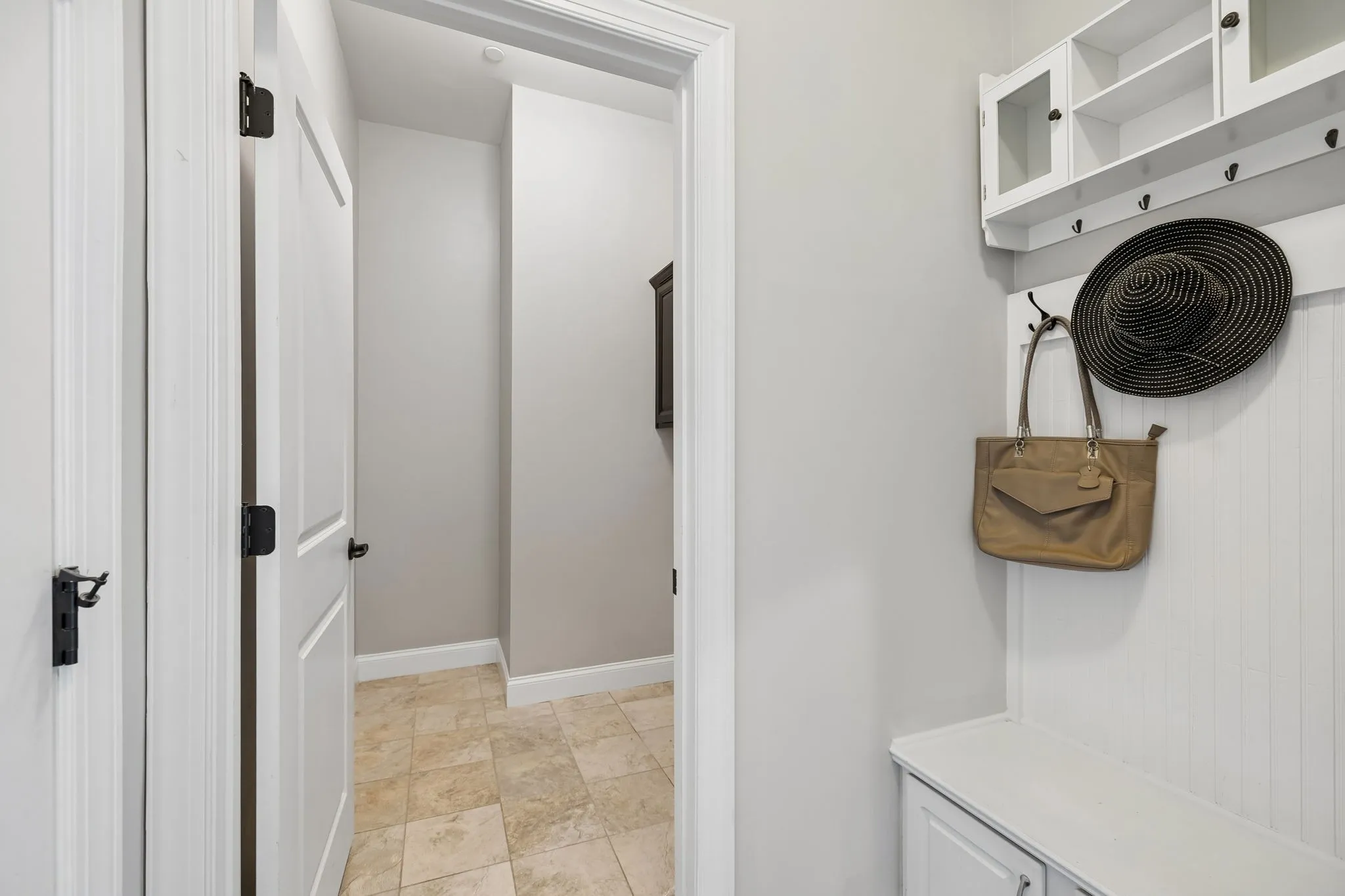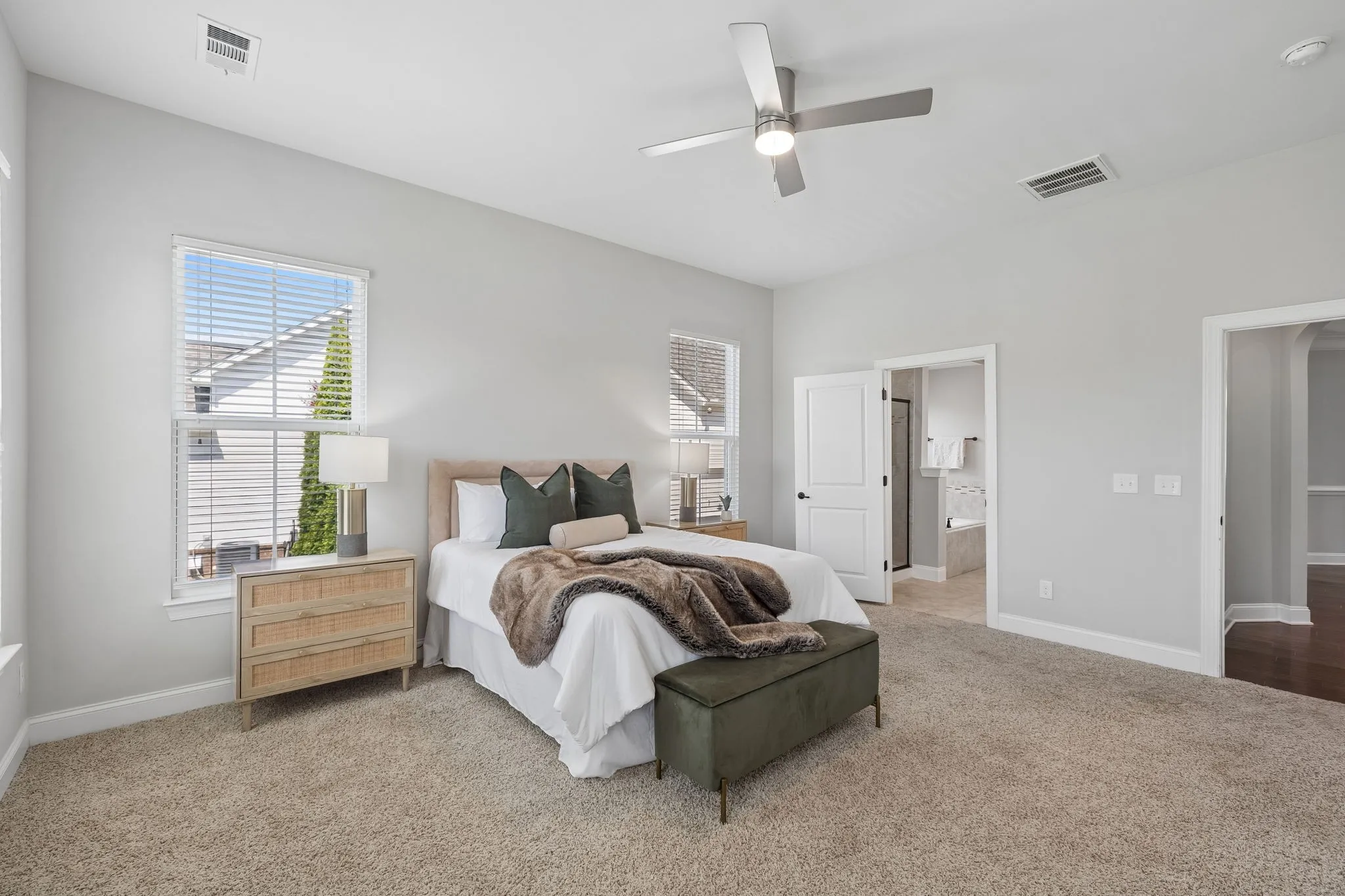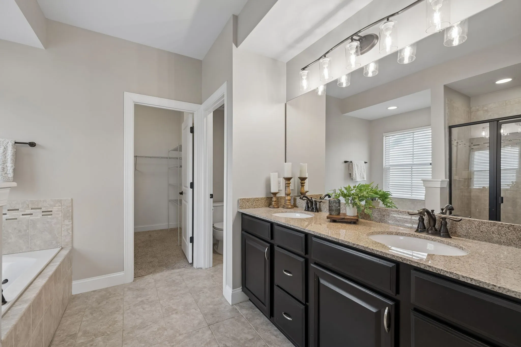 The main-level primary suite offers a peaceful retreat, complete with a spacious walk-in closet and spa-like bath with double vanities, soaking tub, and tiled shower. A drop zone near the garage and a well-equipped laundry room help keep busy days organized.