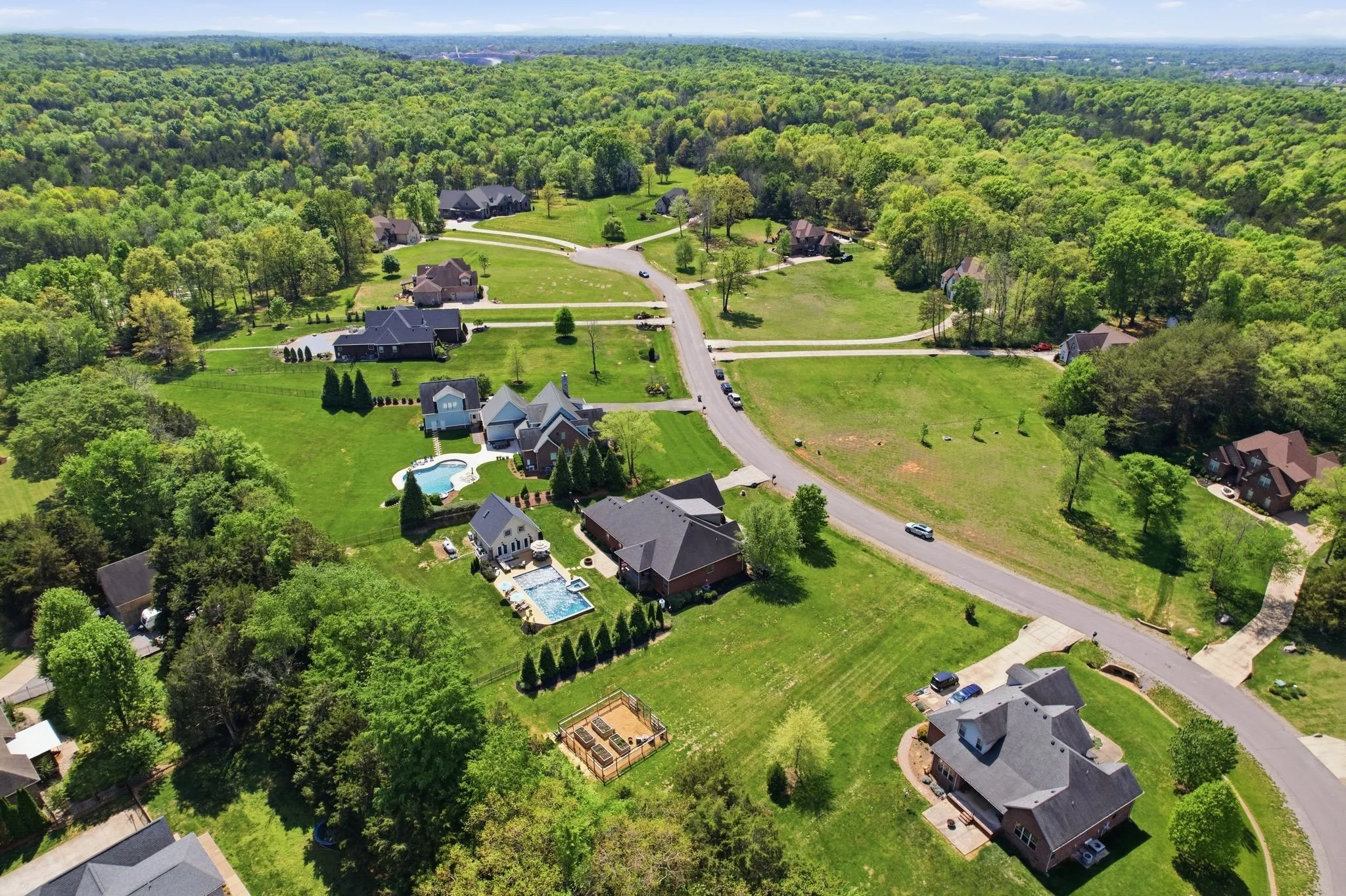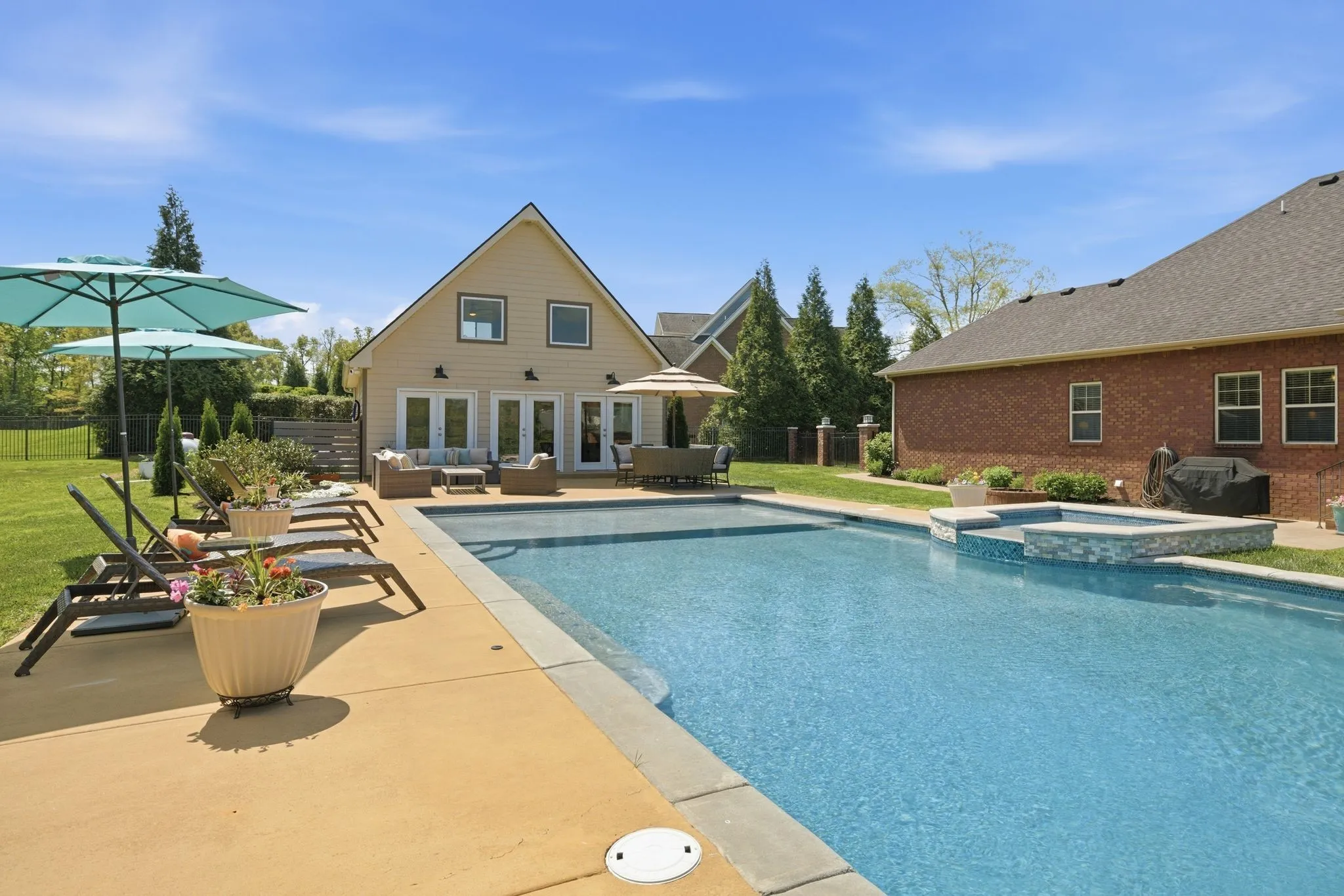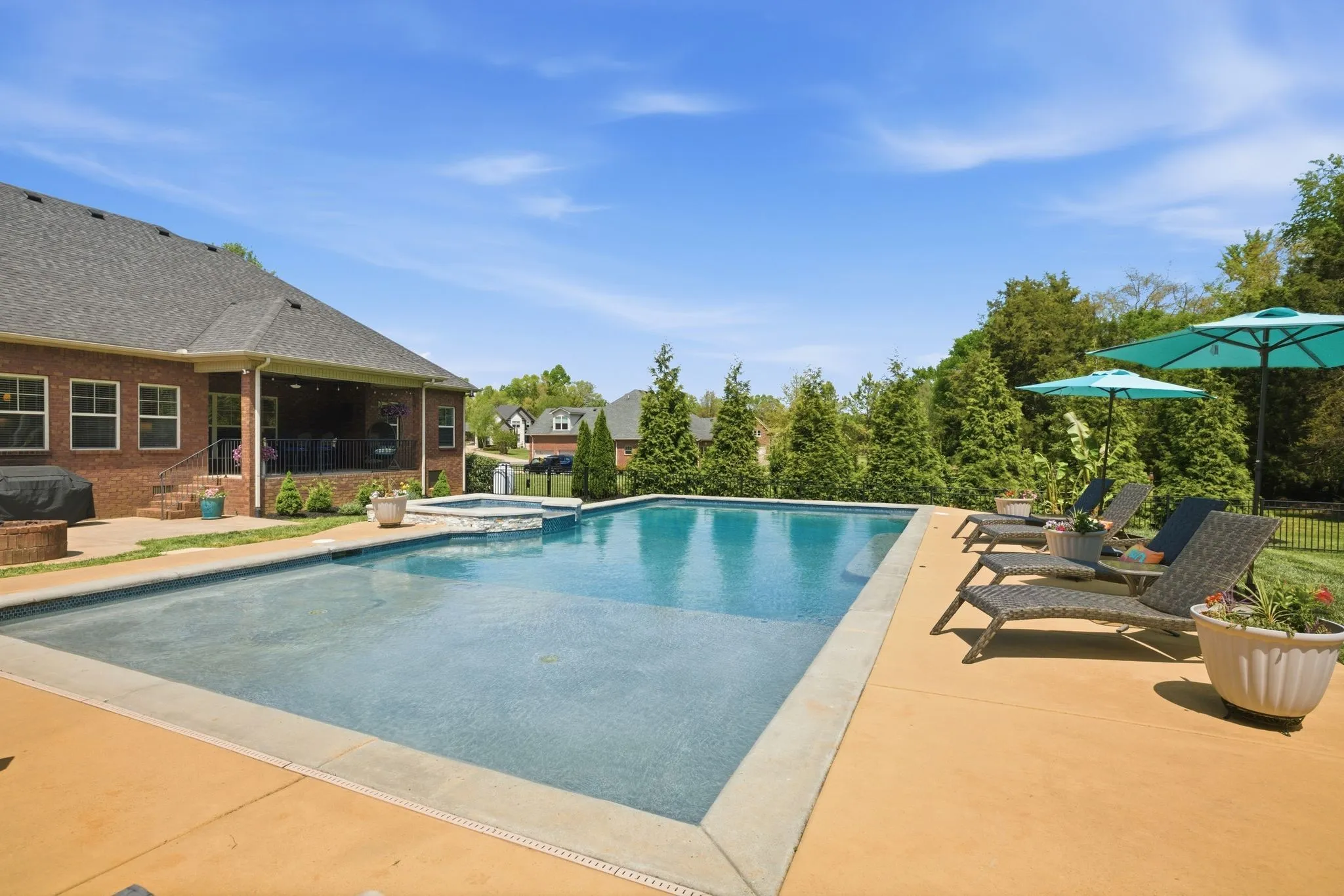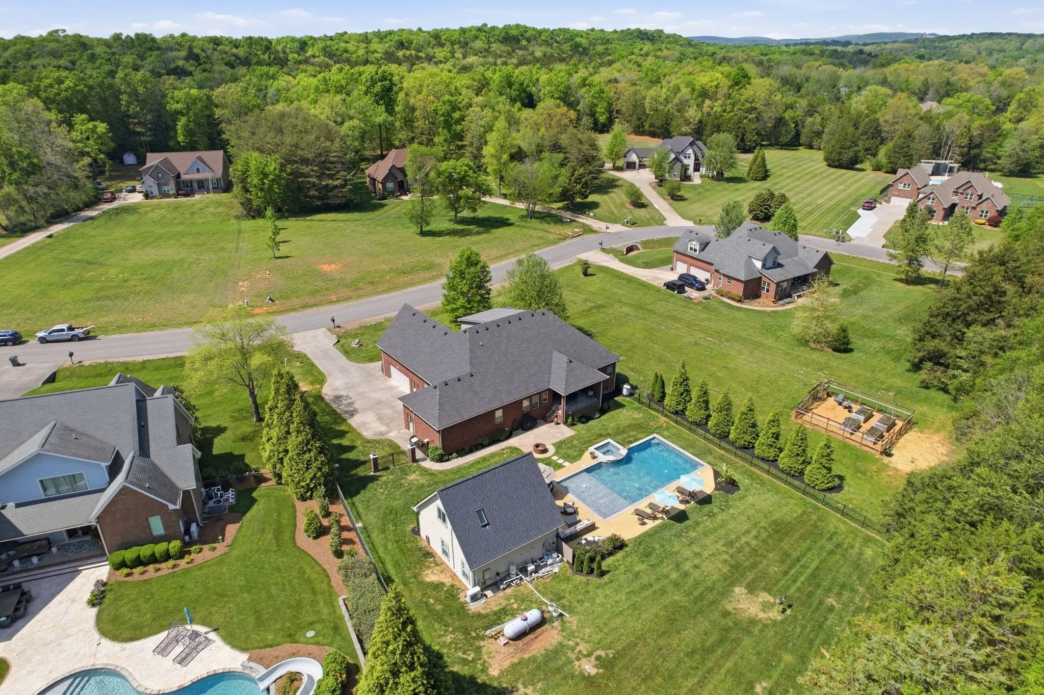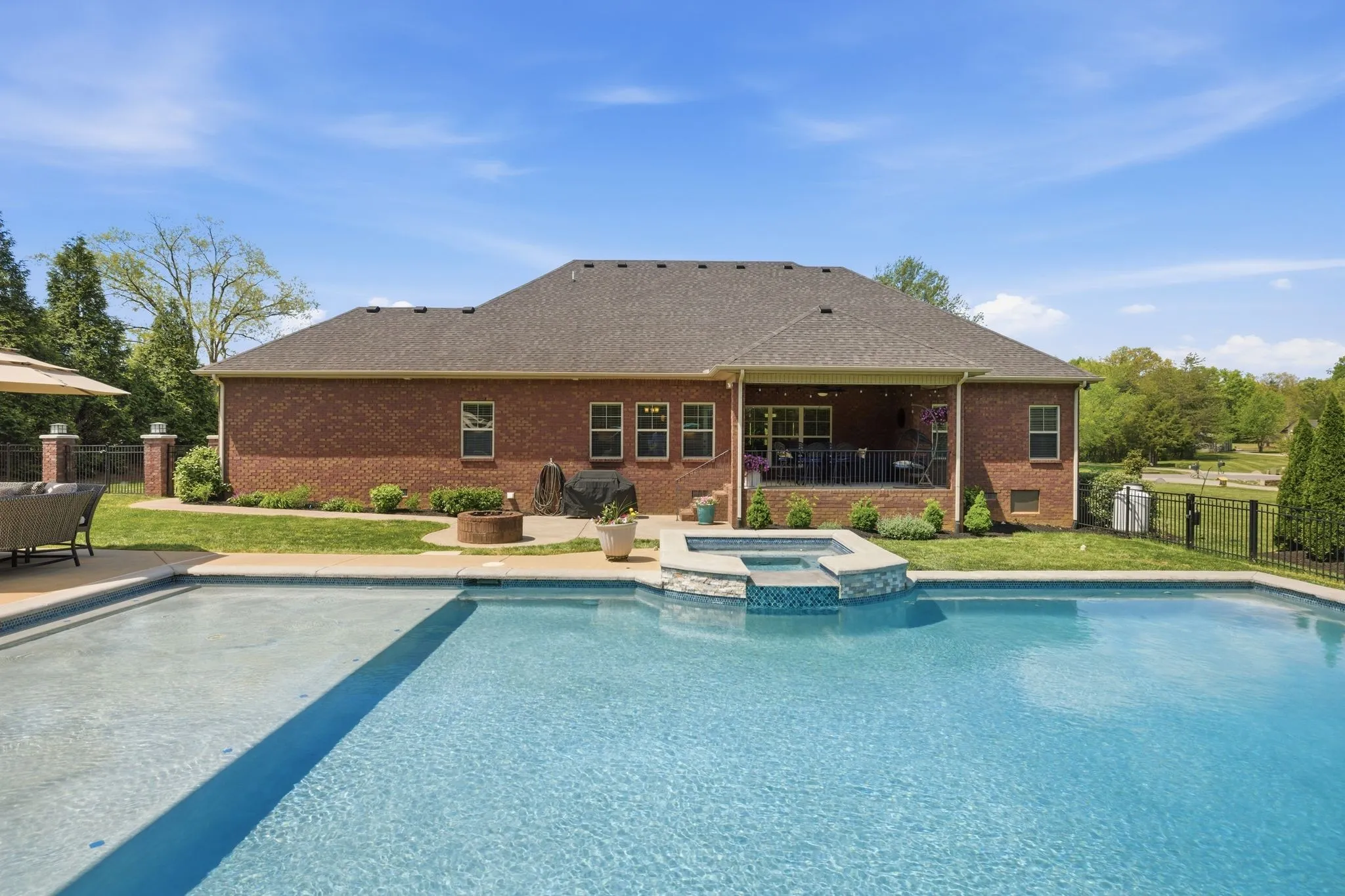Seeing is believing! This is so true for 211 Fox Den Way. There may not be a more peaceful setting in Middle Tennessee for your new home setup for entertaining. What’s not to like…almost all one-level living, gleaming refinished hardwood flooring, brand new carpet in the secondary bedrooms and the bonus room, updated kitchen with stainless steel appliances, a fabulous and efficient open floor plan, a luxurious and spacious primary bedroom ensuite, both formal and informal dining areas, a separate office, nine-foot ceiling height on the main level and vaulted ceiling in the bonus room along with all the bells and whistles of new construction. The bonus room has a wet bar, office or exercise area and full bath. There is also a giant walk-in, unfinished attic storage space. And that is just inside! Resort-style living is at your fingertips outside…a hot tub that spills into the in-ground gunite saltwater pool with a massive baja ledge for kids and lounging. A separate pool house (estimated 750 square feet) keeps the wet kids outside and has a vaulted ceiling great room and kitchenette, bedroom, full bathroom and a loft area. Don’t forget to bring ingredients to make s’mores (and memories) around the wood-burning firepit. Be sure to schedule some “me time” to unwind while tending to the fenced garden which has raised beds. In front of the garden is a side yard large enough for any outdoor activity you could imagine. The rear covered porch allows you to start the day capturing picturesque views of the sunrise while the front covered porch allows you to finish the day soaking in views of the sunset. All the while a mature tree line and professionally designed landscaping offers privacy to enjoy your space! Two separate garages combine to provide parking for three vehicles. All of this is on a dead-end street. Of course, everything Murfreesboro has to offer is only ten minutes away. With an appropriate offer, appliances and some furnishings can be conveyed with the sale.