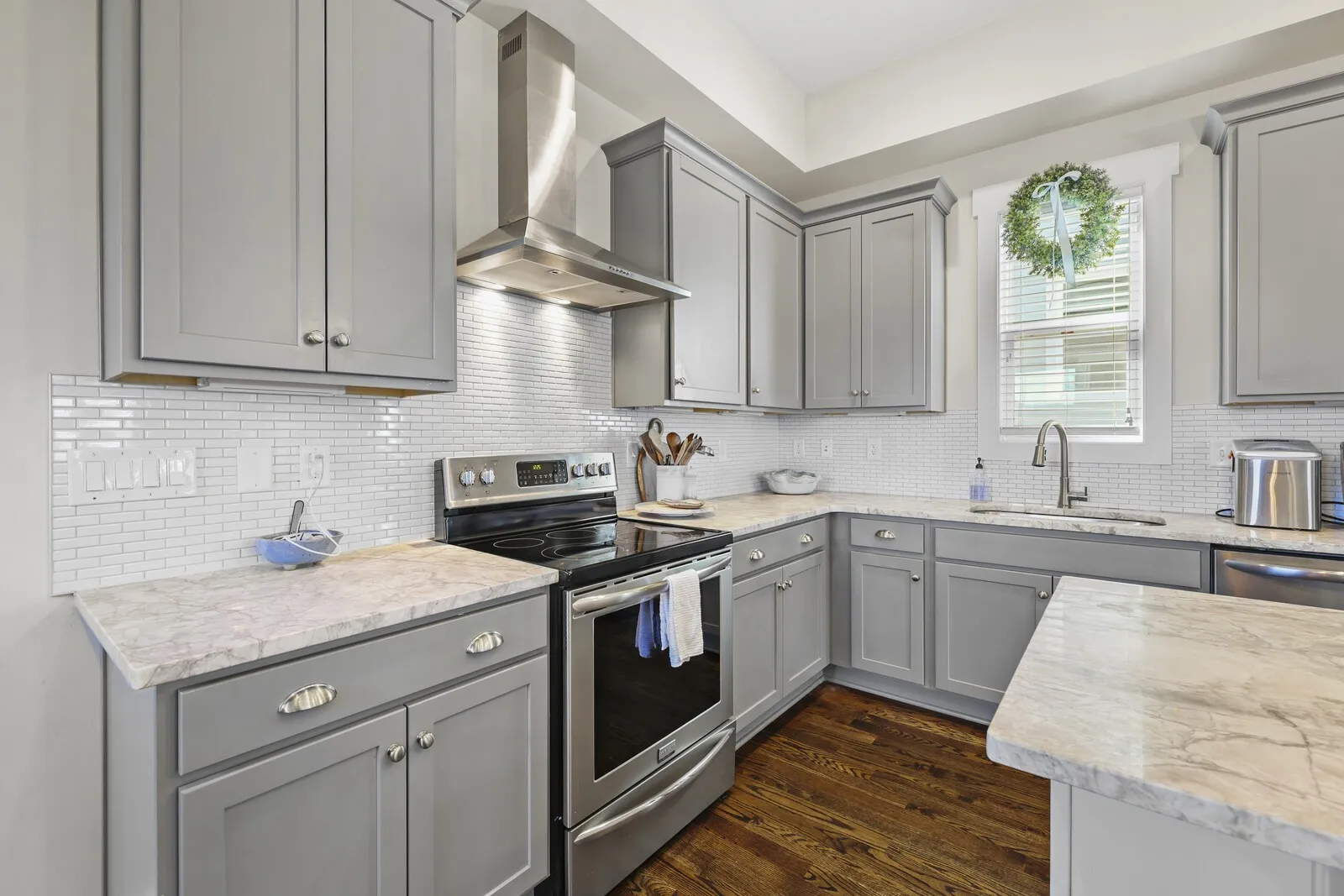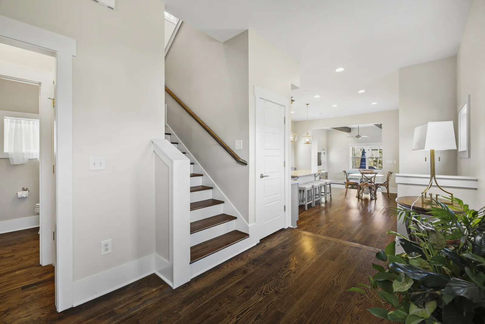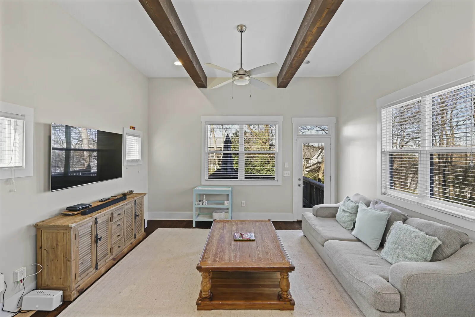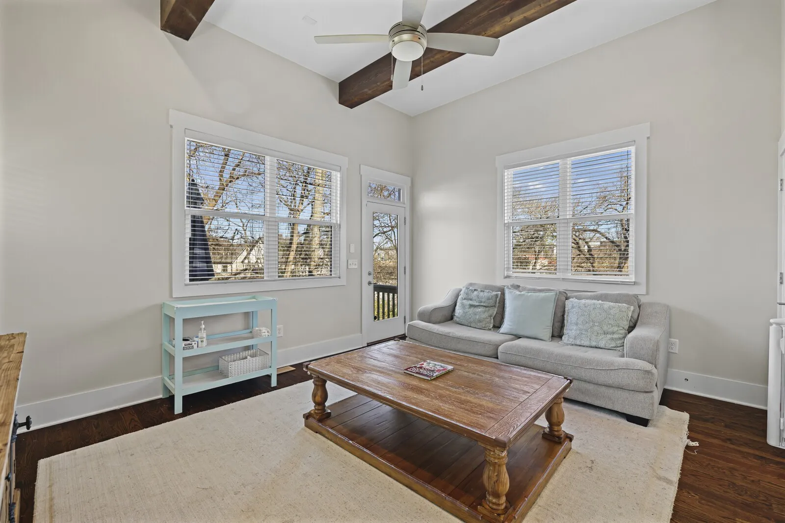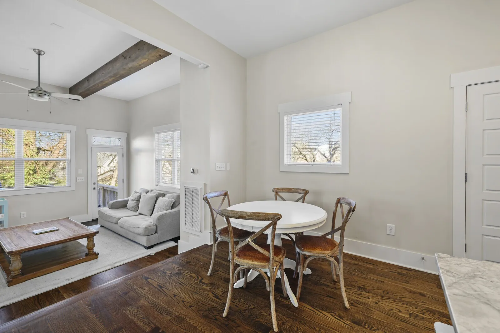 Step inside to find tall ceilings with exposed beams, abundant natural light, and gleaming hardwood floors throughout the main living spaces. The bright, open kitchen features granite countertops, ample cabinetry, and easy flow to the living and dining areas—perfect for everyday living or entertaining.