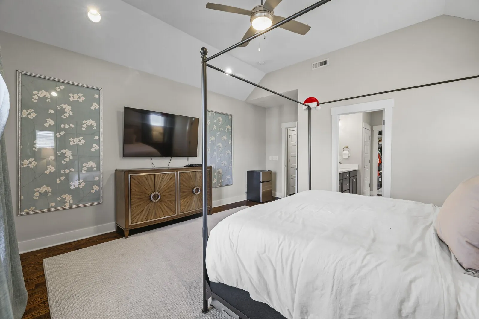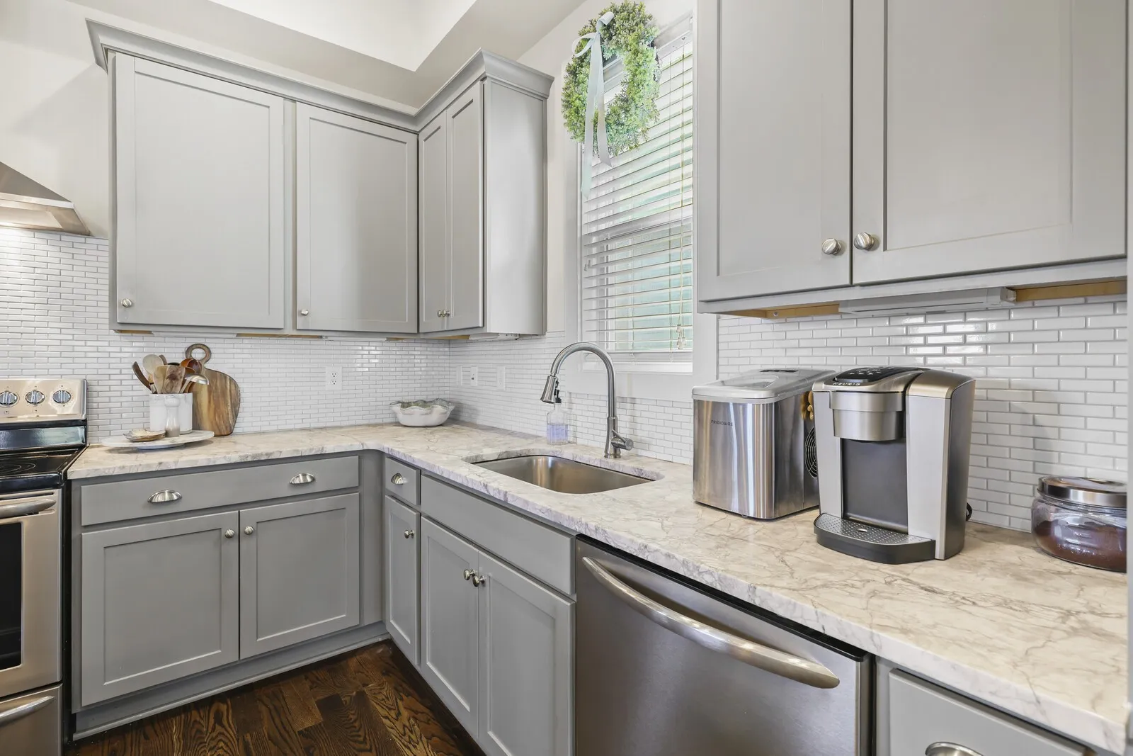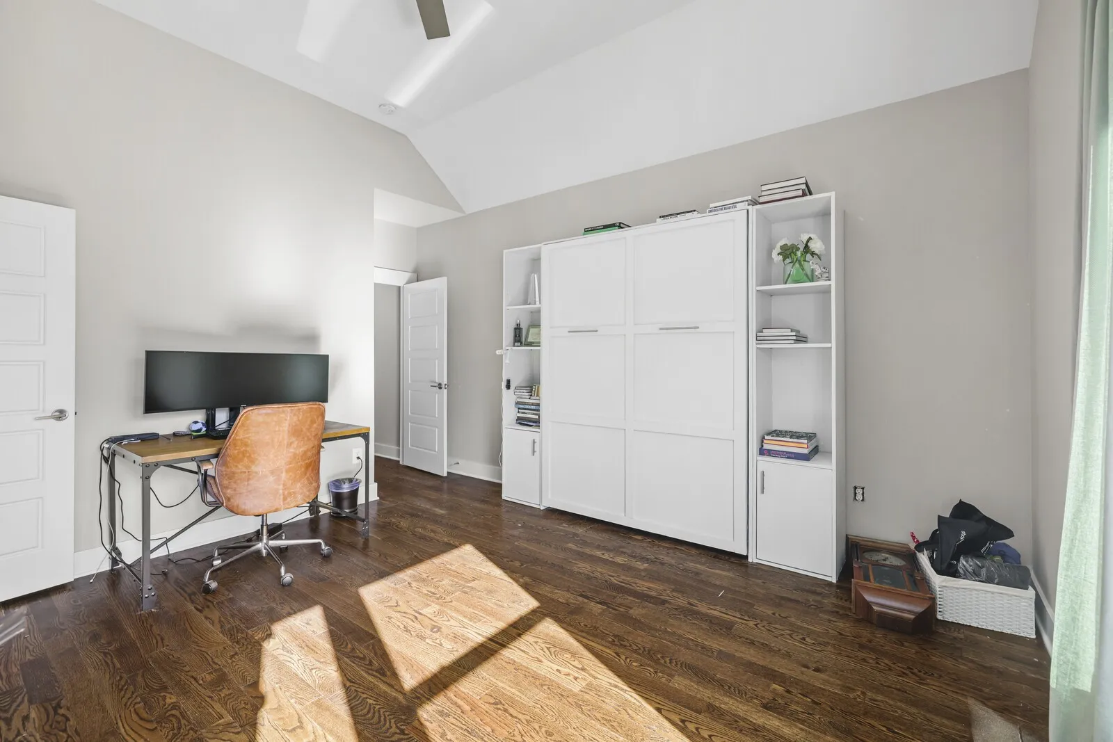 The spacious owner’s suite offers an oversized walk-in closet and plenty of room to unwind, along with an Elkay filtered and chilled water station just outside the suite for your convenience. The guest bedroom comes equipped with a custom-built Murphy bed, creating a great space for an office or to host out-of-town guests. You’ll love the thoughtful storage space found throughout the home.