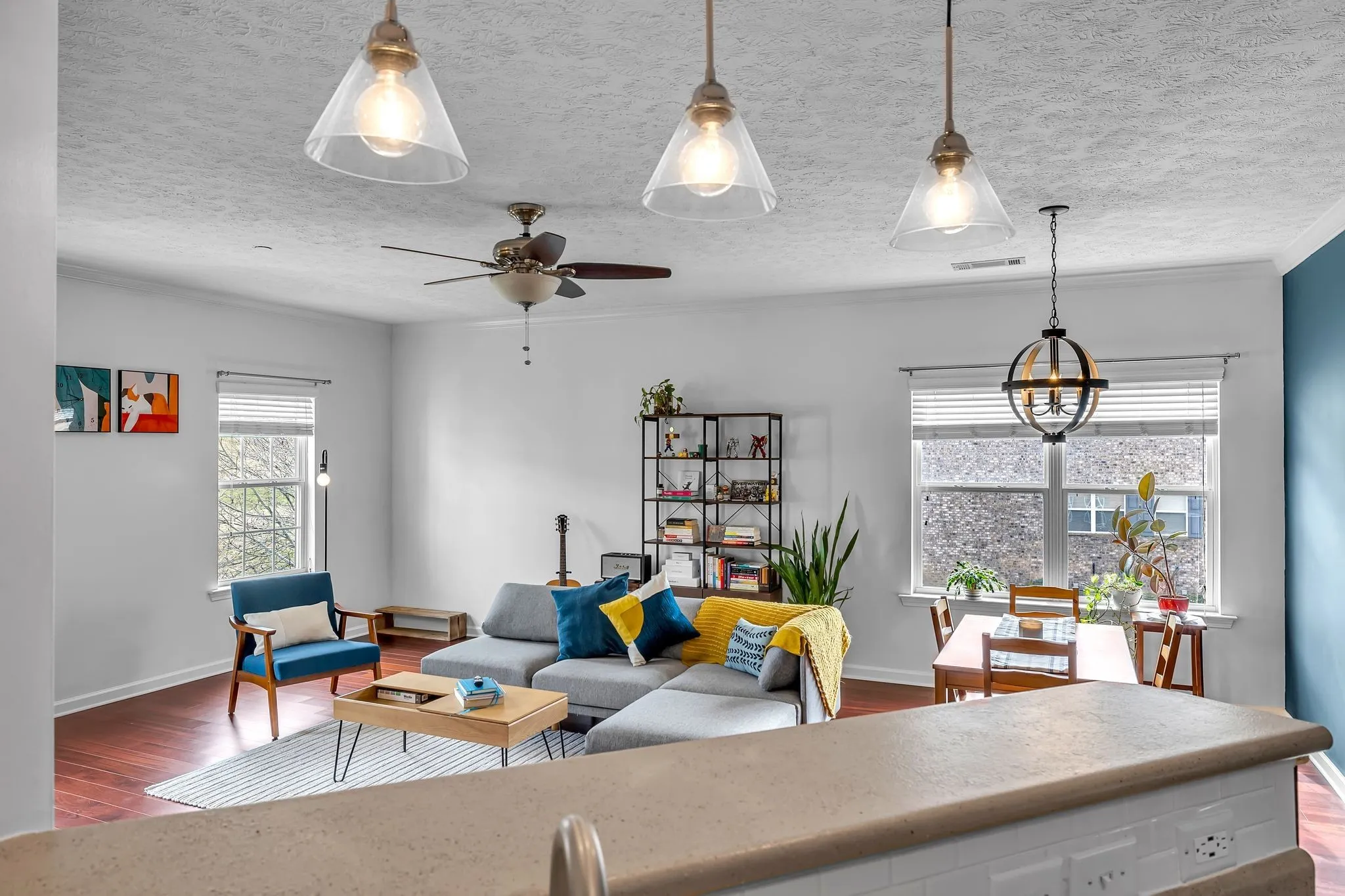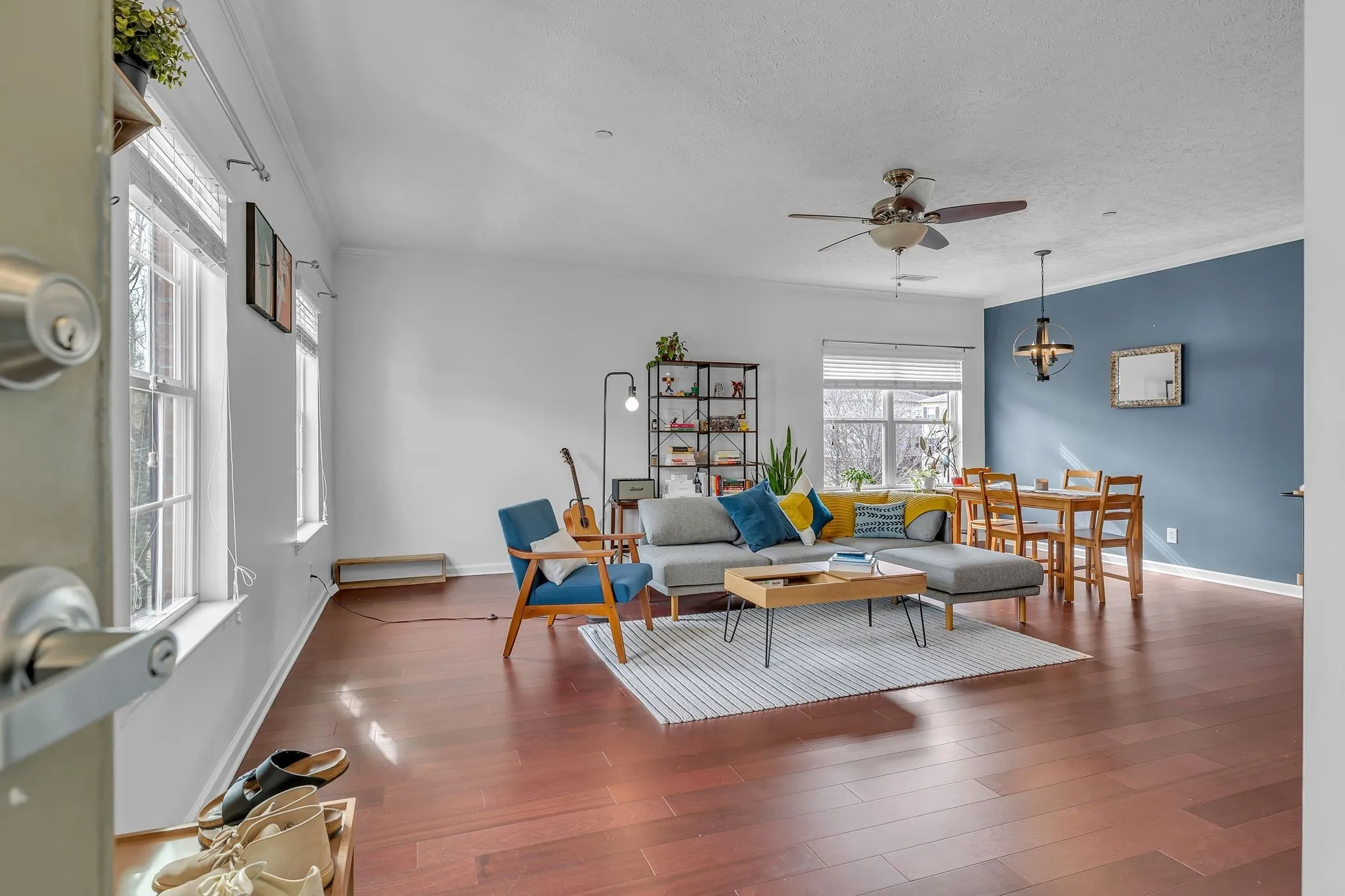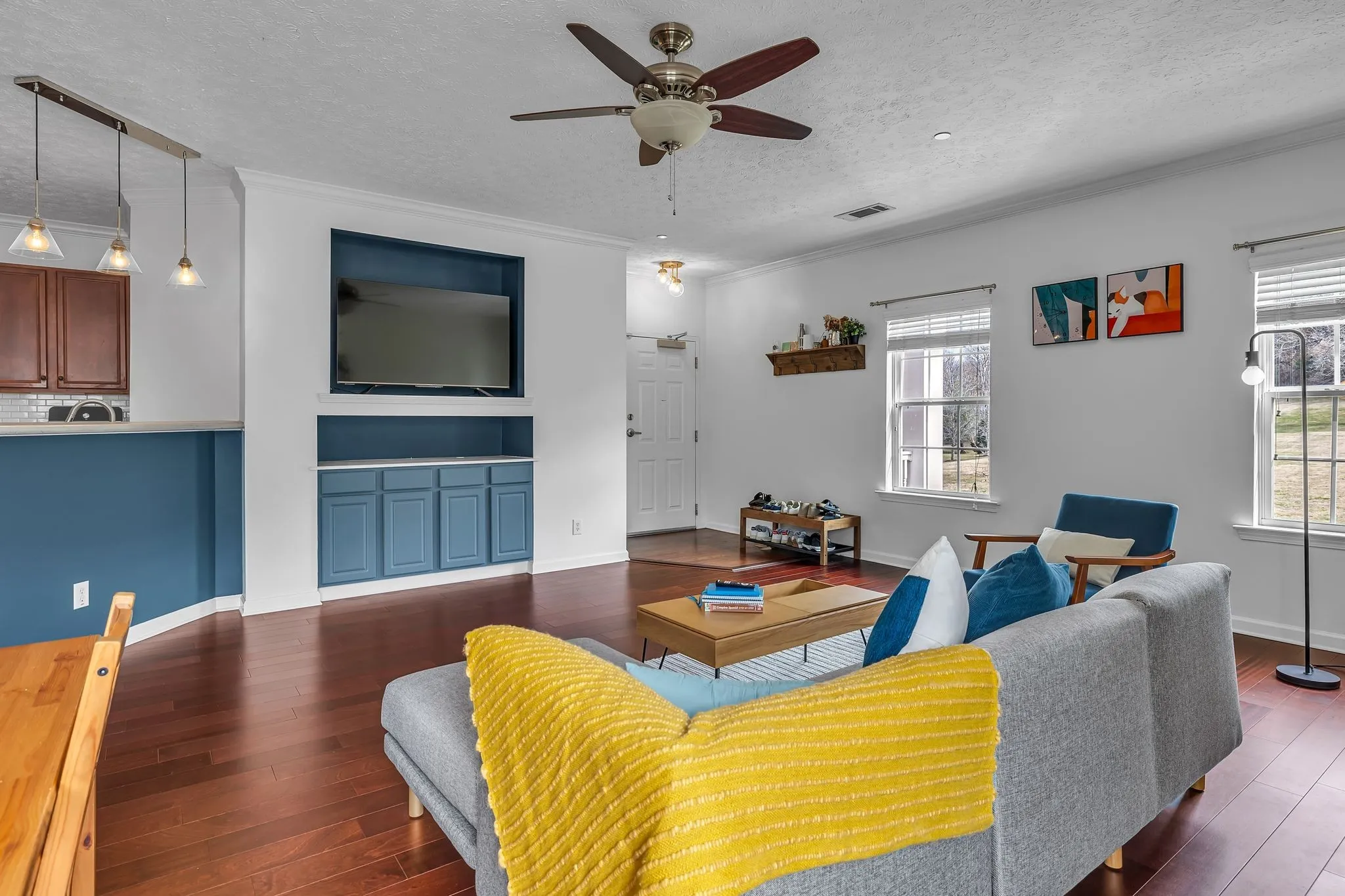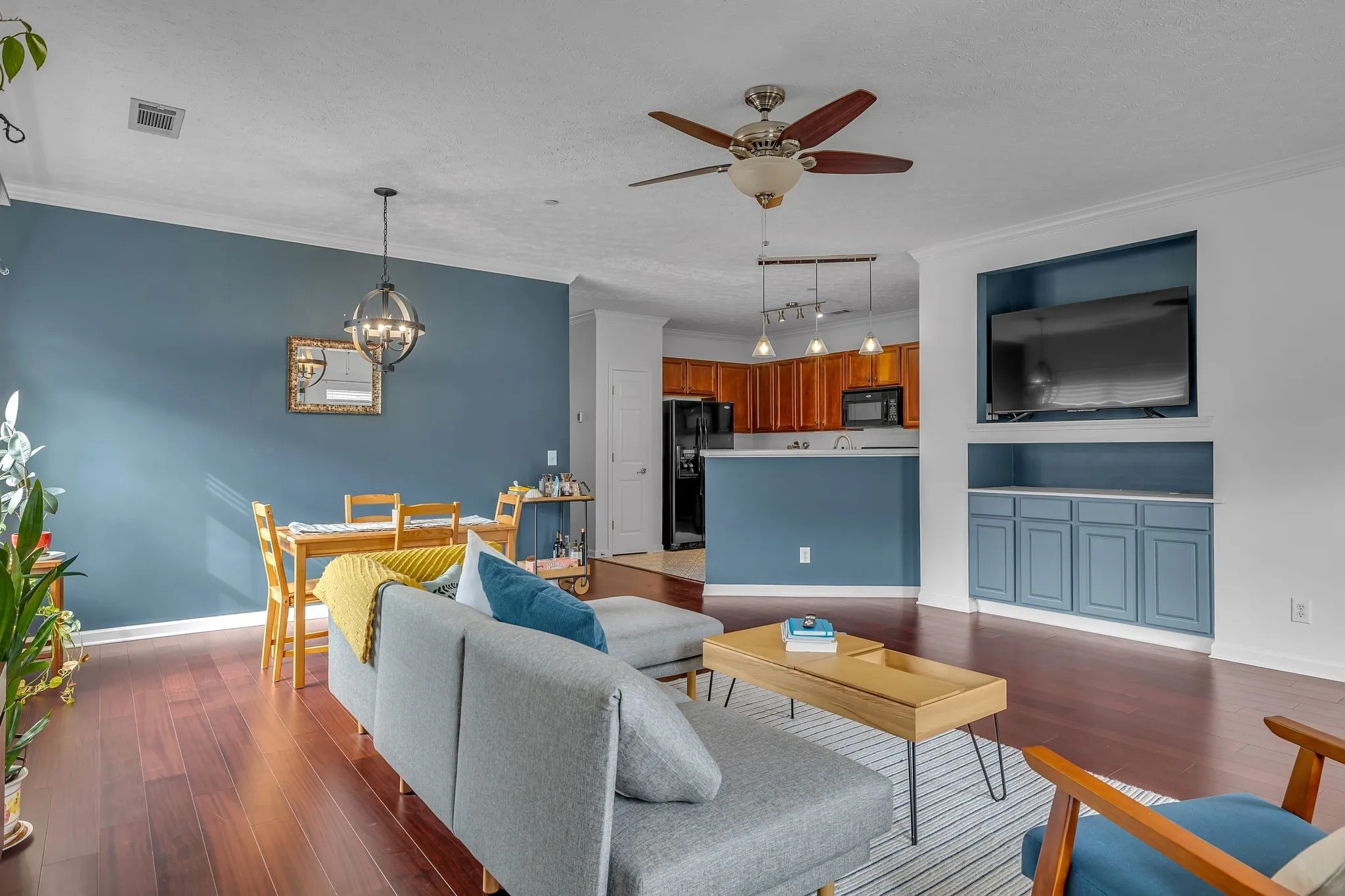 This beautifully updated upper-level condo offers a perfect blend of modern style and comfort. The living room is enhanced by a custom-built TV cabinet and recessed lighting, creating a warm and inviting atmosphere. The spacious primary suite boasts a walk-in closet and an en-suite bath with a dual vanity. Recent upgrades include newly installed hardwood floors and brand-new blinds, adding to the home’s appeal. A two-car tandem garage provides ample parking and storage, while the condo overlooks serene green space.