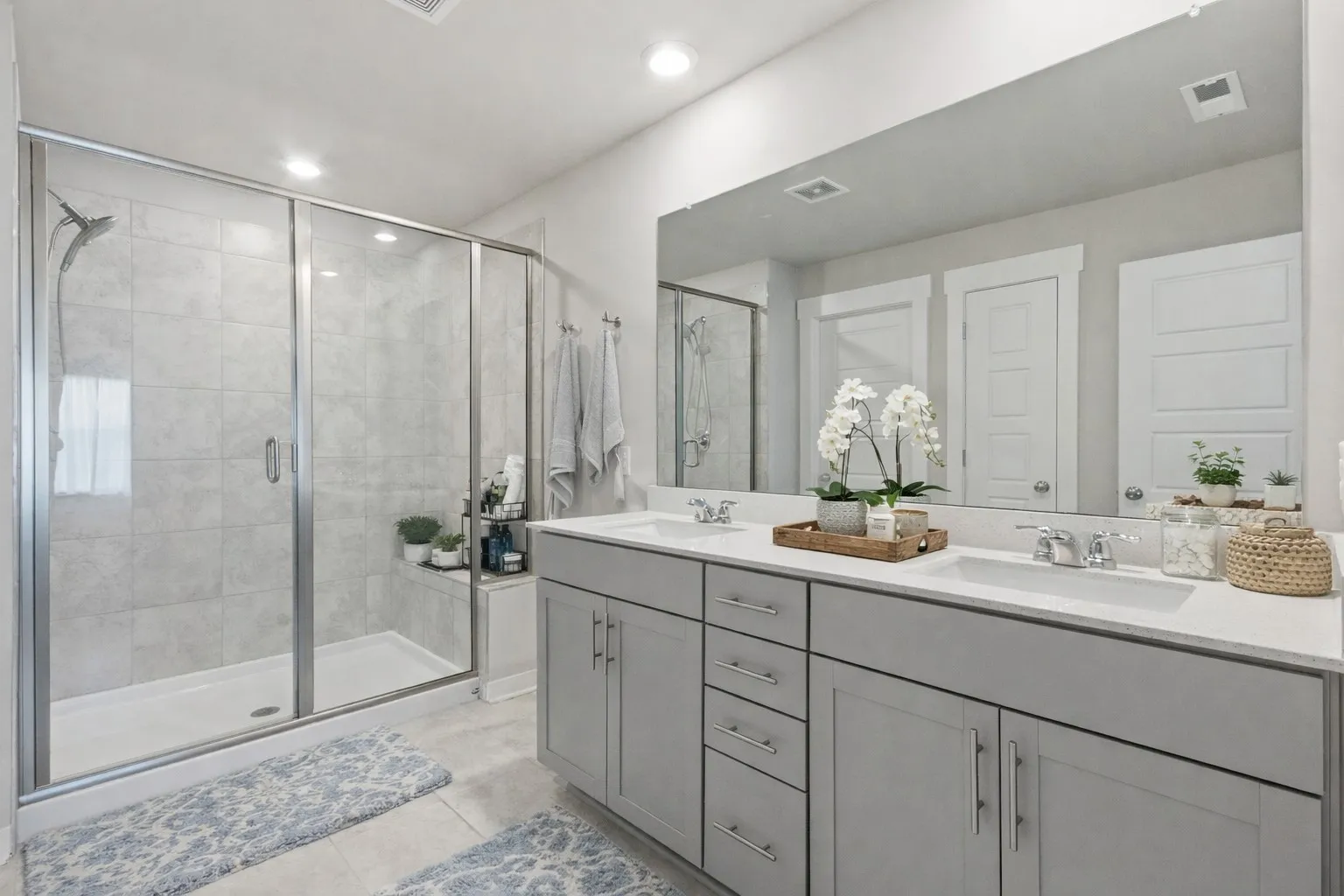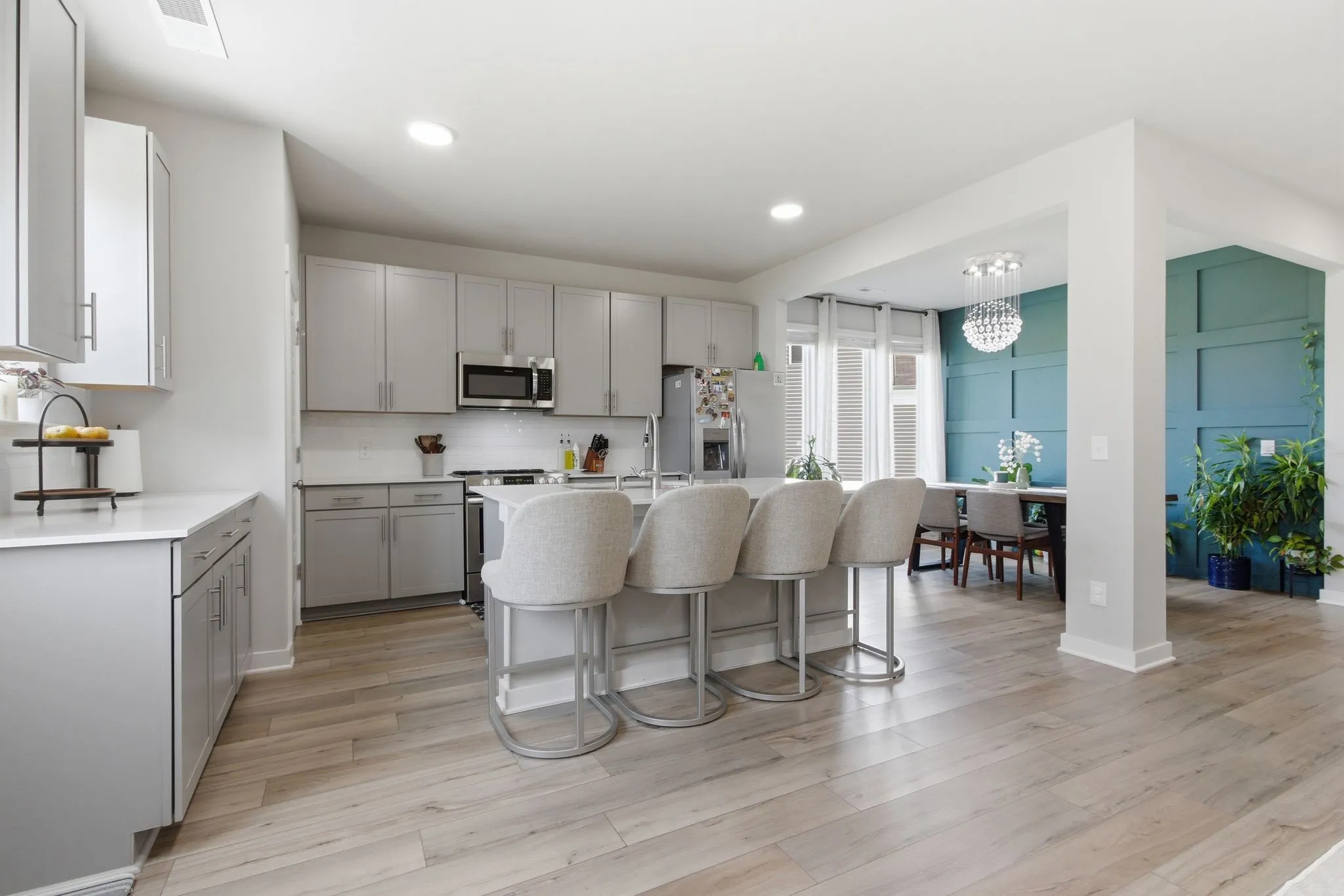 The modern kitchen is a standout, featuring designer cabinetry, quartz countertops, a spacious island, and a pantry providing ample space for cooking and gathering.