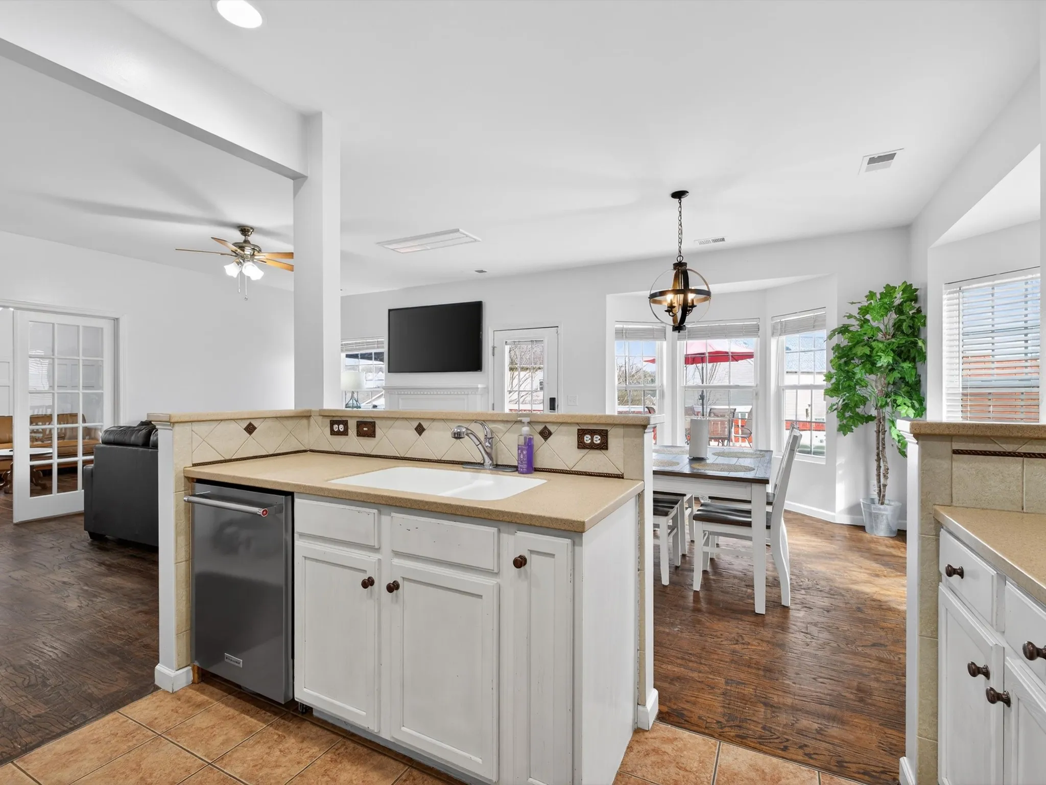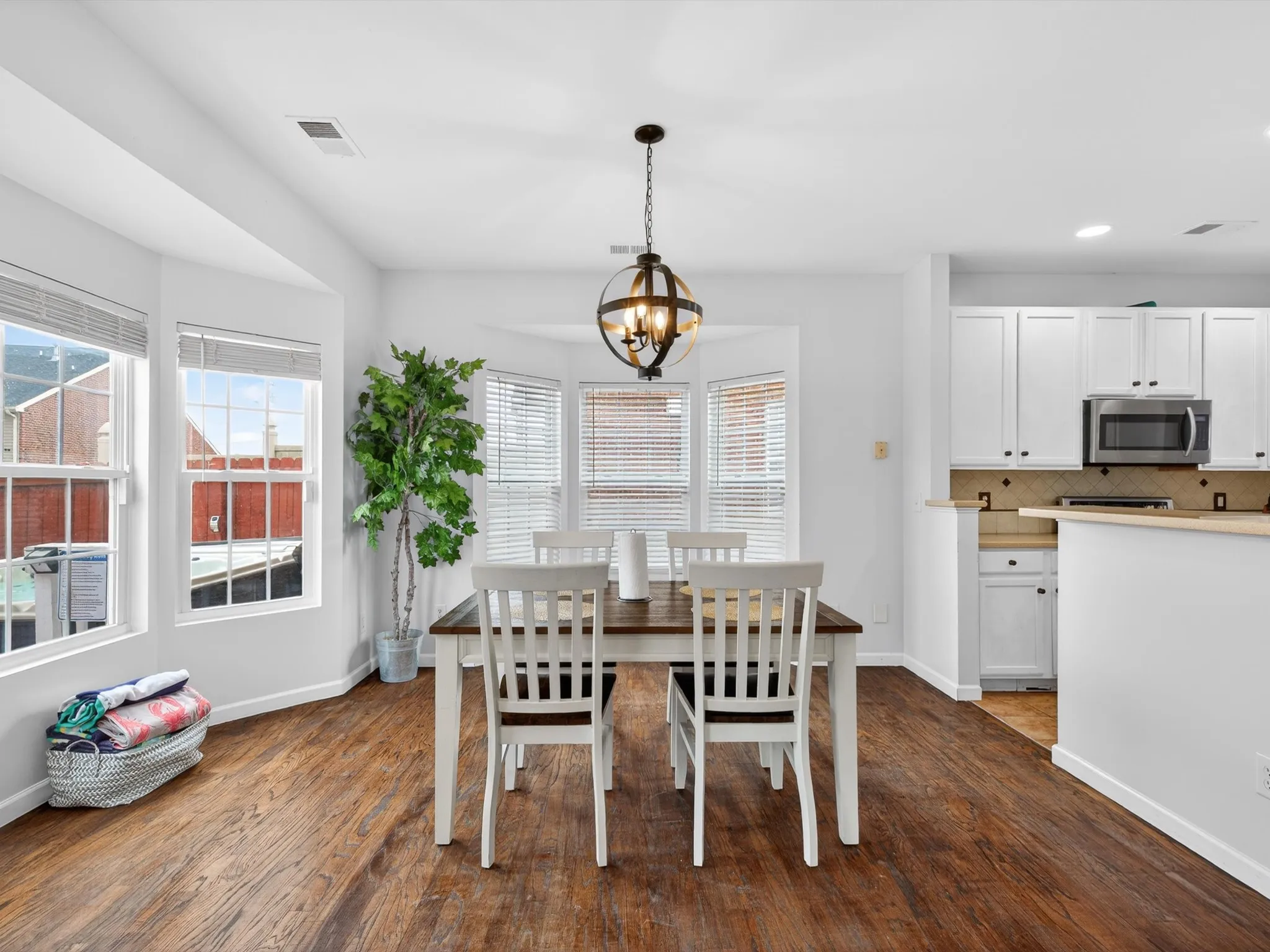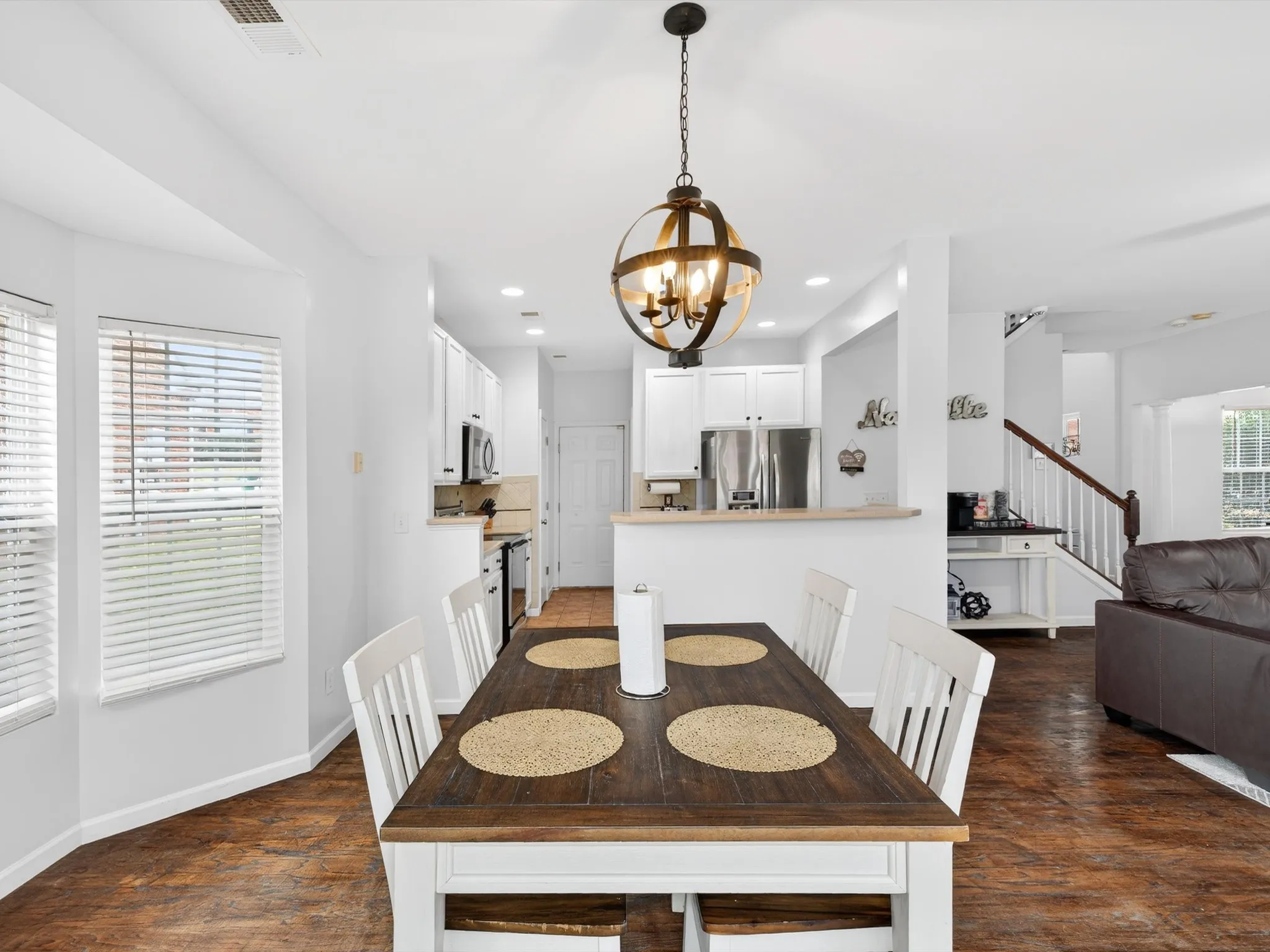 At the heart of the home, the kitchen features ample cabinet space and a convenient pantry, making organization effortless. It flows seamlessly into living areas, creating an inviting space for gatherings or everyday living. Hardwood floors and abundant natural light throughout enhance the warm, welcoming atmosphere. Property sold as-is.