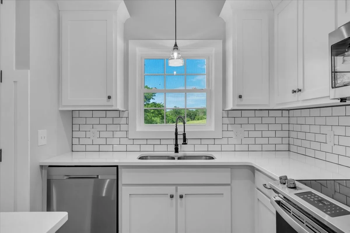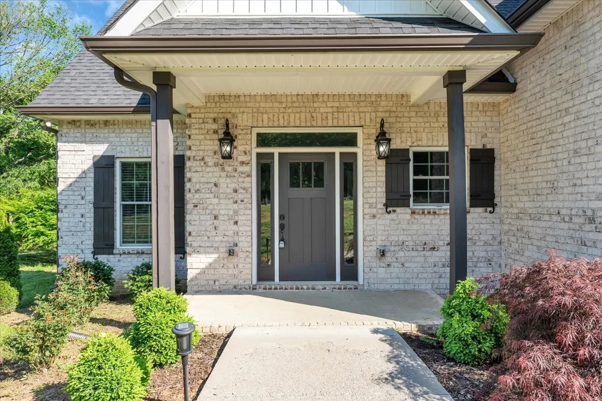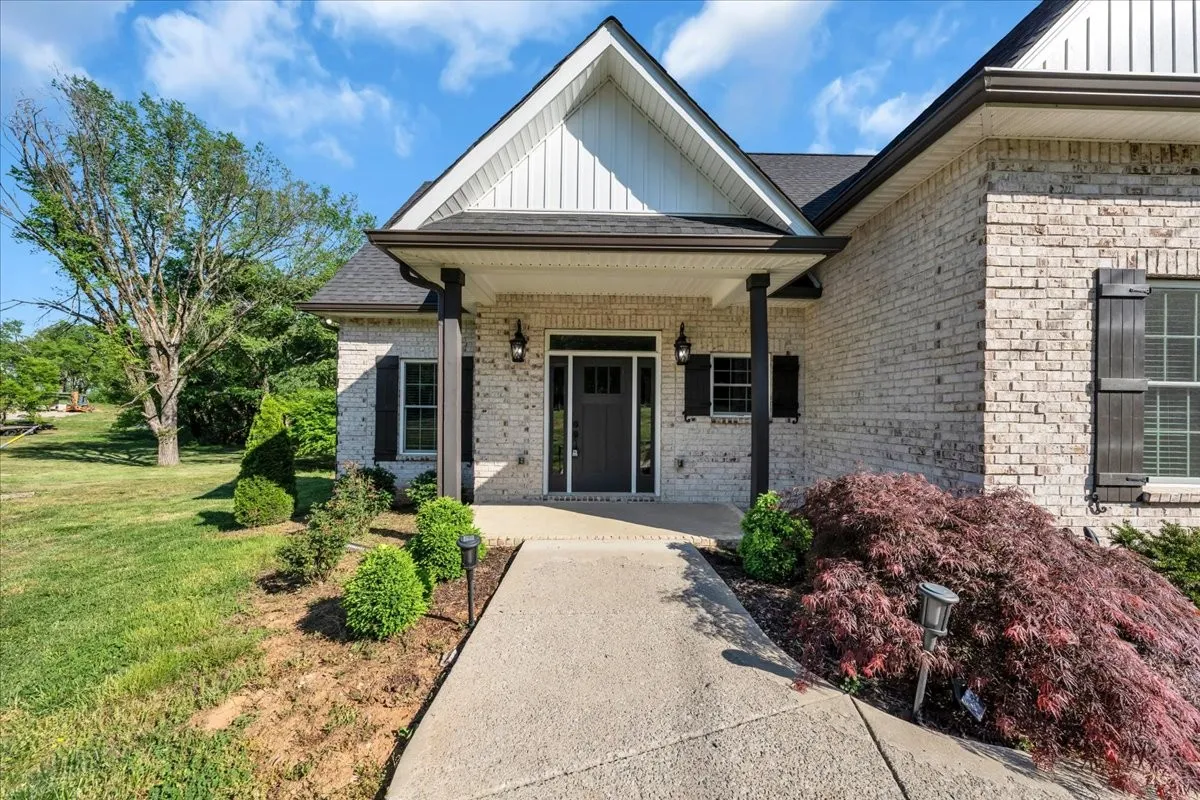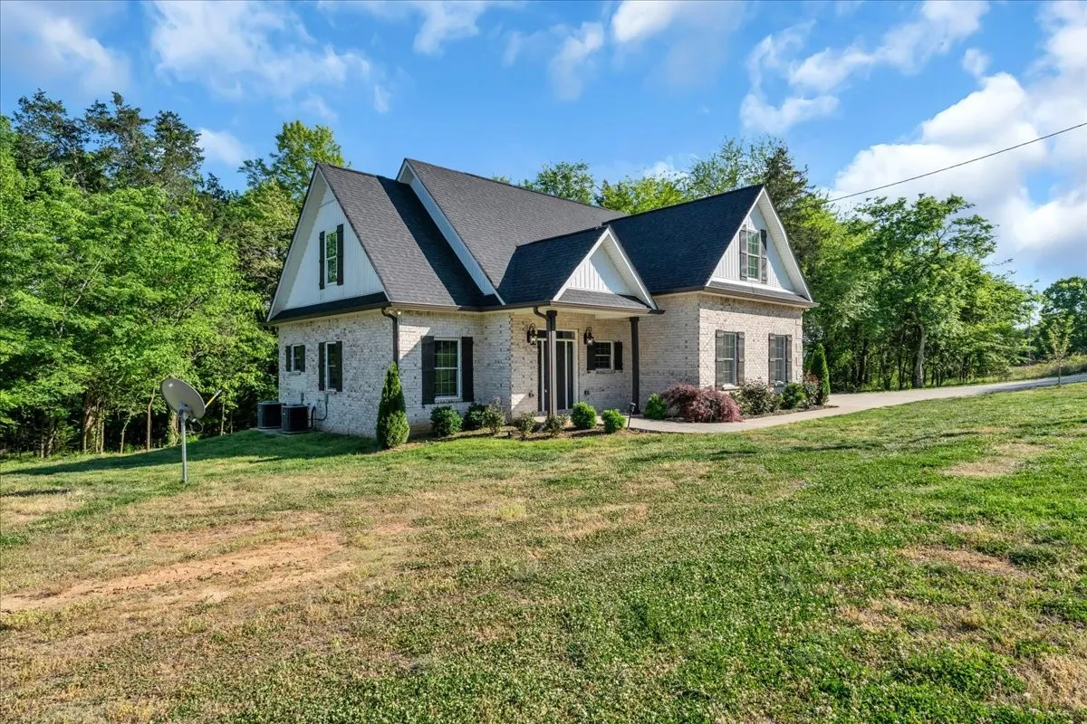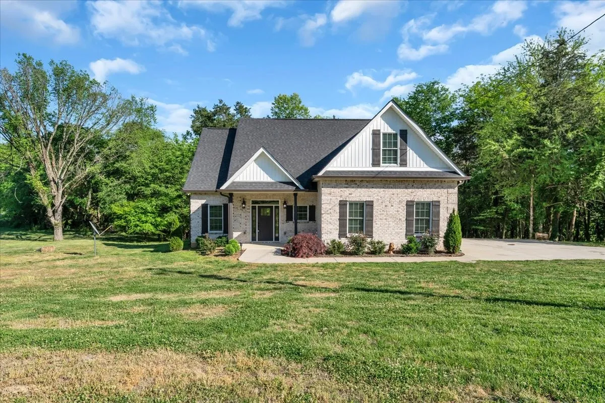 Located in Bell Buckle, this brick home offers a clean modern farmhouse feel with an inviting front porch, detailed trim work, and established landscaping. Inside, the open main level features wide‑plank flooring, board‑and‑batten wainscoting, and a spacious living area that flows into the kitchen and dining spaces. The kitchen includes shaker‑style cabinetry, a large island, subway tile backsplash, stainless appliances, and a window over the sink that frames a pleasant view. Sliding glass doors off the dining area open to a rear deck overlooking a tree‑lined backdrop, creating an easy indoor/outdoor gathering area. The main‑level suite shows off a generous bedroom with ceiling fan and a bath with double vanity, soaking tub with tile surround, and separate shower area. Additional bedrooms continue the neutral color palette and offer good natural light. Thoughtful storage is available throughout the home with multiple closets and a walk‑in pantry. The setting provides a yard with room for everyday use while maintaining a comfortable sense of privacy along the wooded edge. A versatile layout and move‑in ready finishes make this home easy to enjoy.