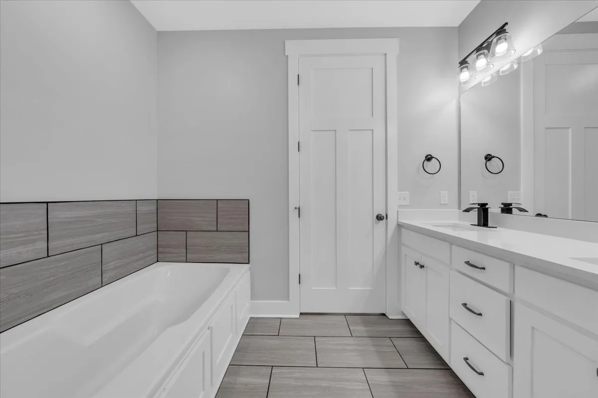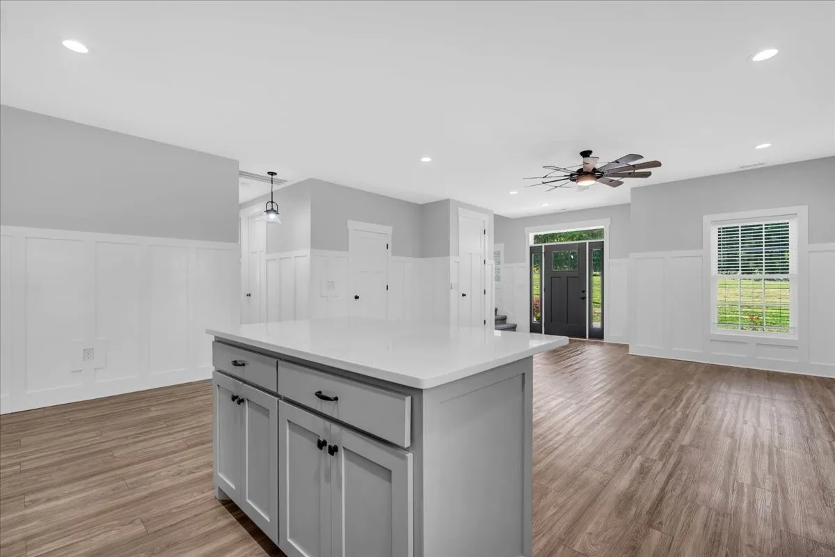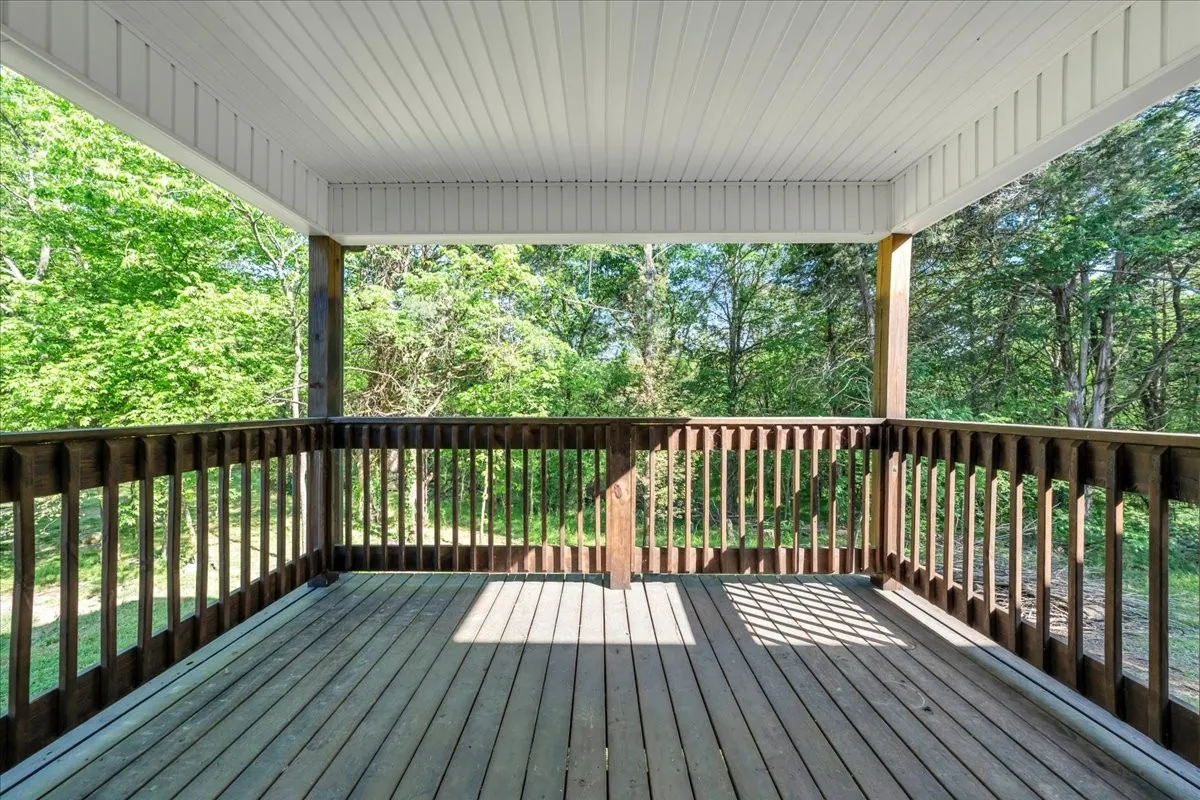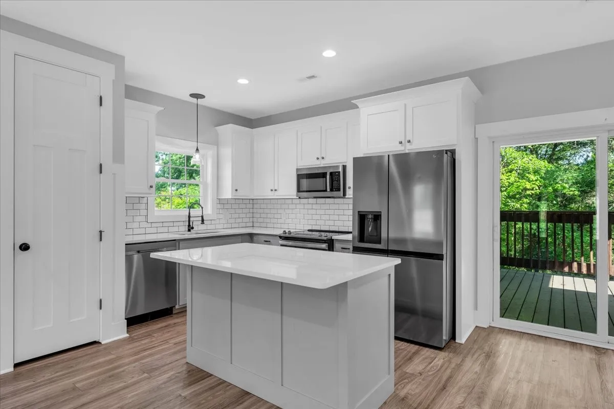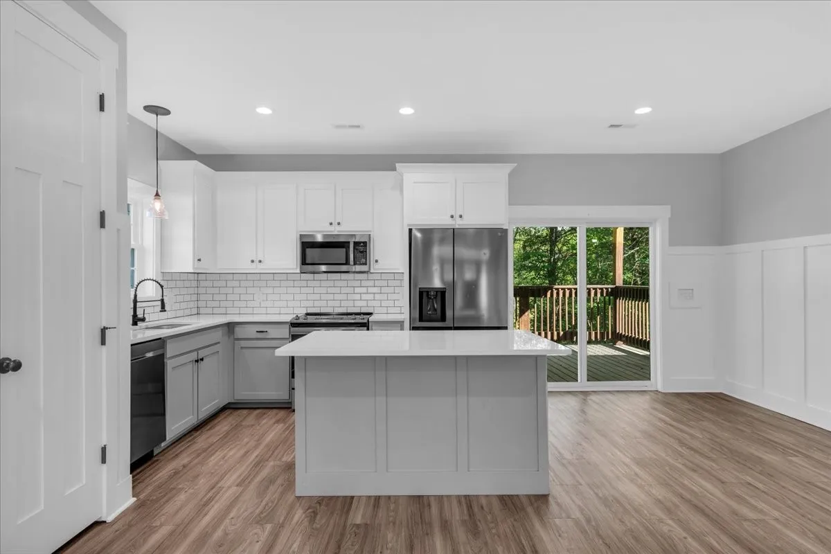 Located in Bell Buckle, this brick home offers a clean modern farmhouse feel with an inviting front porch, detailed trim work, and established landscaping. Inside, the open main level features wide‑plank flooring, board‑and‑batten wainscoting, and a spacious living area that flows into the kitchen and dining spaces. The kitchen includes shaker‑style cabinetry, a large island, subway tile backsplash, stainless appliances, and a window over the sink that frames a pleasant view. Sliding glass doors off the dining area open to a rear deck overlooking a tree‑lined backdrop, creating an easy indoor/outdoor gathering area. The main‑level suite shows off a generous bedroom with ceiling fan and a bath with double vanity, soaking tub with tile surround, and separate shower area. Additional bedrooms continue the neutral color palette and offer good natural light. Thoughtful storage is available throughout the home with multiple closets and a walk‑in pantry. The setting provides a yard with room for everyday use while maintaining a comfortable sense of privacy along the wooded edge. A versatile layout and move‑in ready finishes make this home easy to enjoy.