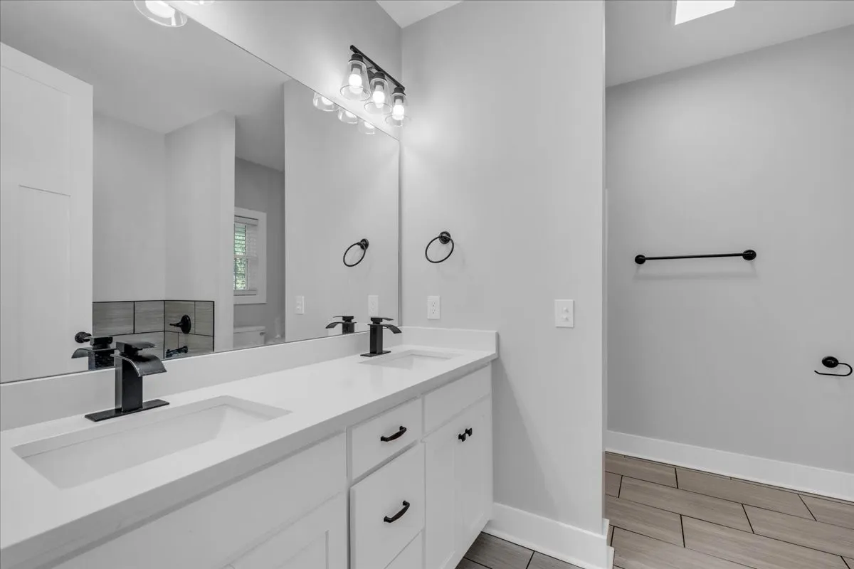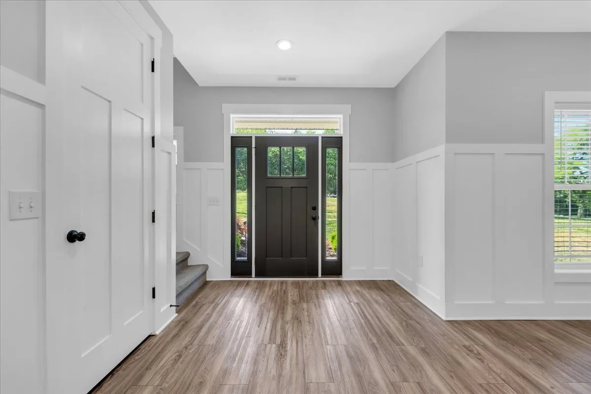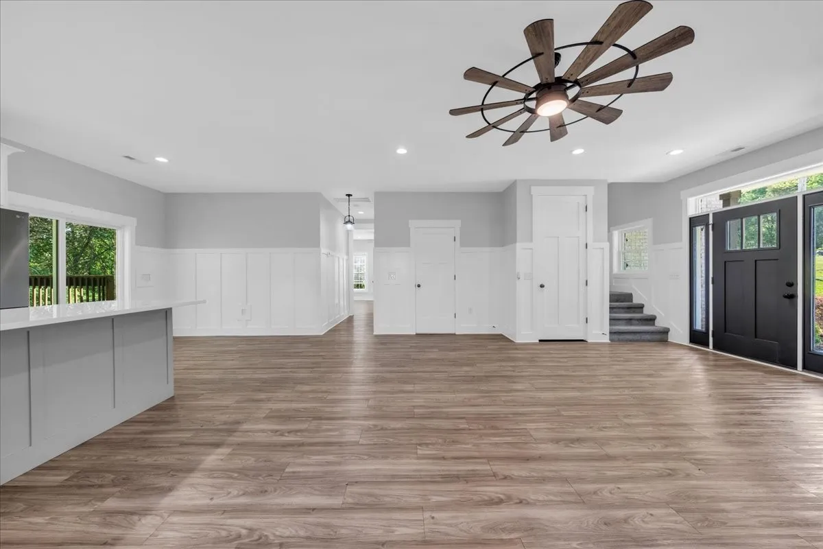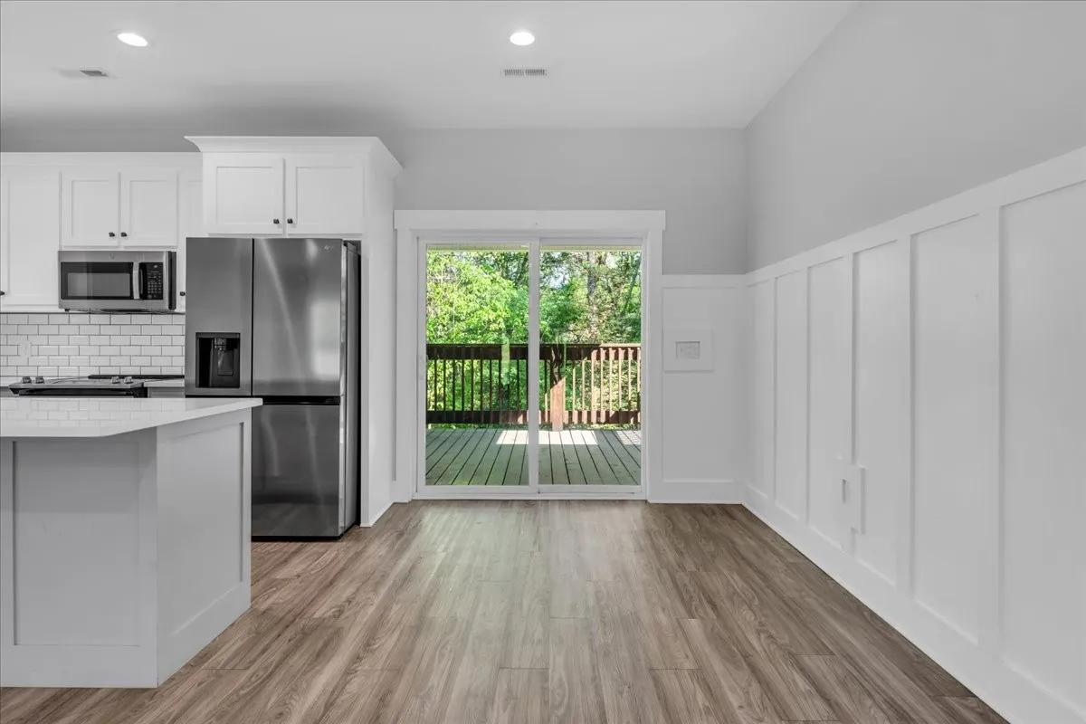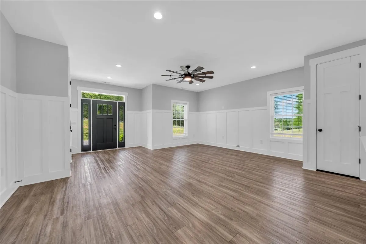 Located in Bell Buckle, this brick home offers a clean modern farmhouse feel with an inviting front porch, detailed trim work, and established landscaping. Inside, the open main level features wide‑plank flooring, board‑and‑batten wainscoting, and a spacious living area that flows into the kitchen and dining spaces. The kitchen includes shaker‑style cabinetry, a large island, subway tile backsplash, stainless appliances, and a window over the sink that frames a pleasant view. Sliding glass doors off the dining area open to a rear deck overlooking a tree‑lined backdrop, creating an easy indoor/outdoor gathering area. The main‑level suite shows off a generous bedroom with ceiling fan and a bath with double vanity, soaking tub with tile surround, and separate shower area. Additional bedrooms continue the neutral color palette and offer good natural light. Thoughtful storage is available throughout the home with multiple closets and a walk‑in pantry. The setting provides a yard with room for everyday use while maintaining a comfortable sense of privacy along the wooded edge. A versatile layout and move‑in ready finishes make this home easy to enjoy.