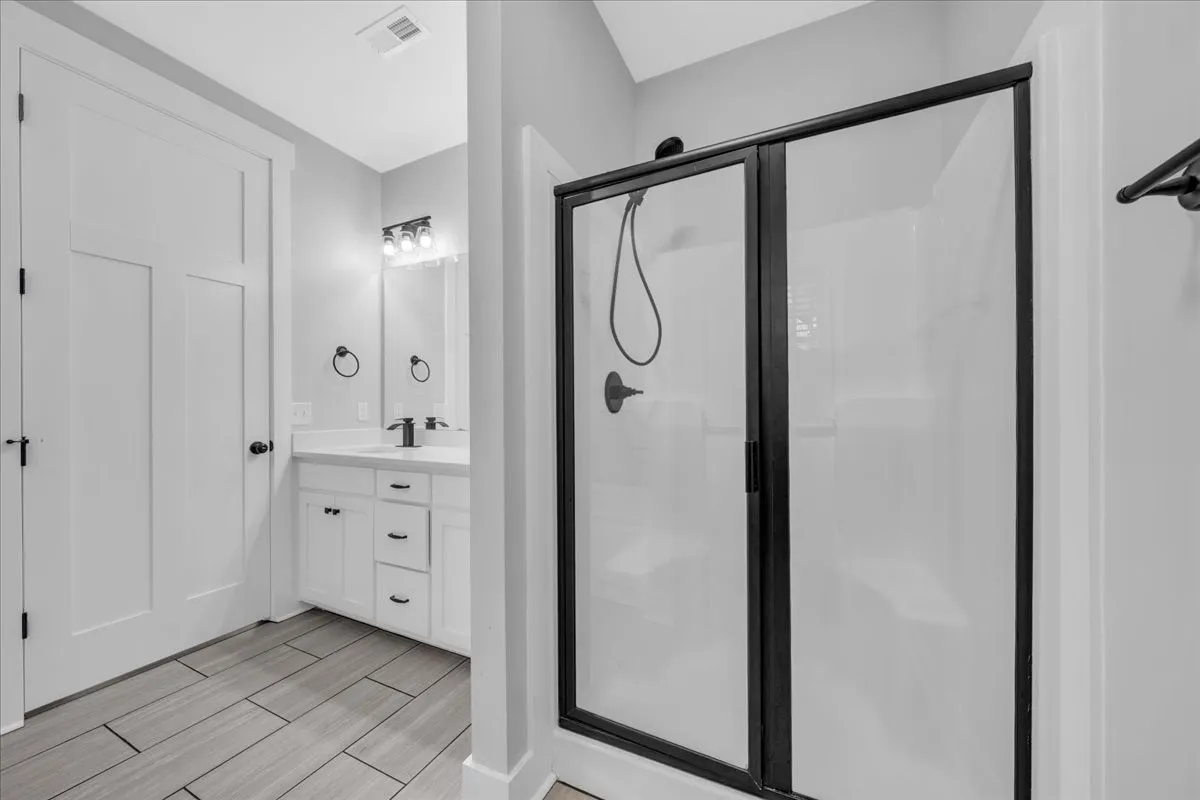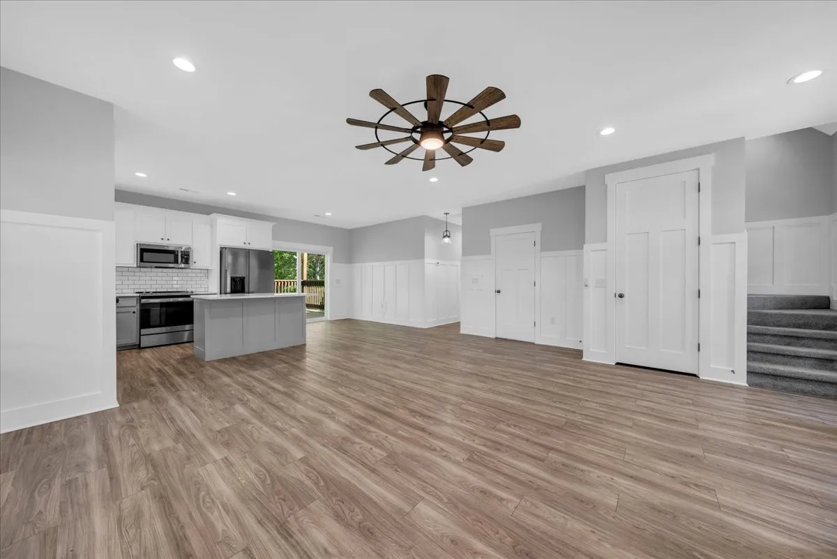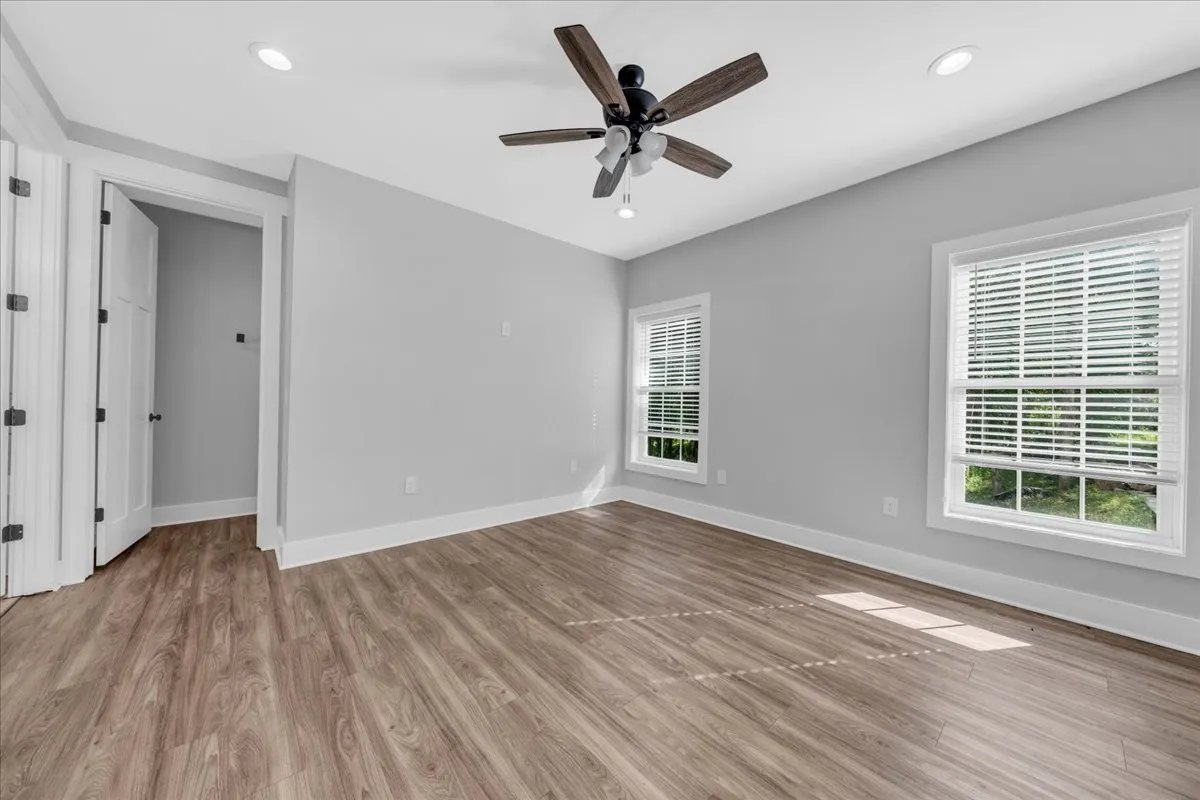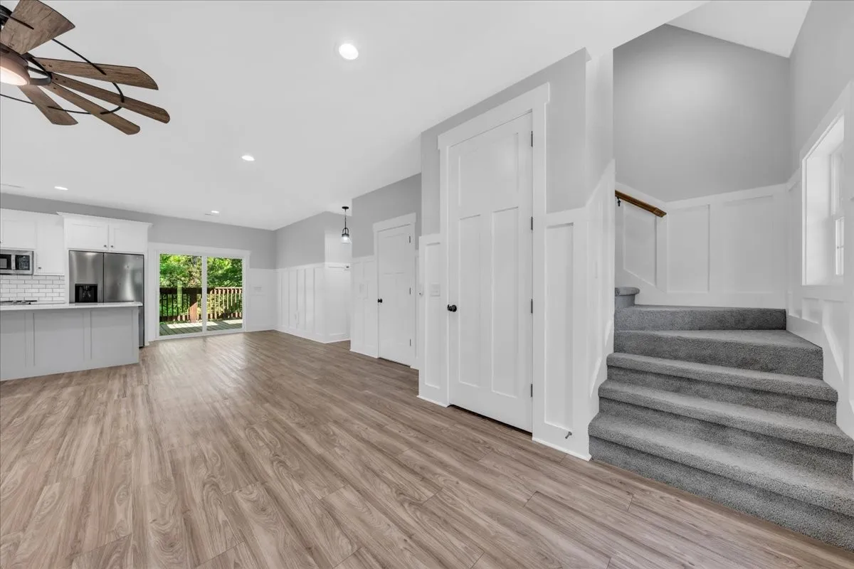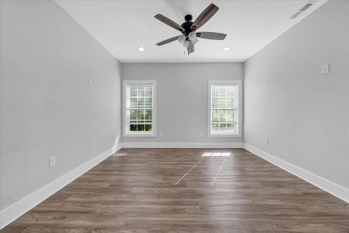 Located in Bell Buckle, this brick home offers a clean modern farmhouse feel with an inviting front porch, detailed trim work, and established landscaping. Inside, the open main level features wide‑plank flooring, board‑and‑batten wainscoting, and a spacious living area that flows into the kitchen and dining spaces. The kitchen includes shaker‑style cabinetry, a large island, subway tile backsplash, stainless appliances, and a window over the sink that frames a pleasant view. Sliding glass doors off the dining area open to a rear deck overlooking a tree‑lined backdrop, creating an easy indoor/outdoor gathering area. The main‑level suite shows off a generous bedroom with ceiling fan and a bath with double vanity, soaking tub with tile surround, and separate shower area. Additional bedrooms continue the neutral color palette and offer good natural light. Thoughtful storage is available throughout the home with multiple closets and a walk‑in pantry. The setting provides a yard with room for everyday use while maintaining a comfortable sense of privacy along the wooded edge. A versatile layout and move‑in ready finishes make this home easy to enjoy.