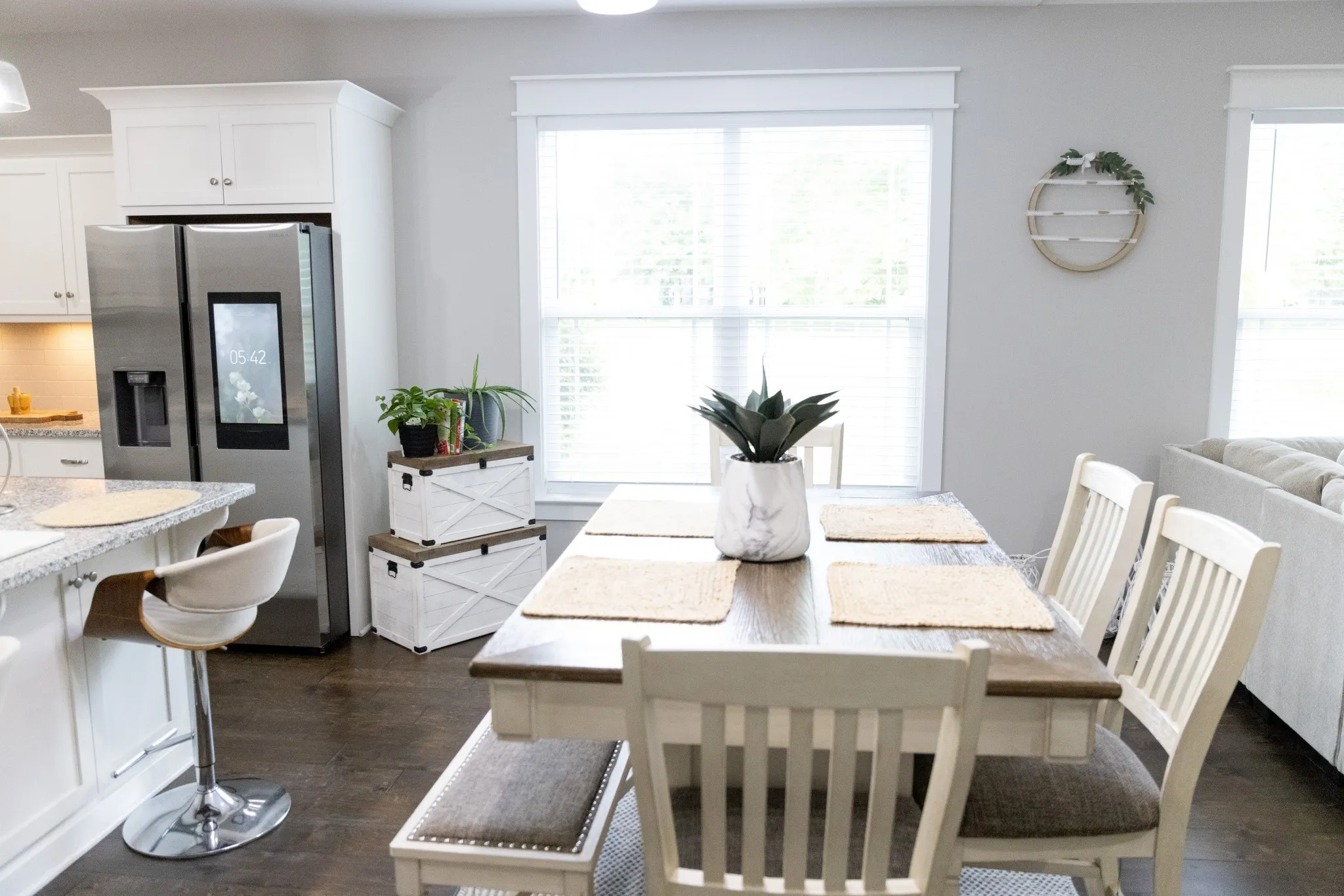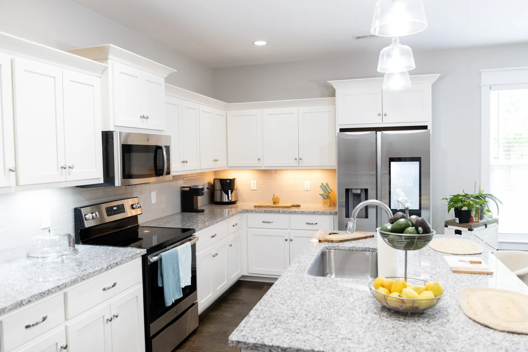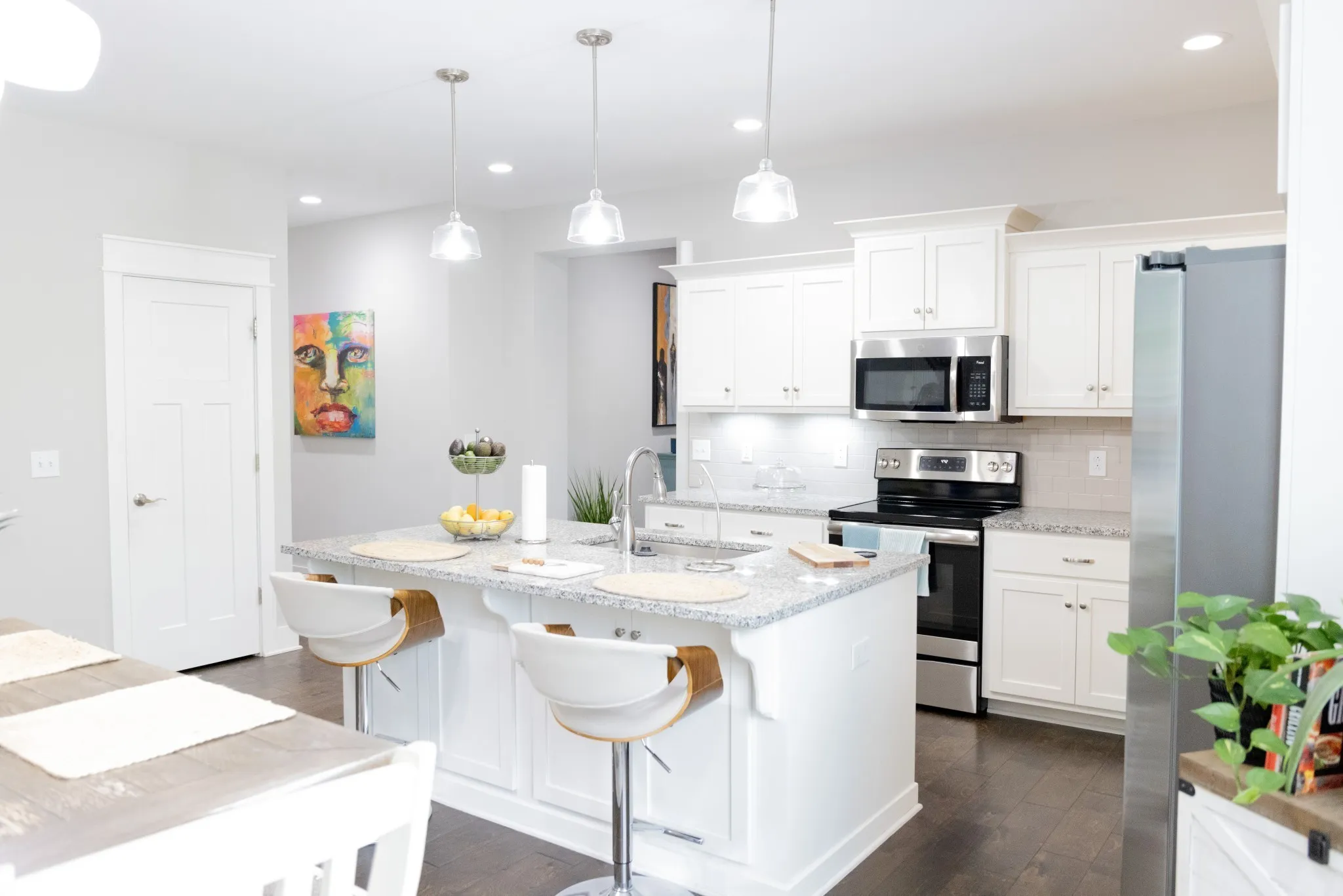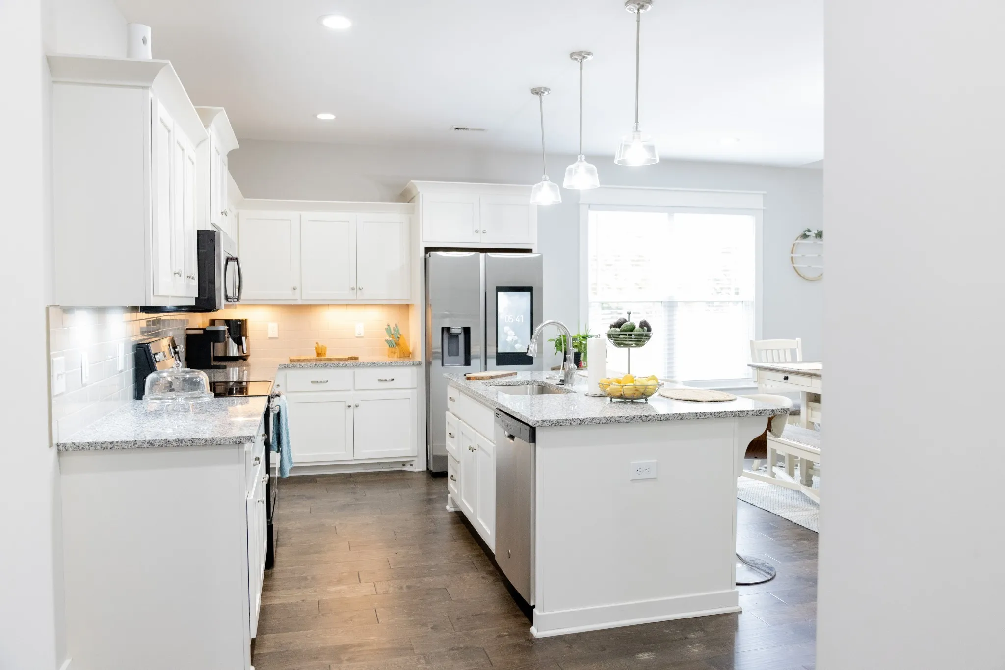 The spacious kitchen is designed for both everyday living and hosting, featuring gorgeous granite countertops, abundant cabinetry, a large island with breakfast bar, stainless steel sink, and a full suite of stainless steel appliances, including refrigerator. The main living areas showcase finished wood floors, adding warmth and style throughout the downstairs.