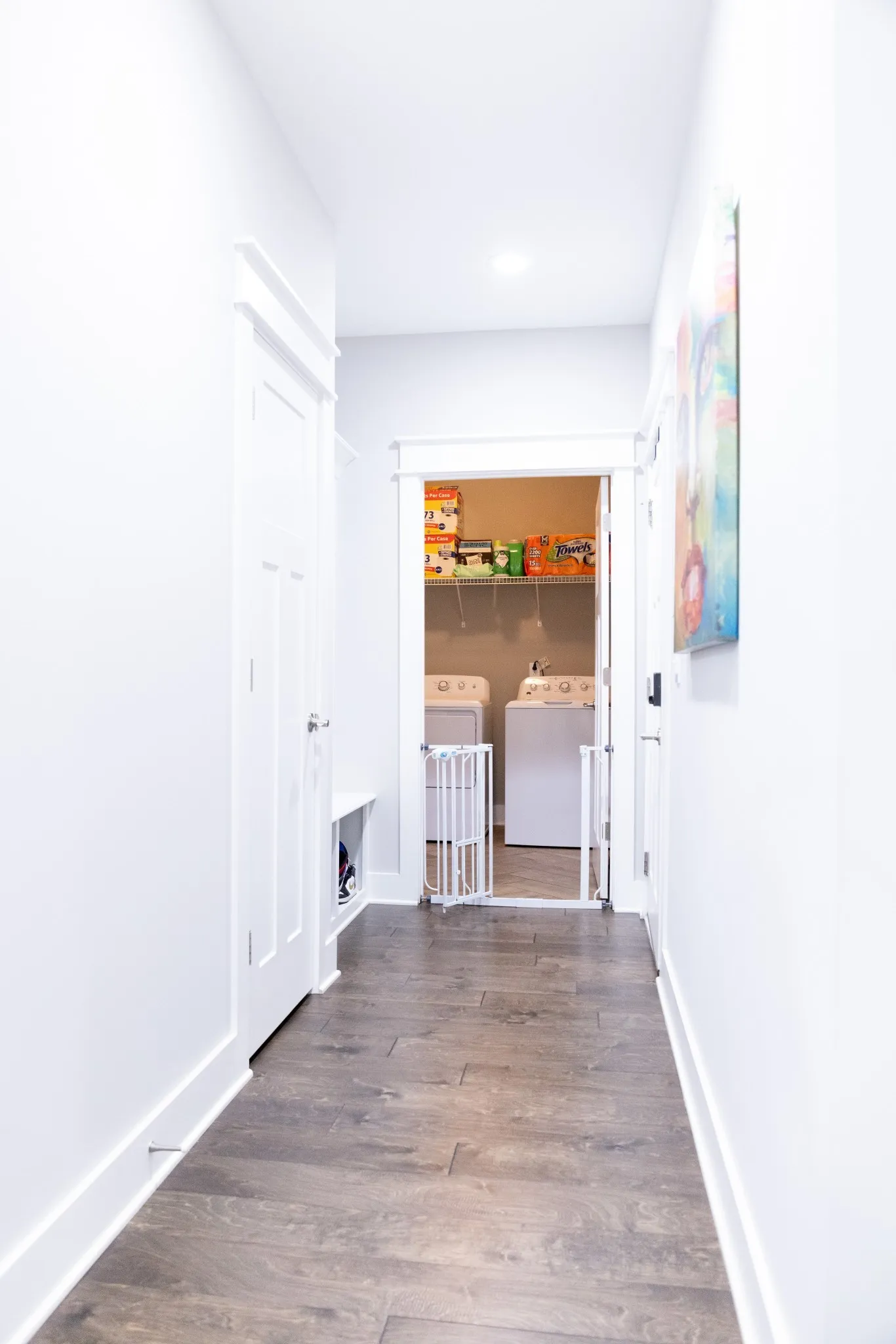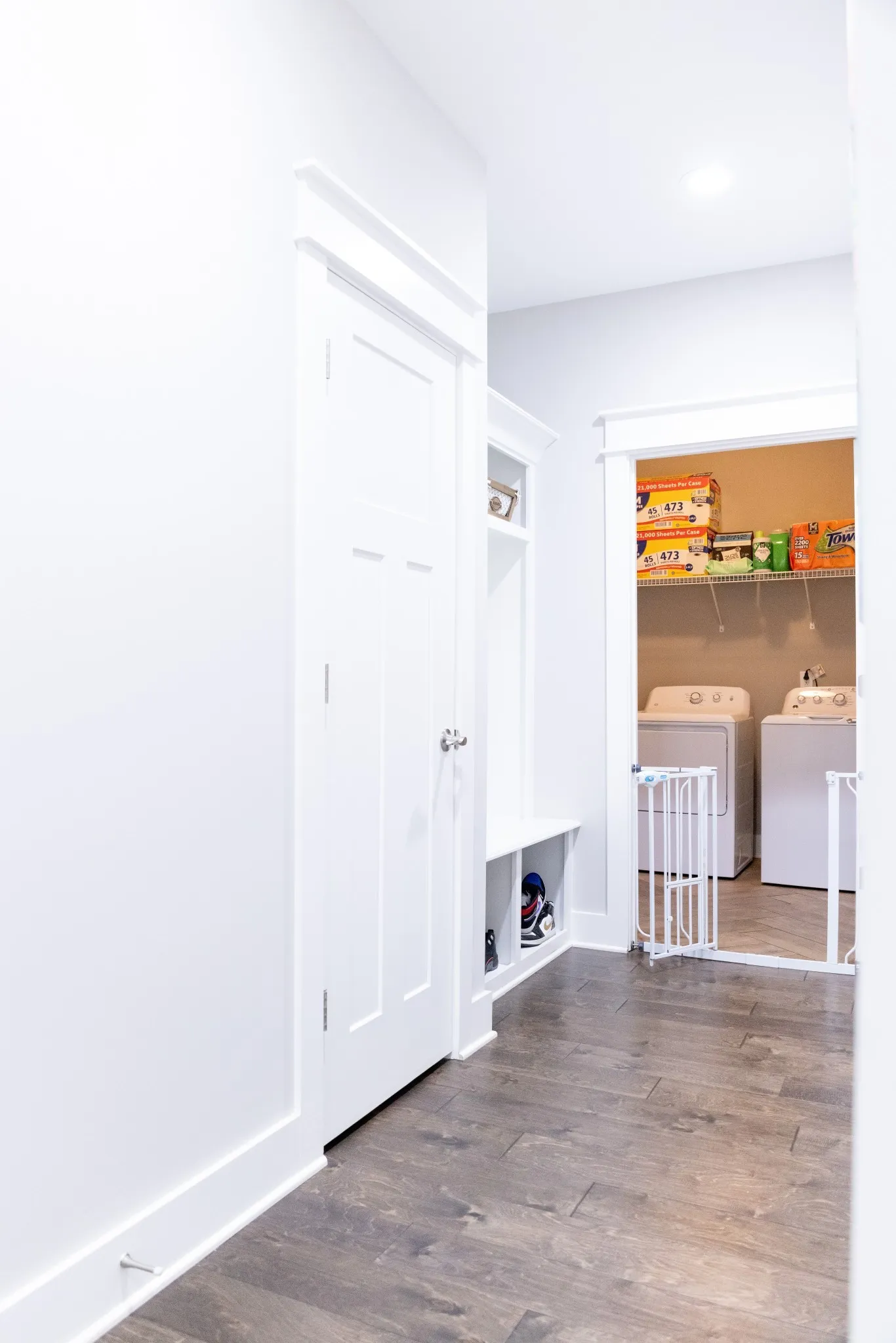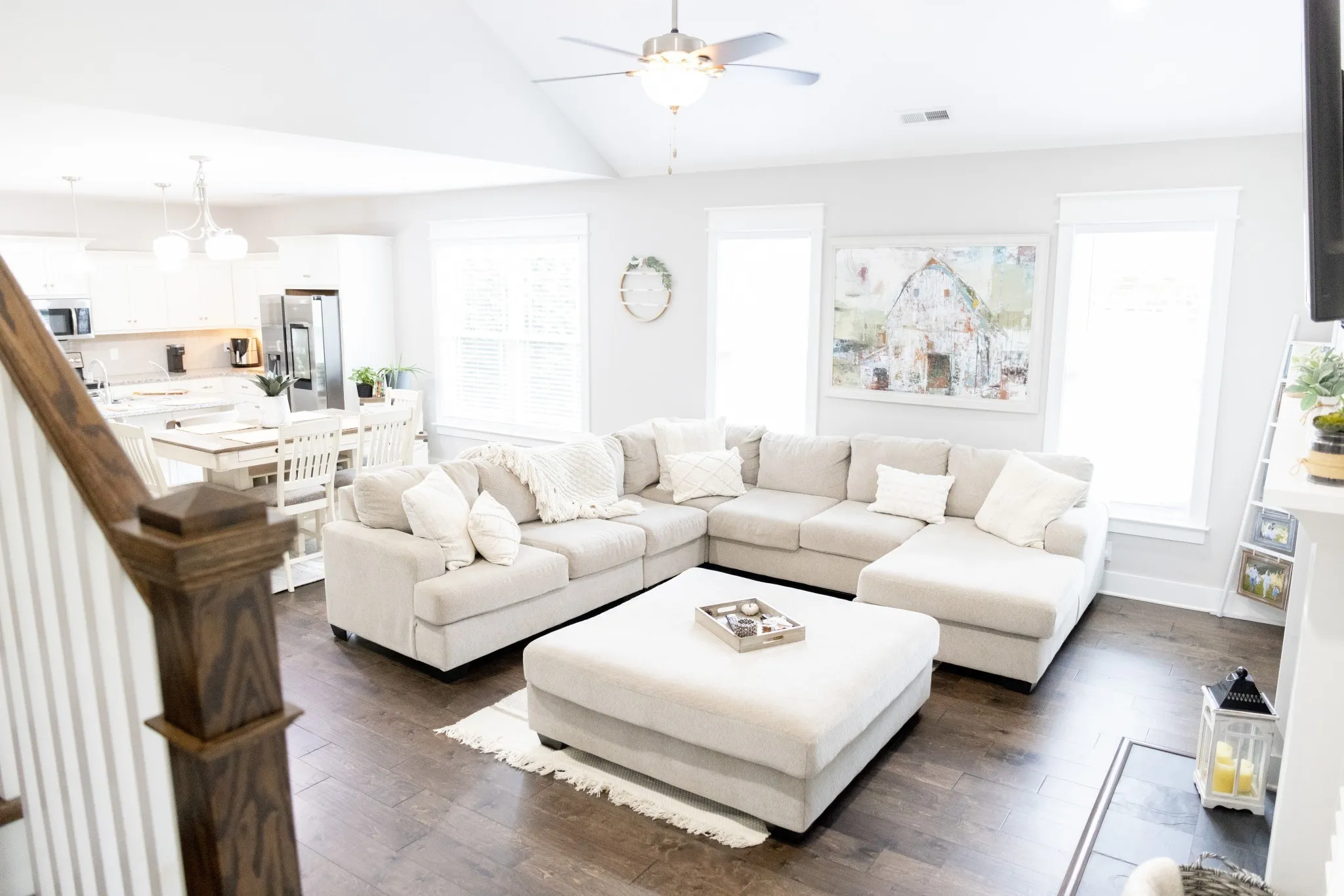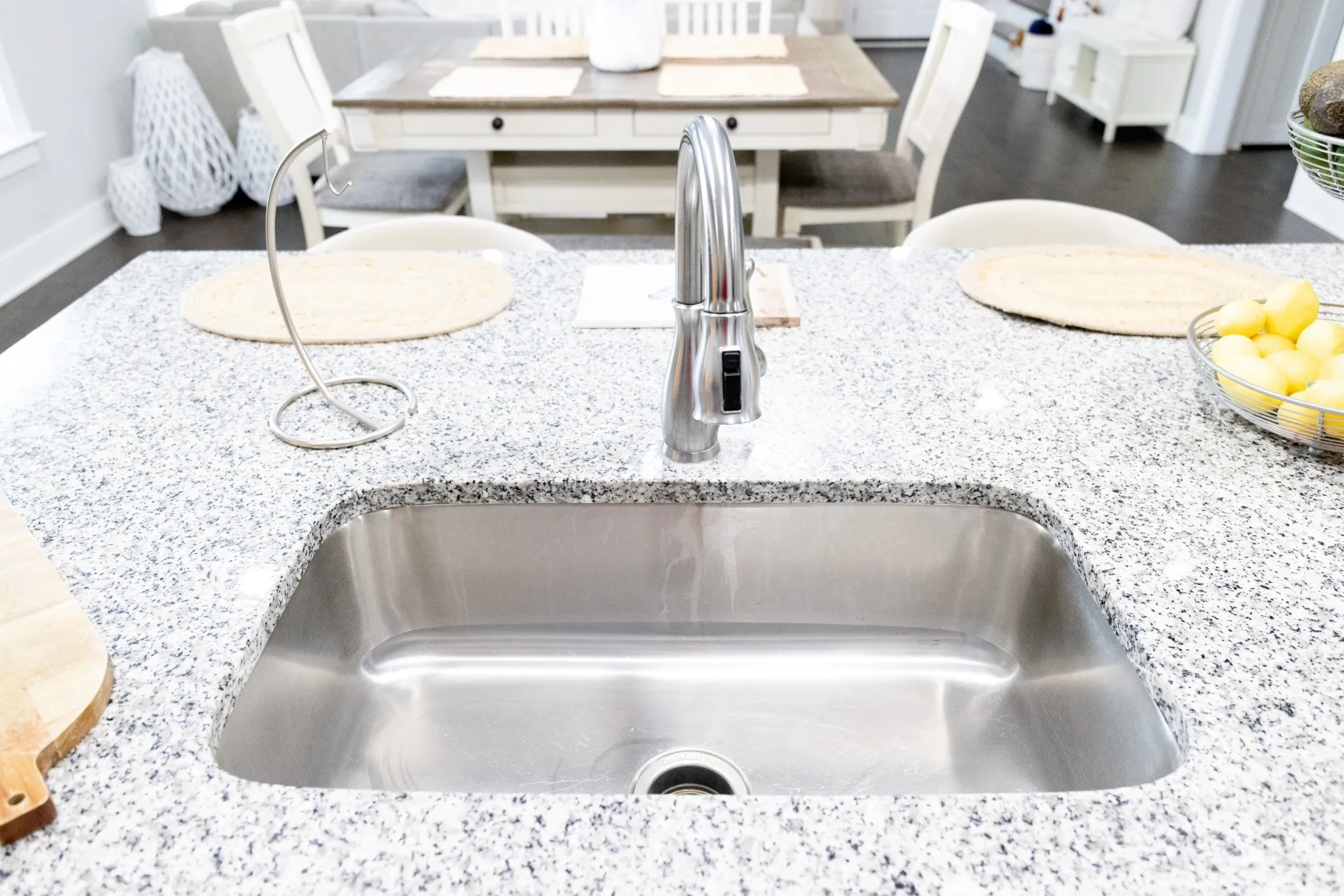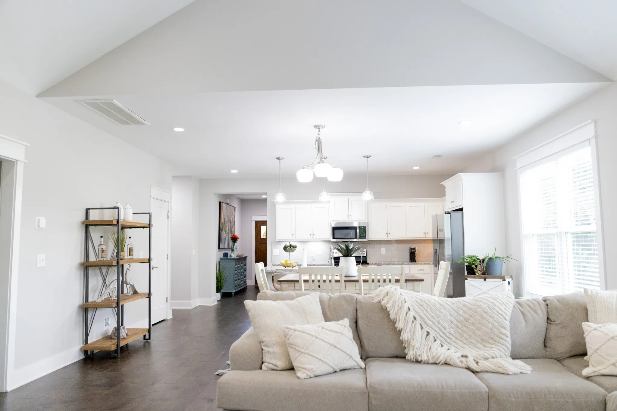 The spacious kitchen is designed for both everyday living and hosting, featuring gorgeous granite countertops, abundant cabinetry, a large island with breakfast bar, stainless steel sink, and a full suite of stainless steel appliances, including refrigerator. The main living areas showcase finished wood floors, adding warmth and style throughout the downstairs.