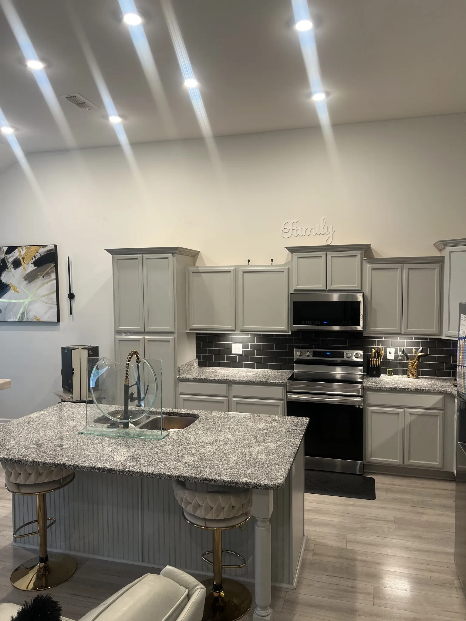 Curb appeal is on point with blue craftsman siding, stone accents, white shutters, and a covered front porch. Inside, vaulted ceilings and LVP flooring flow through an open-concept layout anchored by a gas fireplace. The kitchen features granite countertops, a large island, gray cabinetry, dark subway tile backsplash, and stainless steel appliances.