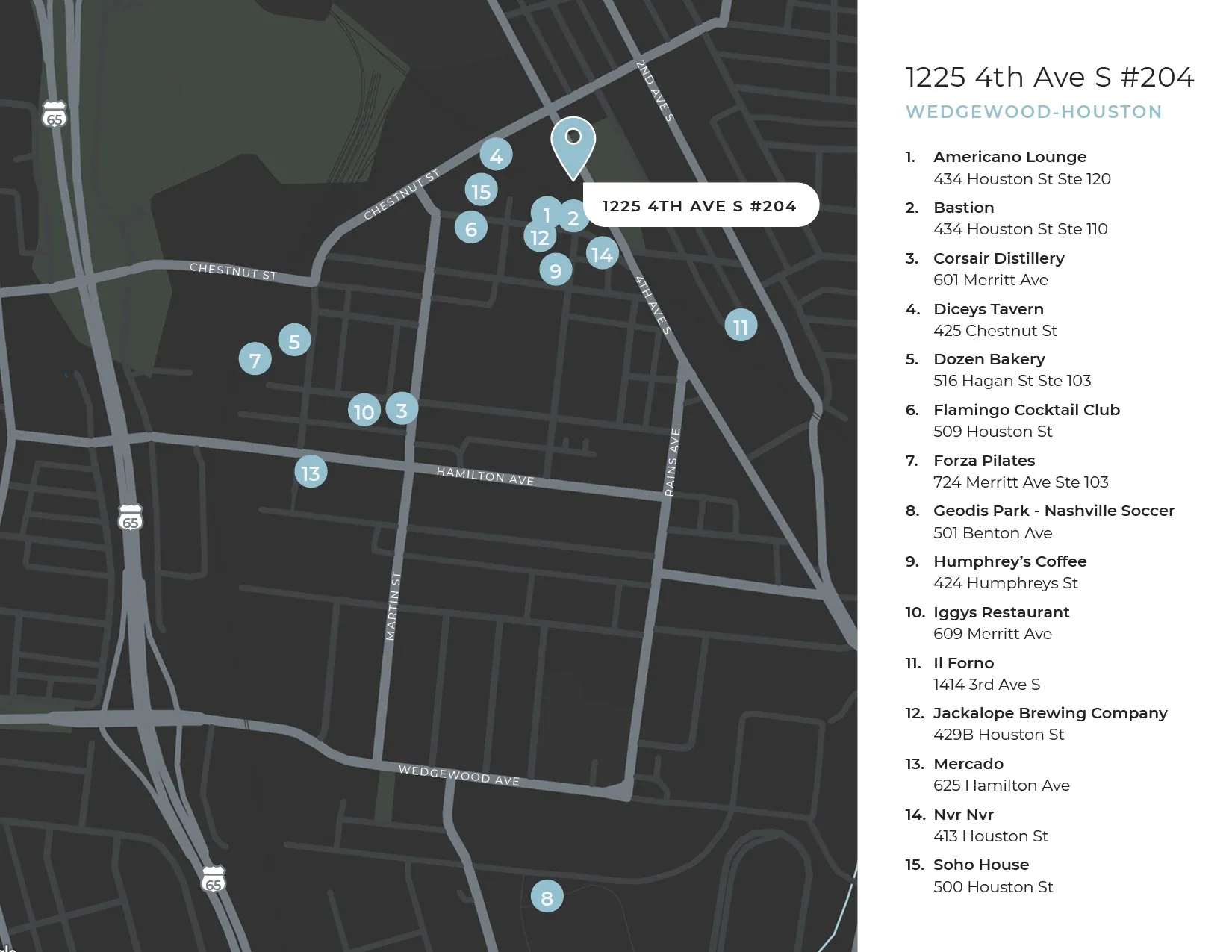 - Directions: From Downtown - Take 4th Ave S Towards Wedgewood Houston. Cross over Chestnut Street and Woodstock will be on your right. Turn into the building and park. #204 is in the building on the left.