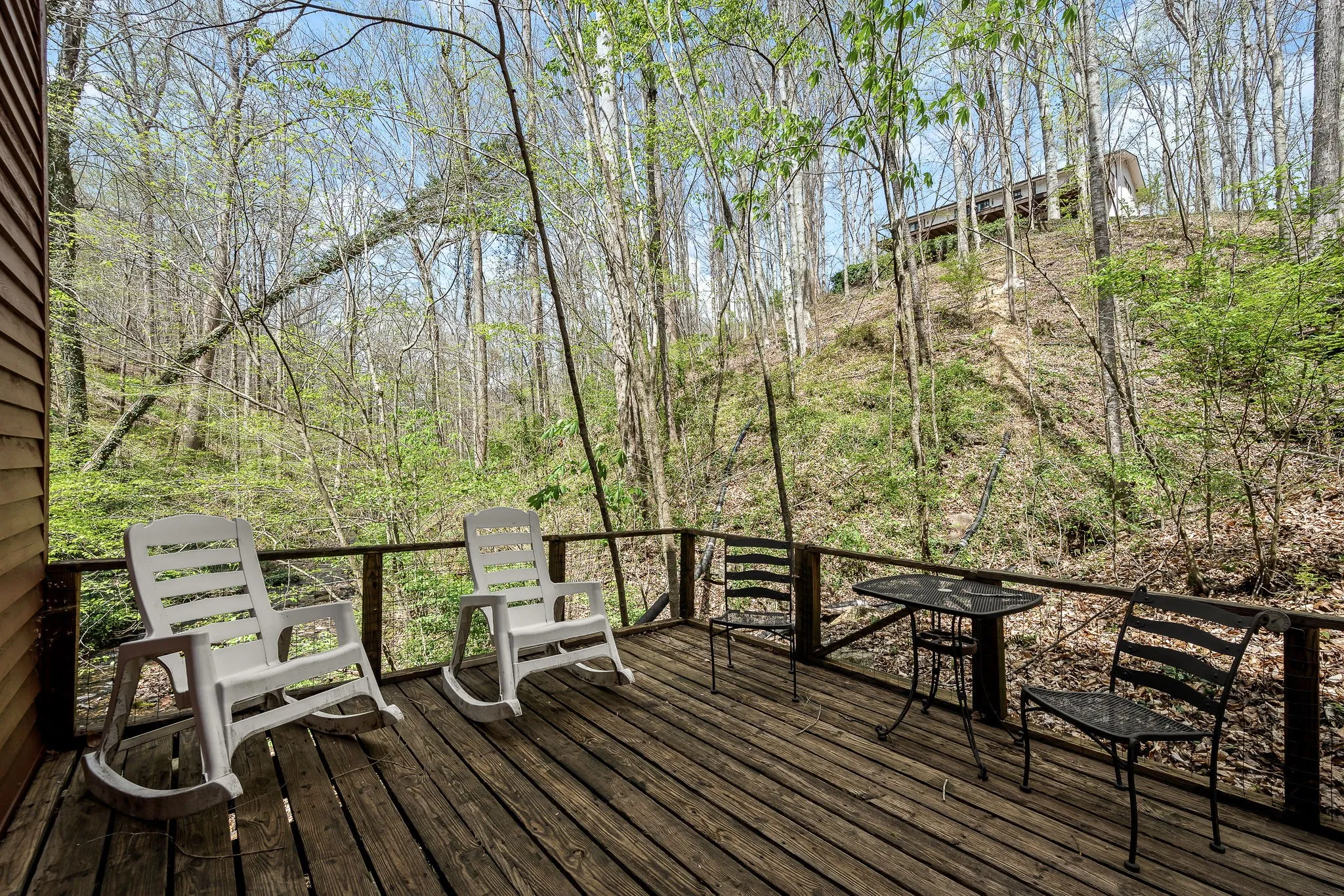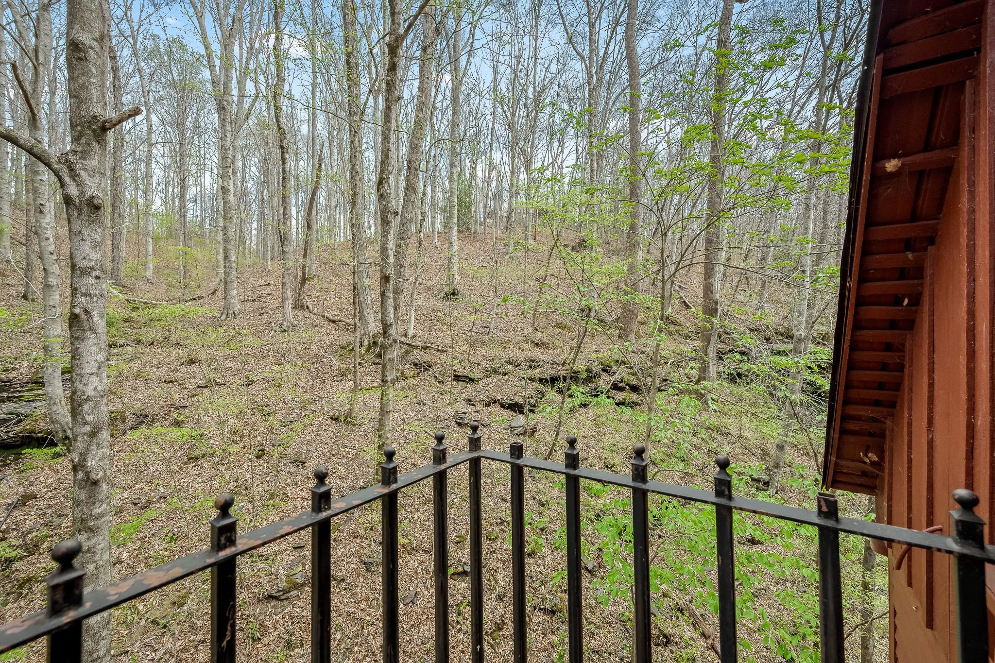 The upper-level loft offers a private apartment-style space with high ceilings, a kitchenette, and a balcony with scenic views of the surrounding natural landscape.