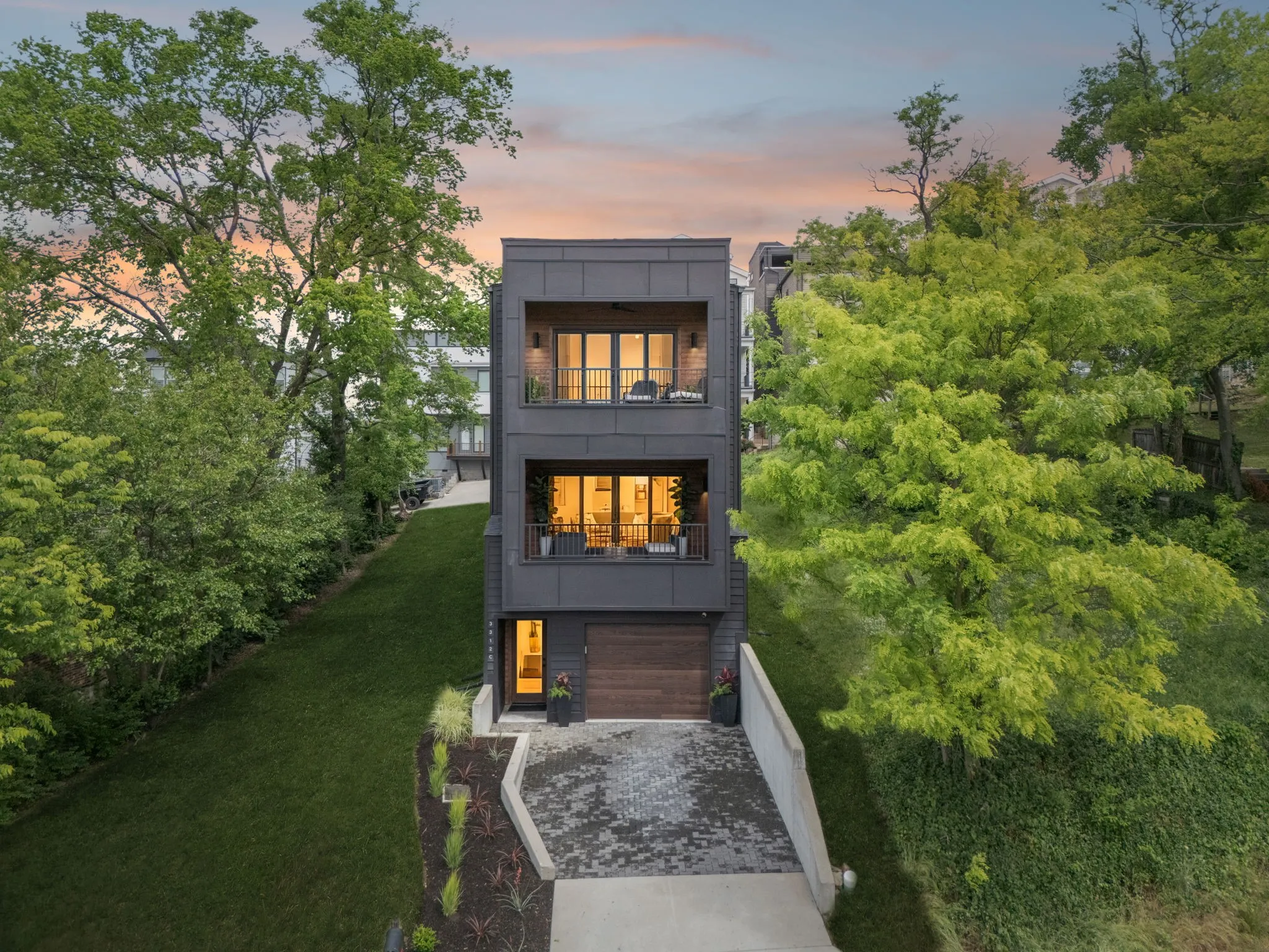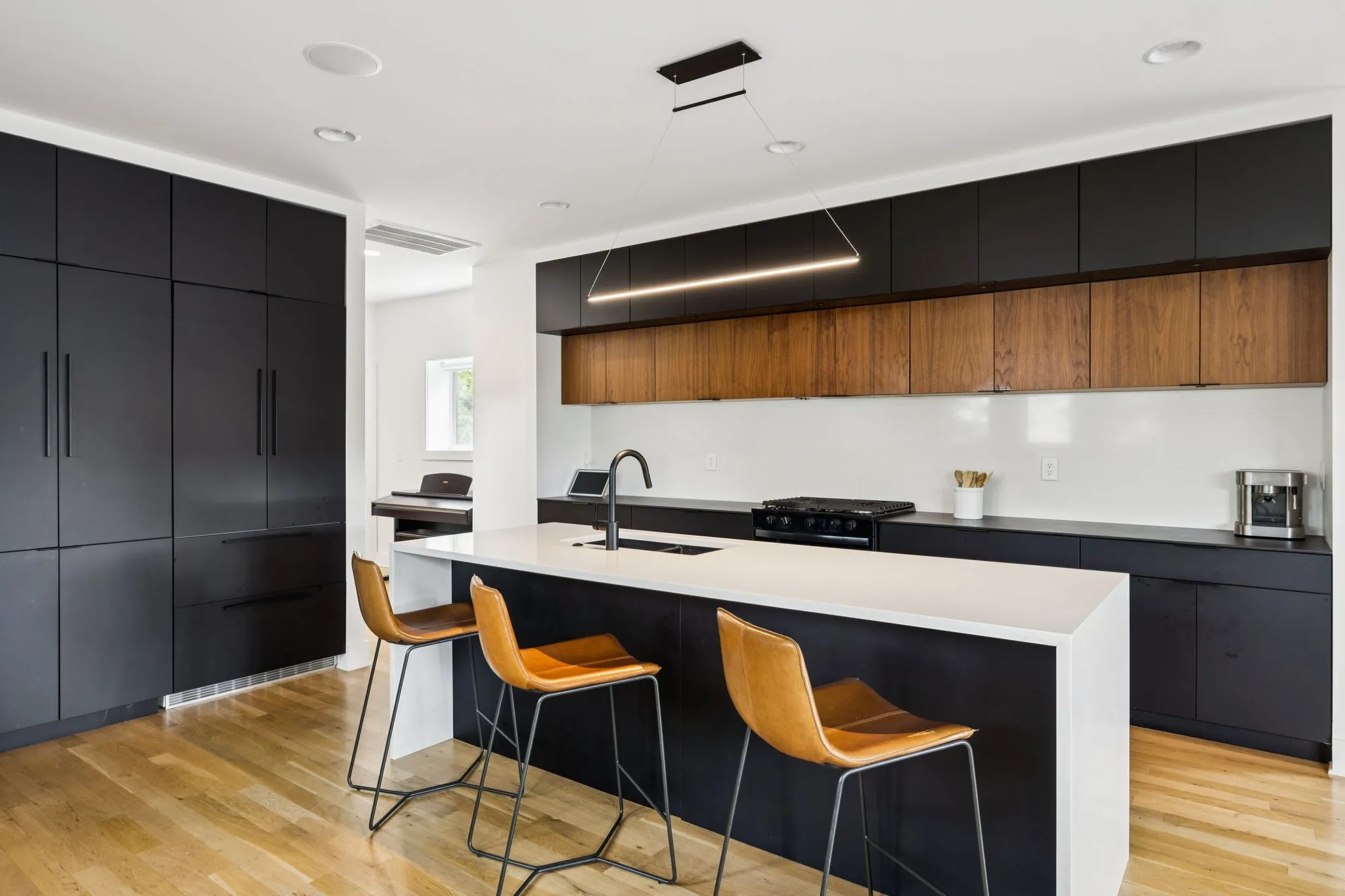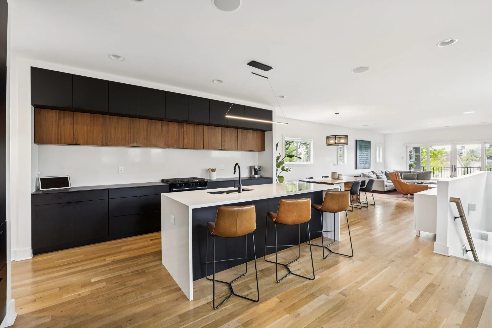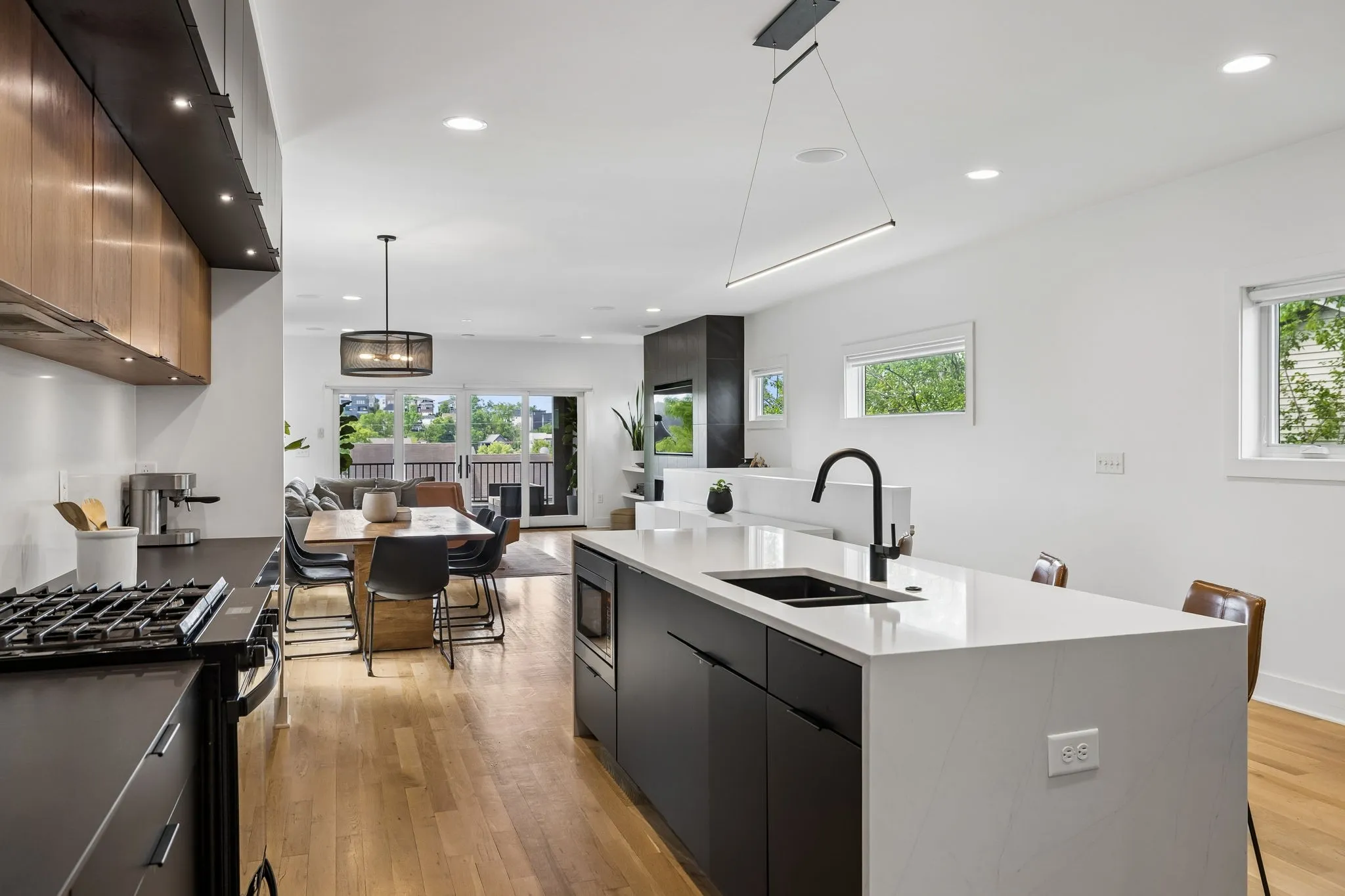 This Sylvan Heights custom built contemporary residence offers over 3,000 square feet of curated living space across three levels, the perfect balance between high-end aesthetics and functional luxury. Designed to maximize both natural light and panoramic neighborhood views, this 4-bed/2.5-bath home offers a sophisticated living experience for the discerning buyer. The main level features an airy, open-concept floor plan grounded by site-finished real hardwood floors and a sleek electric fireplace. The thoughtful and functional kitchen is a study in modern efficiency, featuring a Liebherr refrigerator, gas Whirlpool 4-burner range with center grill, and an Asko dishwasher. Floor-to-ceiling pantry cabinetry with integrated pull-out drawers, and quartz countertops. Sleek lighting package and oversized windows that bathe the space in sunlight from all four sides. The open concept living area flows easily into an outdoor living room, featuring durable Trex decking, integrated ceiling speakers, a fan, and hardwired lighting—perfect for sunset views over the rolling hills. The primary bedroom suite offers a skyview private balcony, hardwoods, and blackout shades are installed in all bedrooms. Beyond the garage lies a rare bonus rear room ideal for a private studio, secure storage, or a storm shelter.