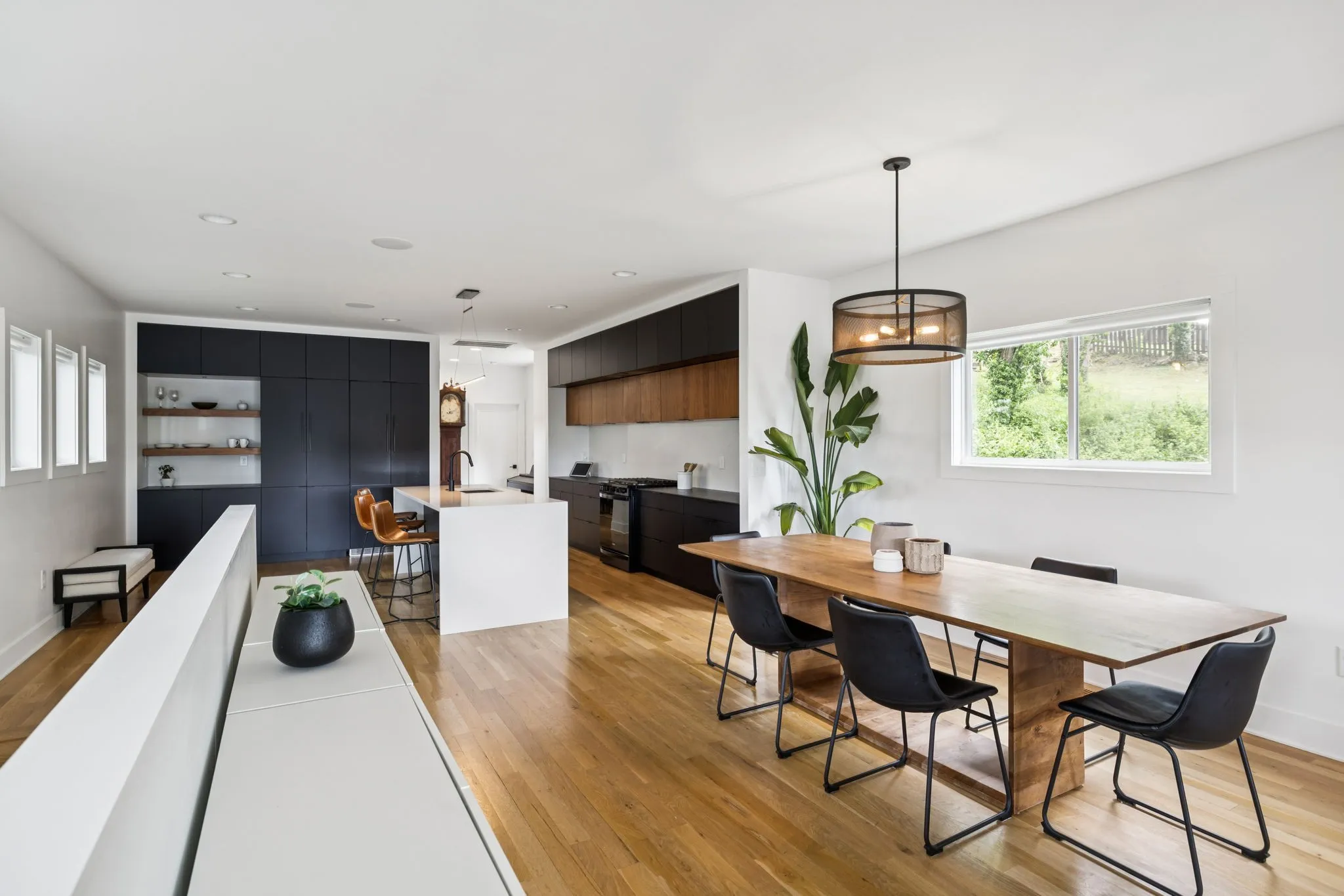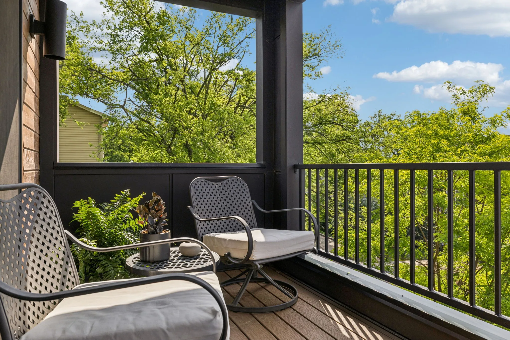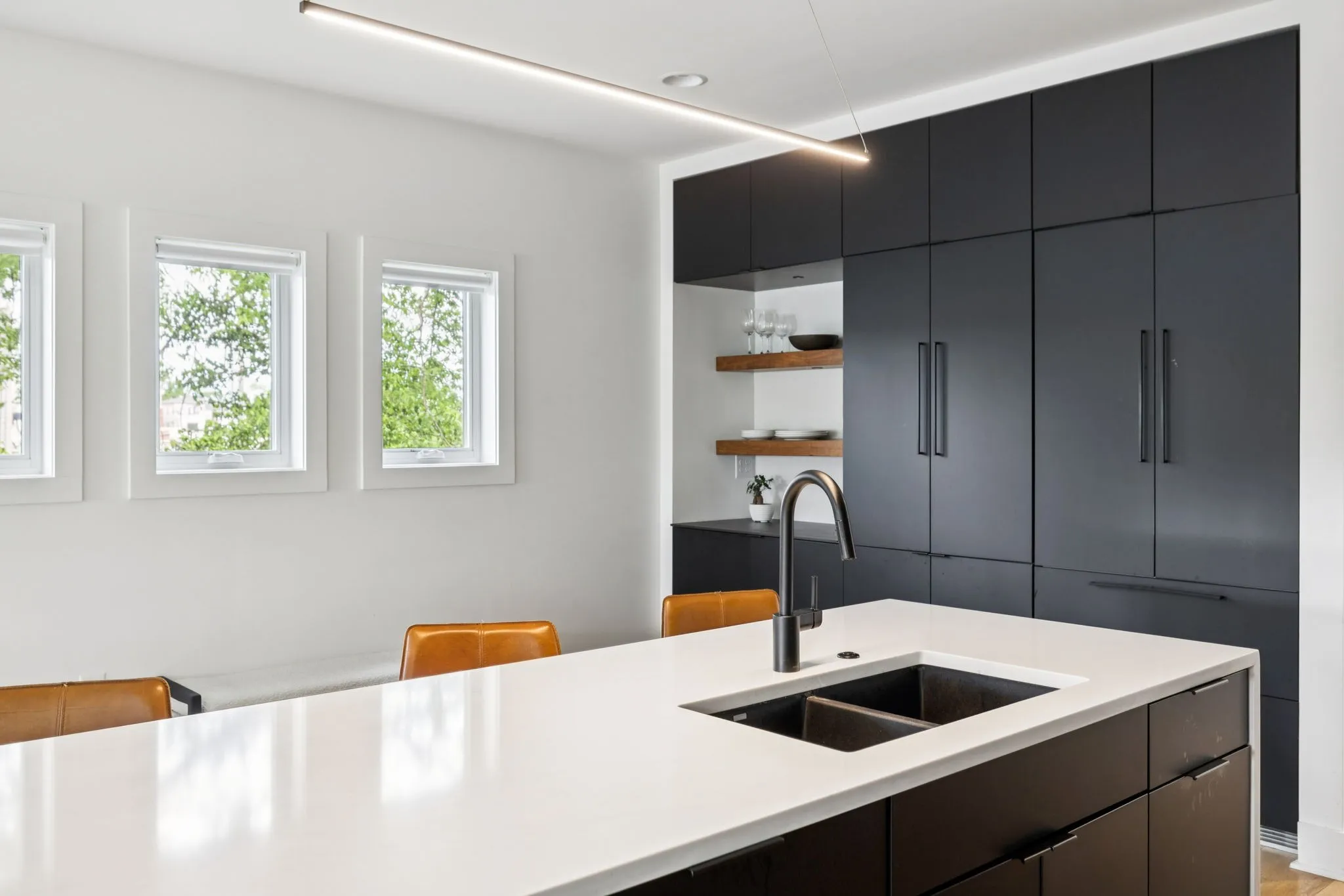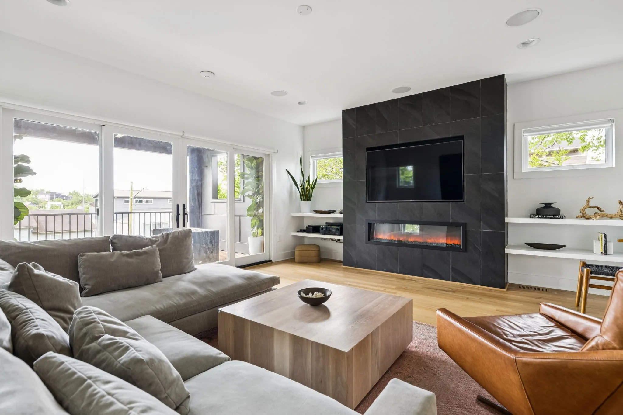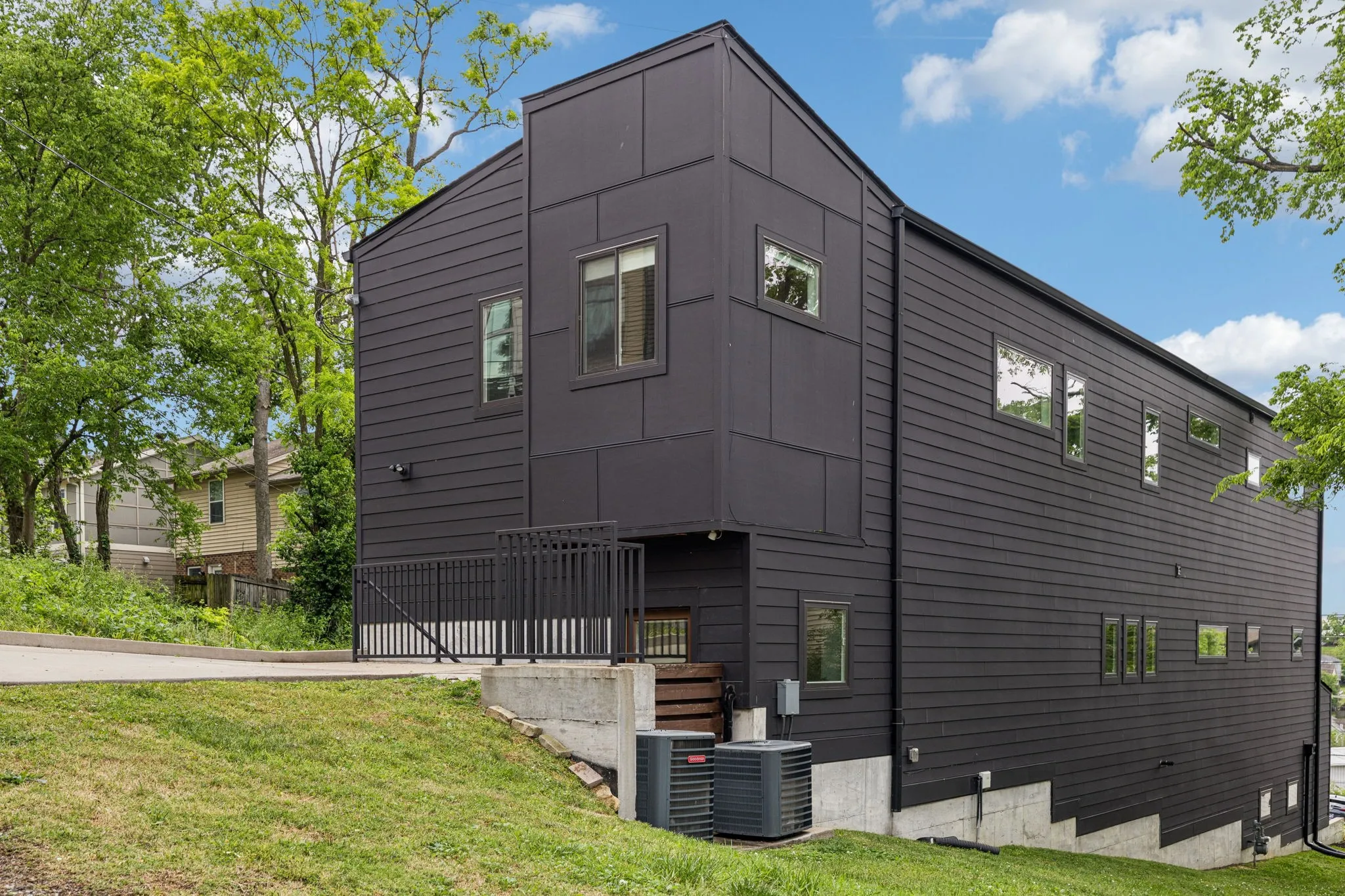 This Sylvan Heights custom built contemporary residence offers over 3,000 square feet of curated living space across three levels, the perfect balance between high-end aesthetics and functional luxury. Designed to maximize both natural light and panoramic neighborhood views, this 4-bed/2.5-bath home offers a sophisticated living experience for the discerning buyer. The main level features an airy, open-concept floor plan grounded by site-finished real hardwood floors and a sleek electric fireplace. The thoughtful and functional kitchen is a study in modern efficiency, featuring a Liebherr refrigerator, gas Whirlpool 4-burner range with center grill, and an Asko dishwasher. Floor-to-ceiling pantry cabinetry with integrated pull-out drawers, and quartz countertops. Sleek lighting package and oversized windows that bathe the space in sunlight from all four sides. The open concept living area flows easily into an outdoor living room, featuring durable Trex decking, integrated ceiling speakers, a fan, and hardwired lighting—perfect for sunset views over the rolling hills. The primary bedroom suite offers a skyview private balcony, hardwoods, and blackout shades are installed in all bedrooms. Beyond the garage lies a rare bonus rear room ideal for a private studio, secure storage, or a storm shelter.