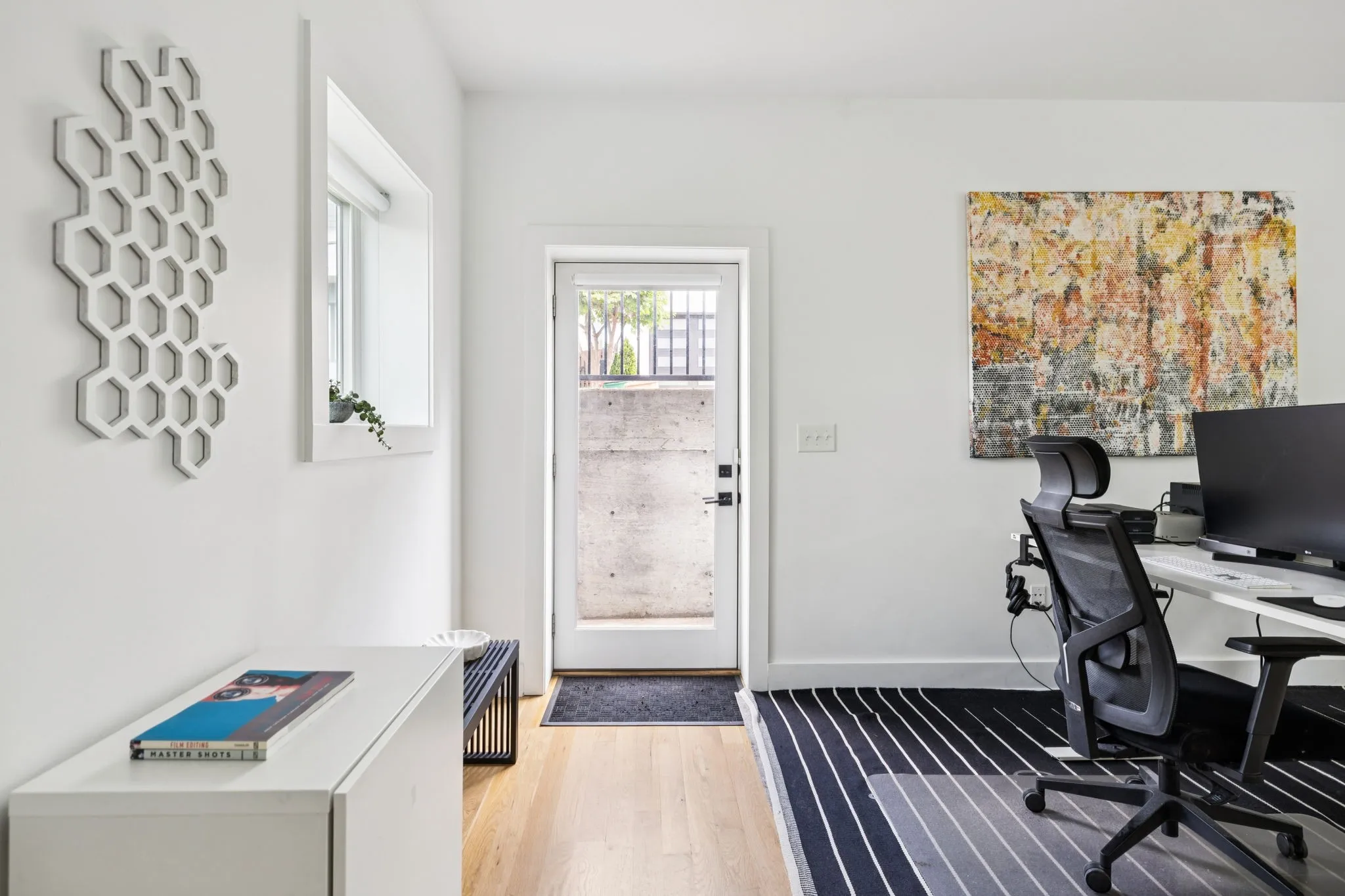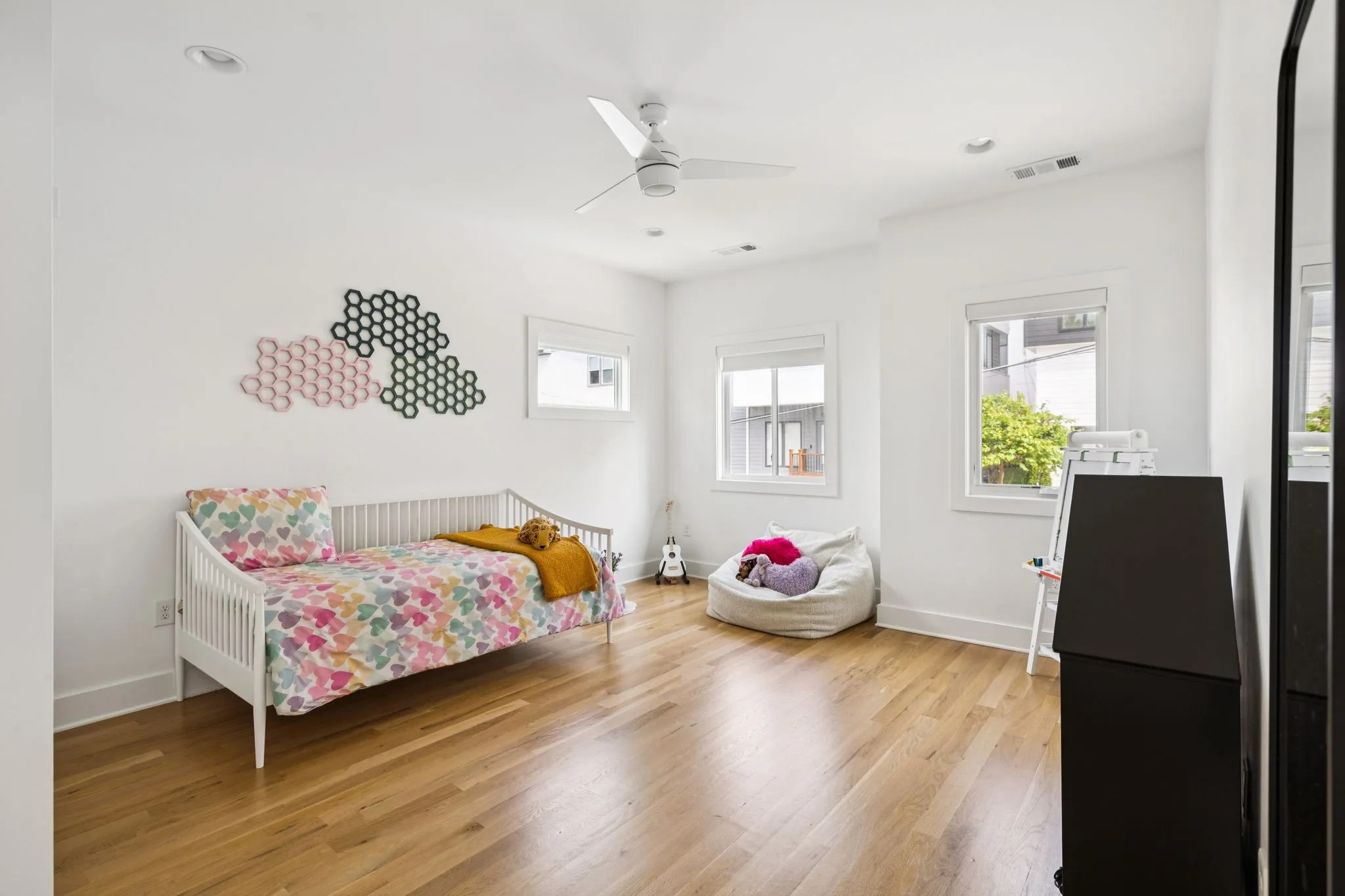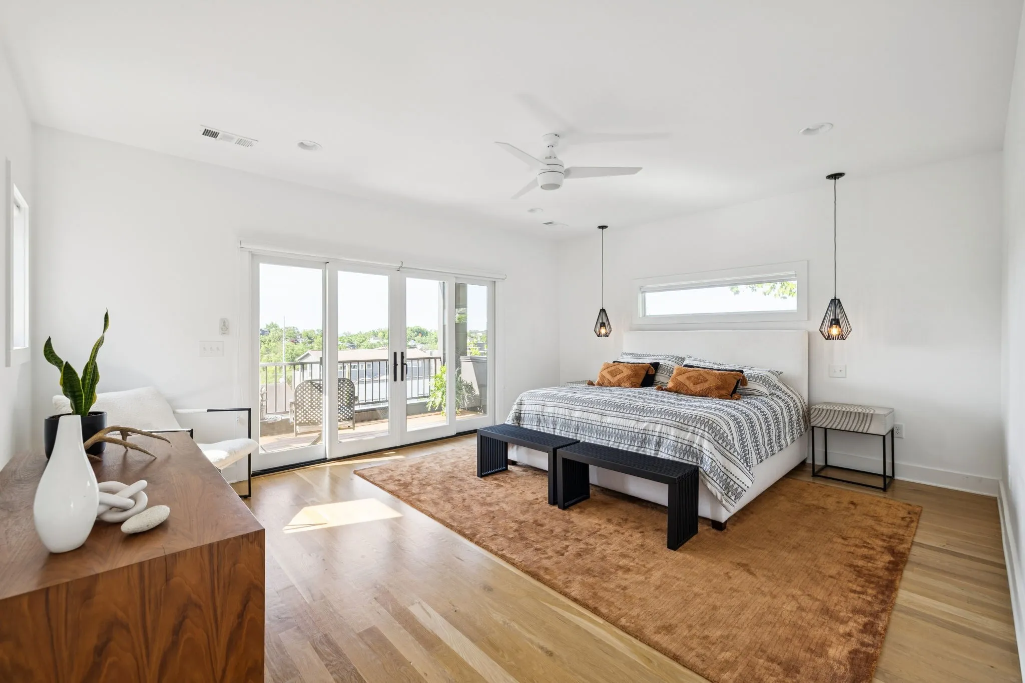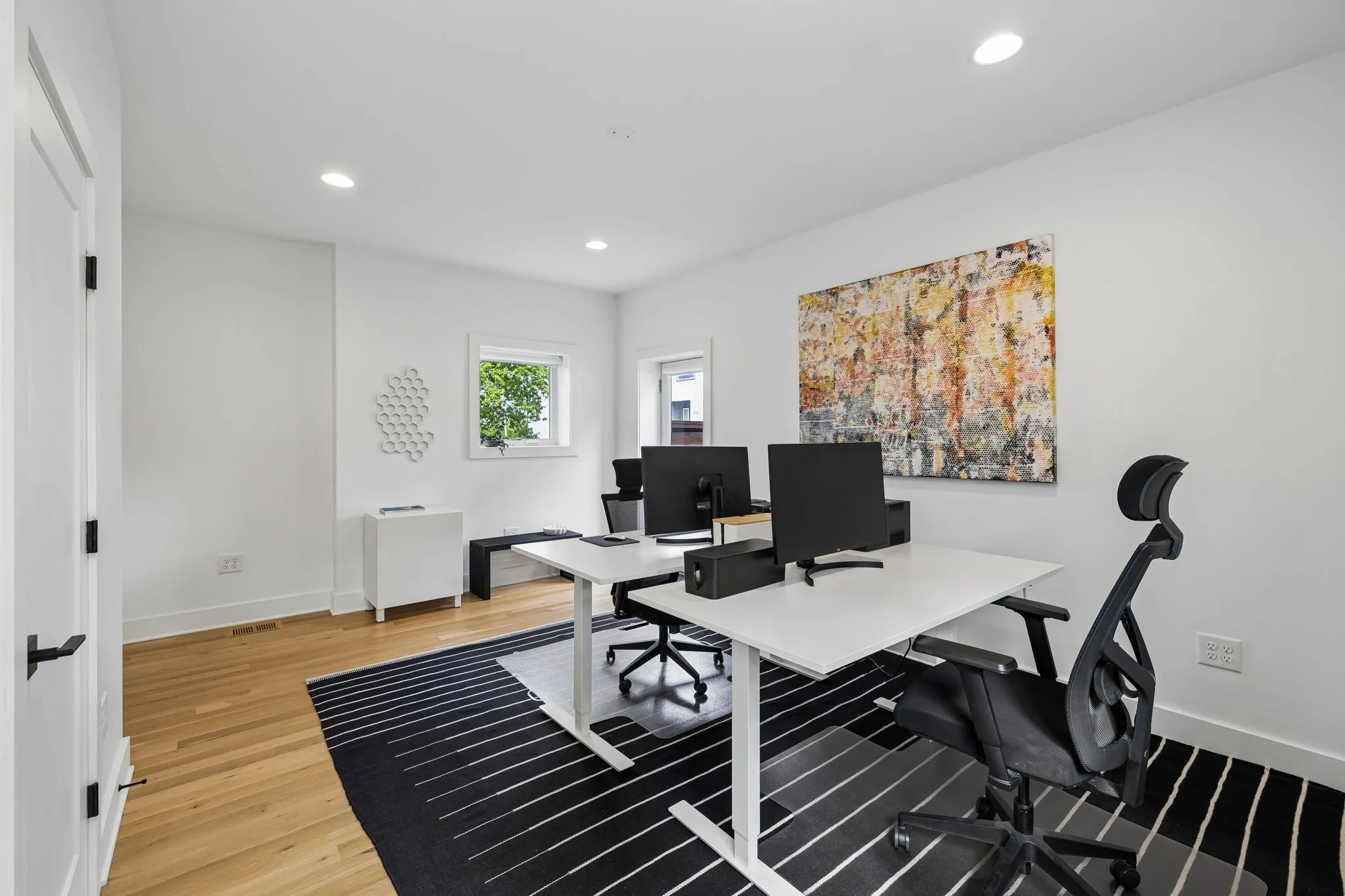 This Sylvan Heights custom built contemporary residence offers over 3,000 square feet of curated living space across three levels, the perfect balance between high-end aesthetics and functional luxury. Designed to maximize both natural light and panoramic neighborhood views, this 4-bed/2.5-bath home offers a sophisticated living experience for the discerning buyer. The main level features an airy, open-concept floor plan grounded by site-finished real hardwood floors and a sleek electric fireplace. The thoughtful and functional kitchen is a study in modern efficiency, featuring a Liebherr refrigerator, gas Whirlpool 4-burner range with center grill, and an Asko dishwasher. Floor-to-ceiling pantry cabinetry with integrated pull-out drawers, and quartz countertops. Sleek lighting package and oversized windows that bathe the space in sunlight from all four sides. The open concept living area flows easily into an outdoor living room, featuring durable Trex decking, integrated ceiling speakers, a fan, and hardwired lighting—perfect for sunset views over the rolling hills. The primary bedroom suite offers a skyview private balcony, hardwoods, and blackout shades are installed in all bedrooms. Beyond the garage lies a rare bonus rear room ideal for a private studio, secure storage, or a storm shelter.